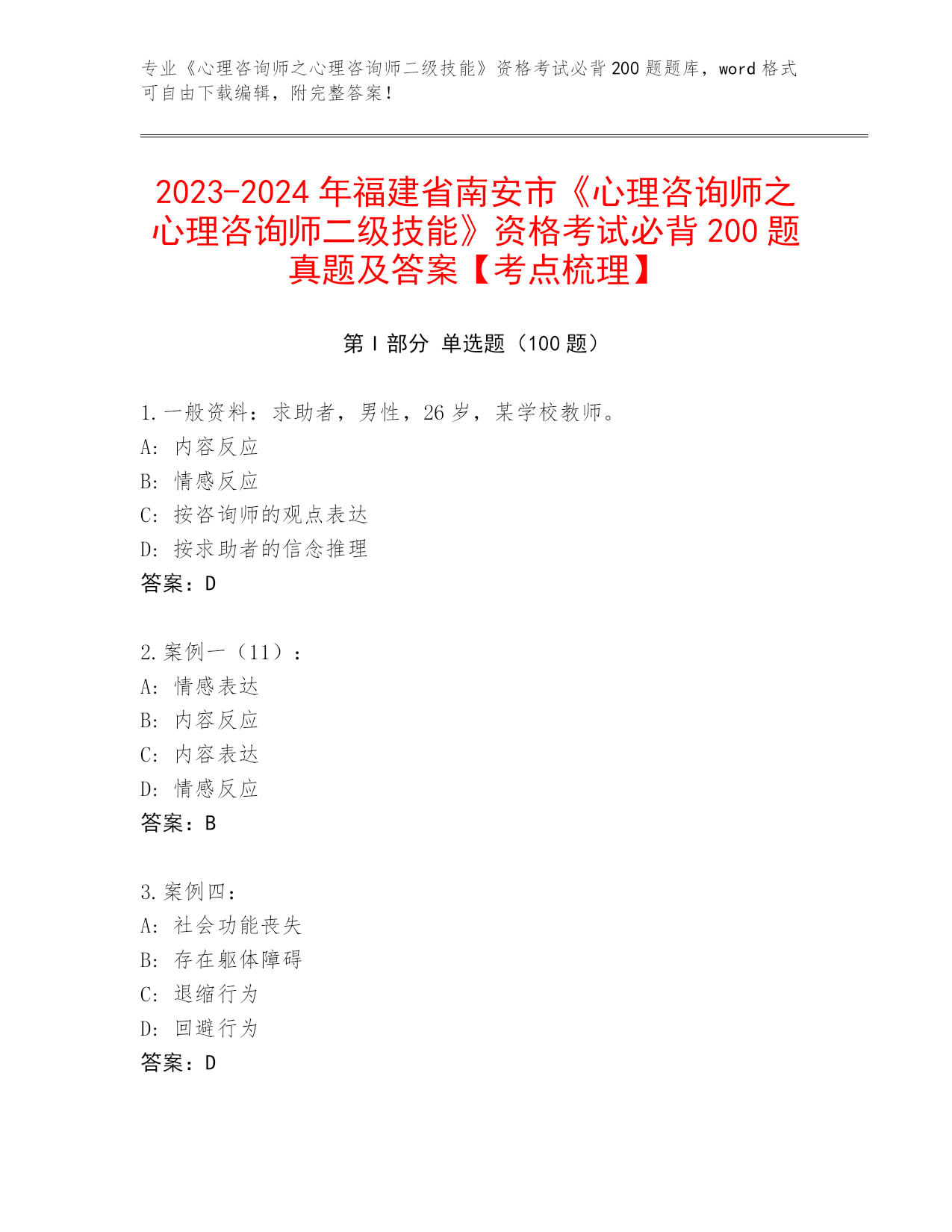 2024年福建省南安市《心理咨询师之心理咨询师二级技能》资格考试必背200题题库及答案(全优)