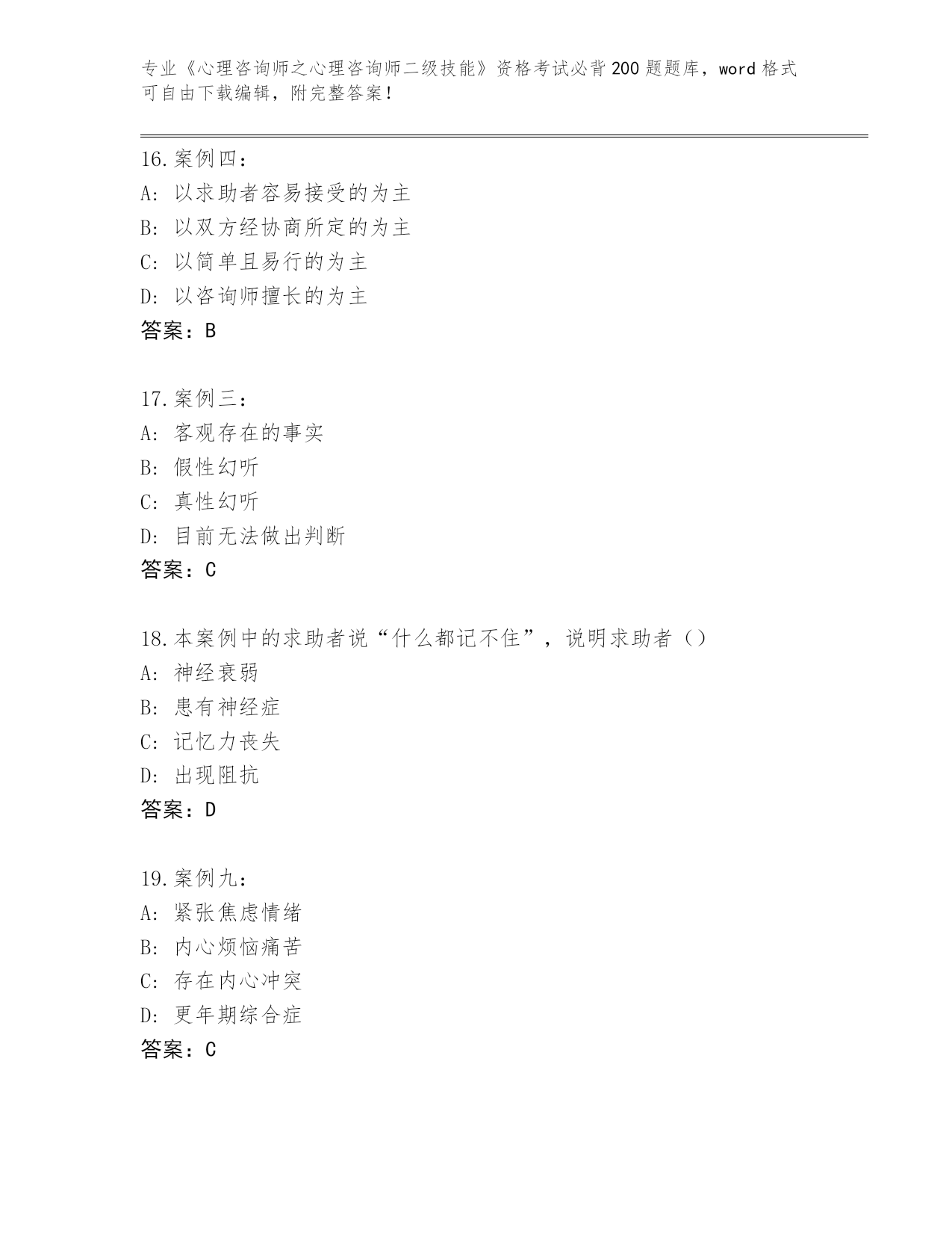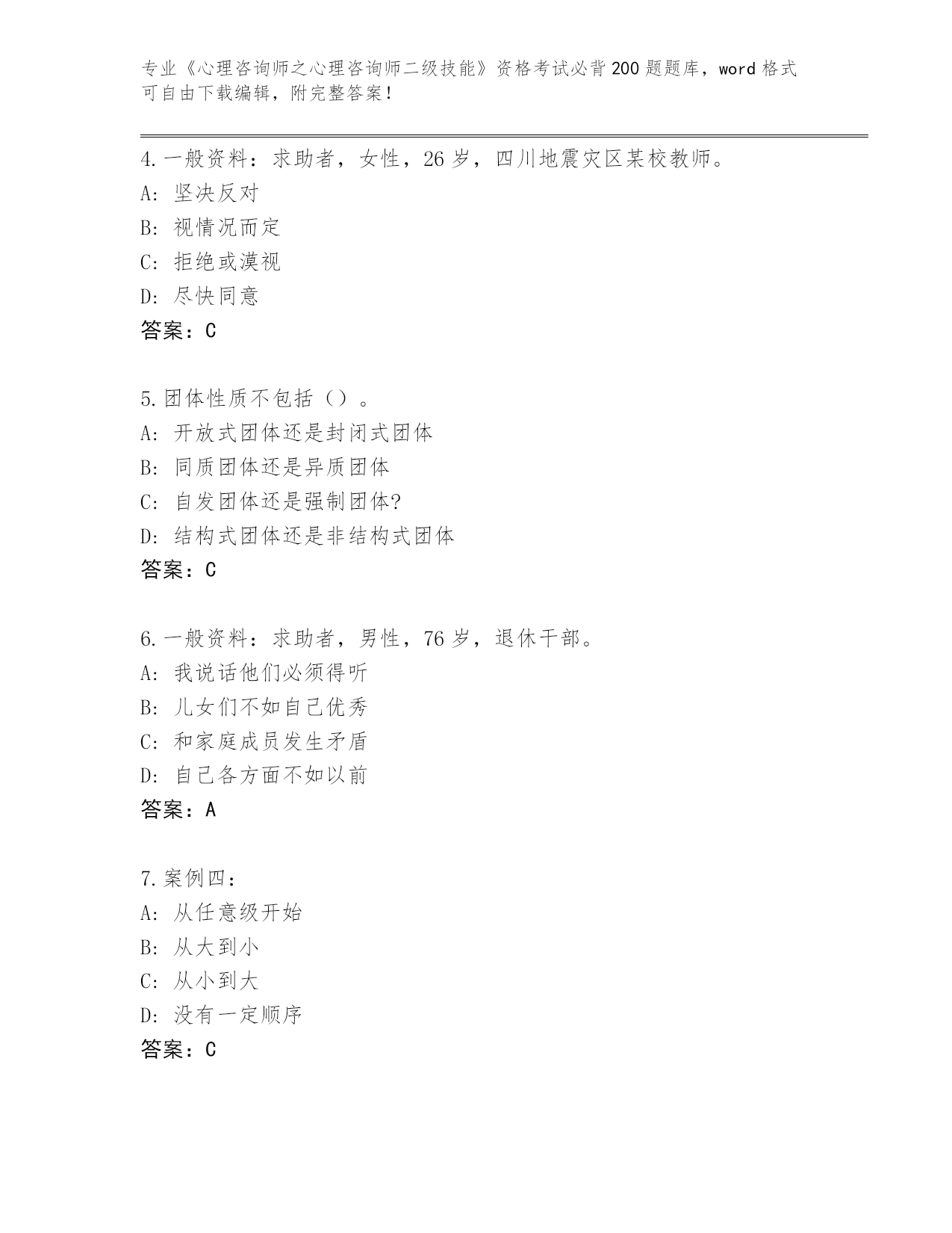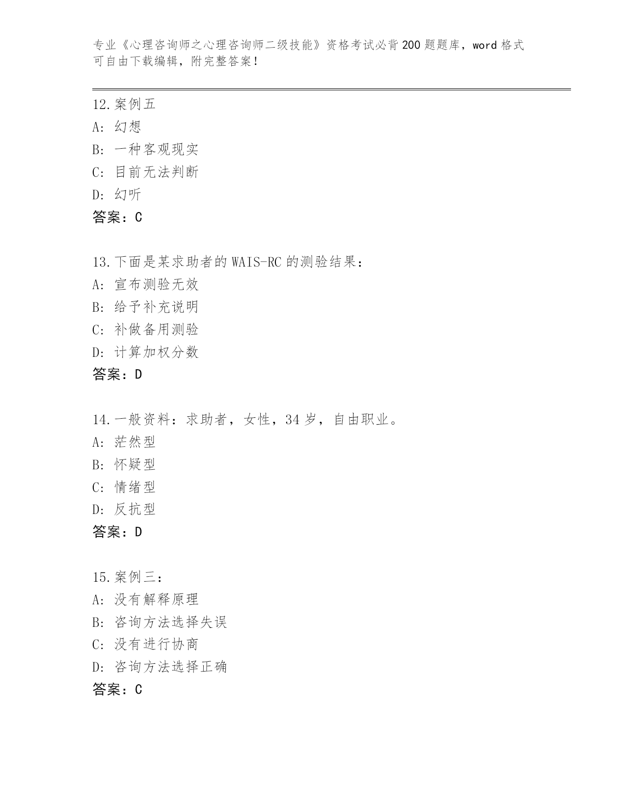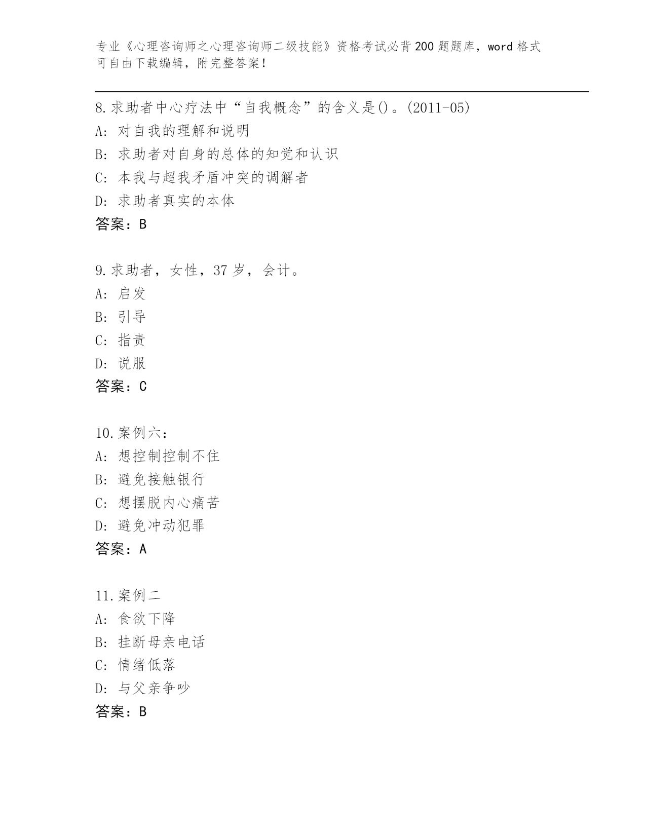 重庆市渝北区2024年《心理咨询师之心理咨询师二级技能》资格考试必背200题真题及答案(考点梳理)
