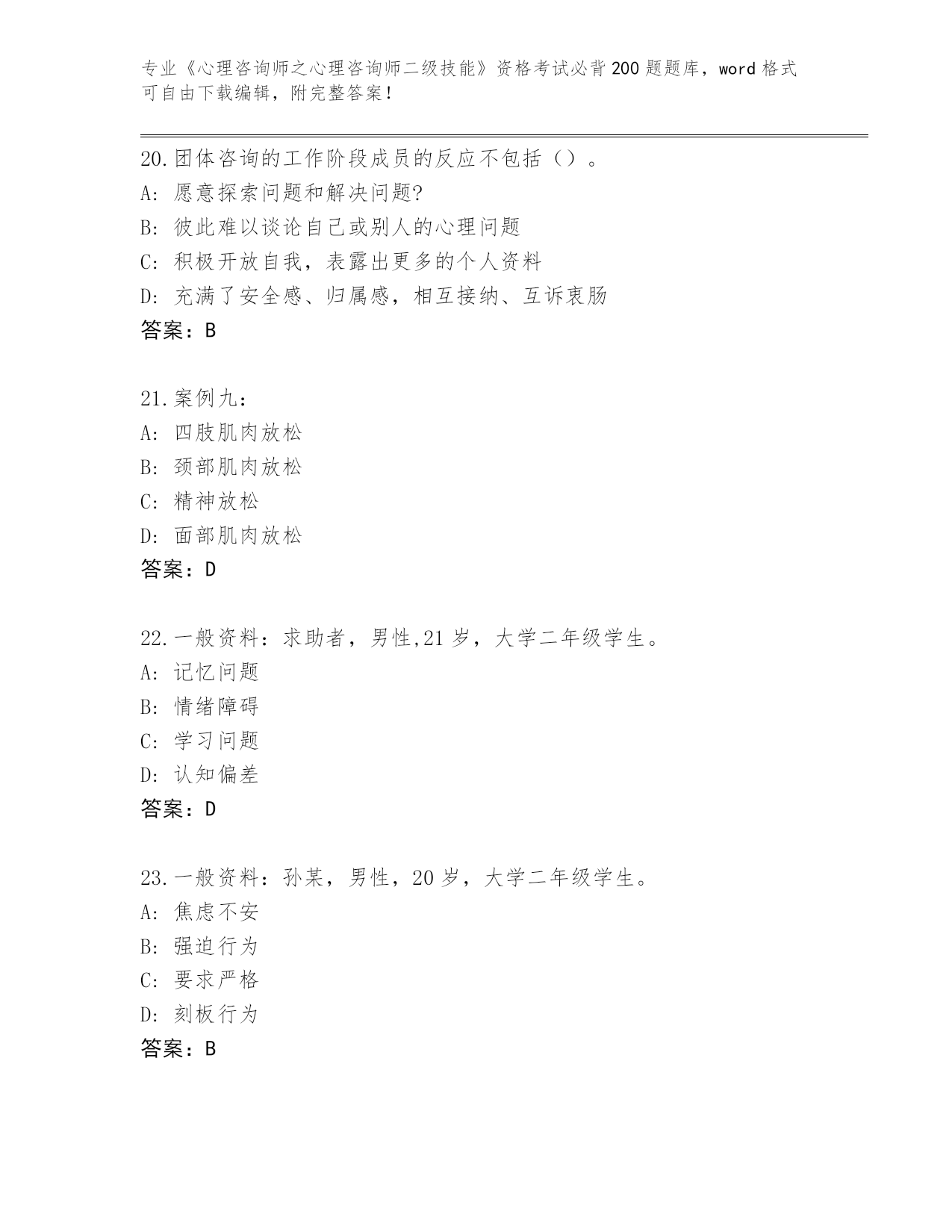 福建省南安市2023-24年《心理咨询师之心理咨询师二级技能》资格考试必背200题真题【培优A卷】