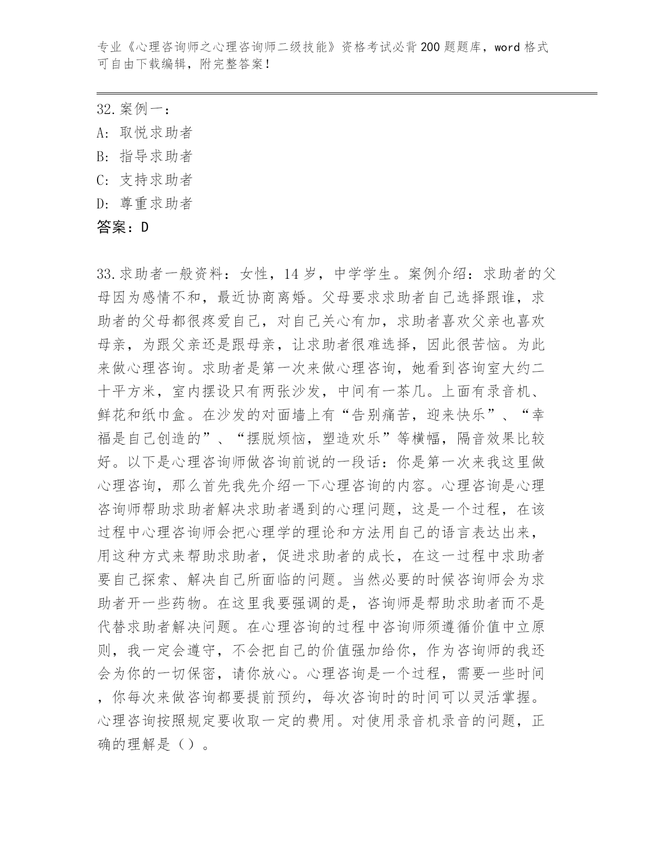 福建省梅列区《心理咨询师之心理咨询师二级技能》资格考试必背200题真题及下载答案