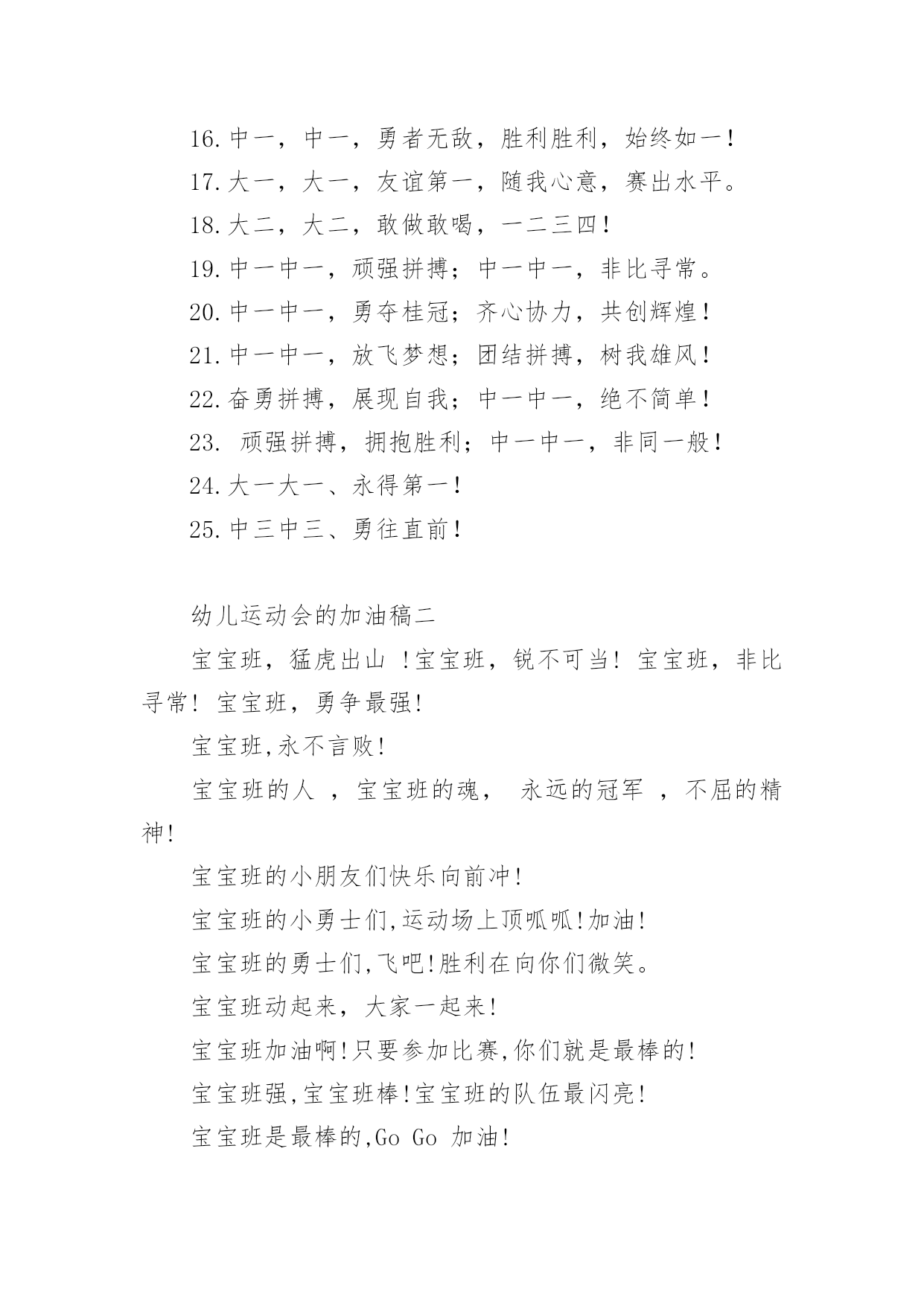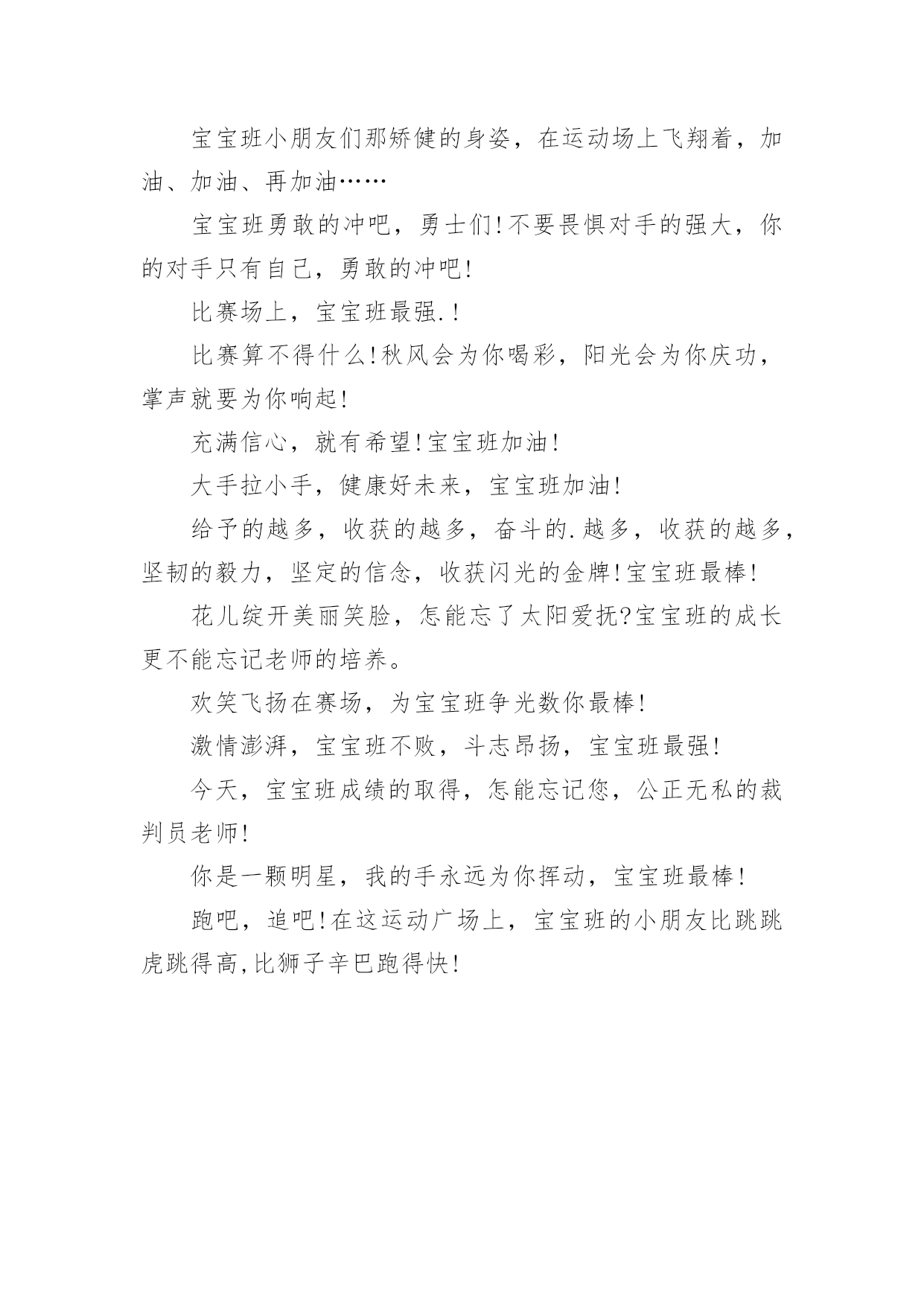 幼儿运动会的加油稿新中国成立以后陆续举办了各个项目的全国比赛和综合性运动会,使得中国的体育事业得到了蓬勃的发展。下面是小编为大家整理的关于幼儿运动会的加油稿,欢迎大家的阅读。幼儿运动会的加油稿一1.我运动我健康我快乐我是最棒的2.大手拉小手我们都来做运动3.大手拉小手,健康好未来4.我运动我健康我快乐运动伴随你和我!5.我运动我健康我快乐,健康宝贝就是我!6.我运动我健康我快乐我阳光7.团结第一,比赛第二8.我运动我健康我快乐我成长9.亲子爱子教子家和家兴家美10.宝宝动起来母子一起来11.亲子有方运动有益12.人小志气大比赛顶呱呱,你行我行争取战胜他!13.强强强强,我是最强,超越刘翔,不准投降。14.扭扭屁股扭扭腰,马上就会长高高。动动手呀动动脚,身体就像棒棒糖。15.小一,小一,齐心协力,小一小一,创造奇迹!16.中一,中一,勇者无敌,胜利胜利,始终如一!17.大一,大一,友谊第一,随我心意,赛出水平。18.大二,大二,敢做敢喝,一二三四!19.中一中一,顽强拼搏;中一中一,非比寻常。20.中一中一,勇夺桂冠;齐心协力,共创辉煌!21.中一中一,放飞梦想;团结拼搏,树我雄风!22.奋勇拼搏,展现自我;中一中一,绝不简单!23.顽强拼搏,拥抱胜利;中一中一,非同一般!24.大一大一、永得第一!25.中三中三、勇往直前!幼儿运动会的加油稿二宝宝班,猛虎出山!宝宝班,锐不可当!宝宝班,非比寻常!宝宝班,勇争最强!宝宝班,永不言败!宝宝班的人,宝宝班的魂,永远的冠军,不屈的精神!宝宝班的小朋友们快乐向前冲!宝宝班的小勇士们,运动场上顶呱呱!加油!宝宝班的勇士们,飞吧!胜利在向你们微笑。宝宝班动起来,大家一起来!宝宝班加油啊!只要参加比赛,你们就是最棒的!宝宝班强,宝宝班棒!宝宝班的队伍最闪亮!宝宝班是最棒的,GoGo加油!宝宝班小朋友们那矫健的身姿,在运动场上飞翔着,加油、加油、再加油……宝宝班勇敢的冲吧,勇士们!不要畏惧对手的强大,你的对手只有自己,勇敢的冲吧!比赛场上,宝宝班最强.!比赛算不得什么!秋风会为你喝彩,阳光会为你庆功,掌声就要为你响起!充满信心,就有希望!宝宝班加油!大手拉小手,健康好未来,宝宝班加油!给予的越多,收获的越多,奋斗的.越多,收获的越多,坚韧的毅力,坚定的信念,收获闪光的金牌!宝宝班最棒!花儿绽开美丽笑脸,怎能忘了太阳爱抚?宝宝班的成长更不能忘记老师的培养。欢笑飞扬在赛场,为宝宝班争光数你最棒!激情澎湃,宝宝班不败,斗志昂扬,宝宝班最强!今天,宝宝班成绩的取得,怎能忘记您,公正无私的裁判员老师!你是一颗明星,我的手永远为你挥动,宝宝班最棒!跑吧,追吧!在这运动广场上,宝宝班的小朋友比跳跳虎跳得高,比狮子辛巴跑得快!
