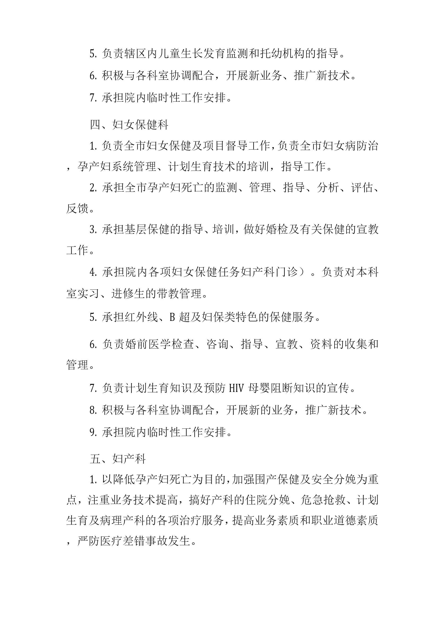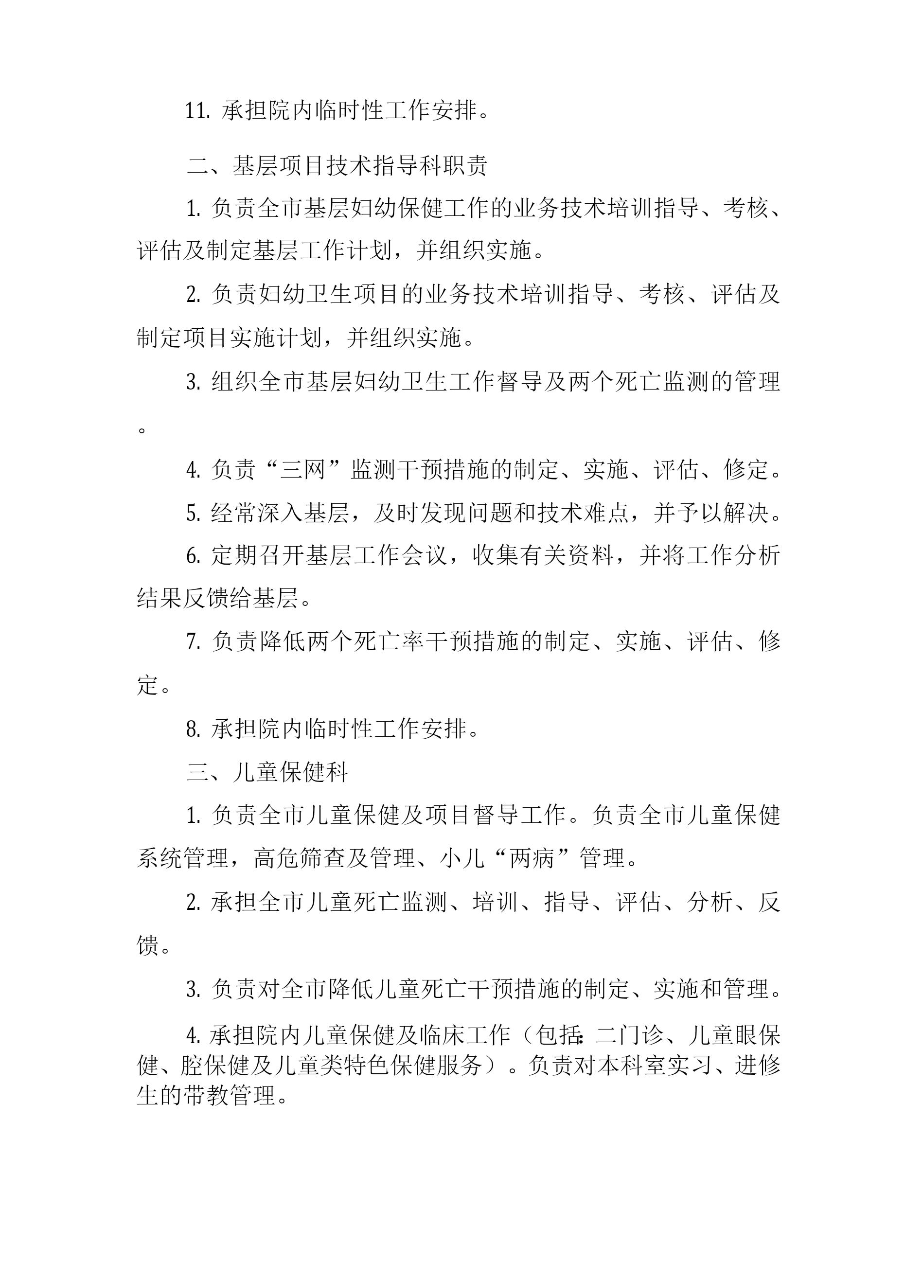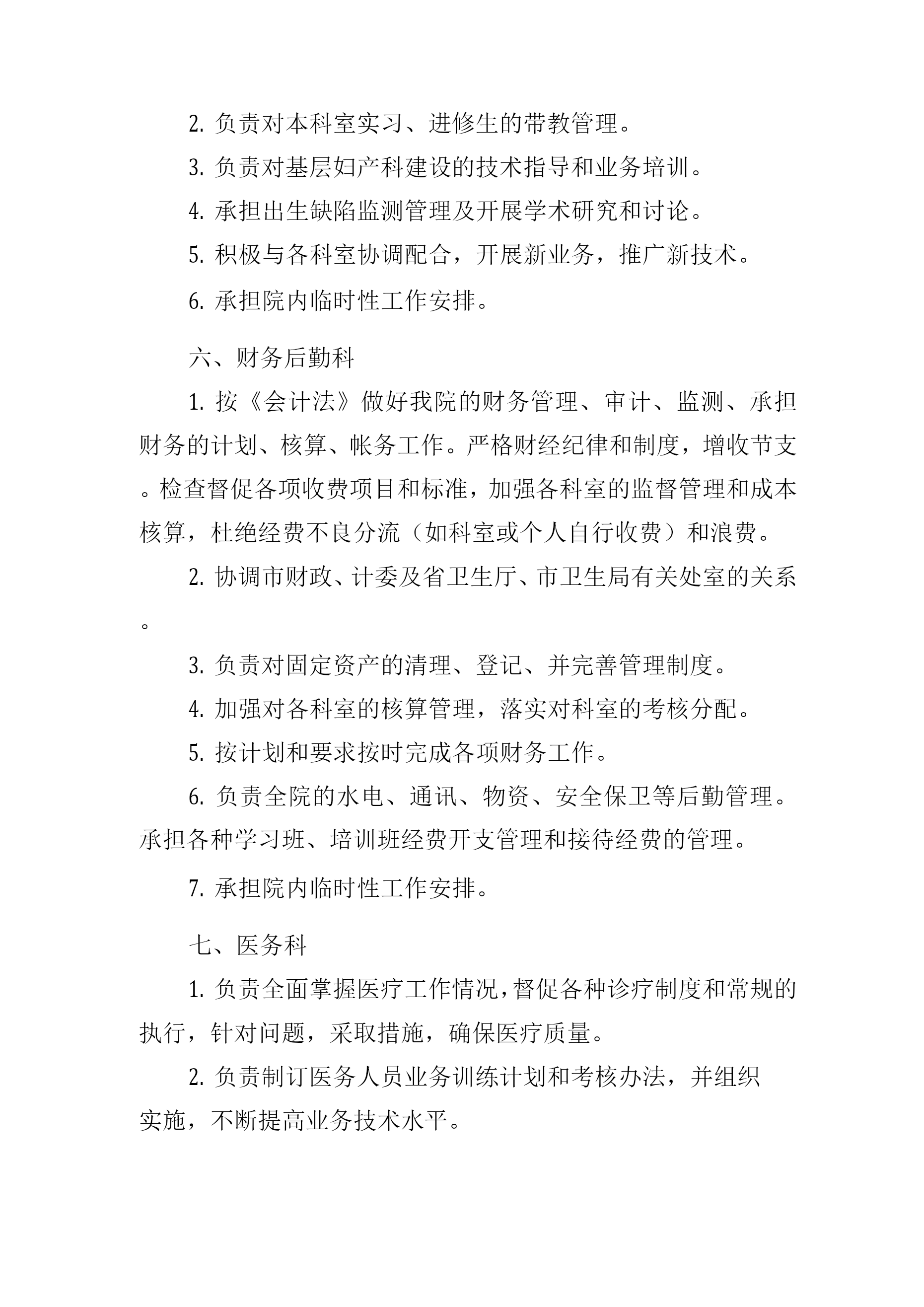 妇幼保健院各类人员职责各科室职责一、办公室行使全院行政综合职能,参与政务及管理事务。承担工资、人事、文秘、信息统计、健康教育、基层保健工作。负责公文的收发、登记、传递、促办、立卷归档及XX工作,及时上报、及时处理、不误事、压事。负责院内工作检查、督促、考核、评估,协调行政职能部门间的关系,搞好来访、接待工作。负责工作用车的管理、调度和安排。组织全院职工进行时事政治、法律法规、职业道德的学习和教育。承担专业技术职务晋升申报材料的收集、整理、上报。负责协会工作(发展会员、开展活动、学术交流、成果申报)。参与督导全市两个死亡监测的管理及妇幼卫生信息(含疫情)的收集、整理、上报、分析、反馈。承担远程教学和院内的业务学习及学术活动,负责协会学分管理及医学继续教育。9承担并协调社区妇幼保健的宣传、指导、评估,负责妇幼保健知识及相关法律法规的宣传。.负责单位各种重要会议和活动的宣传、报道。配合各科做好各种活动的宣传。承担院内临时性工作安排。二、基层项目技术指导科职责负责全市基层妇幼保健工作的业务技术培训指导、考核、评估及制定基层工作计划,并组织实施。负责妇幼卫生项目的业务技术培训指导、考核、评估及制定项目实施计划,并组织实施。组织全市基层妇幼卫生工作督导及两个死亡监测的管理。负责“三网”监测干预措施的制定、实施、评估、修定。经常深入基层,及时发现问题和技术难点,并予以解决。定期召开基层工作会议,收集有关资料,并将工作分析结果反馈给基层。负责降低两个死亡率干预措施的制定、实施、评估、修定。承担院内临时性工作安排。三、儿童保健科负责全市儿童保健及项目督导工作。负责全市儿童保健系统管理,高危筛查及管理、小儿“两病”管理。承担全市儿童死亡监测、培训、指导、评估、分析、反馈。负责对全市降低儿童死亡干预措施的制定、实施和管理。承担院内儿童保健及临床工作(包括:二门诊、儿童眼保健、腔保健及儿童类特色保健服务)。负责对本科室实习、进修生的带教管理。负责辖区内儿童生长发育监测和托幼机构的指导。积极与各科室协调配合,开展新业务、推广新技术。承担院内临时性工作安排。四、妇女保健科负责全市妇女保健及项目督导工作,负责全市妇女病防治,孕产妇系统管理、计划生育技术的培训,指导工作。承担全市孕产妇死亡的监测、管理、指导、分析、评估、反馈。承担基层保健的指导、培训,做好婚检及有关保健的宣教工作。承担院内各项妇女保健任务妇产科门诊)。负责对本科室实习、进修生的带教管理。承担红外线、B超及妇保类特色的保健服务。负责婚前医学检查、咨询、指导、宣教、资料的收集和管理。负责计划生育知识及预防HIV母婴阻断知识的宣传。积极与各科室协调配合,开展新的业务,推广新技术。承担院内临时性工作安排。五、妇产科以降低孕产妇死亡为目的,加强围产保健及安全分娩为重点,注重业务技术提高,搞好产科的住院分娩、危急抢救、计划生育及病理产科的各项治疗服务,提高业务素质和职业道德素质,严防医疗差错事故发生。负责对本科室实习、进修生的带教管理。负责对基层妇产科建设的技术指导和业务培训。承担出生缺陷监测管理及开展学术研究和讨论。积极与各科室协调配合,开展新业务,推广新技术。承担院内临时性工作安排。六、财务后勤科按《会计法》做好我院的财务管理、审计、监测、承担财务的计划、核算、帐务工作。严格财经纪律和制度,增收节支。检查督促各项收费项目和标准,加强各科室的监督管理和成本核算,杜绝经费不良分流(如科室或个人自行收费)和浪费。协调市财政、计委及省卫生厅、市卫生局有关处室的关系。负责对固定资产的清理、登记、并完善管理制度。加强对各科室的核算管理,落实对科室的考核分配。按计划和要求按时完成各项财务工作。负责全院的水电、通讯、物资、安全保卫等后勤管理。承担各种学习班、培训班经费开支管理和接待经费的管理。承担院内临时性工作安排。七、医务科负责全面掌握医疗工作情况,督促各种诊疗制度和常规的执行,针对问题,采取措施,确保医疗质量。负责制订医务人员业务训练计划和考核办法,并组织实施,不断提高业务技术水平。负责组织医疗纠纷、差错、事故的调查、分析,及时向院长和业务副院长汇报,提出处理意见,做好补救措施。负责抓好病历书写和处方书写工作,不断提高病历书写质量和处方合格率,做好病案统计和病历归档管理工作。负责传染病疫情报告的监督管理。负责组织实施临时性院外医疗任务、基层技术指导和巡回医疗等工作。负责对实习、进修生的计划、管理,并组织实施。承担院内临时性工作安排。八、护理部承担全院护理业务的管理、护理技术培训、评估、审核。合理调配使用护理人员。严格护理操作过程,经常检查督促护理质量和护理记录,加强护理人员职业
