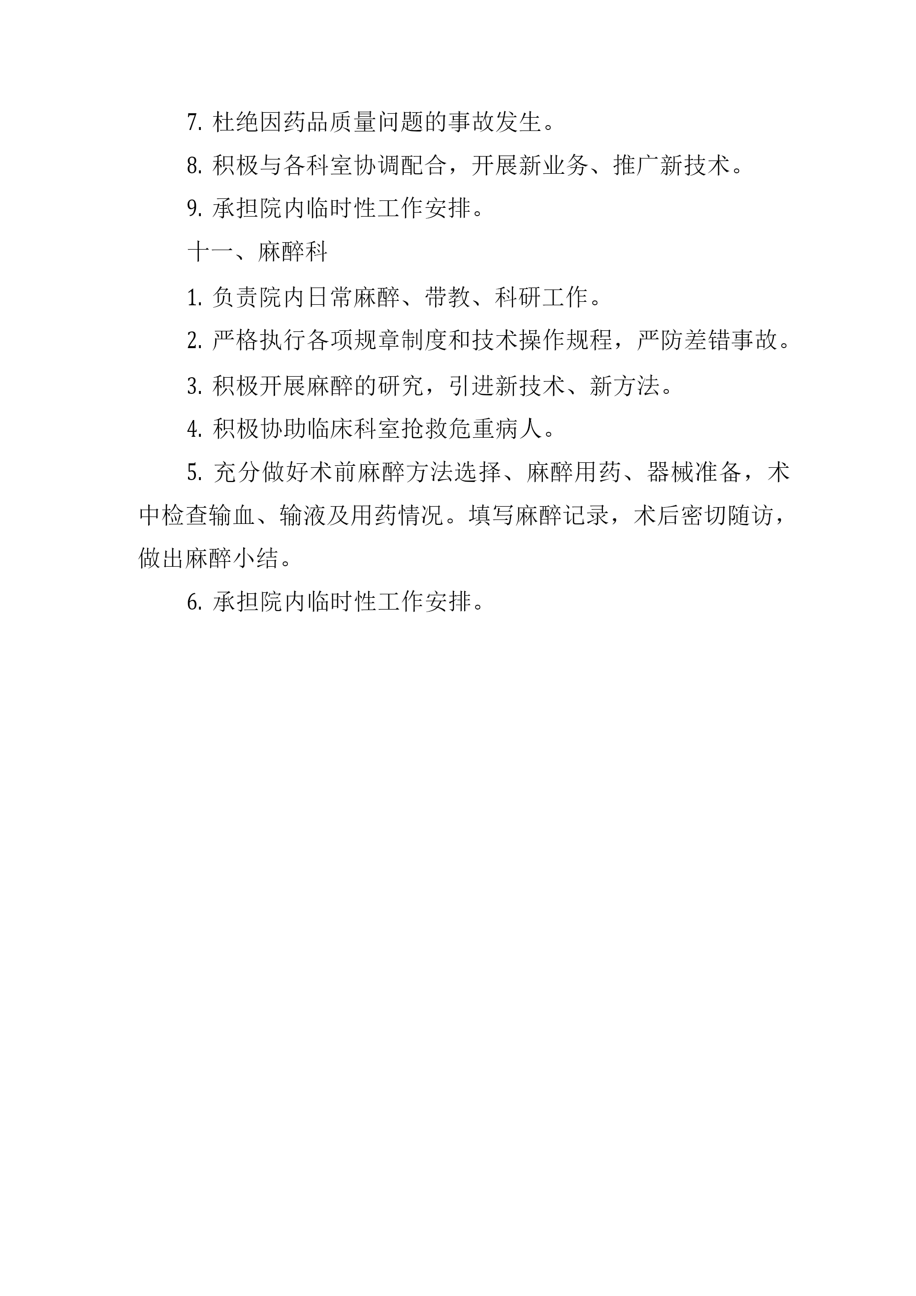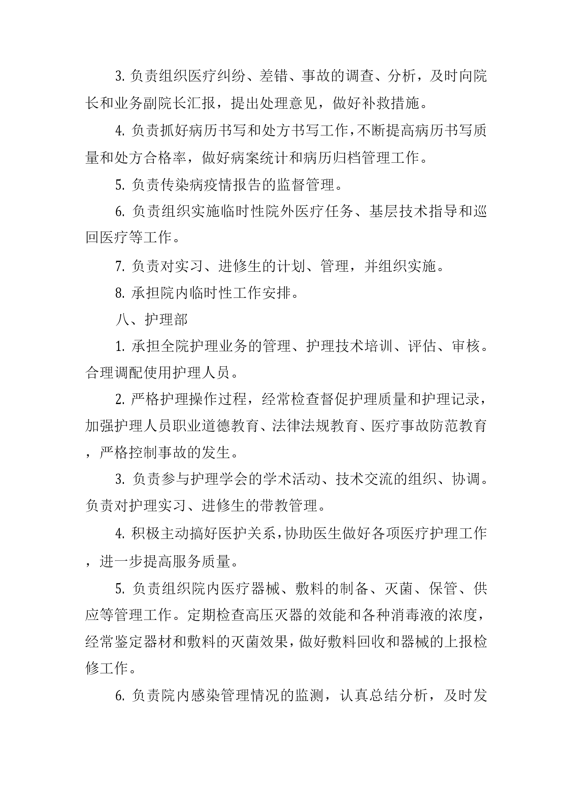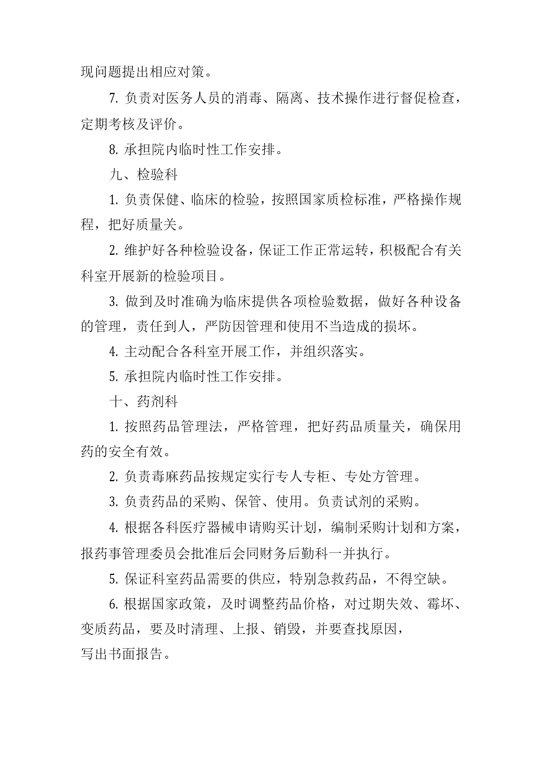 妇幼保健院各类人员职责各科室职责一、办公室行使全院行政综合职能,参与政务及管理事务。承担工资、人事、文秘、信息统计、健康教育、基层保健工作。负责公文的收发、登记、传递、促办、立卷归档及XX工作,及时上报、及时处理、不误事、压事。负责院内工作检查、督促、考核、评估,协调行政职能部门间的关系,搞好来访、接待工作。负责工作用车的管理、调度和安排。组织全院职工进行时事政治、法律法规、职业道德的学习和教育。承担专业技术职务晋升申报材料的收集、整理、上报。负责协会工作(发展会员、开展活动、学术交流、成果申报)。参与督导全市两个死亡监测的管理及妇幼卫生信息(含疫情)的收集、整理、上报、分析、反馈。承担远程教学和院内的业务学习及学术活动,负责协会学分管理及医学继续教育。9承担并协调社区妇幼保健的宣传、指导、评估,负责妇幼保健知识及相关法律法规的宣传。.负责单位各种重要会议和活动的宣传、报道。配合各科做好各种活动的宣传。承担院内临时性工作安排。二、基层项目技术指导科职责负责全市基层妇幼保健工作的业务技术培训指导、考核、评估及制定基层工作计划,并组织实施。负责妇幼卫生项目的业务技术培训指导、考核、评估及制定项目实施计划,并组织实施。组织全市基层妇幼卫生工作督导及两个死亡监测的管理。负责“三网”监测干预措施的制定、实施、评估、修定。经常深入基层,及时发现问题和技术难点,并予以解决。定期召开基层工作会议,收集有关资料,并将工作分析结果反馈给基层。负责降低两个死亡率干预措施的制定、实施、评估、修定。承担院内临时性工作安排。三、儿童保健科负责全市儿童保健及项目督导工作。负责全市儿童保健系统管理,高危筛查及管理、小儿“两病”管理。承担全市儿童死亡监测、培训、指导、评估、分析、反馈。负责对全市降低儿童死亡干预措施的制定、实施和管理。承担院内儿童保健及临床工作(包括:二门诊、儿童眼保健、腔保健及儿童类特色保健服务)。负责对本科室实习、进修生的带教管理。负责辖区内儿童生长发育监测和托幼机构的指导。积极与各科室协调配合,开展新业务、推广新技术。承担院内临时性工作安排。四、妇女保健科负责全市妇女保健及项目督导工作,负责全市妇女病防治,孕产妇系统管理、计划生育技术的培训,指导工作。承担全市孕产妇死亡的监测、管理、指导、分析、评估、反馈。承担基层保健的指导、培训,做好婚检及有关保健的宣教工作。承担院内各项妇女保健任务妇产科门诊)。负责对本科室实习、进修生的带教管理。承担红外线、B超及妇保类特色的保健服务。负责婚前医学检查、咨询、指导、宣教、资料的收集和管理。负责计划生育知识及预防HIV母婴阻断知识的宣传。积极与各科室协调配合,开展新的业务,推广新技术。承担院内临时性工作安排。五、妇产科以降低孕产妇死亡为目的,加强围产保健及安全分娩为重点,注重业务技术提高,搞好产科的住院分娩、危急抢救、计划生育及病理产科的各项治疗服务,提高业务素质和职业道德素质,严防医疗差错事故发生。负责对本科室实习、进修生的带教管理。负责对基层妇产科建设的技术指导和业务培训。承担出生缺陷监测管理及开展学术研究和讨论。积极与各科室协调配合,开展新业务,推广新技术。承担院内临时性工作安排。六、财务后勤科按《会计法》做好我院的财务管理、审计、监测、承担财务的计划、核算、帐务工作。严格财经纪律和制度,增收节支。检查督促各项收费项目和标准,加强各科室的监督管理和成本核算,杜绝经费不良分流(如科室或个人自行收费)和浪费。协调市财政、计委及省卫生厅、市卫生局有关处室的关系。负责对固定资产的清理、登记、并完善管理制度。加强对各科室的核算管理,落实对科室的考核分配。按计划和要求按时完成各项财务工作。负责全院的水电、通讯、物资、安全保卫等后勤管理。承担各种学习班、培训班经费开支管理和接待经费的管理。承担院内临时性工作安排。七、医务科负责全面掌握医疗工作情况,督促各种诊疗制度和常规的执行,针对问题,采取措施,确保医疗质量。负责制订医务人员业务训练计划和考核办法,并组织实施,不断提高业务技术水平。负责组织医疗纠纷、差错、事故的调查、分析,及时向院长和业务副院长汇报,提出处理意见,做好补救措施。负责抓好病历书写和处方书写工作,不断提高病历书写质量和处方合格率,做好病案统计和病历归档管理工作。负责传染病疫情报告的监督管理。负责组织实施临时性院外医疗任务、基层技术指导和巡回医疗等工作。负责对实习、进修生的计划、管理,并组织实施。承担院内临时性工作安排。八、护理部承担全院护理业务的管理、护理技术培训、评估、审核。合理调配使用护理人员。严格护理操作过程,经常检查督促护理质量和护理记录,加强护理人员职业