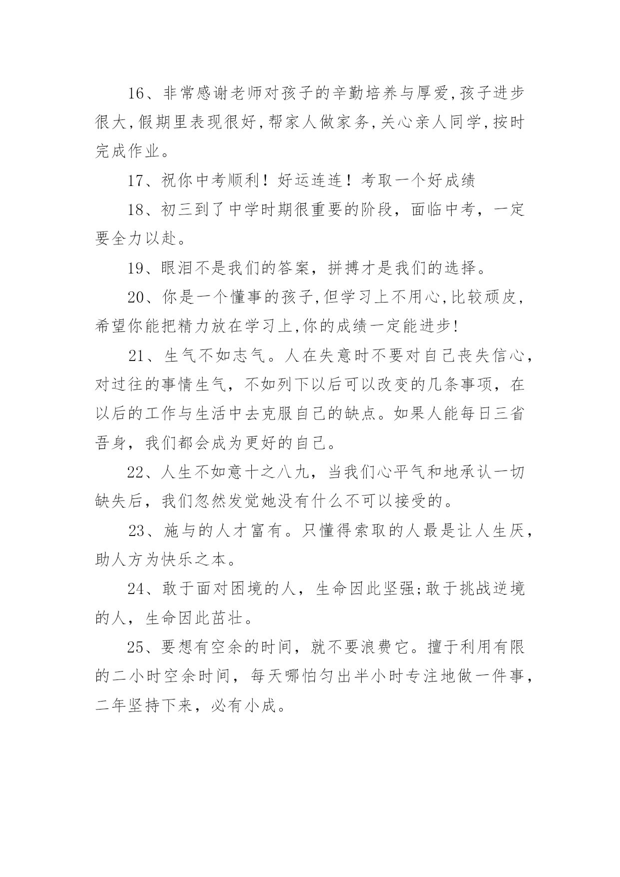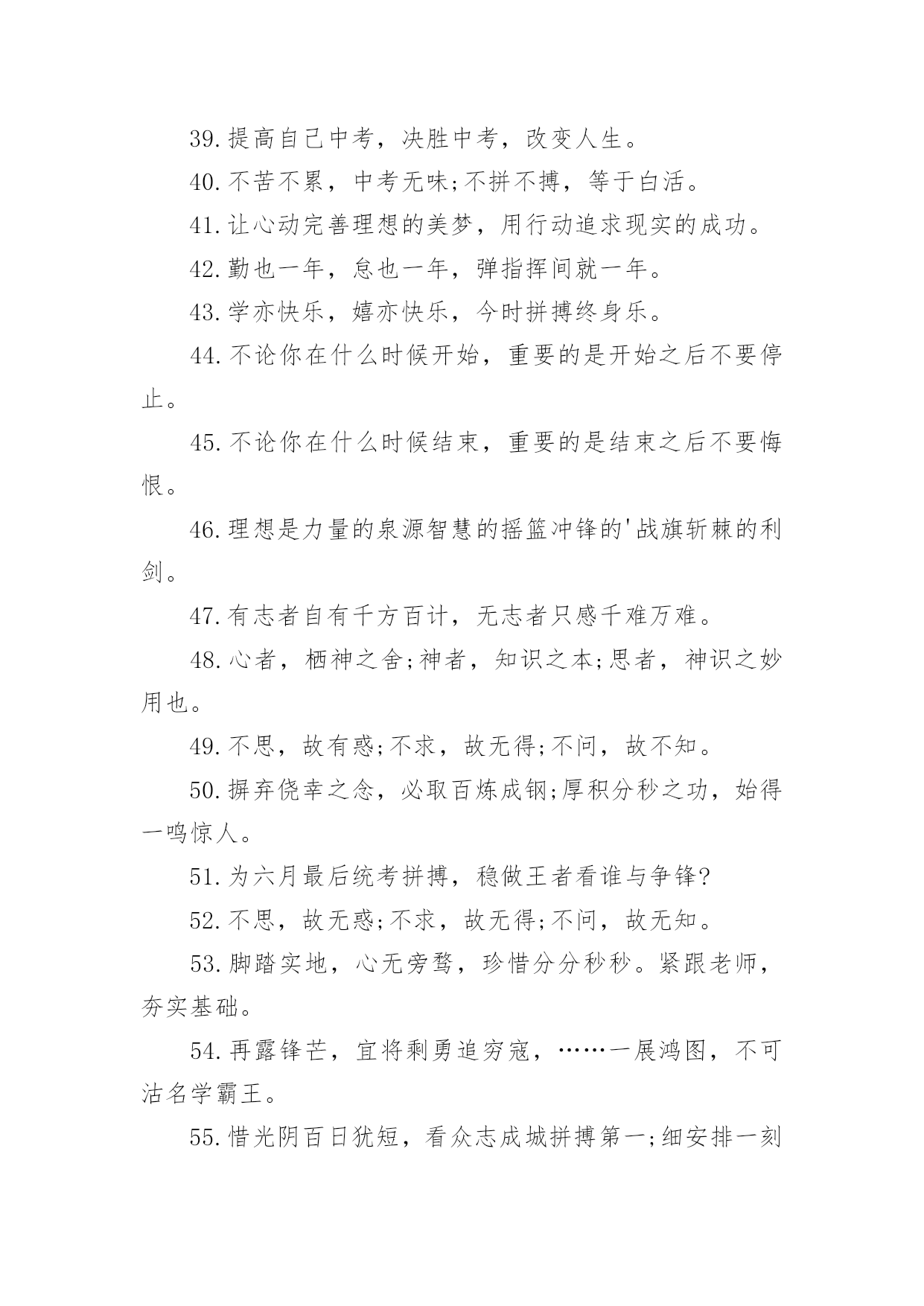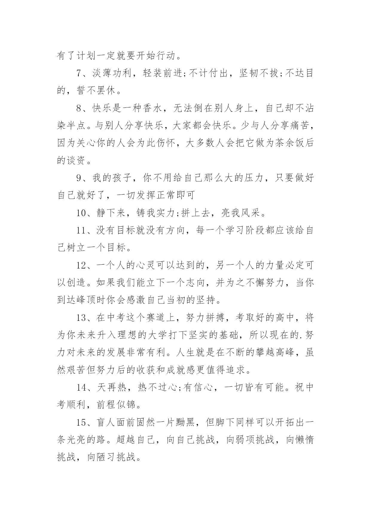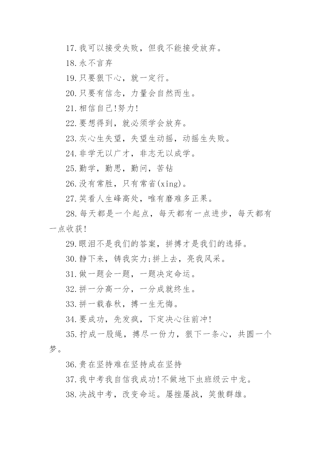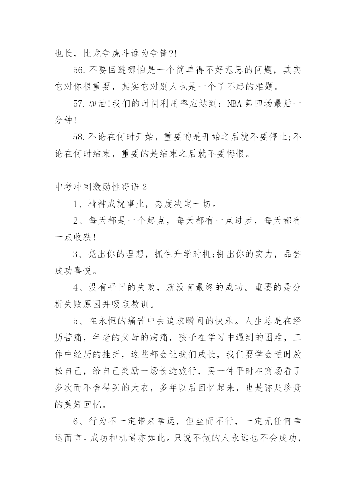 中考冲刺激励性寄语在日常学习、工作或生活中,大家都有写寄语的经历,对寄语很是熟悉吧,借助寄语人们可以表达自己心中的真实感受。那什么样的寄语才是好的寄语呢?以下是小编为大家收集的中考冲刺激励性寄语,欢迎大家分享。中考冲刺激励性寄语11.志不坚者智不达,言不信者行不果。2.立志宜思真品格,读书须尽苦功夫。3.超越自我防分化,挑战极限谱新高。4.厚德博学,自强不息。5.博观细取,厚积薄发。6.自强不息,厚德载物。7.自主自律,自强自信。8.自尊自爱,自重自强。9.埋头读书,抬头做人。10.勤奋踏实,诚实守信。11.求实踏实,落实诚实。12.守时诚信,勤奋踏实。13.鹰击天风壮,鹏飞海浪春。14.成功在此一月!15.努力拼搏,尽力做到最好。16.是金子总会发光,有实力必然成功17.我可以接受失败,但我不能接受放弃。18.永不言弃19.只要狠下心,就一定行。20.只要有信念,力量会自然而生。21.相信自己!努力!22.要想得到,就必须学会放弃。23.灰心生失望,失望生动摇,动摇生失败。24.非学无以广才,非志无以成学。25.勤学,勤思,勤问,苦钻26.没有常胜,只有常省(xing)。27.笑看人生峰高处,唯有磨难多正果。28.每天都是一个起点,每天都有一点进步,每天都有一点收获!29.眼泪不是我们的答案,拼搏才是我们的选择。30.静下来,铸我实力;拼上去,亮我风采。31.做一题会一题,一题决定命运。32.拼一分高一分,一分成就终生。33.拼一载春秋,搏一生无悔。34.要成功,先发疯,下定决心往前冲!35.拧成一股绳,搏尽一份力,狠下一条心,共圆一个梦。36.贵在坚持难在坚持成在坚持37.我中考我自信我成功!不做地下虫班级云中龙。38.决战中考,改变命运。屡挫屡战,笑傲群雄。39.提高自己中考,决胜中考,改变人生。40.不苦不累,中考无味;不拼不搏,等于白活。41.让心动完善理想的美梦,用行动追求现实的成功。42.勤也一年,怠也一年,弹指挥间就一年。43.学亦快乐,嬉亦快乐,今时拼搏终身乐。44.不论你在什么时候开始,重要的是开始之后不要停止。45.不论你在什么时候结束,重要的是结束之后不要悔恨。46.理想是力量的泉源智慧的摇篮冲锋的'战旗斩棘的利剑。47.有志者自有千方百计,无志者只感千难万难。48.心者,栖神之舍;神者,知识之本;思者,神识之妙用也。49.不思,故有惑;不求,故无得;不问,故不知。50.摒弃侥幸之念,必取百炼成钢;厚积分秒之功,始得一鸣惊人。51.为六月最后统考拼搏,稳做王者看谁与争锋?52.不思,故无惑;不求,故无得;不问,故无知。53.脚踏实地,心无旁骛,珍惜分分秒秒。紧跟老师,夯实基础。54.再露锋芒,宜将剩勇追穷寇,……一展鸿图,不可沽名学霸王。55.惜光阴百日犹短,看众志成城拼搏第一;细安排一刻也长,比龙争虎斗谁为争锋?!56.不要回避哪怕是一个简单得不好意思的问题,其实它对你很重要,其实它对别人也是一个了不起的难题。57.加油!我们的时间利用率应达到:NBA第四场最后一分钟!58.不论在何时开始,重要的是开始之后就不要停止;不论在何时结束,重要的是结束之后就不要悔恨。中考冲刺激励性寄语21、精神成就事业,态度决定一切。2、每天都是一个起点,每天都有一点进步,每天都有一点收获!3、亮出你的理想,抓住升学时机;拼出你的实力,品尝成功喜悦。4、没有平日的失败,就没有最终的成功。重要的是分析失败原因并吸取教训。5、在永恒的痛苦中去追求瞬间的快乐。人生总是在经历苦痛,年老的父母的病痛,孩子在学习中遇到的困难,工作中经历的挫折,这些都会让我们成长,我们要学会适时放松自己,给自己奖励一场长途旅行,买一件平时在商场看了多次而不舍得买的大衣,多年以后回忆起来,也是弥足珍贵的美好回忆。6、行为不一定带来幸运,但坐而不行,一定无任何幸运而言。成功和机遇亦如此。只说不做的人永远也不会成功,有了计划一定就要开始行动。7、淡薄功利,轻装前进;不计付出,坚韧不拔;不达目的,誓不罢休。8、快乐是一种香水,无法倒在别人身上,自己却不沾染半点。与别人分享快乐,大家都会快乐。少与人分享痛苦,因为关心你的人会为此伤怀,大多数人会把它做为茶余饭后的谈资。9、我的孩子,你不用给自己那么大的压力,只要做好自己就好了,一切发挥正常即可10、静下来,铸我实力;拼上去,亮我风采。11、没有目标就没有方向,每一个学习阶段都应该给自己树立一个目标。12、一个人的心灵可以达到的,另一个人的力量必定可以创造。如果我们能立下一个志向,并为之不懈努力,当你到达峰顶时你会感激自己当初的坚持。13、在中考这个赛道上,努力拼搏,考取好的高中,将为你未来升入理想的大学打下坚实的基础,所以现在的.努力对未来的发展非常有利。人生就是在不断的攀越高峰,虽然艰苦但努力后的收获和成就