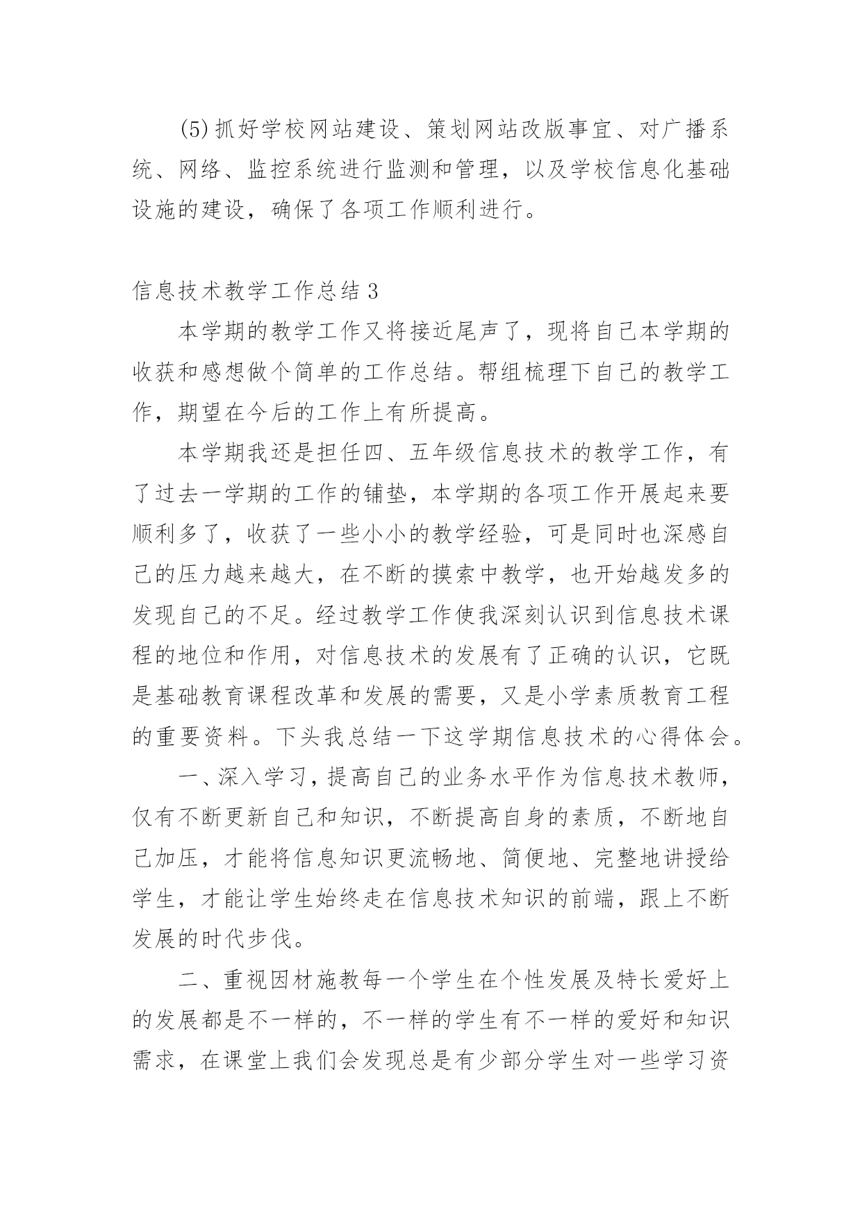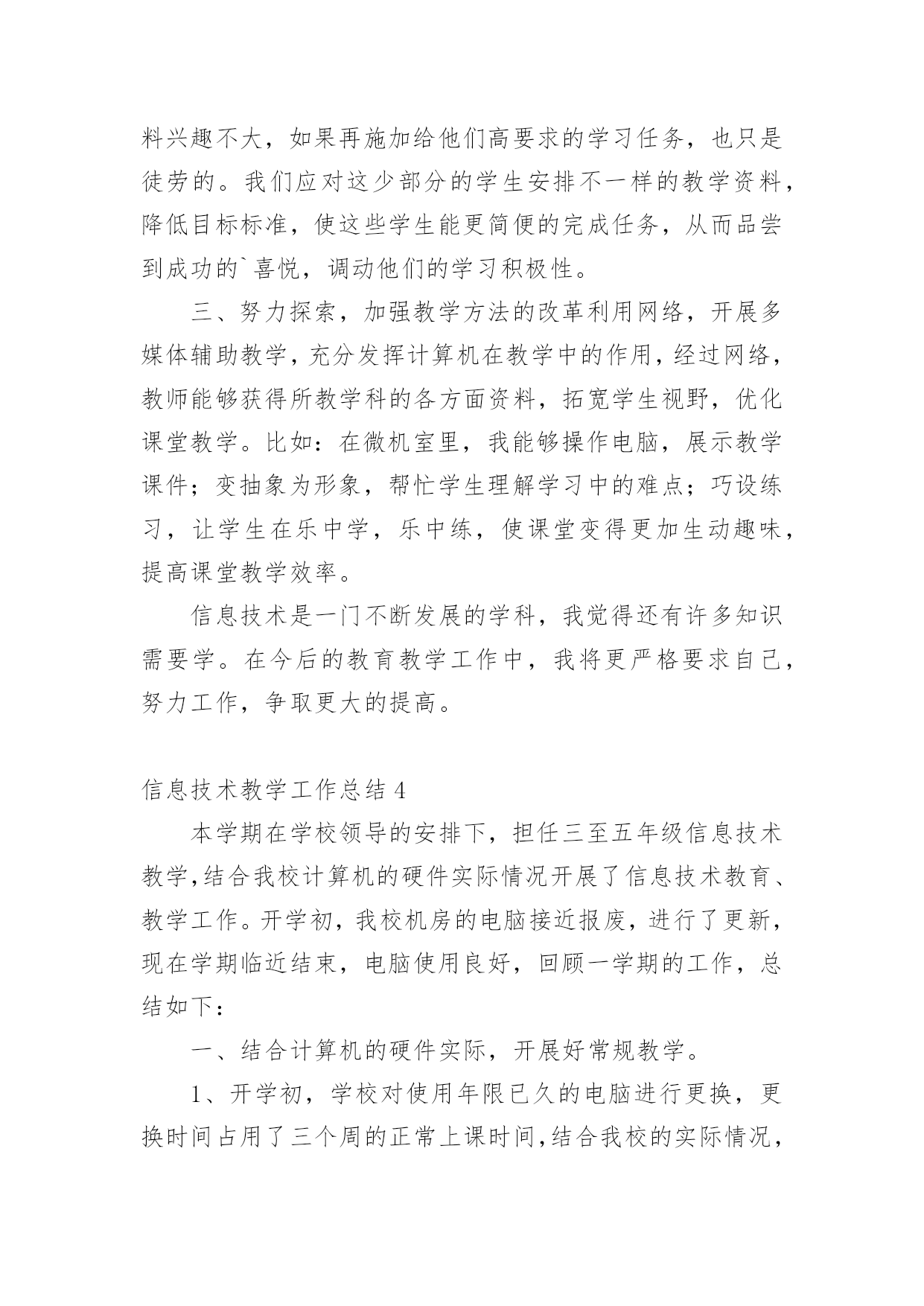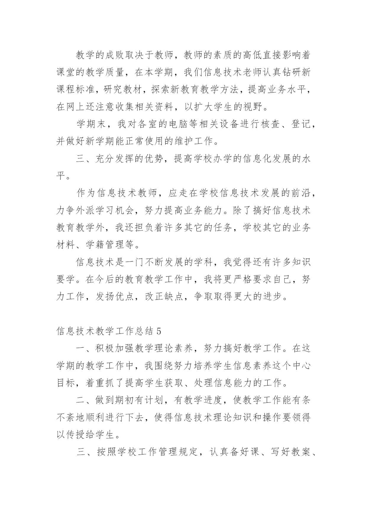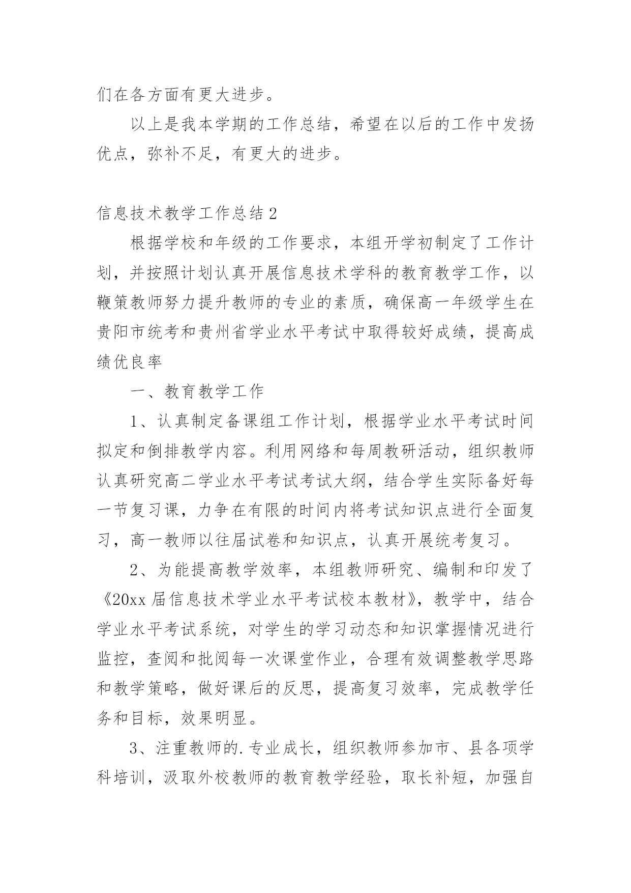 信息技术教学工作总结信息技术教学工作总结15篇总结是指对某一阶段的工作、学习或思想中的经验或情况进行分析研究,做出带有规律性结论的书面材料,它可以给我们下一阶段的学习和工作生活做指导,因此十分有必须要写一份总结哦。那么总结有什么格式呢?下面是小编为大家收集的信息技术教学工作总结,希望能够帮助到大家。信息技术教学工作总结1弹指一挥间,我在教师的岗位上又平凡地走过了一年。追忆往昔,这一年来的工作自己没有取得什么大的成绩,顺利地完成了本学年的工作。展望未来,为了总结过去,扬长避短,使自己站得更高、走得更好,寄望明天的工作更为进步,现将20xx年度的工作情况总结如下:一、思想方面我在思想上能够按照一个党员的标准严以律己,热爱党的教育事业。与老师团结合作,能够正确处理好教师之间、师生之间的关系,把他们作为自己学习的榜样。一学期来,我还积极参加各类业务培训和学习,努力提高自己的业务水平。遵守学校各项规章制度,服从学校的各项工作安排。二、教学工作作为一个刚转行不久的教师,对于信息技术学科的课堂教学、教学研讨、课外辅导等工作都需要向同行多学习,多总结。3年来,我一直严格要求自己,努力钻研业务。争取上好每一节课是我一直以来奋斗的目标。所以,为了实现这个目标,我加大备课的容量,加强上课质量,落实反思的.分量。首先,我积极参加钢城片区教研联盟校的各种教研活动,把学来的理论知识与教学实践相结合;努力学习理论知识,用新课程理念武装自己,与时俱进,让新课程也走进我的课堂;虚心向他人学习,跨学科听课,学校有讲课活动积极参加,生怕漏听了任何一节课。认真反思自己的每一节课,当一节课上万之后我总考虑一下,我这节课成功的地方在哪里,哪些地方学生不好接受,我以后怎么改进,这样做好反思,再进行二次备课。就这样我不断努力探索,建立了“激趣导入——自主尝试——归纳总结——练习实践”这样的教学模式,激发学生的学习兴趣,使学生能够主动学习自主探究,从而自主的接受信息技术课。通过我的努力,学生上微机课,不再是只想着玩游戏了,而是能够主动的学习知识,有的甚至还能在所学的基础上有所创新。我在辛勤努力之后得到了学生的理解和认同,这是我几年来最想见到的。虽然信息技术相对于语文数学来说显得相对弱势,最开始还被大家认为是连专科都不算的“二课”,但是随着我们一代代信息技术教师的努力,我们一定会让信息技术学科也能成为教育花园里的一朵奇葩。三、工作室工作20xx年参加经济技术开发区(头屯河区)教育局信息技术名师工作室,成为工作室成员,在93小李发利老师的带领下,全年参与工作室活动总计12次,包括上课、听课、评课、观摩、听讲座、远程教研、课题研讨等一系列的活动,在活动中学习交流,在活动中锻炼提升。全年累计听课40余节次,提交教学论文,教学课例,教学设计各2篇,在工作室其他老师的帮助指导下,教学水平和业务能力有了一定的提高,这是一个个人专业化成长的良好平台,我将在今后的工作中更加虚心向各位老师学习,努力提高自己教育教学水平。四、其他工作我这学年依然承担了学校班班通设备维护、资产管理、非线性编辑、校园监控系统,校园广播系统的管理维护等工作五、努力方向反思本学年来的工作,在看成绩的同时,也在思量着自己在工作中的不足。不足有以下几点:1、对于信息技术的教学思考的少了一些,出现了一些倦怠现象。2、教科研方面认真研读了一些有关理论书籍,但在教学实践中的应用还不到位,研究做得不够细和实,没达到自己心中的目标;3、对差生多些关心,多点爱心,再多一些耐心,使他们在各方面有更大进步。以上是我本学期的工作总结,希望在以后的工作中发扬优点,弥补不足,有更大的进步。信息技术教学工作总结2根据学校和年级的工作要求,本组开学初制定了工作计划,并按照计划认真开展信息技术学科的教育教学工作,以鞭策教师努力提升教师的专业的素质,确保高一年级学生在贵阳市统考和贵州省学业水平考试中取得较好成绩,提高成绩优良率一、教育教学工作1、认真制定备课组工作计划,根据学业水平考试时间拟定和倒排教学内容。利用网络和每周教研活动,组织教师认真研究高二学业水平考试考试大纲,结合学生实际备好每一节复习课,力争在有限的时间内将考试知识点进行全面复习,高一教师以往届试卷和知识点,认真开展统考复习。2、为能提高教学效率,本组教师研究、编制和印发了《20xx届信息技术学业水平考试校本教材》,教学中,结合学业水平考试系统,对学生的学习动态和知识掌握情况进行监控,查阅和批阅每一次课堂作业,合理有效调整教学思路和教学策略,做好课后的反思,提高复习效率,完成教学任务和目标,效果明显。3、注重教师的.专业成长,组织教师参加市、县各项学科培训,汲取外校教师的教育教学经验,取长补短,加强自身的业务能力学习,努力提升自身的修养和品位,积极参加各级各类比赛活动,为丰富和评职创造