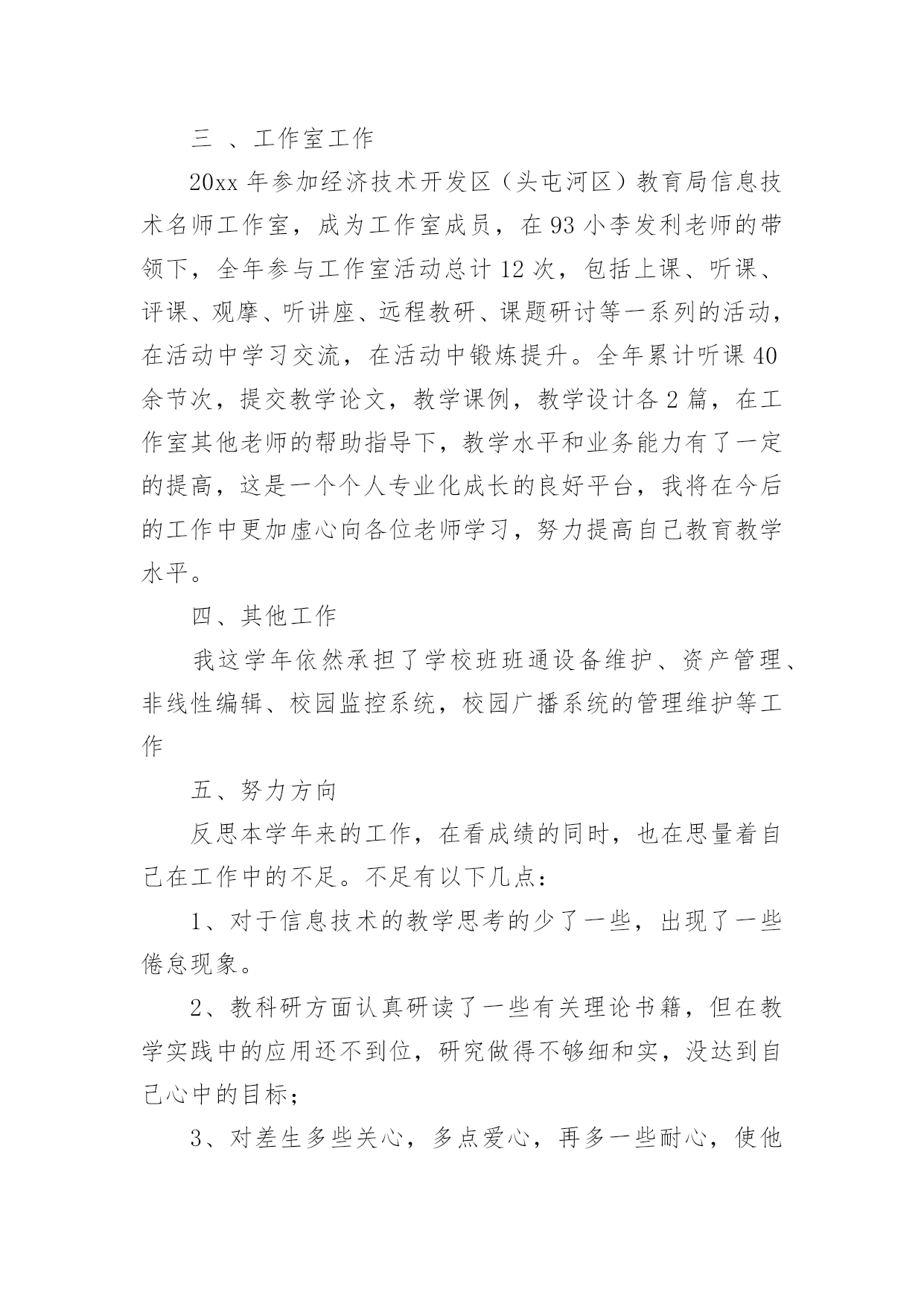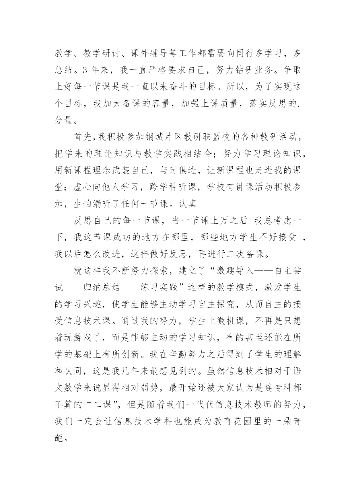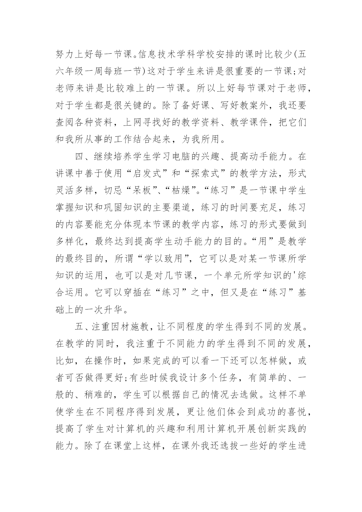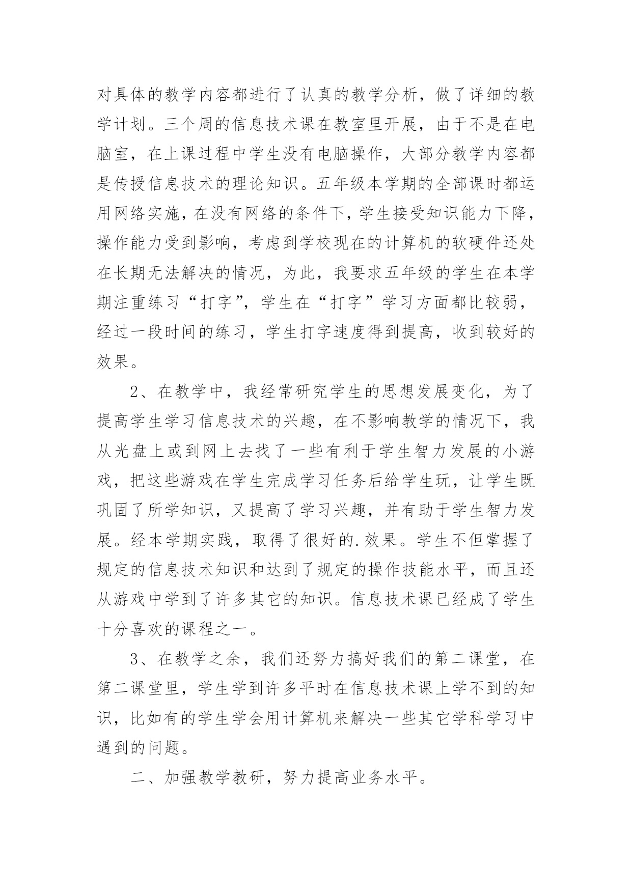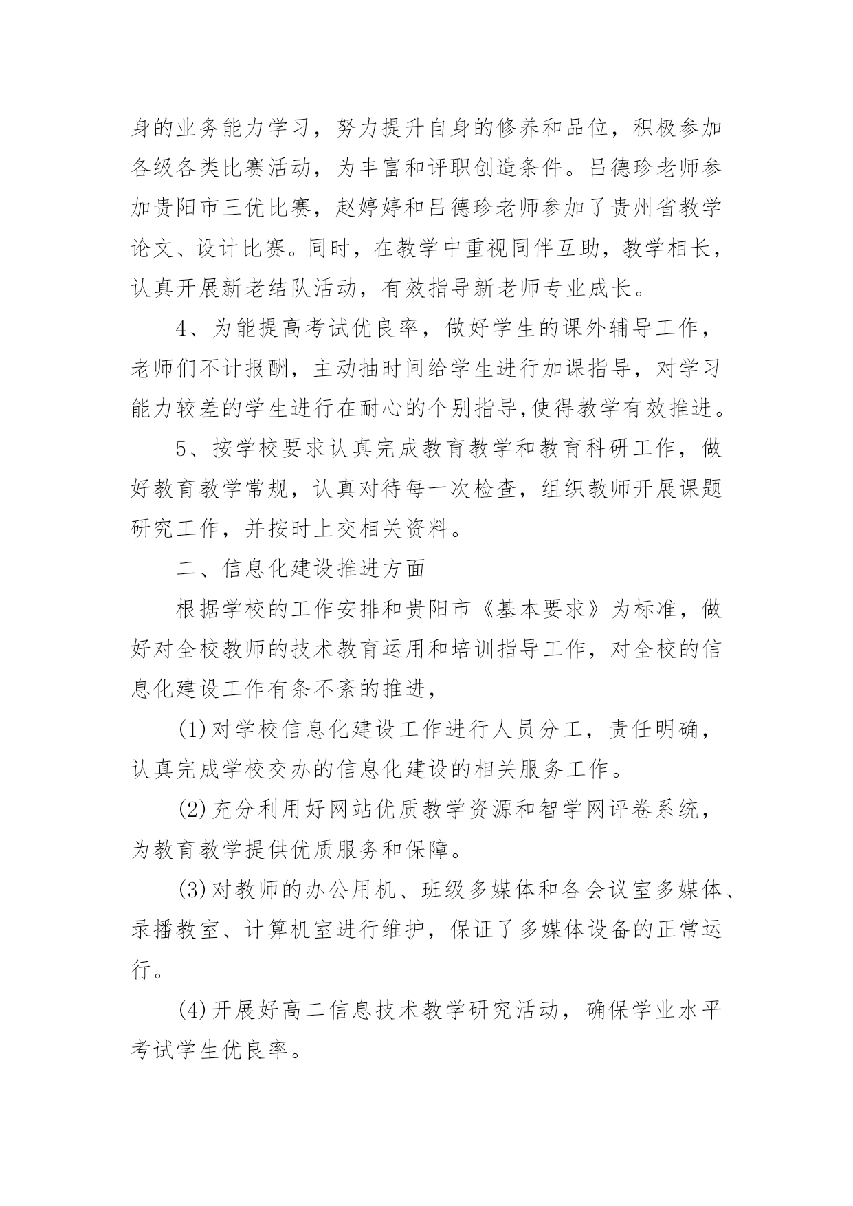 信息技术教学工作总结信息技术教学工作总结15篇总结是指对某一阶段的工作、学习或思想中的经验或情况进行分析研究,做出带有规律性结论的书面材料,它可以给我们下一阶段的学习和工作生活做指导,因此十分有必须要写一份总结哦。那么总结有什么格式呢?下面是小编为大家收集的信息技术教学工作总结,希望能够帮助到大家。信息技术教学工作总结1弹指一挥间,我在教师的岗位上又平凡地走过了一年。追忆往昔,这一年来的工作自己没有取得什么大的成绩,顺利地完成了本学年的工作。展望未来,为了总结过去,扬长避短,使自己站得更高、走得更好,寄望明天的工作更为进步,现将20xx年度的工作情况总结如下:一、思想方面我在思想上能够按照一个党员的标准严以律己,热爱党的教育事业。与老师团结合作,能够正确处理好教师之间、师生之间的关系,把他们作为自己学习的榜样。一学期来,我还积极参加各类业务培训和学习,努力提高自己的业务水平。遵守学校各项规章制度,服从学校的各项工作安排。二、教学工作作为一个刚转行不久的教师,对于信息技术学科的课堂教学、教学研讨、课外辅导等工作都需要向同行多学习,多总结。3年来,我一直严格要求自己,努力钻研业务。争取上好每一节课是我一直以来奋斗的目标。所以,为了实现这个目标,我加大备课的容量,加强上课质量,落实反思的.分量。首先,我积极参加钢城片区教研联盟校的各种教研活动,把学来的理论知识与教学实践相结合;努力学习理论知识,用新课程理念武装自己,与时俱进,让新课程也走进我的课堂;虚心向他人学习,跨学科听课,学校有讲课活动积极参加,生怕漏听了任何一节课。认真反思自己的每一节课,当一节课上万之后我总考虑一下,我这节课成功的地方在哪里,哪些地方学生不好接受,我以后怎么改进,这样做好反思,再进行二次备课。就这样我不断努力探索,建立了“激趣导入——自主尝试——归纳总结——练习实践”这样的教学模式,激发学生的学习兴趣,使学生能够主动学习自主探究,从而自主的接受信息技术课。通过我的努力,学生上微机课,不再是只想着玩游戏了,而是能够主动的学习知识,有的甚至还能在所学的基础上有所创新。我在辛勤努力之后得到了学生的理解和认同,这是我几年来最想见到的。虽然信息技术相对于语文数学来说显得相对弱势,最开始还被大家认为是连专科都不算的“二课”,但是随着我们一代代信息技术教师的努力,我们一定会让信息技术学科也能成为教育花园里的一朵奇葩。三、工作室工作20xx年参加经济技术开发区(头屯河区)教育局信息技术名师工作室,成为工作室成员,在93小李发利老师的带领下,全年参与工作室活动总计12次,包括上课、听课、评课、观摩、听讲座、远程教研、课题研讨等一系列的活动,在活动中学习交流,在活动中锻炼提升。全年累计听课40余节次,提交教学论文,教学课例,教学设计各2篇,在工作室其他老师的帮助指导下,教学水平和业务能力有了一定的提高,这是一个个人专业化成长的良好平台,我将在今后的工作中更加虚心向各位老师学习,努力提高自己教育教学水平。四、其他工作我这学年依然承担了学校班班通设备维护、资产管理、非线性编辑、校园监控系统,校园广播系统的管理维护等工作五、努力方向反思本学年来的工作,在看成绩的同时,也在思量着自己在工作中的不足。不足有以下几点:1、对于信息技术的教学思考的少了一些,出现了一些倦怠现象。2、教科研方面认真研读了一些有关理论书籍,但在教学实践中的应用还不到位,研究做得不够细和实,没达到自己心中的目标;3、对差生多些关心,多点爱心,再多一些耐心,使他们在各方面有更大进步。以上是我本学期的工作总结,希望在以后的工作中发扬优点,弥补不足,有更大的进步。信息技术教学工作总结2根据学校和年级的工作要求,本组开学初制定了工作计划,并按照计划认真开展信息技术学科的教育教学工作,以鞭策教师努力提升教师的专业的素质,确保高一年级学生在贵阳市统考和贵州省学业水平考试中取得较好成绩,提高成绩优良率一、教育教学工作1、认真制定备课组工作计划,根据学业水平考试时间拟定和倒排教学内容。利用网络和每周教研活动,组织教师认真研究高二学业水平考试考试大纲,结合学生实际备好每一节复习课,力争在有限的时间内将考试知识点进行全面复习,高一教师以往届试卷和知识点,认真开展统考复习。2、为能提高教学效率,本组教师研究、编制和印发了《20xx届信息技术学业水平考试校本教材》,教学中,结合学业水平考试系统,对学生的学习动态和知识掌握情况进行监控,查阅和批阅每一次课堂作业,合理有效调整教学思路和教学策略,做好课后的反思,提高复习效率,完成教学任务和目标,效果明显。3、注重教师的.专业成长,组织教师参加市、县各项学科培训,汲取外校教师的教育教学经验,取长补短,加强自身的业务能力学习,努力提升自身的修养和品位,积极参加各级各类比赛活动,为丰富和评职创造
