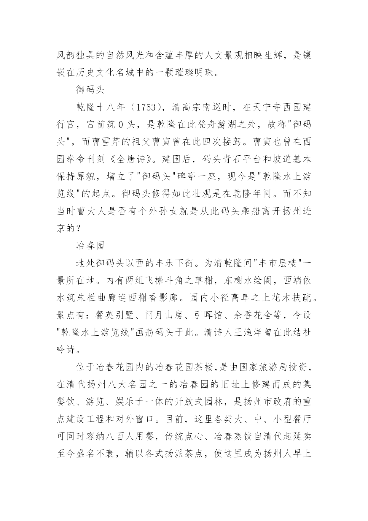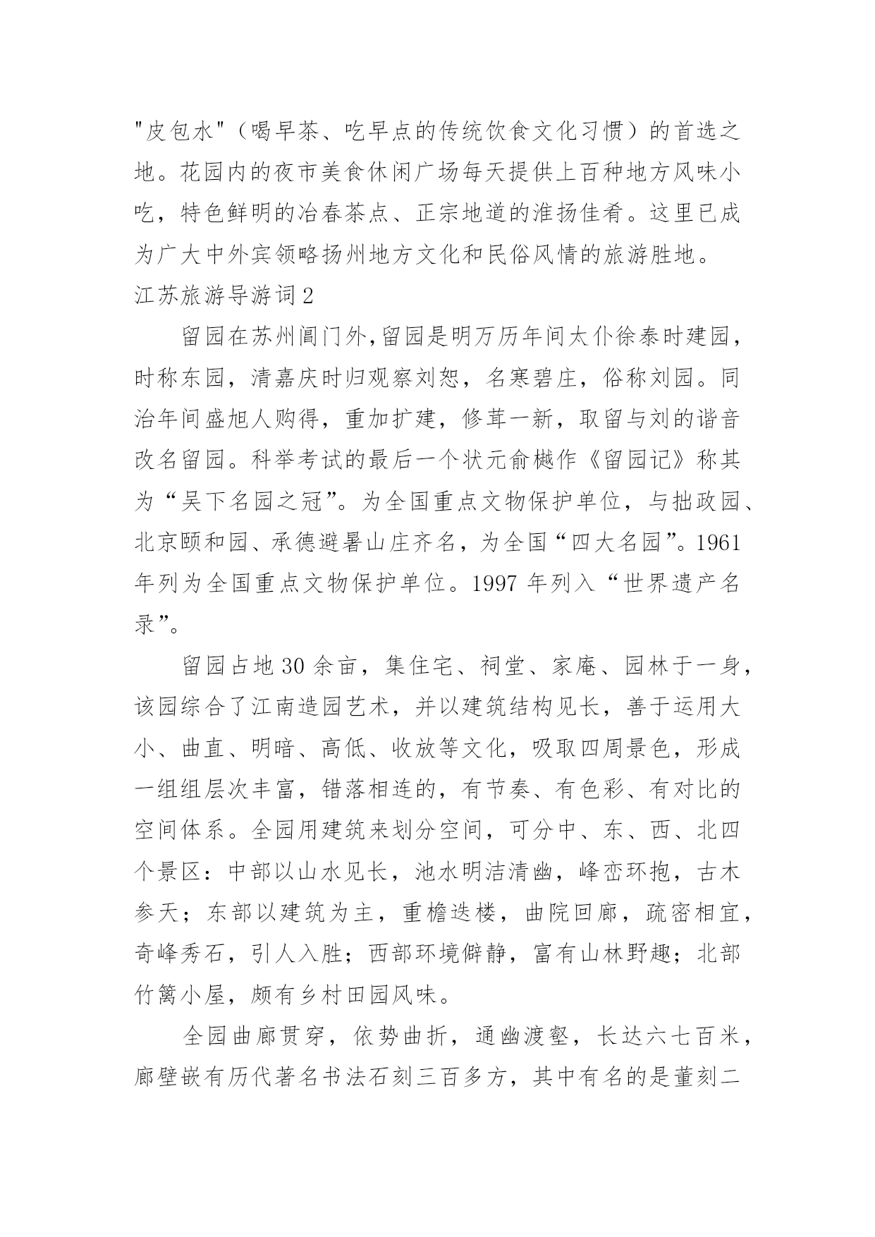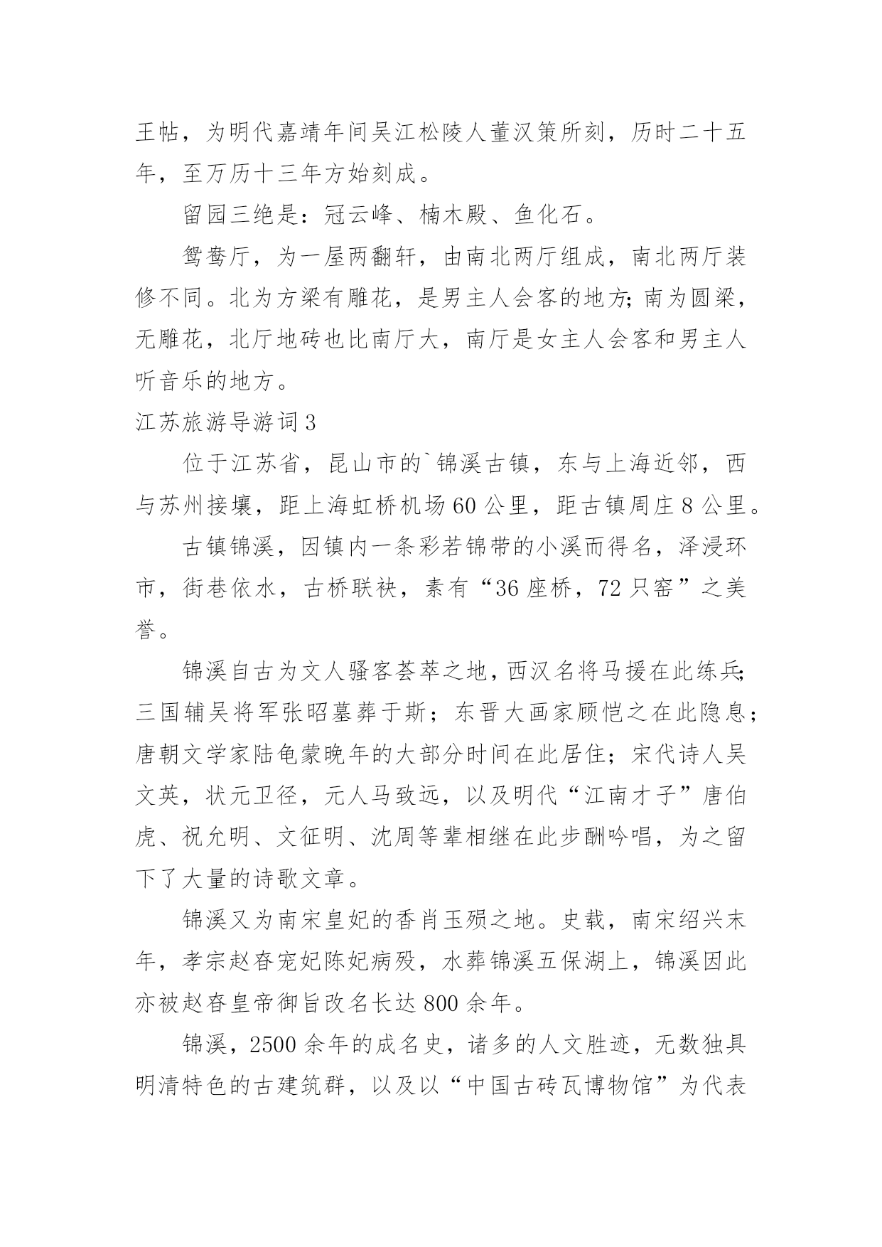江苏旅游导游词江苏旅游导游词作为一名专门为游客提供优质服务的导游人员,就难以避免地要准备导游词,导游词具有极强的实用性,涉及的知识十分广泛。那么问题来了,导游词应该怎么写?以下是小编为大家收集的江苏旅游导游词,欢迎大家分享。江苏旅游导游词1瘦西湖位于江苏省扬州市西北部,因湖面瘦长,称“瘦西湖”。窈窕曲折的湖道,串以长堤春柳、四桥烟雨、徐园、小金山、吹台、五亭桥、白塔、二十四桥、玲珑花界、熙春台、望春楼、吟月茶楼、湖滨长廊、石壁流淙、静香书屋等两岸景点,俨然一幅天然秀美的国画长卷。湖面迂回曲折,迤逦伸展,仿佛神女的腰带,媚态动人。清朝时,康熙、乾隆二帝曾数次南巡扬州,当地的豪绅争相建园,遂得“园林之盛,甲于天下”之说。扬州瘦西湖全长4。3公里,游览面积30多公顷,有长堤、徐园、小金山、吹台、月观、五亭桥、凫庄、白塔等名胜。湖区利用桥、岛、堤、岸的划分,使狭长湖面形成层次分明、曲折多变的山水园林景观。在清秀婉曲的瘦西湖两岸,缀以熔南秀北雄于一炉的扬州古典园林群,形成移步换景、相互因借的山水长轴;名寺古刹和古城墙垣绵延相属,名胜古迹和历史遗存散布其间。风韵独具的自然风光和含蕴丰厚的人文景观相映生辉,是镶嵌在历史文化名城中的一颗璀璨明珠。御码头乾隆十八年(1753),清高宗南巡时,在天宁寺西园建行宫,宫前筑0头,是乾隆在此登舟游湖之处,故称"御码头",而曹雪芹的祖父曹寅曾在此四次接驾。曹寅也曾在西园奉命刊刻《全唐诗》。建国后,码头青石平台和坡道基本保持原貌,增立了"御码头"碑亭一座,现今是"乾隆水上游览线"的起点。御码头修得如此壮观是在乾隆年间。而不知当时曹大人是否有个外孙女就是从此码头乘船离开扬州进京的?冶春园地处御码头以西的丰乐下街。为清乾隆间"丰市层楼"一景所在地。内有两组飞檐斗角之草榭,东榭水绘阁,西端依水筑朱栏曲廊连西榭香影廊。园内小径高阜之上花木扶疏。景点有:餐英别墅、问月山房、引晖馆、余香花舍等,今设"乾隆水上游览线"画舫码头于此。清诗人王渔洋曾在此结社吟诗。位于冶春花园内的冶春花园茶楼,是由国家旅游局投资,在清代扬州八大名园之一的冶春园的旧址上修建而成的集餐饮、游览、娱乐于一体的开放式园林,是扬州市政府的重点建设工程和对外窗口。目前,这里各类大、中、小型餐厅可同时容纳八百人用餐,传统点心、冶春蒸饺自清代起延卖至今盛名不衰,辅以各式扬派茶点,使这里成为扬州人早上"皮包水"(喝早茶、吃早点的传统饮食文化习惯)的首选之地。花园内的夜市美食休闲广场每天提供上百种地方风味小吃,特色鲜明的冶春茶点、正宗地道的淮扬佳肴。这里已成为广大中外宾领略扬州地方文化和民俗风情的旅游胜地。江苏旅游导游词2留园在苏州阊门外,留园是明万历年间太仆徐泰时建园,时称东园,清嘉庆时归观察刘恕,名寒碧庄,俗称刘园。同治年间盛旭人购得,重加扩建,修茸一新,取留与刘的谐音改名留园。科举考试的最后一个状元俞樾作《留园记》称其为“吴下名园之冠”。为全国重点文物保护单位,与拙政园、北京颐和园、承德避暑山庄齐名,为全国“四大名园”。1961年列为全国重点文物保护单位。1997年列入“世界遗产名录”。留园占地30余亩,集住宅、祠堂、家庵、园林于一身,该园综合了江南造园艺术,并以建筑结构见长,善于运用大小、曲直、明暗、高低、收放等文化,吸取四周景色,形成一组组层次丰富,错落相连的,有节奏、有色彩、有对比的空间体系。全园用建筑来划分空间,可分中、东、西、北四个景区:中部以山水见长,池水明洁清幽,峰峦环抱,古木参天;东部以建筑为主,重檐迭楼,曲院回廊,疏密相宜,奇峰秀石,引人入胜;西部环境僻静,富有山林野趣;北部竹篱小屋,颇有乡村田园风味。全园曲廊贯穿,依势曲折,通幽渡壑,长达六七百米,廊壁嵌有历代著名书法石刻三百多方,其中有名的是董刻二王帖,为明代嘉靖年间吴江松陵人董汉策所刻,历时二十五年,至万历十三年方始刻成。留园三绝是:冠云峰、楠木殿、鱼化石。鸳鸯厅,为一屋两翻轩,由南北两厅组成,南北两厅装修不同。北为方梁有雕花,是男主人会客的地方;南为圆梁,无雕花,北厅地砖也比南厅大,南厅是女主人会客和男主人听音乐的地方。江苏旅游导游词3位于江苏省,昆山市的`锦溪古镇,东与上海近邻,西与苏州接壤,距上海虹桥机场60公里,距古镇周庄8公里。古镇锦溪,因镇内一条彩若锦带的小溪而得名,泽浸环市,街巷依水,古桥联袂,素有“36座桥,72只窑”之美誉。锦溪自古为文人骚客荟萃之地,西汉名将马援在此练兵;三国辅吴将军张昭墓葬于斯;东晋大画家顾恺之在此隐息;唐朝文学家陆龟蒙晚年的大部分时间在此居住;宋代诗人吴文英,状元卫径,元人马致远,以及明代“江南才子”唐伯虎、祝允明、文征明、沈周等辈相继在此步酬吟唱,为之留下了大量的诗歌文章。锦溪又为南宋皇妃的香肖玉殒之地。史载,南宋绍兴末年,孝宗赵昚宠妃陈