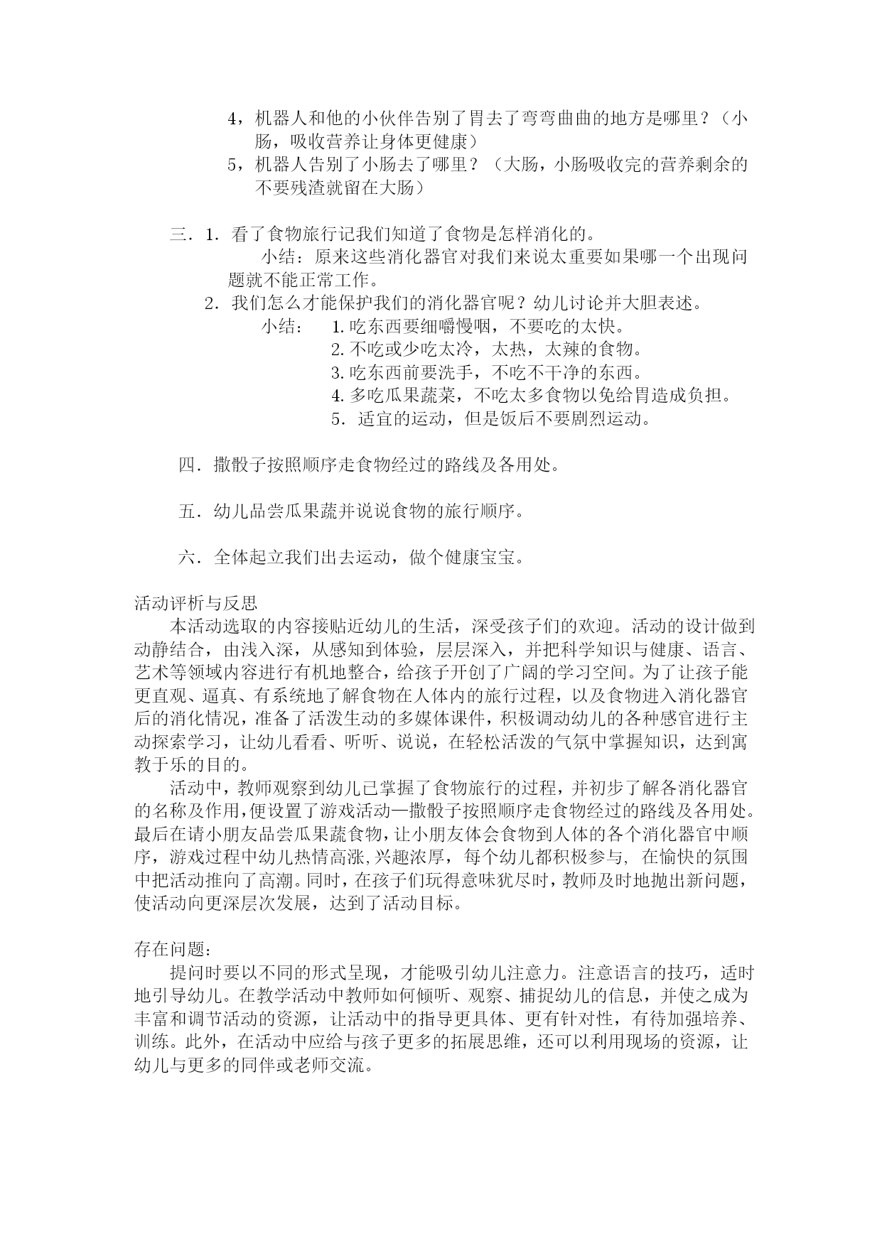 大班健康《食物旅行记》设计意图:生活中有多种多样的食物,孩子们总是吃不够、说不完。为满足孩子们的好奇心和探究愿望,“食物旅行记”主题活动由此生成展开。为体现新课改精神,我以整合的观念,让幼儿在认识人体的消化器官,了解食物的消化过程的同时,重点吸收过程,提高他们的自我保护意识。同时培养幼儿的观察力。活动目标:1.了解各消化器官的功能和食物在人体内消化吸收的过程。2.养成幼儿良好的饮食习惯。3.激发幼儿探索身体器官的兴趣。活动重点难点:了解各消化器官功能及人体吸收过程。幼儿分析:大班幼儿的求知欲和探索欲明显增强,他们总是喜欢围着老师问为什么游戏是儿童的天性,也是幼儿获取知识经验的一个重要途径。在幼儿的一日生活中,孩子们最感兴趣的就是活动区活动了。利用这个机会我充分发挥电化教学的优势。在教学活动中巧妙的使用电化教学,能提高幼儿参与活动的积极性,从而使我们更好的完成教育目标。所以在幼儿园教学活动中,我们应该抓住每一个机会,充分发挥多媒体教学直观、快捷、生动的优势来完善教学活动。教学内容分析:为使活动真正引发幼儿参与的兴趣,我注意灵活采用教法:首先设置问题情境(从孩子们好奇心入手——“吃下去的东西哪去了?”)观察法(用孩子的眼睛去发现——食物在人体里的消化过程)操作法(以孩子喜爱的操作形式展开——撒骰子按照顺序走食物经过的路线,消化系统图)等等。为更好地突出重点、突破难点,充分发挥多媒体教学手段的作用,找相关视频,使学习活动更为具体生动且有趣味性。活动准备:食物旅行课件,人体消化器官图片,瓜果蔬若干。活动过程:一.谈话导入1、师:看,这是什么?出示苹果。老师品尝并提问:我刚刚吃的苹果跑哪里去了?2、那我们一起来看看食物的奇妙旅行吧。出示课件。二.观看(食物旅行记)课件,了解各消化各器官的功能和消化过程。小男孩为什么不舒服?机器人和他的小伙伴第一个去的地方是哪里?(口腔用牙齿)接下来又去了像口袋一样的地方是什么?(胃,胃液通过胃的蠕动把食物加工的更加细小)机器人和他的小伙伴告别了胃去了弯弯曲曲的地方是哪里?(小肠,吸收营养让身体更健康)机器人告别了小肠去了哪里?(大肠,小肠吸收完的营养剩余的不要残渣就留在大肠)三.1.看了食物旅行记我们知道了食物是怎样消化的。小结:原来这些消化器官对我们来说太重要如果哪一个出现问题就不能正常工作。2.我们怎么才能保护我们的消化器官呢?幼儿讨论并大胆表述。小结:1.吃东西要细嚼慢咽,不要吃的太快。2.不吃或少吃太冷,太热,太辣的食物。3.吃东西前要洗手,不吃不干净的东西。4.多吃瓜果蔬菜,不吃太多食物以免给胃造成负担。5.适宜的运动,但是饭后不要剧烈运动。四.撒骰子按照顺序走食物经过的路线及各用处。五.幼儿品尝瓜果蔬并说说食物的旅行顺序。六.全体起立我们出去运动,做个健康宝宝。活动评析与反思本活动选取的内容接贴近幼儿的生活,深受孩子们的欢迎。活动的设计做到动静结合,由浅入深,从感知到体验,层层深入,并把科学知识与健康、语言、艺术等领域内容进行有机地整合,给孩子开创了广阔的学习空间。为了让孩子能更直观、逼真、有系统地了解食物在人体内的旅行过程,以及食物进入消化器官后的消化情况,准备了活泼生动的多媒体课件,积极调动幼儿的各种感官进行主动探索学习,让幼儿看看、听听、说说,在轻松活泼的气氛中掌握知识,达到寓教于乐的目的。活动中,教师观察到幼儿已掌握了食物旅行的过程,并初步了解各消化器官的名称及作用,便设置了游戏活动—撒骰子按照顺序走食物经过的路线及各用处。最后在请小朋友品尝瓜果蔬食物,让小朋友体会食物到人体的各个消化器官中顺序,游戏过程中幼儿热情高涨,兴趣浓厚,每个幼儿都积极参与,在愉快的氛围中把活动推向了高潮。同时,在孩子们玩得意味犹尽时,教师及时地抛出新问题,使活动向更深层次发展,达到了活动目标。存在问题:提问时要以不同的形式呈现,才能吸引幼儿注意力。注意语言的技巧,适时地引导幼儿。在教学活动中教师如何倾听、观察、捕捉幼儿的信息,并使之成为丰富和调节活动的资源,让活动中的指导更具体、更有针对性,有待加强培养、训练。此外,在活动中应给与孩子更多的拓展思维,还可以利用现场的资源,让幼儿与更多的同伴或老师交流。