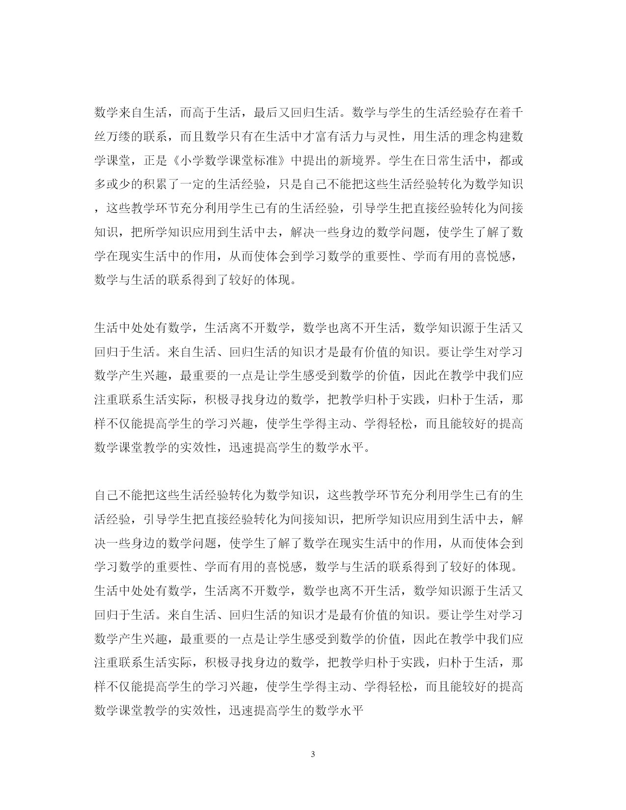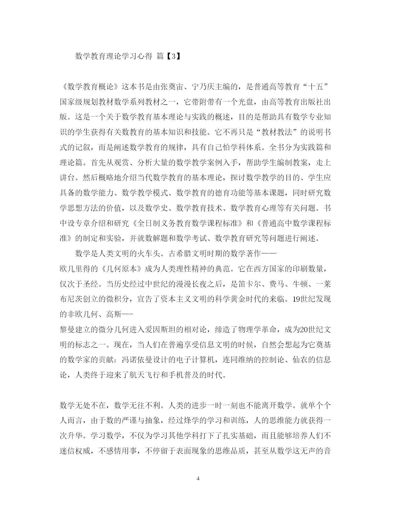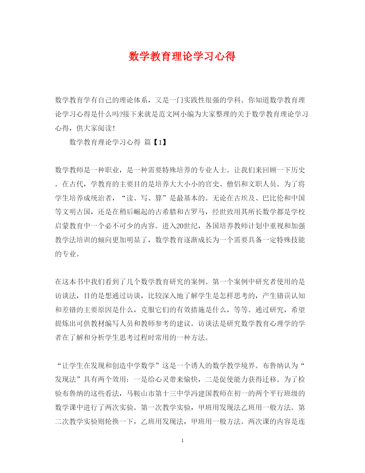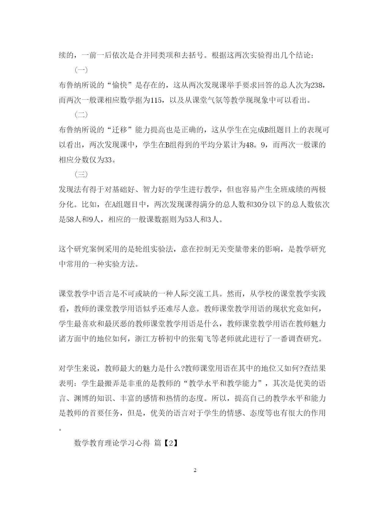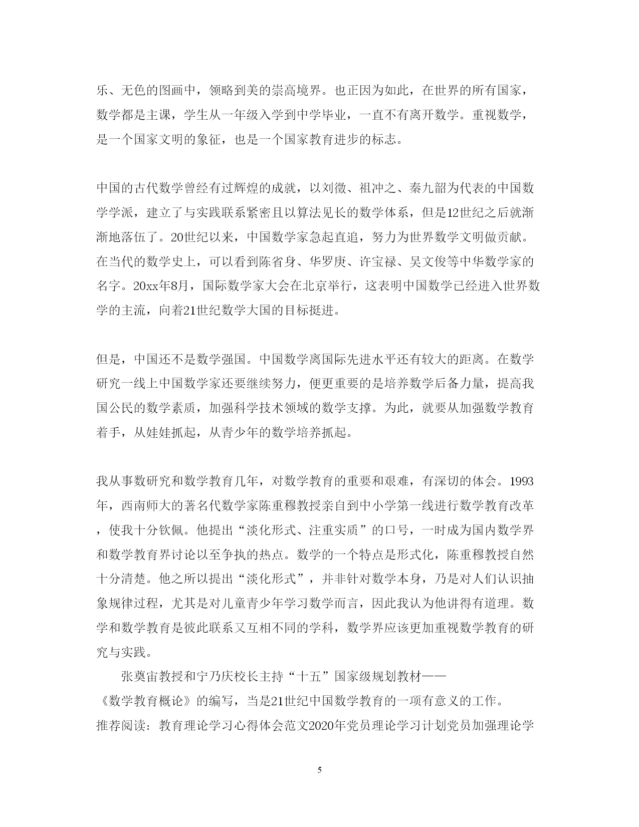 此资料由网络收集而来,如有侵权请告知上传者立即删除。资料共分享,我们负责传递知识。PAGEPAGE6数学教育理论学习心得数学教育学有自己的理论体系,又是一门实践性很强的学科。你知道数学教育理论学习心得是什么吗?接下来就是范文网小编为大家整理的关于数学教育理论学习心得,供大家阅读!数学教育理论学习心得篇【1】数学教师是一种职业,是一种需要特殊培养的专业人士。让我们来回顾一下历史。在古代,学教育的主要目的是培养大大小小的官史、僧侣和文职人员。为了将学生培养成统治者,“读、写、算”是最基本的。无论在古埃及、巴比伦和中国等文明古国,还是在稍后崛起的古希腊和古罗马,经世致用其所长数学都是学校启蒙教育中一个必不可少的内容。进入20世纪,各国培养教师计划中重视和加强教学法培训的倾向更加明显了,数学教育逐渐成长为一个需要具备一定特殊技能的专业。在这本书中我们看到了几个数学教育研究的案例。第一个案例中研究者使用的是访谈法,目的是想通过访谈,比较深入地了解学生是怎样思考的,产生错误认知和差错的主要原因是什么,克服它们的有效措施是什么,等等。通过研究,希望提炼出可供教材编写人员和教师参考的建议。访谈法是研究数学教育心理学的学者在了解和分析学生思考过程时常用的一种方法。“让学生在发现和创造中学数学”这是一个诱人的数学教学境界。布鲁纳认为“发现法”具有两个效用:一是给心灵带来愉快,二是促使能力获得迁移。为了检验布鲁纳的这些看法,马鞍山市第十三中学冯建国教师在初一的两个平行班级的数学课中进行了两次实验。第一次教学实验,甲班用发现法乙班用一般方法。第二次教学实验则轮换一下,乙班用发现法,甲班用一般方法。两次课的内容是连续的,一前一后依次是合并同类项和去括号。根据这两次实验得出几个结论:(一)布鲁纳所说的“愉快”是存在的,这从两次发现课举手要求回答的总人次为238,而两次一般课相应数学据为115,以及从课堂气氛等教学现现象中可以看出。(二)布鲁纳所说的“迁移”能力提高也是正确的,这从学生在完成B组题目上的表现可以看出,两次发现课中,学生在B组得到的平均分累计为48。9,而两次一般课的相应分数仅为33。(三)发现法有得于对基础好、智力好的学生进行教学,但也容易产生全班成绩的两极分化。比如,在A组题目中,两次发现课得满分的总人数和30分以下的总人数依次是58人和9人,相应的一般课数据则为53人和3人。这个研究案例采用的是轮组实验法,意在控制无关变量带来的影响,是教学研究中常用的一种实验方法。课堂教学中语言是不可或缺的一种人际交流工具。然而,从学校的课堂教学实践看,教师的课堂教学用语似乎还难尽人意。教师课堂教学用语的现状究竟如何,学生最喜欢和最厌恶的教师课堂教学用语是什么,教师课堂教学用语在教师魅力诸方面中的地位如何,浙江方桥初中的张菊飞等老师就此进行了一番调查研究。对学生来说,教师最大的魅力是什么?教师课堂用语在其中的地位又如何?查结果表明:学生最搬弄是非重的是教师的“教学水平和教学能力”,其次是优美的语言、渊博的知识、丰富的感情和热情的态度。所以,提高自己的教学水平和能力是教师的首要任务,但是,优美的语言对于学生的情感、态度等也有很大的作用。数学教育理论学习心得篇【2】数学来自生活,而高于生活,最后又回归生活。数学与学生的生活经验存在着千丝万缕的联系,而且数学只有在生活中才富有活力与灵性,用生活的理念构建数学课堂,正是《小学数学课堂标准》中提出的新境界。学生在日常生活中,都或多或少的积累了一定的生活经验,只是自己不能把这些生活经验转化为数学知识,这些教学环节充分利用学生已有的生活经验,引导学生把直接经验转化为间接知识,把所学知识应用到生活中去,解决一些身边的数学问题,使学生了解了数学在现实生活中的作用,从而使体会到学习数学的重要性、学而有用的喜悦感,数学与生活的联系得到了较好的体现。生活中处处有数学,生活离不开数学,数学也离不开生活,数学知识源于生活又回归于生活。来自生活、回归生活的知识才是最有价值的知识。要让学生对学习数学产生兴趣,最重要的一点是让学生感受到数学的价值,因此在教学中我们应注重联系生活实际,积极寻找身边的数学,把教学归朴于实践,归朴于生活,那样不仅能提高学生的学习兴趣,使学生学得主动、学得轻松,而且能较好的提高数学课堂教学的实效性,迅速提高学生的数学水平。自己不能把这些生活经验转化为数学知识,这些教学环节充分利用学生已有的生活经验,引导学生把直接经验转化为间接知识,把所学知识应用到生活中去,解决一些身边的数学问题,使学生了解了数学在现实生活中的作用,从而使体会到学习数学的重要性、学而有用的喜悦感,数学与生活的联系得到了较好的体现。生活中处处有数学,生活离不开数学,数学也离不开生活,数学知识源