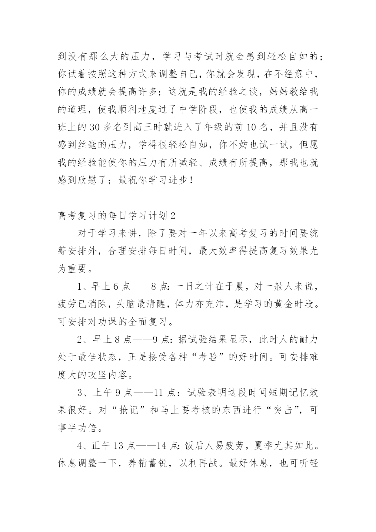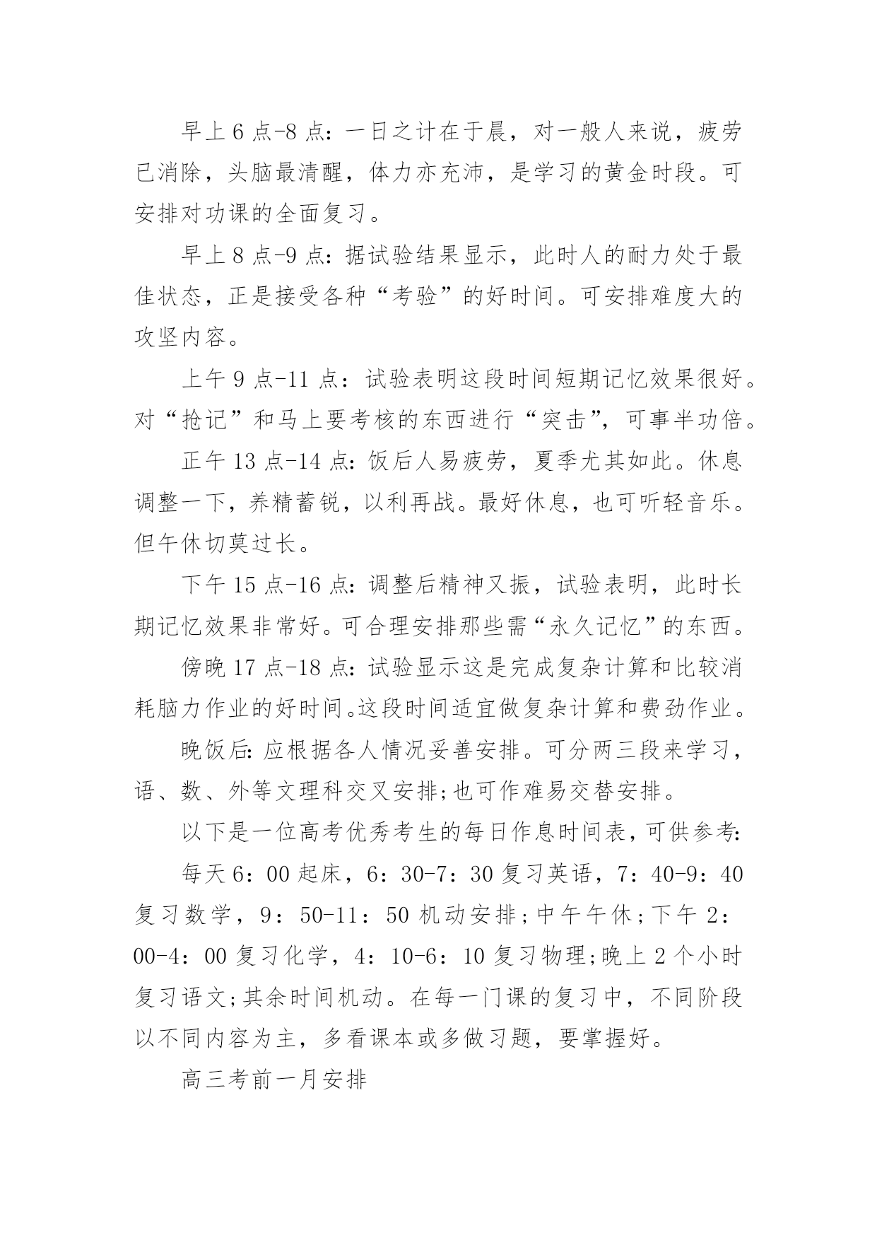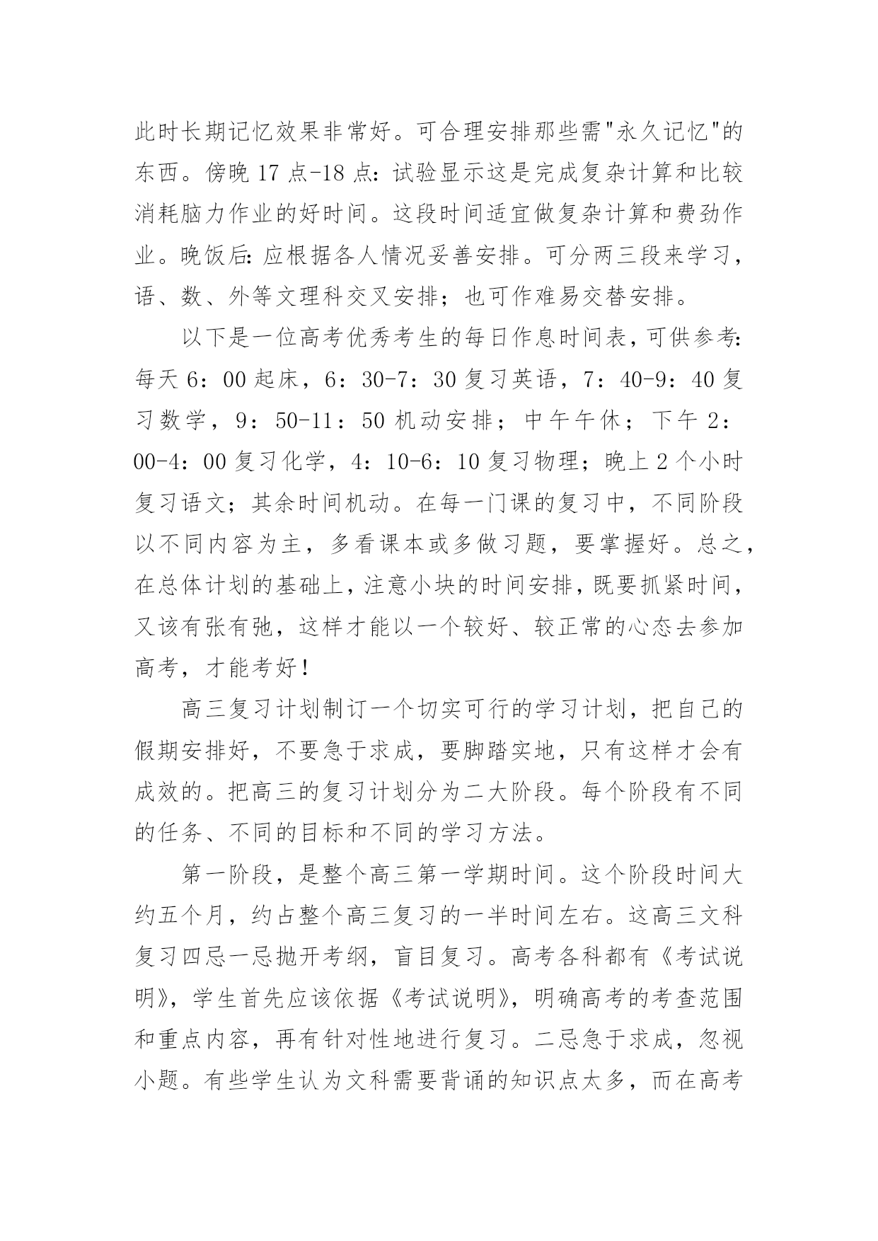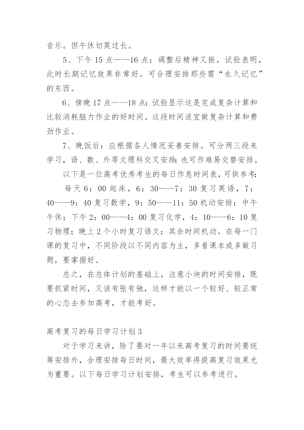 高考复习的每日学习计划高考复习的每日学习计划3篇时间就如同白驹过隙般的流逝,迎接我们的将是新的生活,新的挑战,让我们对今后的工作做个计划吧。那么你真正懂得怎么写好计划吗?以下是小编为大家整理的高考复习的每日学习计划,供大家参考借鉴,希望可以帮助到有需要的朋友。高考复习的每日学习计划1对于学习来讲,除了要对一年以来高考复习的时间要统筹安排外,合理安排每日时间,最大效率得提高复习效果尤为重要,一个高考状元的高考复习每日学习计划安排。以下每日学习计划安排,考生可以参考进行。早上6点-8点:一日之计在于晨,对一般人来说,疲劳已消除,头脑最清醒,体力亦充沛,是学习的黄金时段。可安排对功课的全面复习。早上8点-9点:据试验结果显示,此时人的耐力处于最佳状态,正是接受各种"考验"的好时间。可安排难度大的攻坚内容。上午9点-11点:试验表明这段时间短期记忆效果很好。对"抢记"和马上要考核的东西进行"突击",可事半功倍。正午13点-14点:饭后人易疲劳,夏季尤其如此。休息调整一下,养精蓄锐,以利再战。最好休息,也可听轻音乐。但午休切莫过长。下午15点-16点:调整后精神又振,试验表明,此时长期记忆效果非常好。可合理安排那些需"永久记忆"的东西。傍晚17点-18点:试验显示这是完成复杂计算和比较消耗脑力作业的好时间。这段时间适宜做复杂计算和费劲作业。晚饭后:应根据各人情况妥善安排。可分两三段来学习,语、数、外等文理科交叉安排;也可作难易交替安排。以下是一位高考优秀考生的每日作息时间表,可供参考:每天6:00起床,6:30-7:30复习英语,7:40-9:40复习数学,9:50-11:50机动安排;中午午休;下午2:00-4:00复习化学,4:10-6:10复习物理;晚上2个小时复习语文;其余时间机动。在每一门课的复习中,不同阶段以不同内容为主,多看课本或多做习题,要掌握好。总之,在总体计划的基础上,注意小块的时间安排,既要抓紧时间,又该有张有弛,这样才能以一个较好、较正常的心态去参加高考,才能考好!高三复习计划制订一个切实可行的学习计划,把自己的假期安排好,不要急于求成,要脚踏实地,只有这样才会有成效的。把高三的复习计划分为二大阶段。每个阶段有不同的任务、不同的目标和不同的学习方法。第一阶段,是整个高三第一学期时间。这个阶段时间大约五个月,约占整个高三复习的一半时间左右。这高三文科复习四忌一忌抛开考纲,盲目复习。高考各科都有《考试说明》,学生首先应该依据《考试说明》,明确高考的考查范围和重点内容,再有针对性地进行复习。二忌急于求成,忽视小题。有些学生认为文科需要背诵的知识点太多,而在高考中基础知识题的分值不高,所以索性就放弃了。他们不知道解决好基础知识,正是提高文科成绩的关键所在。三忌支离破碎,缺乏系统。有些学生认为与理科相比,文科知识缺乏系统性和逻辑性,可以随意捡章节进行复习。其实文科复习应兼顾知识、能力、方法三个层次。四忌浮光掠影,只重皮毛。有些学生只重视知识的背诵,缺乏专题性反思,不知道自己的涨分点在哪里。个阶段可以称为基础复习阶段。学校里每一个科目都在逐册逐章节地进行复习,我们自己也应该和学校的教师步伐一致,进行各科的细致复习。我们要充分利用这五个月,把每一科在高考范围内的每个知识点都逐章逐节、逐篇逐段,甚至农字逐句地复习到,应做到毫无遗漏。这个阶段,复习中切忌急躁、浮躁,要知道"万丈高楼增地起",只有这时候循序渐进、查缺被漏、巩固基础,才能在高考中取得好成绩;只有这时候把边边沿沿、枝枝杈杈的地方都复习到,才能在今后更多的时间去攻克一些综合性、高难度的题目。这个阶段,还有一项重要任务,这就是高三第一学期的期末考试。这次考试十分重要,它既可以检验自己一学期来的复习效果,又可以查找自己急待解决的问题漏洞,还可以向你提出新的挑战。因此,我们把它戏称为一次"小高考"。这次考试还有一层特殊的涵义:它是高校招生中保送、推荐、评选市级三好学生的重要依据,我这里,特别提醒学习较好的高三同学,要格外重视这次考试。第二阶段从寒假至第一次模拟考试前,时间大约四个月。这个阶段是复习工作中的最宝贵的'时期,堪称复习的"黄金期"。之所以这样说,是因为这个时期复习任务最重,也最应该达到高效率的复习。也可以将这个阶段称为全面复习阶段。我们的任务是把前一个阶段中较为零乱、繁杂的知识系统化、条理化,找到每科中的一条宏观的线索,提纲挈领,全面复习。这个阶段的复习,直接目的就是第一次模拟考试。第一次模拟教育是高考前最重要的一次学习检验和阅兵,是你选报志愿的重要依据。一模成功,可以使自己信心倍增,但不要沾沾自喜;一模受挫,也不要恢心丧气,妄自菲薄。应该为一模恰当定位,在战略上藐视它,在战术上重视它。第三阶段从一模结束至高考前,时间大约两个月。这是高考前最后的一段复习时间,也可