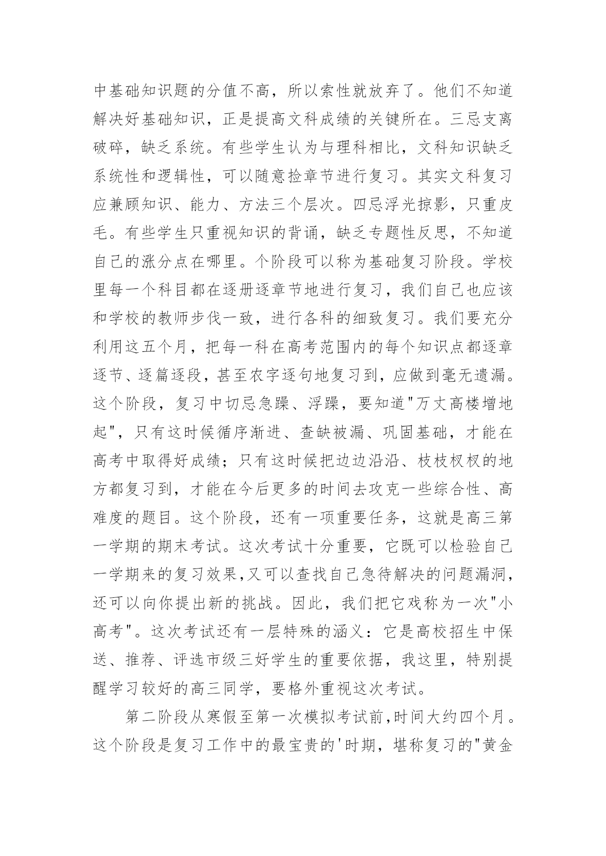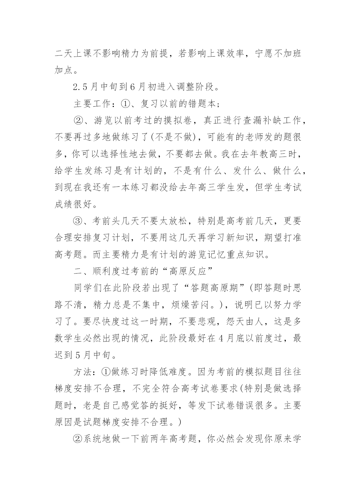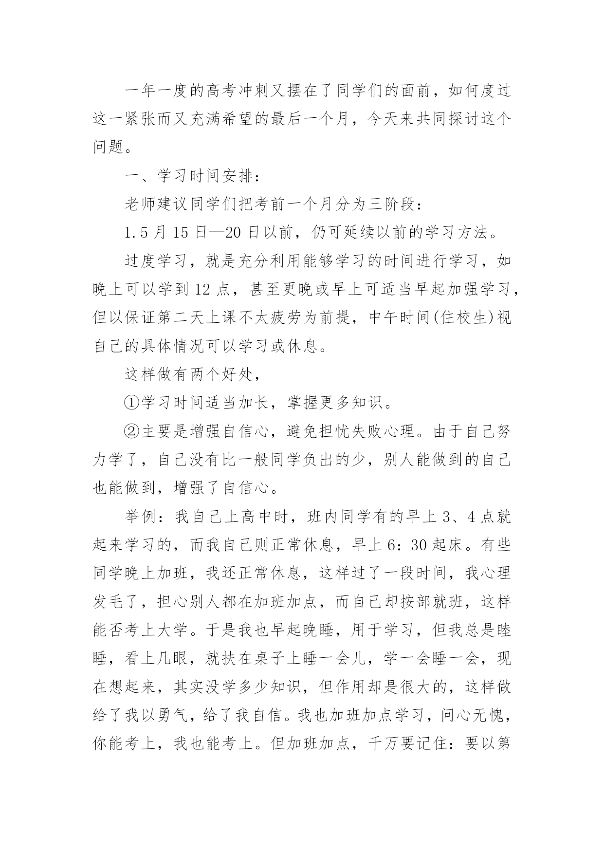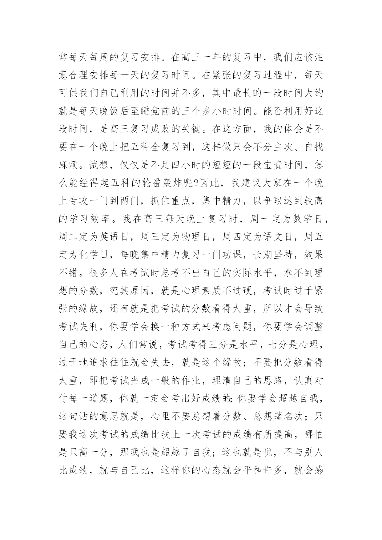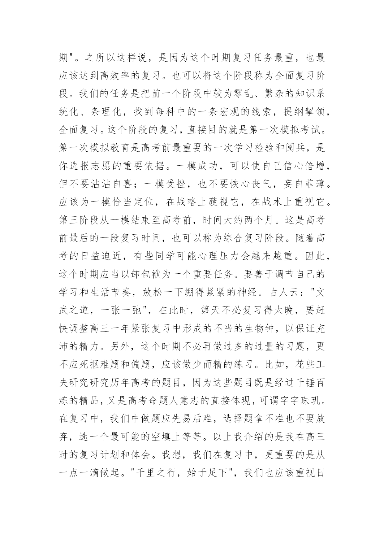高考复习的每日学习计划高考复习的每日学习计划3篇时间就如同白驹过隙般的流逝,迎接我们的将是新的生活,新的挑战,让我们对今后的工作做个计划吧。那么你真正懂得怎么写好计划吗?以下是小编为大家整理的高考复习的每日学习计划,供大家参考借鉴,希望可以帮助到有需要的朋友。高考复习的每日学习计划1对于学习来讲,除了要对一年以来高考复习的时间要统筹安排外,合理安排每日时间,最大效率得提高复习效果尤为重要,一个高考状元的高考复习每日学习计划安排。以下每日学习计划安排,考生可以参考进行。早上6点-8点:一日之计在于晨,对一般人来说,疲劳已消除,头脑最清醒,体力亦充沛,是学习的黄金时段。可安排对功课的全面复习。早上8点-9点:据试验结果显示,此时人的耐力处于最佳状态,正是接受各种"考验"的好时间。可安排难度大的攻坚内容。上午9点-11点:试验表明这段时间短期记忆效果很好。对"抢记"和马上要考核的东西进行"突击",可事半功倍。正午13点-14点:饭后人易疲劳,夏季尤其如此。休息调整一下,养精蓄锐,以利再战。最好休息,也可听轻音乐。但午休切莫过长。下午15点-16点:调整后精神又振,试验表明,此时长期记忆效果非常好。可合理安排那些需"永久记忆"的东西。傍晚17点-18点:试验显示这是完成复杂计算和比较消耗脑力作业的好时间。这段时间适宜做复杂计算和费劲作业。晚饭后:应根据各人情况妥善安排。可分两三段来学习,语、数、外等文理科交叉安排;也可作难易交替安排。以下是一位高考优秀考生的每日作息时间表,可供参考:每天6:00起床,6:30-7:30复习英语,7:40-9:40复习数学,9:50-11:50机动安排;中午午休;下午2:00-4:00复习化学,4:10-6:10复习物理;晚上2个小时复习语文;其余时间机动。在每一门课的复习中,不同阶段以不同内容为主,多看课本或多做习题,要掌握好。总之,在总体计划的基础上,注意小块的时间安排,既要抓紧时间,又该有张有弛,这样才能以一个较好、较正常的心态去参加高考,才能考好!高三复习计划制订一个切实可行的学习计划,把自己的假期安排好,不要急于求成,要脚踏实地,只有这样才会有成效的。把高三的复习计划分为二大阶段。每个阶段有不同的任务、不同的目标和不同的学习方法。第一阶段,是整个高三第一学期时间。这个阶段时间大约五个月,约占整个高三复习的一半时间左右。这高三文科复习四忌一忌抛开考纲,盲目复习。高考各科都有《考试说明》,学生首先应该依据《考试说明》,明确高考的考查范围和重点内容,再有针对性地进行复习。二忌急于求成,忽视小题。有些学生认为文科需要背诵的知识点太多,而在高考中基础知识题的分值不高,所以索性就放弃了。他们不知道解决好基础知识,正是提高文科成绩的关键所在。三忌支离破碎,缺乏系统。有些学生认为与理科相比,文科知识缺乏系统性和逻辑性,可以随意捡章节进行复习。其实文科复习应兼顾知识、能力、方法三个层次。四忌浮光掠影,只重皮毛。有些学生只重视知识的背诵,缺乏专题性反思,不知道自己的涨分点在哪里。个阶段可以称为基础复习阶段。学校里每一个科目都在逐册逐章节地进行复习,我们自己也应该和学校的教师步伐一致,进行各科的细致复习。我们要充分利用这五个月,把每一科在高考范围内的每个知识点都逐章逐节、逐篇逐段,甚至农字逐句地复习到,应做到毫无遗漏。这个阶段,复习中切忌急躁、浮躁,要知道"万丈高楼增地起",只有这时候循序渐进、查缺被漏、巩固基础,才能在高考中取得好成绩;只有这时候把边边沿沿、枝枝杈杈的地方都复习到,才能在今后更多的时间去攻克一些综合性、高难度的题目。这个阶段,还有一项重要任务,这就是高三第一学期的期末考试。这次考试十分重要,它既可以检验自己一学期来的复习效果,又可以查找自己急待解决的问题漏洞,还可以向你提出新的挑战。因此,我们把它戏称为一次"小高考"。这次考试还有一层特殊的涵义:它是高校招生中保送、推荐、评选市级三好学生的重要依据,我这里,特别提醒学习较好的高三同学,要格外重视这次考试。第二阶段从寒假至第一次模拟考试前,时间大约四个月。这个阶段是复习工作中的最宝贵的'时期,堪称复习的"黄金期"。之所以这样说,是因为这个时期复习任务最重,也最应该达到高效率的复习。也可以将这个阶段称为全面复习阶段。我们的任务是把前一个阶段中较为零乱、繁杂的知识系统化、条理化,找到每科中的一条宏观的线索,提纲挈领,全面复习。这个阶段的复习,直接目的就是第一次模拟考试。第一次模拟教育是高考前最重要的一次学习检验和阅兵,是你选报志愿的重要依据。一模成功,可以使自己信心倍增,但不要沾沾自喜;一模受挫,也不要恢心丧气,妄自菲薄。应该为一模恰当定位,在战略上藐视它,在战术上重视它。第三阶段从一模结束至高考前,时间大约两个月。这是高考前最后的一段复习时间,也可