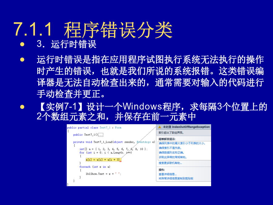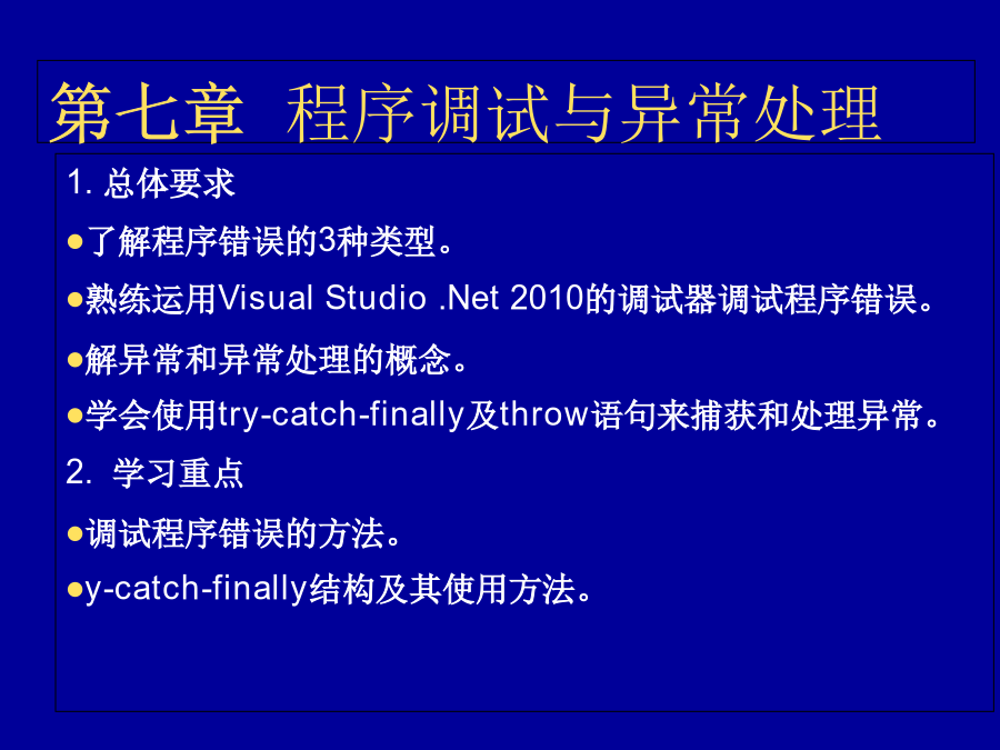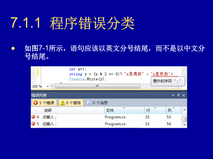 2024/10/3第七章程序调试与异常处理第七章程序调试与异常处理7.1程序错误7.1.1程序错误分类7.1.1程序错误分类7.1.1程序错误分类7.1.1程序错误分类7.1.1程序错误分类7.1.2调试程序错误7.1.2调试程序错误7.1.2调试程序错误7.1.2调试程序错误7.2程序的异常处理7.2.1异常的概念7.2.1异常的概念7.2.2try-catch语句与异常处理7.2.2try-catch语句与异常处理7.2.2try-catch语句与异常处理7.2.2try-catch语句与异常处理7.2.3finally语句7.2.3finally语句7.2.3finally语句7.2.4throw语句与抛出异常7.2.4throw语句与抛出异常2024/10/32024/10/3