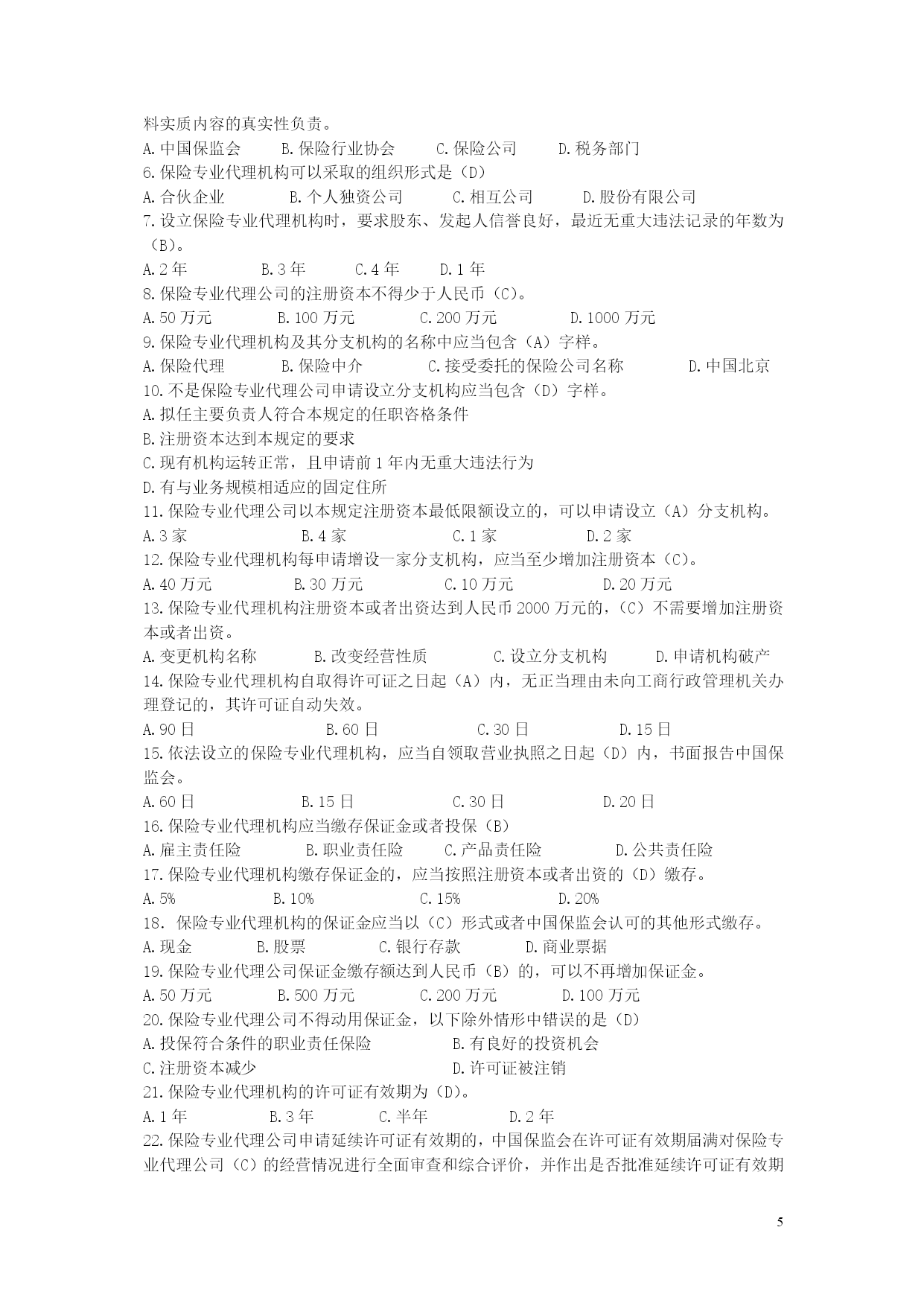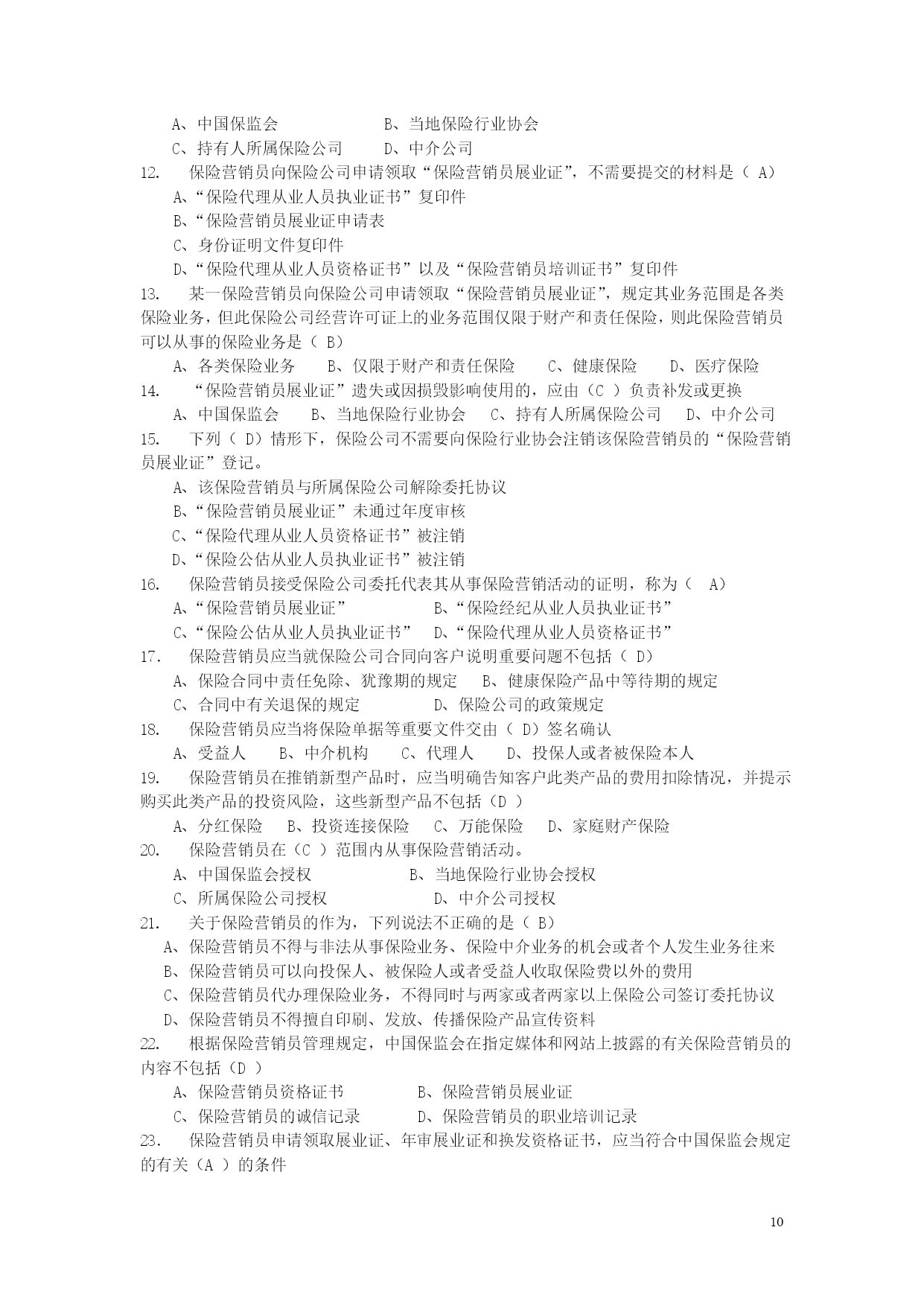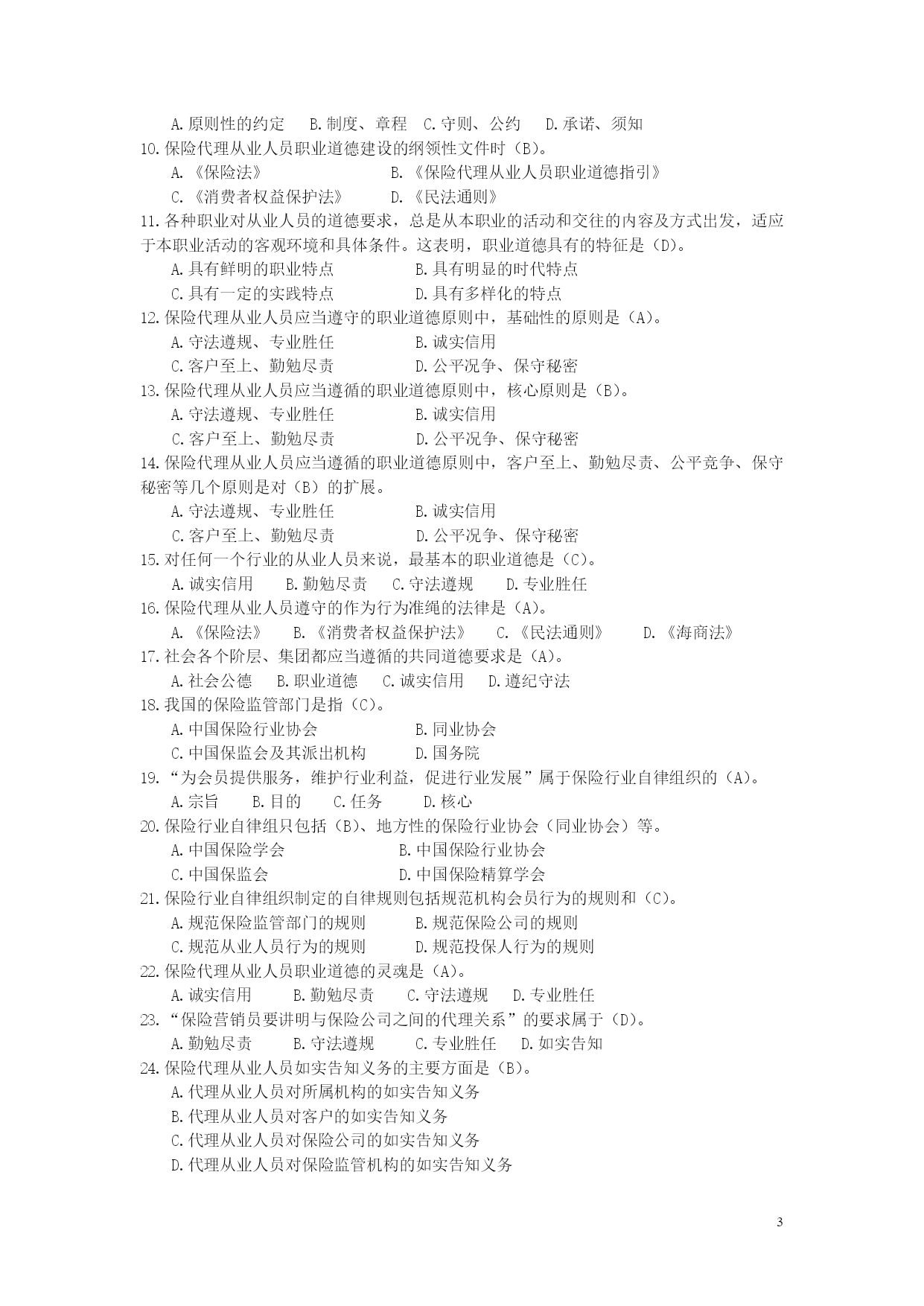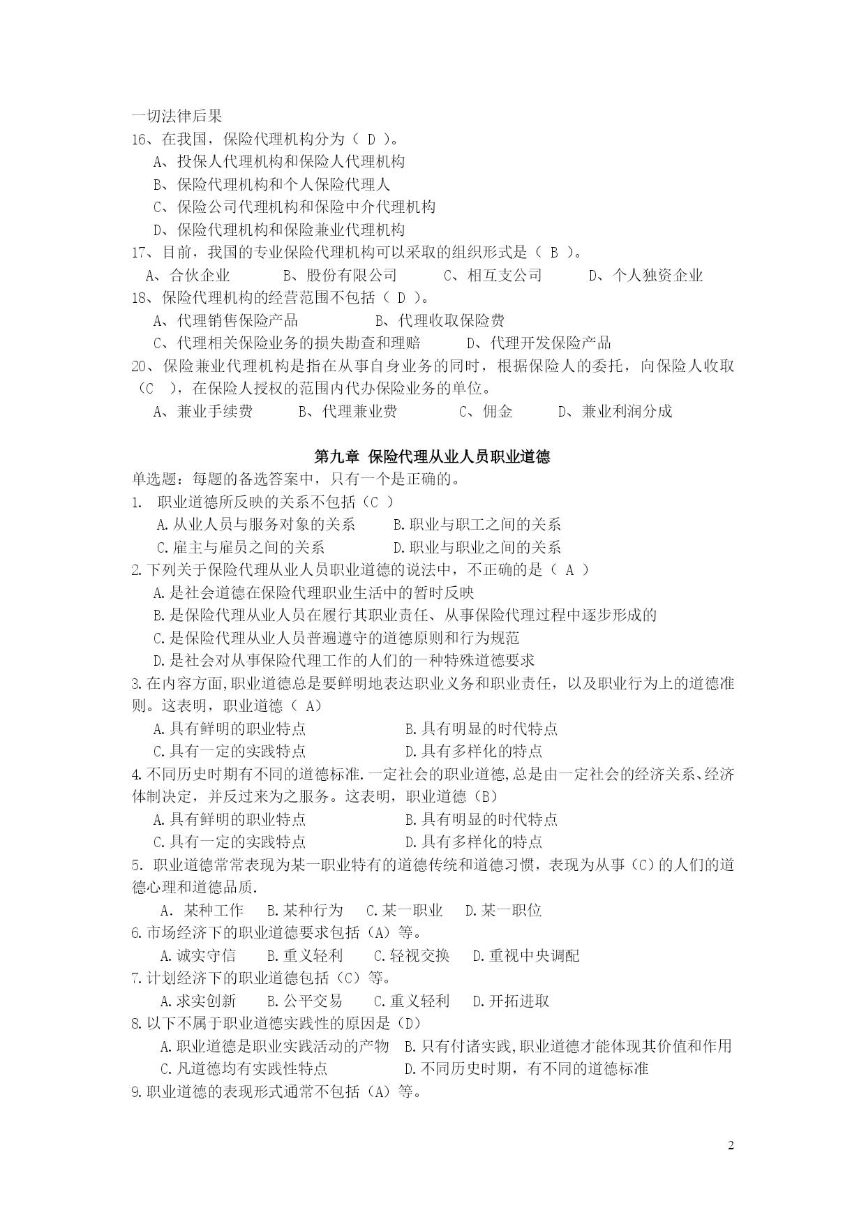 PAGEPAGE31第八章保险代理人单选题:每题的备选答案中,只有一个是正确的。保险代理行为的主体是(B)。A、保险人B、保险代理人C、投保人D、被保险人2、保险代理人是指根据保险人的委托,向保险人收取(A),并在保险人授权的范围内代为办理保险业务的机构和个人。A、佣金B、委托费C、代理费D、保险金3、保险代理人的代理行为时由(D)调整的行为。A、《保险法》和《合同法》B、《保险法》和《刑法》C、《保险法》和代理法规D、《保险法》和《民法》4、保险代理人在(C)授权范围内作独立的意思表示。A、投保人B、被保险人C、保险人D、受益人5、通过保险代理人与投保人之间签订的保险合同所产生的权利义务,视为(D)的民事法律行为,其后果由()承担。A、代理人,代理人B、代理人,保险人C、保险人,代理人D、保险人,保险人6、保险代理人的代理行为是基于保险人授权的(A)。A、委托代理B、委任代理C、协商代理D、指定代理7、保险人与保险代理人关于代理保险业务所达成的协议是(B)。A、保险委托合同B、保险代理合同C、保险授权合同D、保险展业合同8、保险代理人在代理合同授权范围内,代表(C)的利益开展业务。A、投保人B、被保险人C、保险人D、受益人9、财产保险代理人在财产保险人授予的权利范围内代收保险费,这属于保险代理人的(A)。A、明示权利B、默示权利C、明示权利D、默示权利10、保险代理人最基本的权利是(D)。A、独立开展业务活动B、代收、转交保险费C、维护保险人权益D、获取劳务报酬11、下面属于保险代理人义务的是(A)。A、转交保险费B、代收保险费C、垫付保险费D、制定保险费12、保险代理人不得与第三者串通或合伙隐瞒真相,损害保险人的利益。这反映了保险代理人具有(C)义务。A、诚实和告知B、如实转交保险费C、维护保险人权益D、维护被保险人权益13、保险代理人与保险经纪人的共同点在于(C)。A、委托人均为保险人B、收入来源一直C、同属于保险中介D、法律地位相同14、保险代理人的收入来源是根据自己的业绩,从(A)那里取得佣金收入。A、保险人B、投保人C、被保险人D、受益人15、下列说法正确的是(B)。A、保险代理人是保险人的代表,其疏忽、过失等行为给保险人及投保人造成的损失,应独立承担民事法律责任B、保险代理人是保险人的代表,其代理行为均视为保险人的行为,保险人承担由此产生的一切法律后果C、保险代理人是投保人的代表,其代理行为均视为投保人的行为,投保人担由此产生的一切法律后果D、保险经纪人是投保人的代表,其代理行为均视为投保人的行为,投保人担由此产生的一切法律后果16、在我国,保险代理机构分为(D)。A、投保人代理机构和保险人代理机构B、保险代理机构和个人保险代理人C、保险公司代理机构和保险中介代理机构D、保险代理机构和保险兼业代理机构17、目前,我国的专业保险代理机构可以采取的组织形式是(B)。A、合伙企业B、股份有限公司C、相互支公司D、个人独资企业18、保险代理机构的经营范围不包括(D)。A、代理销售保险产品B、代理收取保险费C、代理相关保险业务的损失勘查和理赔D、代理开发保险产品20、保险兼业代理机构是指在从事自身业务的同时,根据保险人的委托,向保险人收取(C),在保险人授权的范围内代办保险业务的单位。A、兼业手续费B、代理兼业费C、佣金D、兼业利润分成第九章保险代理从业人员职业道德单选题:每题的备选答案中,只有一个是正确的。职业道德所反映的关系不包括(C)A.从业人员与服务对象的关系B.职业与职工之间的关系C.雇主与雇员之间的关系D.职业与职业之间的关系2.下列关于保险代理从业人员职业道德的说法中,不正确的是(A)A.是社会道德在保险代理职业生活中的暂时反映B.是保险代理从业人员在履行其职业责任、从事保险代理过程中逐步形成的C.是保险代理从业人员普遍遵守的道德原则和行为规范D.是社会对从事保险代理工作的人们的一种特殊道德要求3.在内容方面,职业道德总是要鲜明地表达职业义务和职业责任,以及职业行为上的道德准则。这表明,职业道德(A)A.具有鲜明的职业特点B.具有明显的时代特点C.具有一定的实践特点D.具有多样化的特点4.不同历史时期有不同的道德标准.一定社会的职业道德,总是由一定社会的经济关系、经济体制决定,并反过来为之服务。这表明,职业道德(B)A.具有鲜明的职业特点B.具有明显的时代特点C.具有一定的实践特点D.具有多样化的特点5.职业道德常常表现为某一职业特有的道德传统和道德习惯,表现为从事(C)的人们的道德心理和道德品质.A.某种工作B.某种行为C.某一职业D.某一职位6.市场