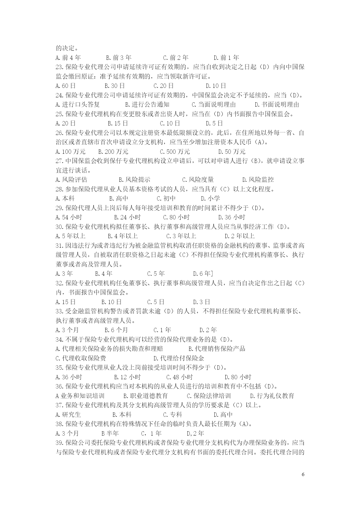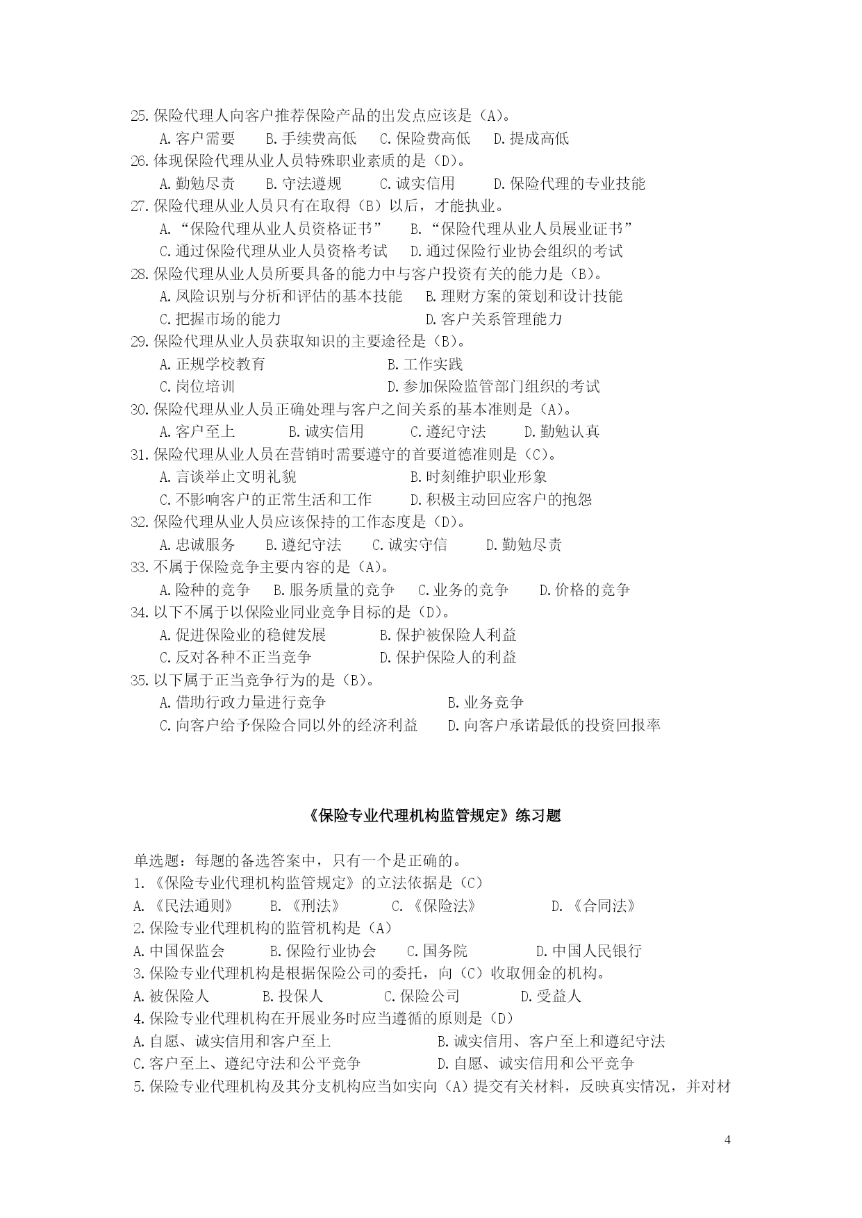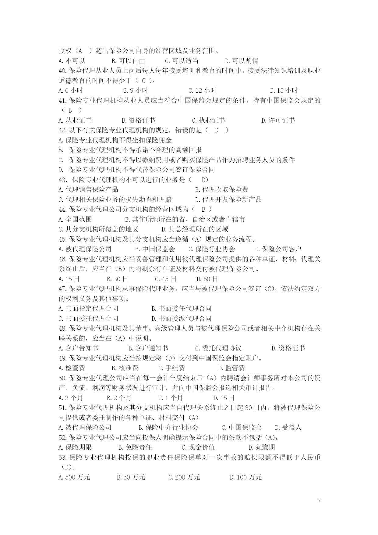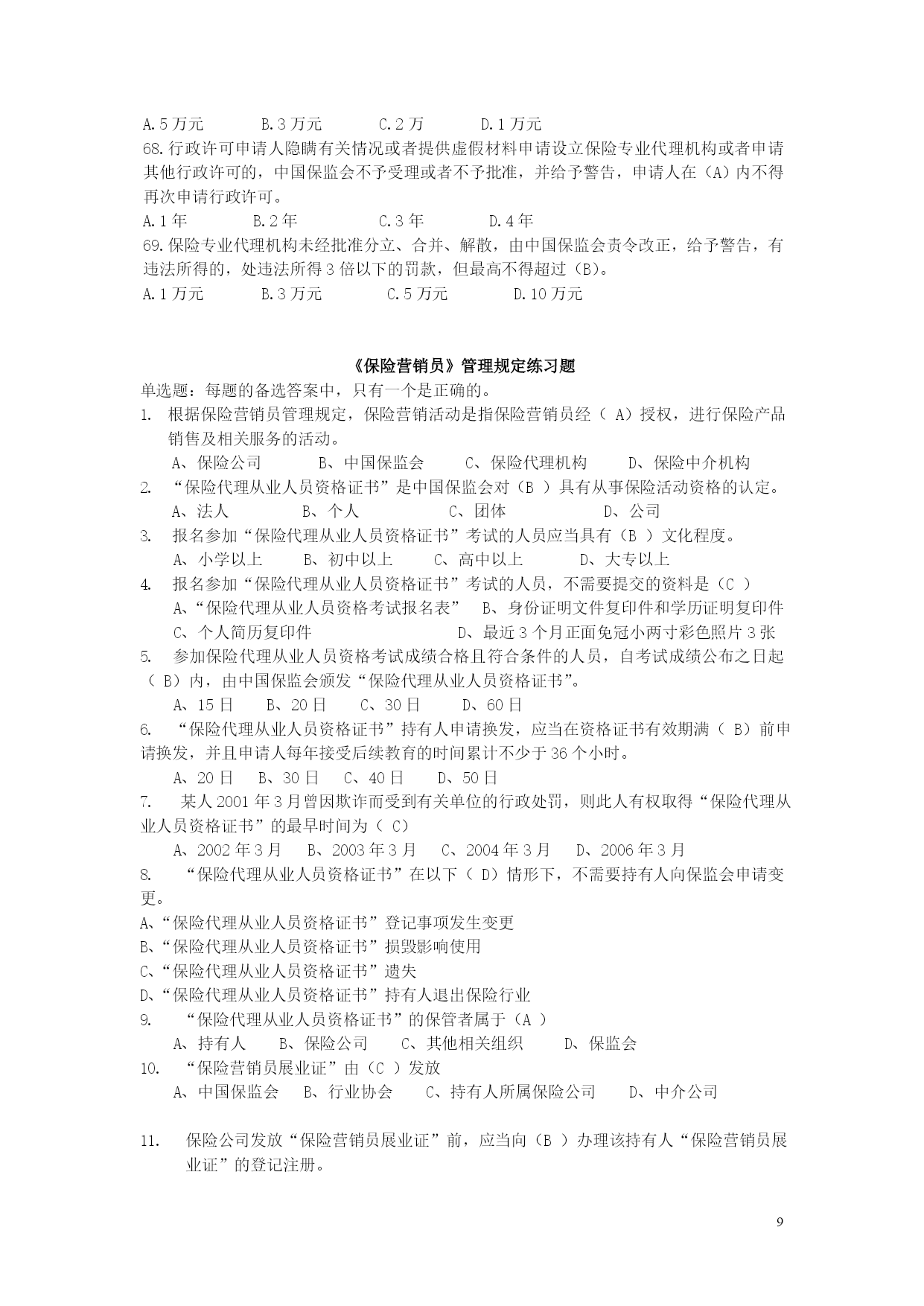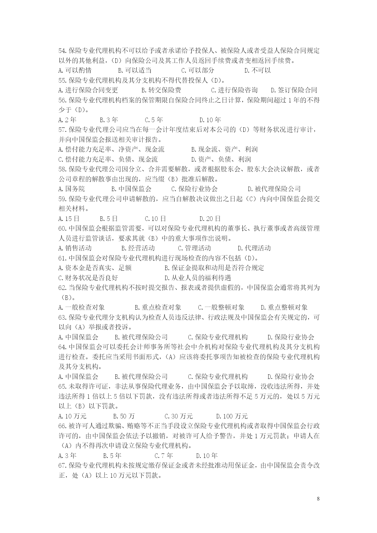 PAGEPAGE31第八章保险代理人单选题:每题的备选答案中,只有一个是正确的。保险代理行为的主体是(B)。A、保险人B、保险代理人C、投保人D、被保险人2、保险代理人是指根据保险人的委托,向保险人收取(A),并在保险人授权的范围内代为办理保险业务的机构和个人。A、佣金B、委托费C、代理费D、保险金3、保险代理人的代理行为时由(D)调整的行为。A、《保险法》和《合同法》B、《保险法》和《刑法》C、《保险法》和代理法规D、《保险法》和《民法》4、保险代理人在(C)授权范围内作独立的意思表示。A、投保人B、被保险人C、保险人D、受益人5、通过保险代理人与投保人之间签订的保险合同所产生的权利义务,视为(D)的民事法律行为,其后果由()承担。A、代理人,代理人B、代理人,保险人C、保险人,代理人D、保险人,保险人6、保险代理人的代理行为是基于保险人授权的(A)。A、委托代理B、委任代理C、协商代理D、指定代理7、保险人与保险代理人关于代理保险业务所达成的协议是(B)。A、保险委托合同B、保险代理合同C、保险授权合同D、保险展业合同8、保险代理人在代理合同授权范围内,代表(C)的利益开展业务。A、投保人B、被保险人C、保险人D、受益人9、财产保险代理人在财产保险人授予的权利范围内代收保险费,这属于保险代理人的(A)。A、明示权利B、默示权利C、明示权利D、默示权利10、保险代理人最基本的权利是(D)。A、独立开展业务活动B、代收、转交保险费C、维护保险人权益D、获取劳务报酬11、下面属于保险代理人义务的是(A)。A、转交保险费B、代收保险费C、垫付保险费D、制定保险费12、保险代理人不得与第三者串通或合伙隐瞒真相,损害保险人的利益。这反映了保险代理人具有(C)义务。A、诚实和告知B、如实转交保险费C、维护保险人权益D、维护被保险人权益13、保险代理人与保险经纪人的共同点在于(C)。A、委托人均为保险人B、收入来源一直C、同属于保险中介D、法律地位相同14、保险代理人的收入来源是根据自己的业绩,从(A)那里取得佣金收入。A、保险人B、投保人C、被保险人D、受益人15、下列说法正确的是(B)。A、保险代理人是保险人的代表,其疏忽、过失等行为给保险人及投保人造成的损失,应独立承担民事法律责任B、保险代理人是保险人的代表,其代理行为均视为保险人的行为,保险人承担由此产生的一切法律后果C、保险代理人是投保人的代表,其代理行为均视为投保人的行为,投保人担由此产生的一切法律后果D、保险经纪人是投保人的代表,其代理行为均视为投保人的行为,投保人担由此产生的一切法律后果16、在我国,保险代理机构分为(D)。A、投保人代理机构和保险人代理机构B、保险代理机构和个人保险代理人C、保险公司代理机构和保险中介代理机构D、保险代理机构和保险兼业代理机构17、目前,我国的专业保险代理机构可以采取的组织形式是(B)。A、合伙企业B、股份有限公司C、相互支公司D、个人独资企业18、保险代理机构的经营范围不包括(D)。A、代理销售保险产品B、代理收取保险费C、代理相关保险业务的损失勘查和理赔D、代理开发保险产品20、保险兼业代理机构是指在从事自身业务的同时,根据保险人的委托,向保险人收取(C),在保险人授权的范围内代办保险业务的单位。A、兼业手续费B、代理兼业费C、佣金D、兼业利润分成第九章保险代理从业人员职业道德单选题:每题的备选答案中,只有一个是正确的。职业道德所反映的关系不包括(C)A.从业人员与服务对象的关系B.职业与职工之间的关系C.雇主与雇员之间的关系D.职业与职业之间的关系2.下列关于保险代理从业人员职业道德的说法中,不正确的是(A)A.是社会道德在保险代理职业生活中的暂时反映B.是保险代理从业人员在履行其职业责任、从事保险代理过程中逐步形成的C.是保险代理从业人员普遍遵守的道德原则和行为规范D.是社会对从事保险代理工作的人们的一种特殊道德要求3.在内容方面,职业道德总是要鲜明地表达职业义务和职业责任,以及职业行为上的道德准则。这表明,职业道德(A)A.具有鲜明的职业特点B.具有明显的时代特点C.具有一定的实践特点D.具有多样化的特点4.不同历史时期有不同的道德标准.一定社会的职业道德,总是由一定社会的经济关系、经济体制决定,并反过来为之服务。这表明,职业道德(B)A.具有鲜明的职业特点B.具有明显的时代特点C.具有一定的实践特点D.具有多样化的特点5.职业道德常常表现为某一职业特有的道德传统和道德习惯,表现为从事(C)的人们的道德心理和道德品质.A.某种工作B.某种行为C.某一职业D.某一职位6.市场