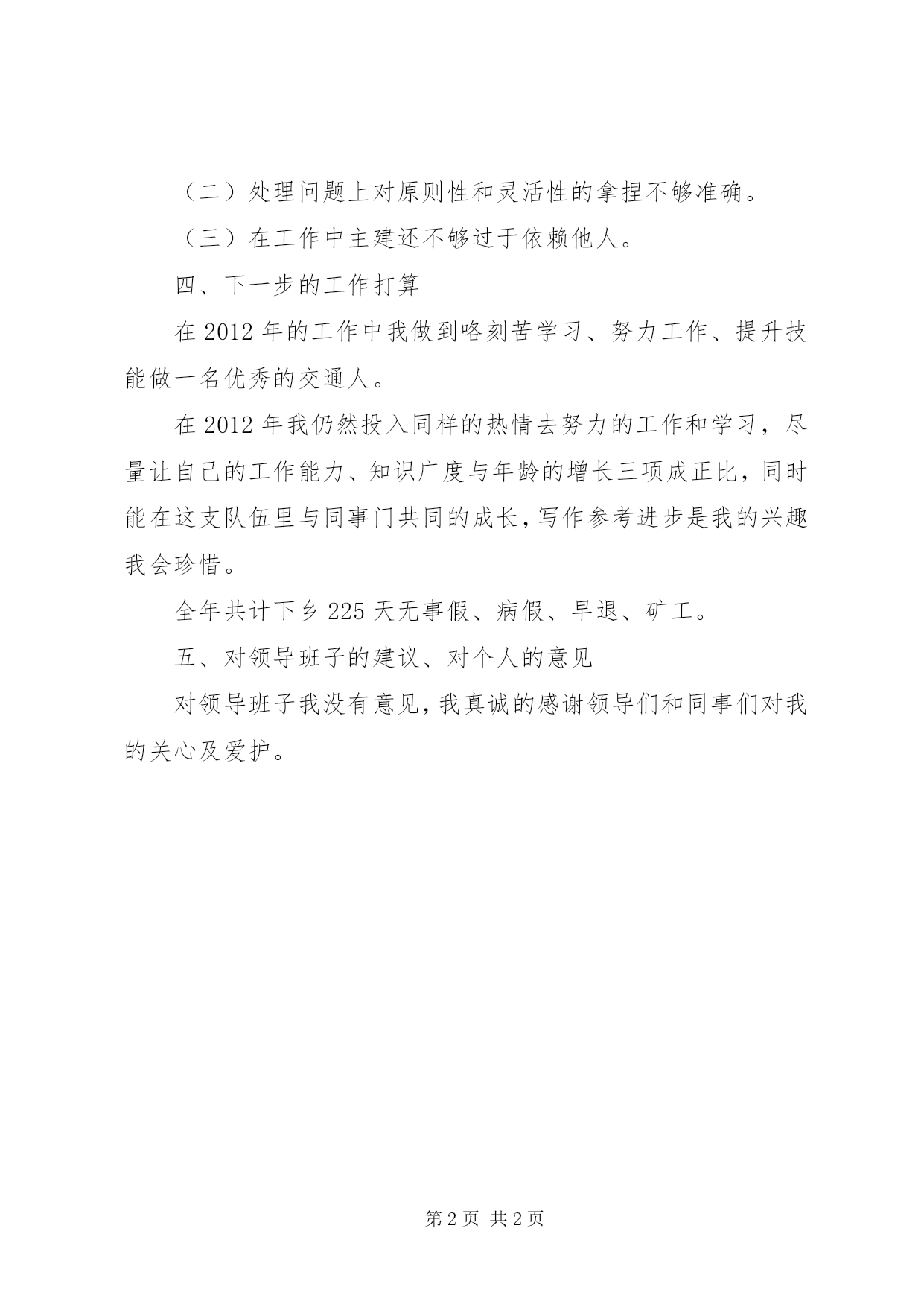 第PAGE\*Arabic\*MERGEFORMAT2页共NUMPAGES\*MERGEFORMAT2页交通局个人年终总结2011年,我在交通局领导的正确领导和同事们的帮助下,发挥了自己最大的能力,认真的完成咯上级下达的各项任务,并协助其它同志搞好工作。一、政治思想方面经过学习,政治素养进一步提高,一年来我比较注重政治理论学习,思想端正,组织纪律进一步增强,做为交通成员我能摆好自己的位置,不论在什么时候,任何情况下讲组织、讲纪律、讲原则,不怕苦不怕累、勤勤恳恳、任劳任怨,做好自己的本质工作。二、具体工作开展情况根据局里的安排,我被分配到筑路一组,四月十二日至十一月二十一日分别在上、中、入职思想汇报下木拉、村戈、甲洼、藏坝跟随格师进行新修和维护。我主要的工作是开转载机和跟xx学挖掘机。三、存在的问题本人在工作中,理论水平还不够系统,自己的理论水平和工作还需要进一步的提高。虽然2011年工作是在不断的进步中前行,但是还有诸多需要改进的地方:(一)自己的性格上粗枝大叶,表现在工作中粗心大意不够细致的地方。(二)处理问题上对原则性和灵活性的拿捏不够准确。(三)在工作中主建还不够过于依赖他人。四、下一步的工作打算在2012年的工作中我做到咯刻苦学习、努力工作、提升技能做一名优秀的交通人。在2012年我仍然投入同样的热情去努力的工作和学习,尽量让自己的工作能力、知识广度与年龄的增长三项成正比,同时能在这支队伍里与同事门共同的成长,写作参考进步是我的兴趣我会珍惜。全年共计下乡225天无事假、病假、早退、矿工。五、对领导班子的建议、对个人的意见对领导班子我没有意见,我真诚的感谢领导们和同事们对我的关心及爱护。