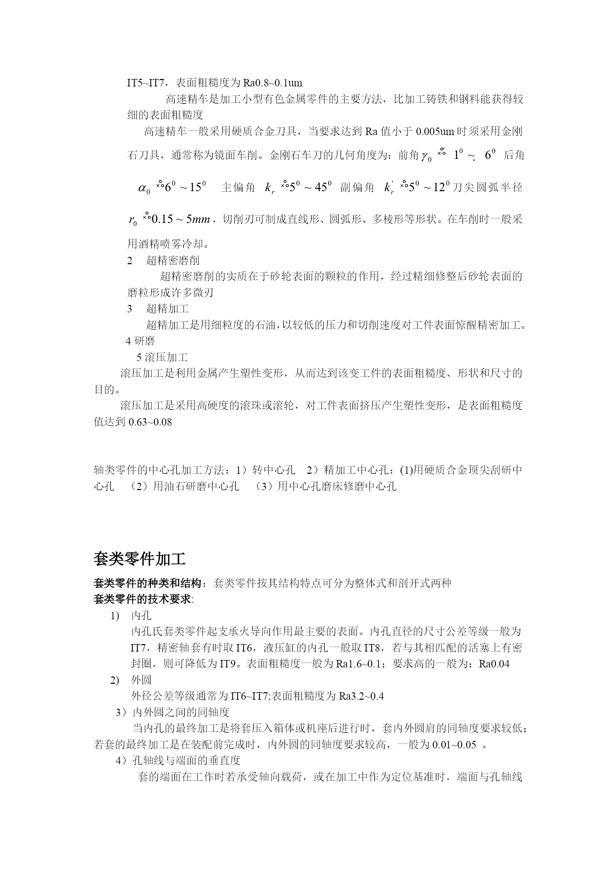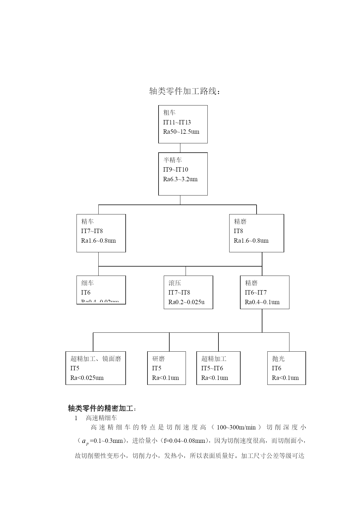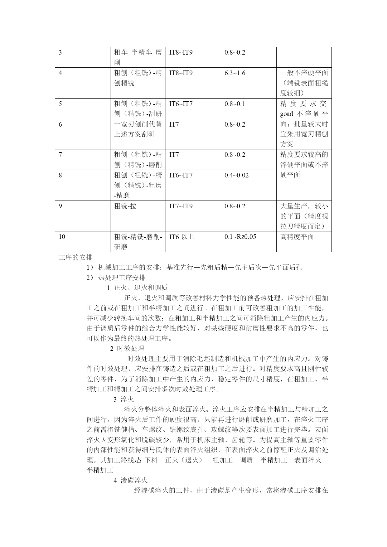 机械制造工艺金属切削基本知识:切削用量三要素:切削速度、进给量、背吃刀量。刀具:前刀面----切屑流过的表面主后刀面------与工件上过度的表面相对的表面副后刀面---与工件上已加工表面相对的表面主切屑刃---前刀面与主后刀面的交线工件加工分类1旋转表面车床、钻床、镗床、外圆磨床2纵向表面刨床、插床、铣床、平面磨床3特性表面齿轮加工机床、仿形机床毛坯的选择:毛坯的种类;1铸件形状复杂的的零件毛坯,宜采用铸造方法制造。目前铸件大多用砂型铸造,只有质量要求高的小型铸件可采用特种铸造(金属型铸造、压力铸造、离心铸造和熔模铸造)2锻件自由锻件可用手工锻打(小型毛坯)机械锻打或压力压锻等方法。这种锻件的精度低,生产率不高,加工余量较大,而且零件的结构必须简单,。模锻件的精度和表面质量都比自由锻件好,而且段件的形状也可较为复杂。3型材型材分热轧合冷轧两种4组合毛坯。表面加工方案的选择:外圆表面加工方案序号加工方法经济精度表面粗糙度适用范围1粗车IT11以下50~12.5适用粹火钢以外的各种金属2粗车-半精车IT8~IT106.3~3.23粗车-半精车-精车IT7~IT81.6~0.84粗车-半精车-精车-滚压(抛光)IT7~IT80.2~0.0255粗车-半精车-磨削IT7~IT80.8~0.4主要用于淬火钢,也可用于未淬火钢,但不宜加工有色金属6粗车-半精车-粗磨-精磨IT6~IT70.4~0.17粗车-半精车-粗磨-精磨-超精加工IT50.1~RZ.18粗车-半精车-精车-金刚石车IT6~IT70.4~0.025主要用于要求较高的有色金属加工9粗车-半精车-粗磨-精磨-超精磨或镜面磨IT5以上0.025~RZ0.05极高精度的外圆加工10粗车-半精车-粗磨-精磨-研磨IT5以上0.1~RZ0.05孔加工方案序号加工方法经济精度级表面粗糙度适用范围1钻IT11~IT1212.5加工未淬火钢及铸铁的实心毛坯,也可用于加工有色金属(单表面粗糙度稍粗糙,孔径小于15~20mm2钻-铰IT93.2~1.63钻-铰-精铰IT7~IT81.6~0.84钻-扩IT10~IT1112.5~6.3同上,但孔径大于15~20mm5钻-扩-铰IT8~IT93.2~1.66钻-扩-粗铰-精铰IT71.6~0.87钻-扩-机铰-手铰IT6~IT70.4~0.18钻-扩-拉IT7~IT91.6~0.1大批大量生产(精度有拉刀的精度而定)9粗镗IT11~IT1212.5~6.3出淬火钢外的各种材料,毛坯有铸出孔或锻出孔的10粗镗(粗扩)-半精镗IT8~IT93.2~1.611粗镗-半精镗-精镗IT7~IT81.6~0.812粗镗-半精镗-精镗-浮动镗刀精镗IT6~IT70.8~0.413粗镗-半精镗-磨孔IT7~IT80.8~0.2主要用于淬火钢也可以用于未淬火钢,但不宜用于有色金属14粗镗-半精镗-粗磨-精磨IT6~IT70.2~0.115粗镗-半精镗-精镗-金刚镗IT6~IT70.4~0.05主要用于精度要求高的有色金属加工16钻-粗铰-精铰-IT6~IT70.2~0.025精度要求高的孔17以研磨代替上述方案中的IT6以上平面加工方案序号加工方法经济精度表面粗糙度适用范围1粗车-半精车IT96.3~3.22粗车-半精车-精车IT7~IT81.6~0.8端面3粗车-半精车-磨削IT8~IT90.8~0.24粗刨(粗铣)-精刨精铣IT8~IT96.3~1.6一般不淬硬平面(端铣表面粗糙度较细)5粗刨(粗铣)-精刨(精铣)-刮研IT6~IT70.8~0.1精度要求交goad不淬硬平面;批量较大时宜采用宽刃精刨方案6一宽刃刨削代替上述方案刮研IT70.8~0.27粗刨(粗铣)-精刨(精铣)-磨削IT70.8~0.2精度要求较高的淬硬平面或不淬硬平面8粗刨(粗铣)-精刨(精铣)-粗磨-精磨IT6~IT70.4~0.029粗铣-拉IT7~IT90.8~0.2大量生产,较小的平面(精度视拉刀精度而定)10粗铣-精铣-磨削-研磨IT6以上0.1~Rz0.05高精度平面工序的安排机械加工工序的安排:基准先行—先粗后精—先主后次—先平面后孔热处理工序安排1正火、退火和调质正火、退火和调质等改善材料力学性能的预备热处理,应安排在粗加工之前或在粗加工和半精加工之间进行。在粗加工前可改善粗加工的加工性能,并可减少转换车间的次数;在粗加工和半精加工之间可消除粗加工产生的内应力。由于调质后零件的综合力学性能较好,对某些硬度和耐磨性要求不高的零件,也可以作为最终的热处理工序。2时效处理时效处理主要用于消除毛坯制造和机械加工中产生的内应力。对铸件的时效处理,应安排在铸造之后或在粗加工之后进行。对精度要求高且刚性较差的