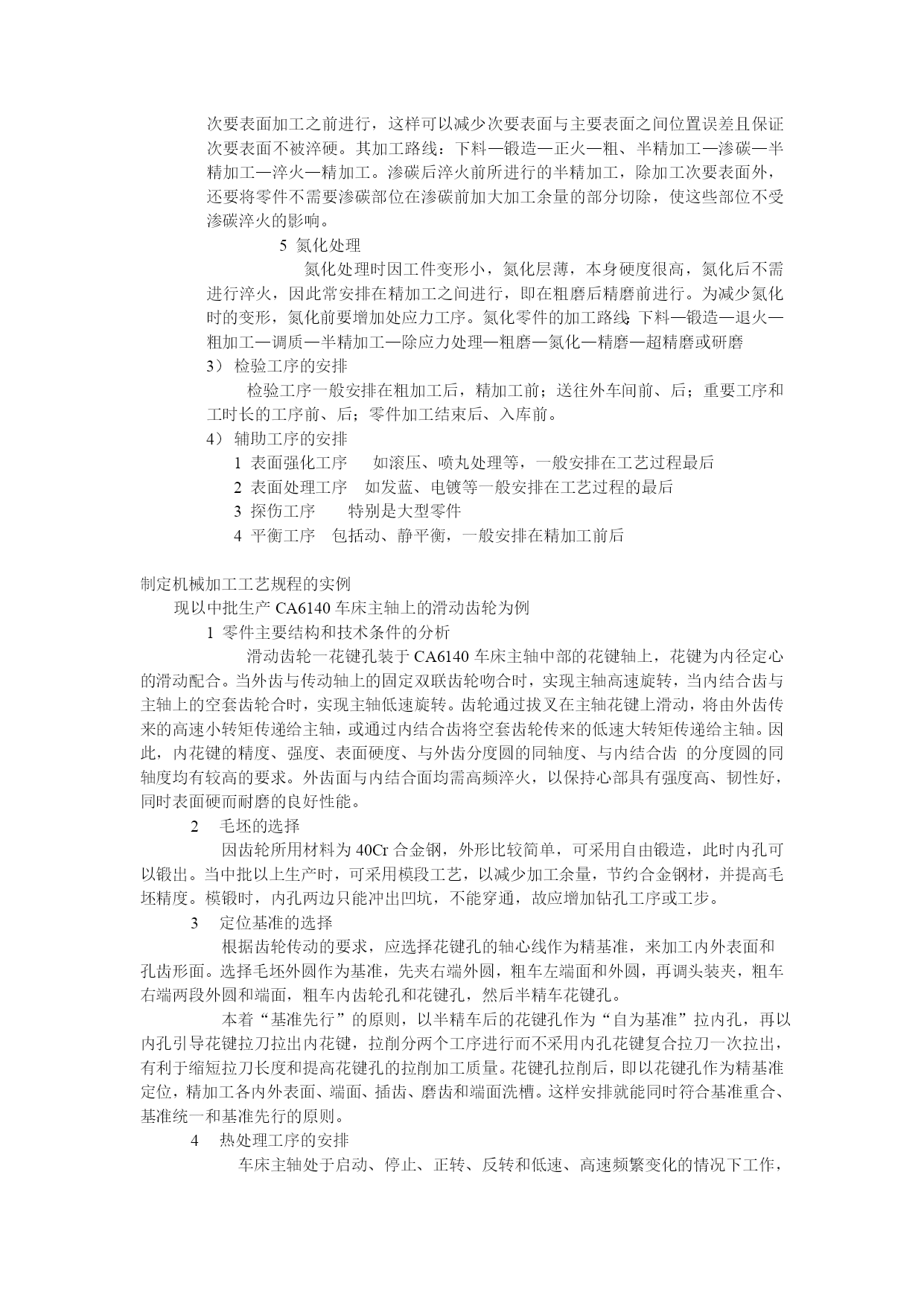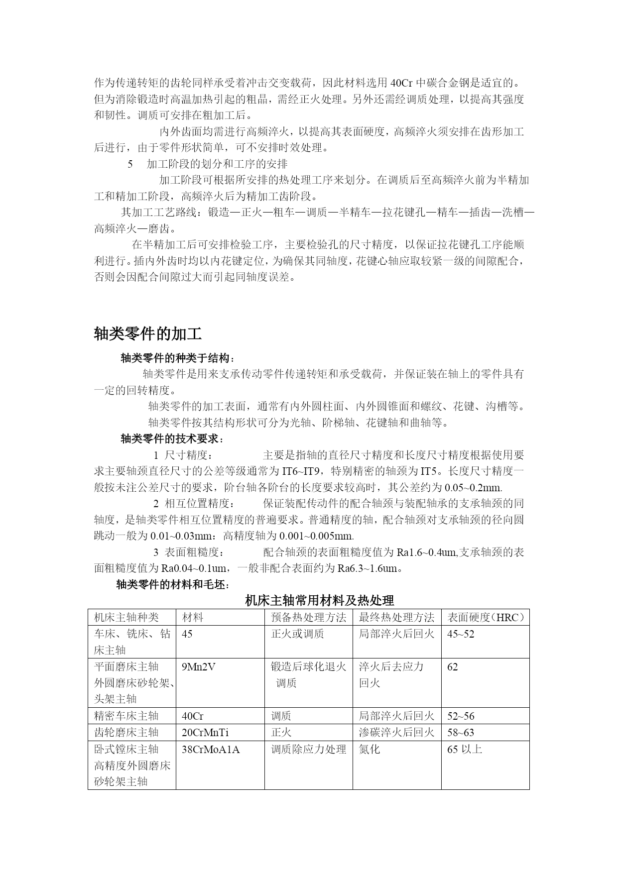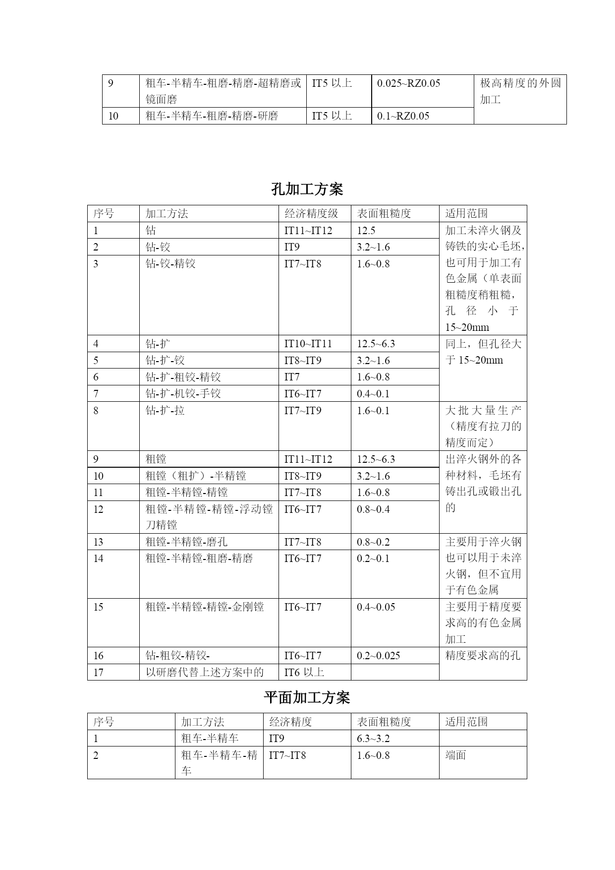 机械制造工艺金属切削基本知识:切削用量三要素:切削速度、进给量、背吃刀量。刀具:前刀面----切屑流过的表面主后刀面------与工件上过度的表面相对的表面副后刀面---与工件上已加工表面相对的表面主切屑刃---前刀面与主后刀面的交线工件加工分类1旋转表面车床、钻床、镗床、外圆磨床2纵向表面刨床、插床、铣床、平面磨床3特性表面齿轮加工机床、仿形机床毛坯的选择:毛坯的种类;1铸件形状复杂的的零件毛坯,宜采用铸造方法制造。目前铸件大多用砂型铸造,只有质量要求高的小型铸件可采用特种铸造(金属型铸造、压力铸造、离心铸造和熔模铸造)2锻件自由锻件可用手工锻打(小型毛坯)机械锻打或压力压锻等方法。这种锻件的精度低,生产率不高,加工余量较大,而且零件的结构必须简单,。模锻件的精度和表面质量都比自由锻件好,而且段件的形状也可较为复杂。3型材型材分热轧合冷轧两种4组合毛坯。表面加工方案的选择:外圆表面加工方案序号加工方法经济精度表面粗糙度适用范围1粗车IT11以下50~12.5适用粹火钢以外的各种金属2粗车-半精车IT8~IT106.3~3.23粗车-半精车-精车IT7~IT81.6~0.84粗车-半精车-精车-滚压(抛光)IT7~IT80.2~0.0255粗车-半精车-磨削IT7~IT80.8~0.4主要用于淬火钢,也可用于未淬火钢,但不宜加工有色金属6粗车-半精车-粗磨-精磨IT6~IT70.4~0.17粗车-半精车-粗磨-精磨-超精加工IT50.1~RZ.18粗车-半精车-精车-金刚石车IT6~IT70.4~0.025主要用于要求较高的有色金属加工9粗车-半精车-粗磨-精磨-超精磨或镜面磨IT5以上0.025~RZ0.05极高精度的外圆加工10粗车-半精车-粗磨-精磨-研磨IT5以上0.1~RZ0.05孔加工方案序号加工方法经济精度级表面粗糙度适用范围1钻IT11~IT1212.5加工未淬火钢及铸铁的实心毛坯,也可用于加工有色金属(单表面粗糙度稍粗糙,孔径小于15~20mm2钻-铰IT93.2~1.63钻-铰-精铰IT7~IT81.6~0.84钻-扩IT10~IT1112.5~6.3同上,但孔径大于15~20mm5钻-扩-铰IT8~IT93.2~1.66钻-扩-粗铰-精铰IT71.6~0.87钻-扩-机铰-手铰IT6~IT70.4~0.18钻-扩-拉IT7~IT91.6~0.1大批大量生产(精度有拉刀的精度而定)9粗镗IT11~IT1212.5~6.3出淬火钢外的各种材料,毛坯有铸出孔或锻出孔的10粗镗(粗扩)-半精镗IT8~IT93.2~1.611粗镗-半精镗-精镗IT7~IT81.6~0.812粗镗-半精镗-精镗-浮动镗刀精镗IT6~IT70.8~0.413粗镗-半精镗-磨孔IT7~IT80.8~0.2主要用于淬火钢也可以用于未淬火钢,但不宜用于有色金属14粗镗-半精镗-粗磨-精磨IT6~IT70.2~0.115粗镗-半精镗-精镗-金刚镗IT6~IT70.4~0.05主要用于精度要求高的有色金属加工16钻-粗铰-精铰-IT6~IT70.2~0.025精度要求高的孔17以研磨代替上述方案中的IT6以上平面加工方案序号加工方法经济精度表面粗糙度适用范围1粗车-半精车IT96.3~3.22粗车-半精车-精车IT7~IT81.6~0.8端面3粗车-半精车-磨削IT8~IT90.8~0.24粗刨(粗铣)-精刨精铣IT8~IT96.3~1.6一般不淬硬平面(端铣表面粗糙度较细)5粗刨(粗铣)-精刨(精铣)-刮研IT6~IT70.8~0.1精度要求交goad不淬硬平面;批量较大时宜采用宽刃精刨方案6一宽刃刨削代替上述方案刮研IT70.8~0.27粗刨(粗铣)-精刨(精铣)-磨削IT70.8~0.2精度要求较高的淬硬平面或不淬硬平面8粗刨(粗铣)-精刨(精铣)-粗磨-精磨IT6~IT70.4~0.029粗铣-拉IT7~IT90.8~0.2大量生产,较小的平面(精度视拉刀精度而定)10粗铣-精铣-磨削-研磨IT6以上0.1~Rz0.05高精度平面工序的安排机械加工工序的安排:基准先行—先粗后精—先主后次—先平面后孔热处理工序安排1正火、退火和调质正火、退火和调质等改善材料力学性能的预备热处理,应安排在粗加工之前或在粗加工和半精加工之间进行。在粗加工前可改善粗加工的加工性能,并可减少转换车间的次数;在粗加工和半精加工之间可消除粗加工产生的内应力。由于调质后零件的综合力学性能较好,对某些硬度和耐磨性要求不高的零件,也可以作为最终的热处理工序。2时效处理时效处理主要用于消除毛坯制造和机械加工中产生的内应力。对铸件的时效处理,应安排在铸造之后或在粗加工之后进行。对精度要求高且刚性较差的