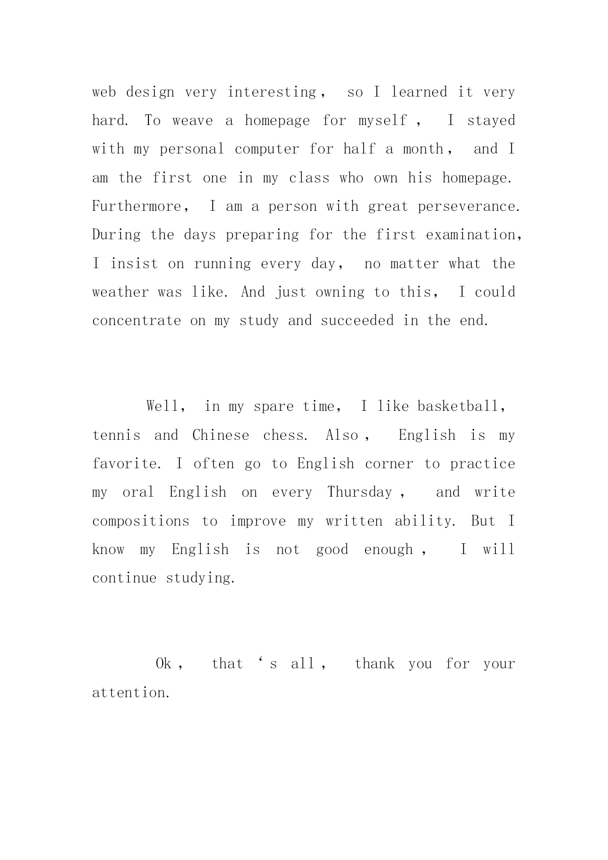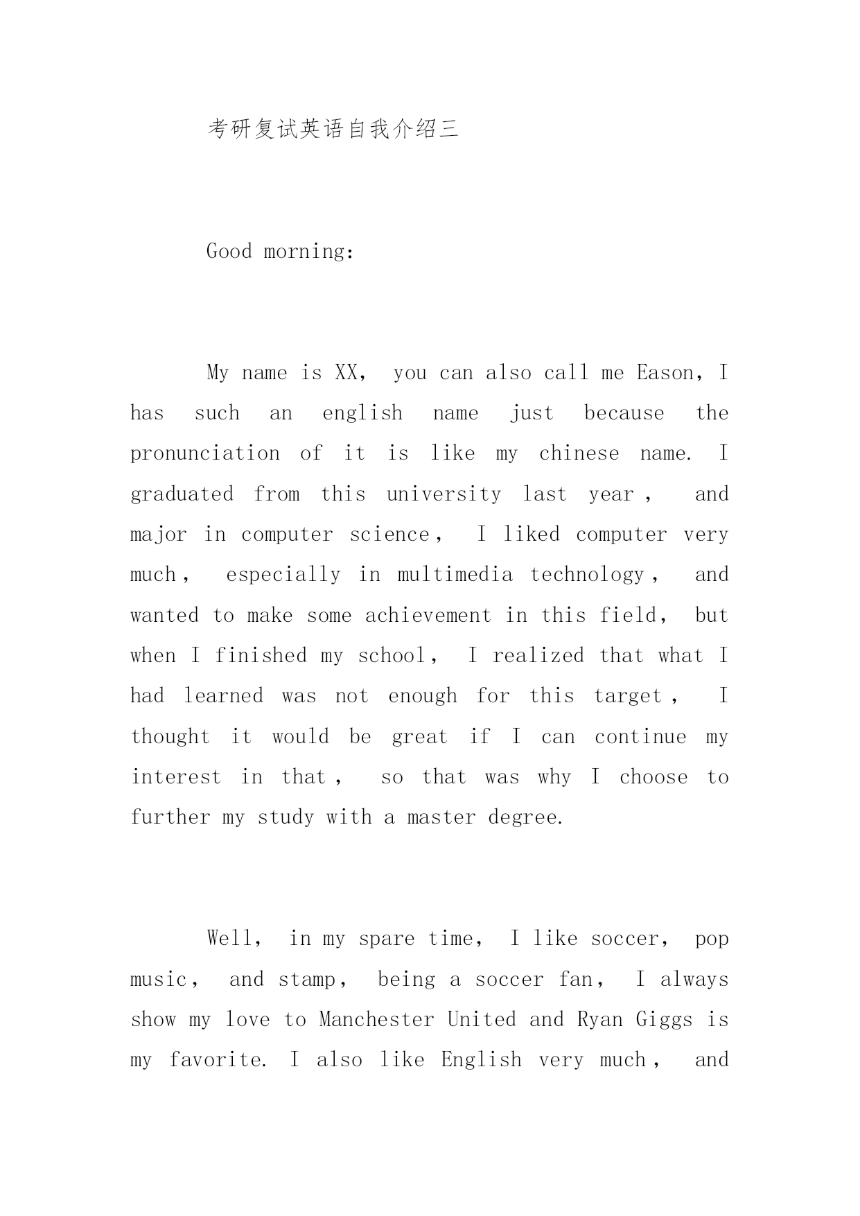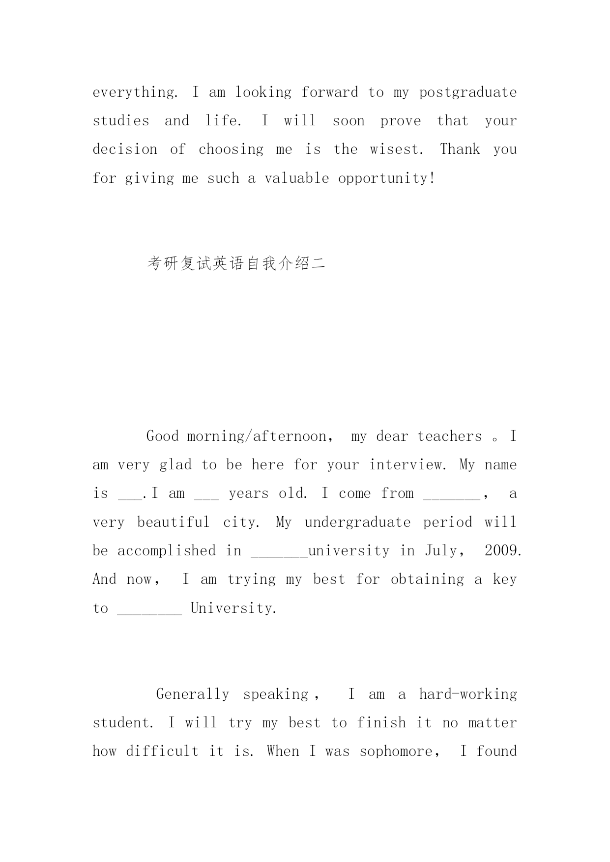 研究生复试英语自我介绍研究生复试英语自我介绍精选3篇考研复试是考生在通过初试的基础上,对考生业务水平和实际能力的进一步考察。下面YJBYS小编为大家推荐3篇关于研究生复试英语自我介绍范文,希望大家喜欢!考研复试英语自我介绍一Goodmorning,everyone!Iamgladtobehereforthisinterview.First,letmeintroducemyselftoyou.MynameisLiMing.IwasbornonApril23,1981.Iamalocalperson.IamgraduatingfromUniversitythisJune.ImajorinChineseliterature.IhopeIcouldgettheopportunitytofinishmypostgraduatecoursesinPekingUniversitywhichIhavedesiredforalongtime.IhavetheconfidencebecauseIhavesuchability!Iamagirlwhoisfervent,outgoingandcreative.Atthesametime,IthinkIamquickinmindandcarefulineverything.Iamlookingforwardtomypostgraduatestudiesandlife.Iwillsoonprovethatyourdecisionofchoosingmeisthewisest.Thankyouforgivingmesuchavaluableopportunity!考研复试英语自我介绍二Goodmorning/afternoon,mydearteachers。Iamverygladtobehereforyourinterview.Mynameis___.Iam___yearsold.Icomefrom_______,averybeautifulcity.Myundergraduateperiodwillbeaccomplishedin_______universityinJuly,2009.Andnow,Iamtryingmybestforobtainingakeyto________University.Generallyspeaking,Iamahard-workingstudent.Iwilltrymybesttofinishitnomatterhowdifficultitis.WhenIwassophomore,Ifoundwebdesignveryinteresting,soIlearneditveryhard.Toweaveahomepageformyself,Istayedwithmypersonalcomputerforhalfamonth,andIamthefirstoneinmyclasswhoownhishomepage.Furthermore,Iamapersonwithgreatperseverance.Duringthedayspreparingforthefirstexamination,Iinsistonrunningeveryday,nomatterwhattheweatherwaslike.Andjustowningtothis,Icouldconcentrateonmystudyandsucceededintheend.Well,inmysparetime,Ilikebasketball,tennisandChinesechess.Also,Englishismyfavorite.IoftengotoEnglishcornertopracticemyoralEnglishoneveryThursday,andwritecompositionstoimprovemywrittenability.ButIknowmyEnglishisnotgoodenough,Iwillcontinuestudying.Ok,that‘sall,thankyouforyourattention.考研复试英语自我介绍三Goodmorning:MynameisXX,youcanalsocallmeEason,Ihassuchanenglishnamejustbecausethepronunciationofitislikemychinesename.Igraduatedfromthisuniversitylastyear,andmajorincomputerscience,Ilikedcomputerverymuch,especiallyinmultimediate