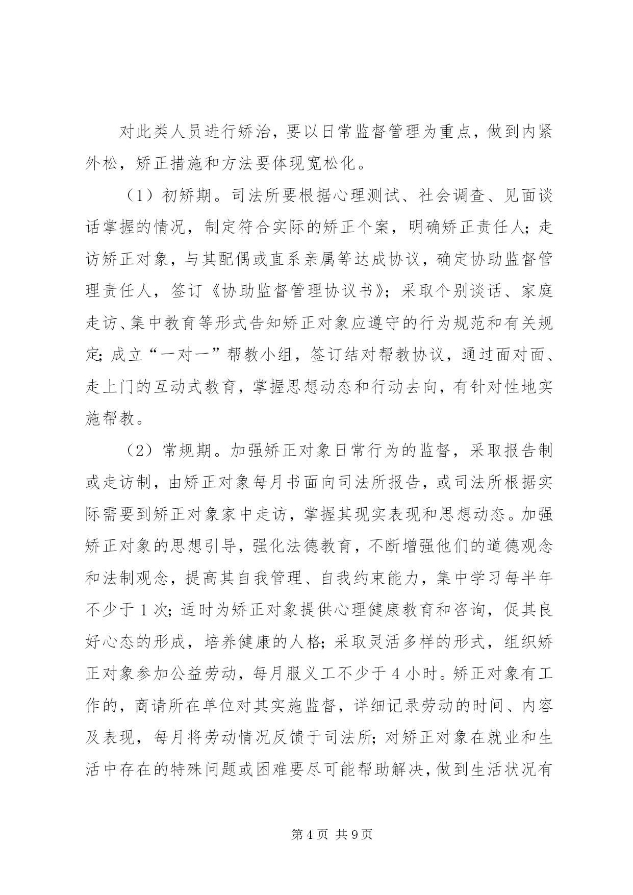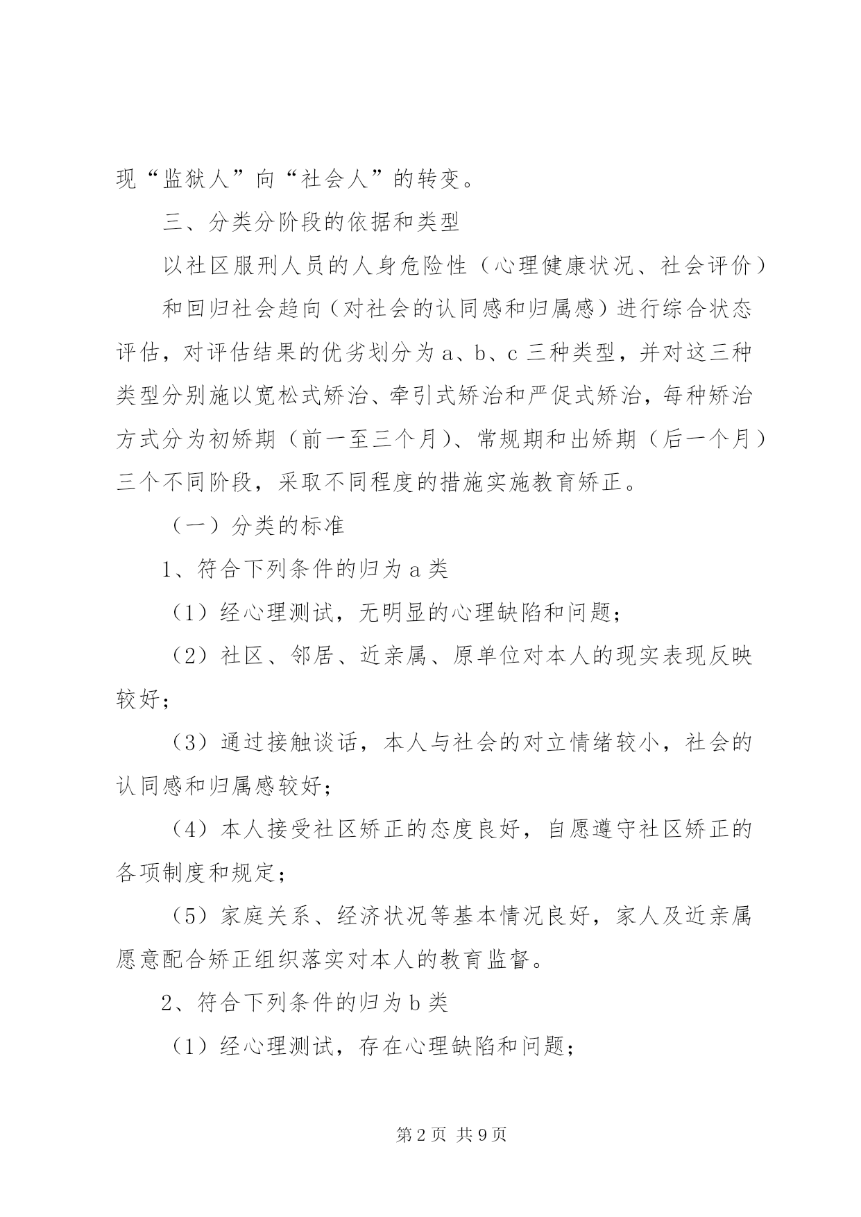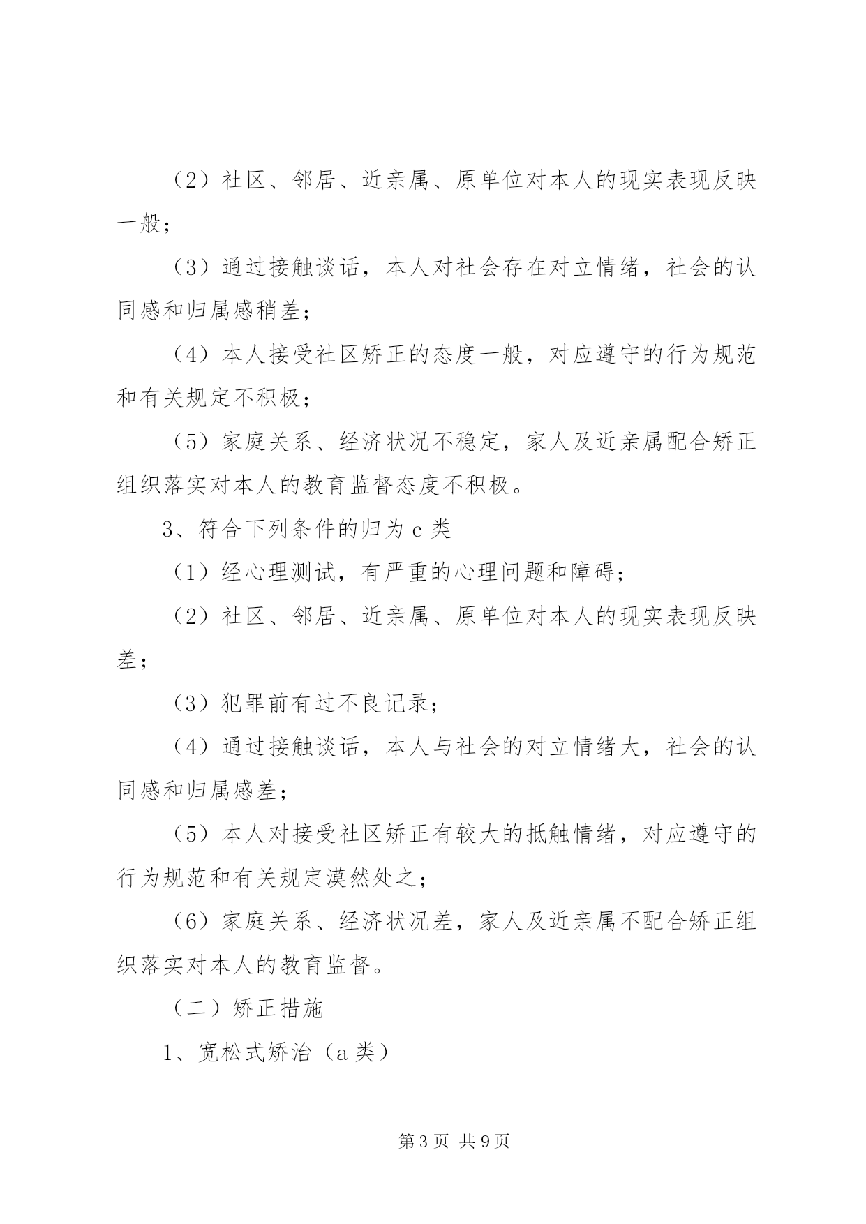 第PAGE\*Arabic\*MERGEFORMAT9页共NUMPAGES\*MERGEFORMAT9页司法局分类矫治工作意见为切实增强社区矫正工作的针对性和实效性,提高矫正对象教育改造质量,维护刑罚执行的严肃性和延续性,促进社会的和谐稳定。经过一年的试点和实践,决定在全区社区矫正对象中实施分类分阶段教育矫治工作。一、指导思想坚持以邓小平理论、“三个代表”重要思想和十六大精神为指导,认真落实科学发展观,以构建和谐社会为目标,运用科学管理手段,坚持以人为本,因人制宜、分类施矫,有效降低社区服刑人员的人身危险性,提高再社会化程度,推动社区矫正工作健康深入地发展,为保障全区经济社会的全面发展和稳定做出积极贡献。二、目标和内容以“对象层次化、方法人性化、项目精细化、管理规范化”为目标,针对个体犯罪的特点,着眼于个性化矫治,坚持思想道德教育和法制教育相结合,以心理矫治为切入点,以劳动实践为融入点,以帮扶解难为着力点,以预防犯罪为落脚点,通过采取不同程度的教育矫正措施和相应的矫治方法,对社区服刑人员分类别、分层次、分阶段进行心理矫治和行为矫治,消除和缓解矫正对象的对立情绪,提高自我控制与自我约束的能力,使他们在实践中逐步完成人格社会化,增强对社会的认同感和归属感,实现“监狱人”向“社会人”的转变。三、分类分阶段的依据和类型以社区服刑人员的人身危险性(心理健康状况、社会评价)和回归社会趋向(对社会的认同感和归属感)进行综合状态评估,对评估结果的优劣划分为a、b、c三种类型,并对这三种类型分别施以宽松式矫治、牵引式矫治和严促式矫治,每种矫治方式分为初矫期(前一至三个月)、常规期和出矫期(后一个月)三个不同阶段,采取不同程度的措施实施教育矫正。(一)分类的标准1、符合下列条件的归为a类(1)经心理测试,无明显的心理缺陷和问题;(2)社区、邻居、近亲属、原单位对本人的现实表现反映较好;(3)通过接触谈话,本人与社会的对立情绪较小,社会的认同感和归属感较好;(4)本人接受社区矫正的态度良好,自愿遵守社区矫正的各项制度和规定;(5)家庭关系、经济状况等基本情况良好,家人及近亲属愿意配合矫正组织落实对本人的教育监督。2、符合下列条件的归为b类(1)经心理测试,存在心理缺陷和问题;(2)社区、邻居、近亲属、原单位对本人的现实表现反映一般;(3)通过接触谈话,本人对社会存在对立情绪,社会的认同感和归属感稍差;(4)本人接受社区矫正的态度一般,对应遵守的行为规范和有关规定不积极;(5)家庭关系、经济状况不稳定,家人及近亲属配合矫正组织落实对本人的教育监督态度不积极。3、符合下列条件的归为c类(1)经心理测试,有严重的心理问题和障碍;(2)社区、邻居、近亲属、原单位对本人的现实表现反映差;(3)犯罪前有过不良记录;(4)通过接触谈话,本人与社会的对立情绪大,社会的认同感和归属感差;(5)本人对接受社区矫正有较大的抵触情绪,对应遵守的行为规范和有关规定漠然处之;(6)家庭关系、经济状况差,家人及近亲属不配合矫正组织落实对本人的教育监督。(二)矫正措施1、宽松式矫治(a类)对此类人员进行矫治,要以日常监督管理为重点,做到内紧外松,矫正措施和方法要体现宽松化。(1)初矫期。司法所要根据心理测试、社会调查、见面谈话掌握的情况,制定符合实际的矫正个案,明确矫正责任人;走访矫正对象,与其配偶或直系亲属等达成协议,确定协助监督管理责任人,签订《协助监督管理协议书》;采取个别谈话、家庭走访、集中教育等形式告知矫正对象应遵守的行为规范和有关规定;成立“一对一”帮教小组,签订结对帮教协议,通过面对面、走上门的互动式教育,掌握思想动态和行动去向,有针对性地实施帮教。(2)常规期。加强矫正对象日常行为的监督,采取报告制或走访制,由矫正对象每月书面向司法所报告,或司法所根据实际需要到矫正对象家中走访,掌握其现实表现和思想动态。加强矫正对象的思想引导,强化法德教育,不断增强他们的道德观念和法制观念,提高其自我管理、自我约束能力,集中学习每半年不少于1次;适时为矫正对象提供心理健康教育和咨询,促其良好心态的形成,培养健康的人格;采取灵活多样的形式,组织矫正对象参加公益劳动,每月服义工不少于4小时。矫正对象有工作的,商请所在单位对其实施监督,详细记录劳动的时间、内容及表现,每月将劳动情况反馈于司法所;对矫正对象在就业和生活中存在的特殊问题或困难要尽可能帮助解决,做到生活状况有人问、思想工作有人做、发生问题有人管、遇到困难有人帮。(3)出矫期。司法所督促矫正对象写出个人总结,并会同派出所依据有关规定和程序解除矫正,由街道帮教组织接茬开展安置帮教工作。2、牵引式矫治(b类)对此类人员进行矫治,要坚持日常管理与重点监督相结合,矫正措施和方法要宽严并济。(1)初矫期。召集有