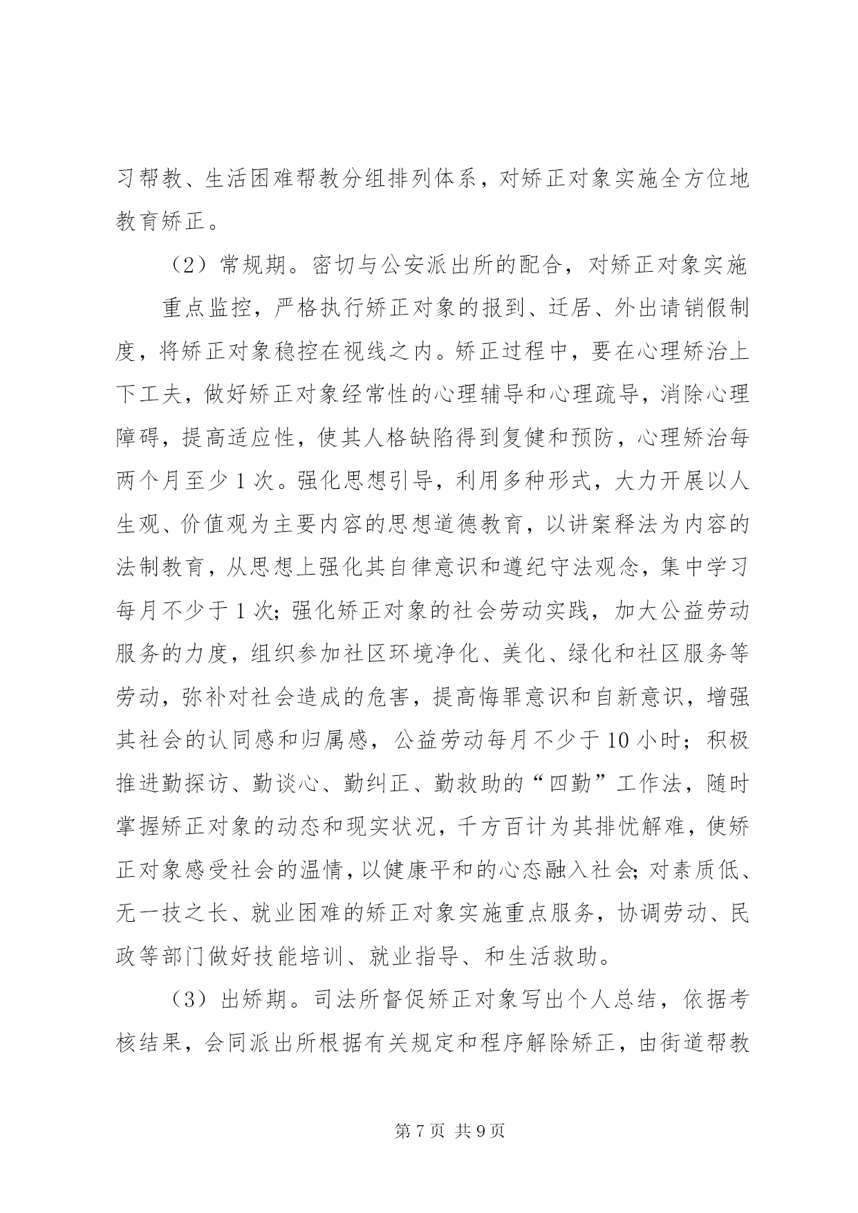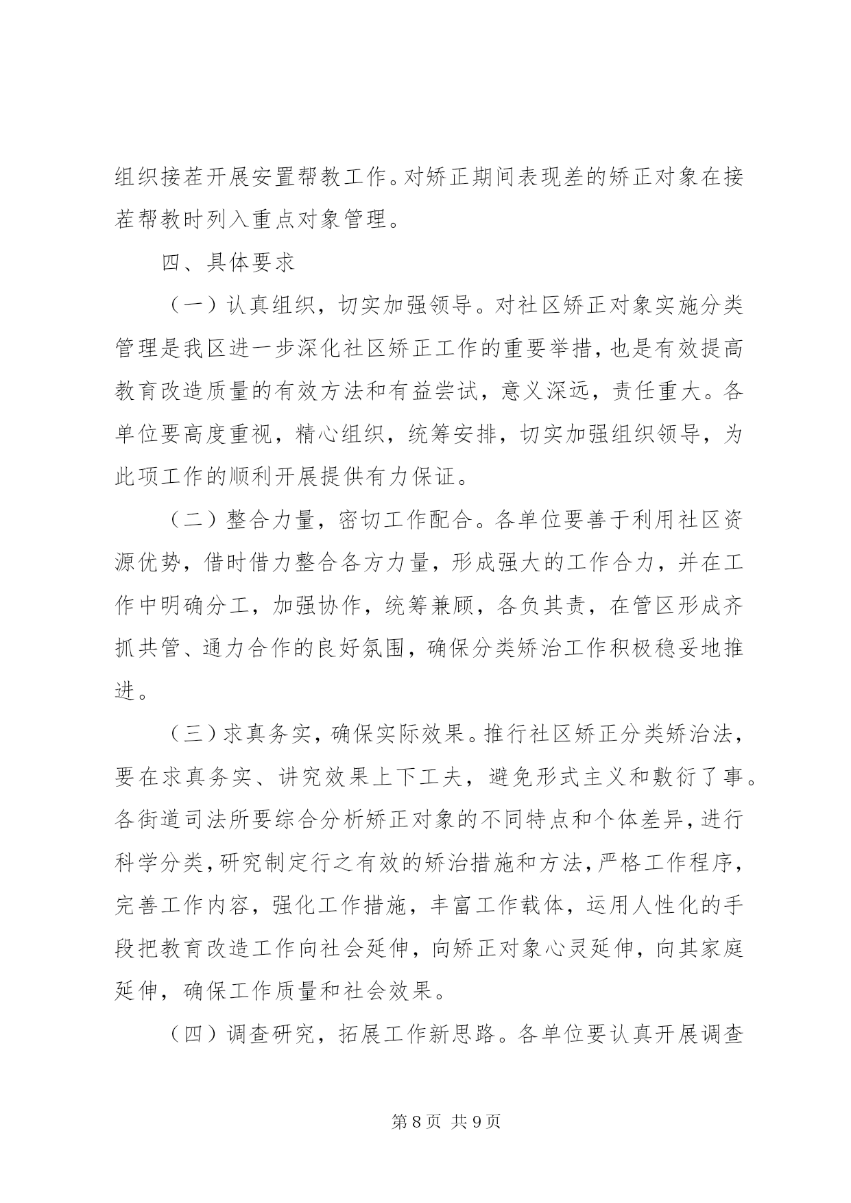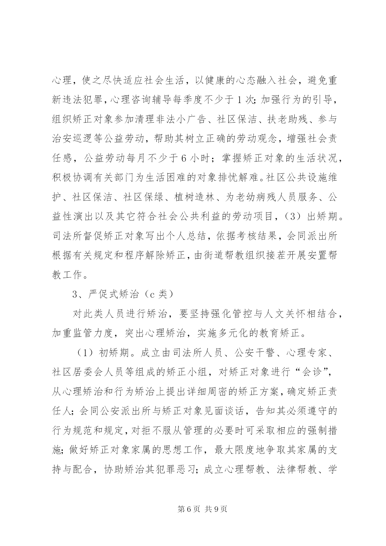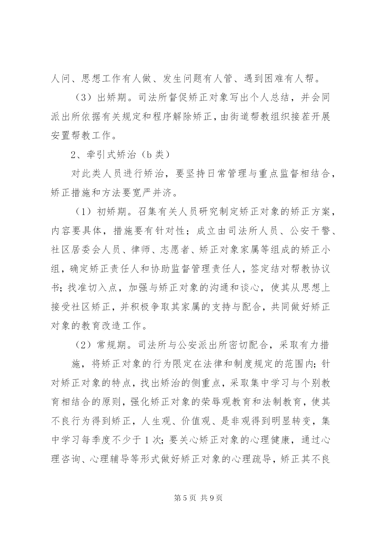 第PAGE\*Arabic\*MERGEFORMAT9页共NUMPAGES\*MERGEFORMAT9页司法局分类矫治工作意见为切实增强社区矫正工作的针对性和实效性,提高矫正对象教育改造质量,维护刑罚执行的严肃性和延续性,促进社会的和谐稳定。经过一年的试点和实践,决定在全区社区矫正对象中实施分类分阶段教育矫治工作。一、指导思想坚持以邓小平理论、“三个代表”重要思想和十六大精神为指导,认真落实科学发展观,以构建和谐社会为目标,运用科学管理手段,坚持以人为本,因人制宜、分类施矫,有效降低社区服刑人员的人身危险性,提高再社会化程度,推动社区矫正工作健康深入地发展,为保障全区经济社会的全面发展和稳定做出积极贡献。二、目标和内容以“对象层次化、方法人性化、项目精细化、管理规范化”为目标,针对个体犯罪的特点,着眼于个性化矫治,坚持思想道德教育和法制教育相结合,以心理矫治为切入点,以劳动实践为融入点,以帮扶解难为着力点,以预防犯罪为落脚点,通过采取不同程度的教育矫正措施和相应的矫治方法,对社区服刑人员分类别、分层次、分阶段进行心理矫治和行为矫治,消除和缓解矫正对象的对立情绪,提高自我控制与自我约束的能力,使他们在实践中逐步完成人格社会化,增强对社会的认同感和归属感,实现“监狱人”向“社会人”的转变。三、分类分阶段的依据和类型以社区服刑人员的人身危险性(心理健康状况、社会评价)和回归社会趋向(对社会的认同感和归属感)进行综合状态评估,对评估结果的优劣划分为a、b、c三种类型,并对这三种类型分别施以宽松式矫治、牵引式矫治和严促式矫治,每种矫治方式分为初矫期(前一至三个月)、常规期和出矫期(后一个月)三个不同阶段,采取不同程度的措施实施教育矫正。(一)分类的标准1、符合下列条件的归为a类(1)经心理测试,无明显的心理缺陷和问题;(2)社区、邻居、近亲属、原单位对本人的现实表现反映较好;(3)通过接触谈话,本人与社会的对立情绪较小,社会的认同感和归属感较好;(4)本人接受社区矫正的态度良好,自愿遵守社区矫正的各项制度和规定;(5)家庭关系、经济状况等基本情况良好,家人及近亲属愿意配合矫正组织落实对本人的教育监督。2、符合下列条件的归为b类(1)经心理测试,存在心理缺陷和问题;(2)社区、邻居、近亲属、原单位对本人的现实表现反映一般;(3)通过接触谈话,本人对社会存在对立情绪,社会的认同感和归属感稍差;(4)本人接受社区矫正的态度一般,对应遵守的行为规范和有关规定不积极;(5)家庭关系、经济状况不稳定,家人及近亲属配合矫正组织落实对本人的教育监督态度不积极。3、符合下列条件的归为c类(1)经心理测试,有严重的心理问题和障碍;(2)社区、邻居、近亲属、原单位对本人的现实表现反映差;(3)犯罪前有过不良记录;(4)通过接触谈话,本人与社会的对立情绪大,社会的认同感和归属感差;(5)本人对接受社区矫正有较大的抵触情绪,对应遵守的行为规范和有关规定漠然处之;(6)家庭关系、经济状况差,家人及近亲属不配合矫正组织落实对本人的教育监督。(二)矫正措施1、宽松式矫治(a类)对此类人员进行矫治,要以日常监督管理为重点,做到内紧外松,矫正措施和方法要体现宽松化。(1)初矫期。司法所要根据心理测试、社会调查、见面谈话掌握的情况,制定符合实际的矫正个案,明确矫正责任人;走访矫正对象,与其配偶或直系亲属等达成协议,确定协助监督管理责任人,签订《协助监督管理协议书》;采取个别谈话、家庭走访、集中教育等形式告知矫正对象应遵守的行为规范和有关规定;成立“一对一”帮教小组,签订结对帮教协议,通过面对面、走上门的互动式教育,掌握思想动态和行动去向,有针对性地实施帮教。(2)常规期。加强矫正对象日常行为的监督,采取报告制或走访制,由矫正对象每月书面向司法所报告,或司法所根据实际需要到矫正对象家中走访,掌握其现实表现和思想动态。加强矫正对象的思想引导,强化法德教育,不断增强他们的道德观念和法制观念,提高其自我管理、自我约束能力,集中学习每半年不少于1次;适时为矫正对象提供心理健康教育和咨询,促其良好心态的形成,培养健康的人格;采取灵活多样的形式,组织矫正对象参加公益劳动,每月服义工不少于4小时。矫正对象有工作的,商请所在单位对其实施监督,详细记录劳动的时间、内容及表现,每月将劳动情况反馈于司法所;对矫正对象在就业和生活中存在的特殊问题或困难要尽可能帮助解决,做到生活状况有人问、思想工作有人做、发生问题有人管、遇到困难有人帮。(3)出矫期。司法所督促矫正对象写出个人总结,并会同派出所依据有关规定和程序解除矫正,由街道帮教组织接茬开展安置帮教工作。2、牵引式矫治(b类)对此类人员进行矫治,要坚持日常管理与重点监督相结合,矫正措施和方法要宽严并济。(1)初矫期。召集有