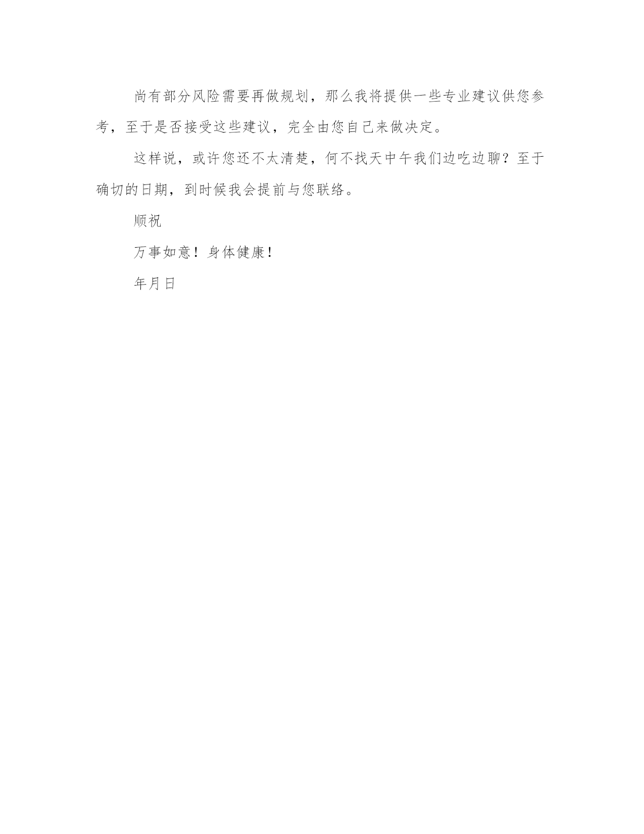 保险营销自我介绍信我想告诉您一个好消息:考虑到自己今后事业的发展,现在我已毅然加入到保险行业,在**人寿保险公司任职。您一定很奇怪为什么我会突然决定离开原有的行业而加入保险业,其实不瞒您说,离开原有的公司对我来说是一项非常坚难的决定。俗话说:男怕入错行,女怕嫁错郎。之所以选择离开,还是基于我对保险业的挚爱以及对自己事业发展空间的追求。从事保险这个行业,就象自己在做一份事业,成本是自己付出的,时间是自己把握的,而工作则是多劳多得,因此完全可以体现自身的价值。而且在**人寿,我尝到了很多新的知识,开拓了自己的思想领域,使我对保险和保险业有了与以往完全不同的认识。进入**人寿,作为一名寿险业务人员,我深切地知道我的工作职责就是:让我所认识的所有朋友都能拥有一份完整且足够的保障。所以基于这样的一个职责,而且您又是我最要好的朋友,我很希望能找个时间与您谈谈有关您目前的风险规划。也请您不用担心及感到压力,虽然我们是好朋友,但是我绝对不会勉强您做任何决定的。我希望透过需求分析的服务,来协助您检视一下您目前的风险规划,如果经过客观的分析后,发现您并不需要保险或已有很完整的保险规划了,那么就表示您以可不必再做调整;如果经过分析后,发现尚有部分风险需要再做规划,那么我将提供一些专业建议供您参考,至于是否接受这些建议,完全由您自己来做决定。这样说,或许您还不太清楚,何不找天中午我们边吃边聊?至于确切的日期,到时候我会提前与您联络。顺祝万事如意!身体健康!年月日