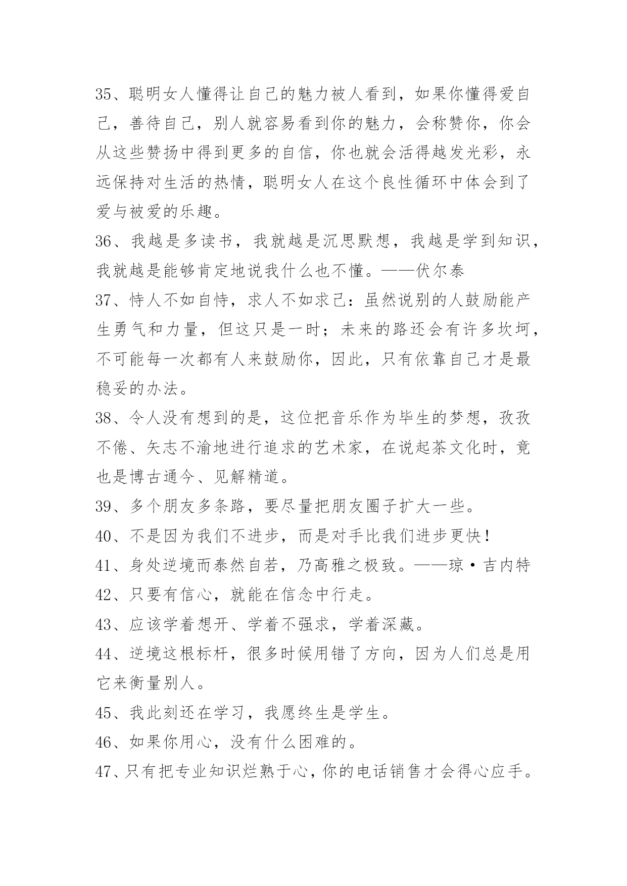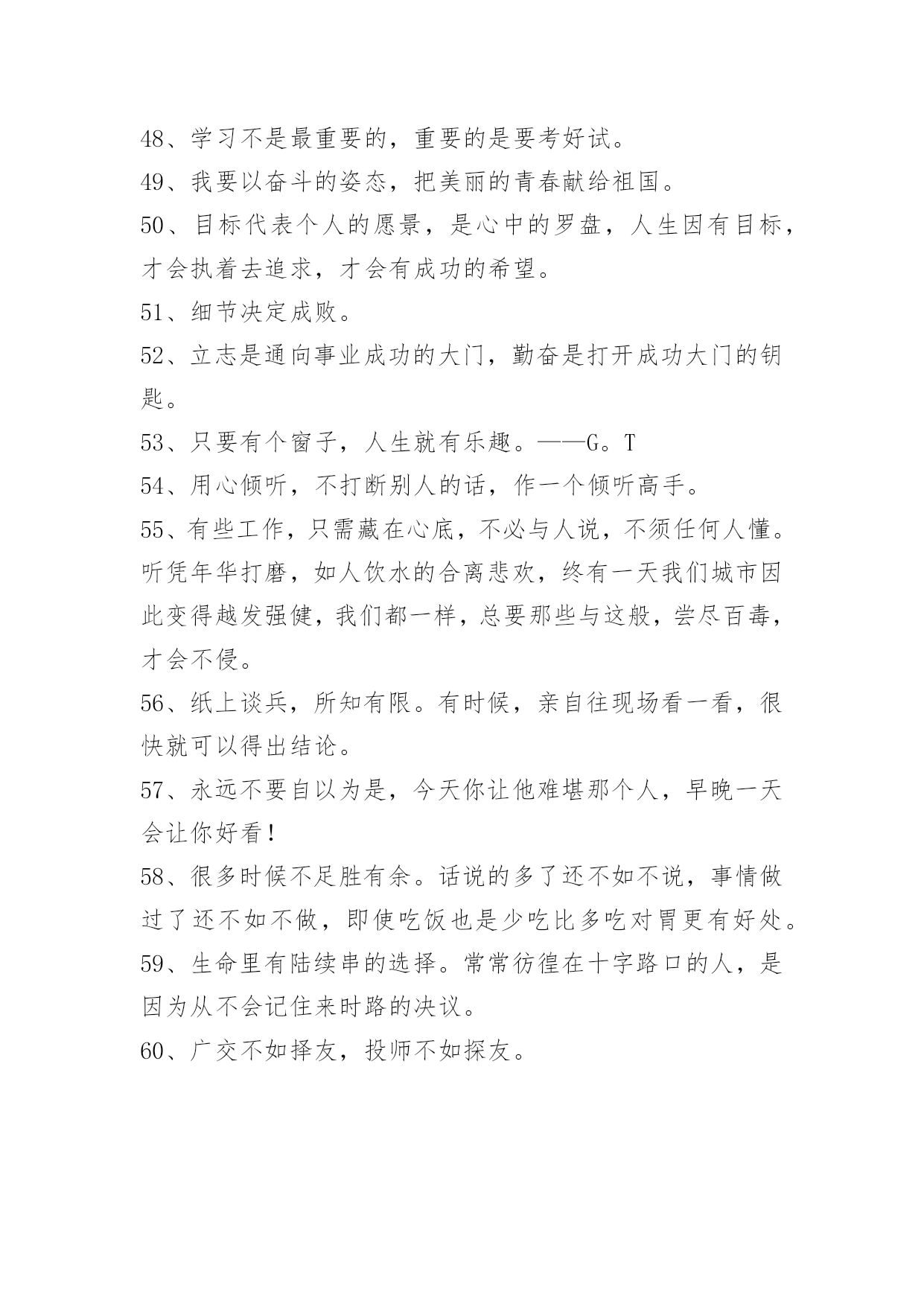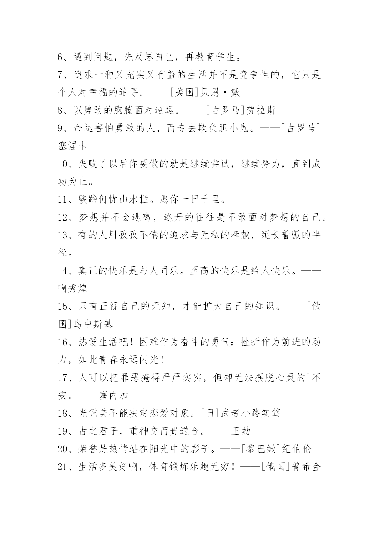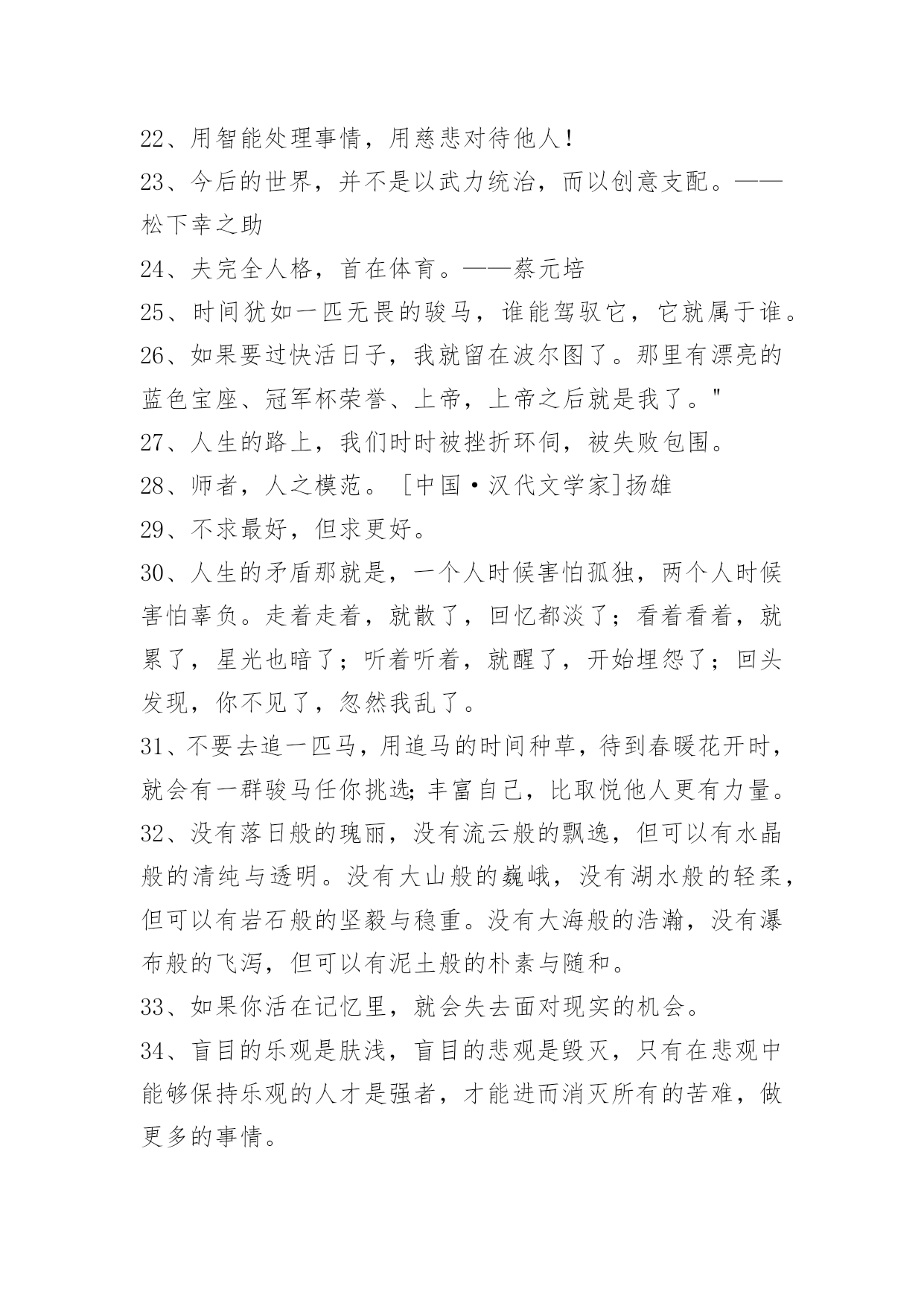 人生感悟格言60条人生感悟格言集锦60条无论在什么方面,科学总是想减轻人的劳动,保护人的精力不至于无谓地浪费掉。下面是小编为大家收集的人生感悟格言60条,感兴趣的一起来看看吧。1、人的美德的荣誉比他财富的荣誉不知大多少倍。古今多少帝王公侯,可是却没在我们记忆中留下一丝痕迹,就因为他们只想用庄园和财富留名后世。岂不见多少人在钱财上一贫如洗,但是在美德上却是豪富呢?——[意大利]达·芬奇2、我生性不做事则已,既做事又要尽力做得像样;所以我不想做工程师则已,要做工程师,决不愿做个"蹩脚"的工程师。邹韬奋《经历》。3、爱情是吞噬一切的激情;爱情,这是双方特别的个人关系。[尼日利亚]西普里安·埃克文西《自由之夜》,《非洲当代中篇小说选》。4、如果你打孩子,你要注意,你是否在生气时打他,因为如果这样,会有使他终生残废的危险。冷酷地打一巴掌也是既不可以,也不应该原谅的。——[英国]萧伯纳5、想象就是深度。没有一种精神机能比想象更能自我深化,更能深入对象,这是伟大的潜水者。任何东西都没有像大胆的幻想那样能促进未来的创立。在泥土下面,黑暗的地方,才能发现金刚钻,在深入缜密的思考中,才能发现真理。6、遇到问题,先反思自己,再教育学生。7、追求一种又充实又有益的生活并不是竞争性的,它只是个人对幸福的追寻。——[美国]贝恩·戴8、以勇敢的胸膛面对逆运。——[古罗马]贺拉斯9、命运害怕勇敢的人,而专去欺负胆小鬼。——[古罗马]塞涅卡10、失败了以后你要做的就是继续尝试,继续努力,直到成功为止。11、骏蹄何忧山水拦。愿你一日千里。12、梦想并不会逃离,逃开的往往是不敢面对梦想的自己。13、有的人用孜孜不倦的追求与无私的奉献,延长着弧的半径。14、真正的快乐是与人同乐。至高的快乐是给人快乐。——啊秀煌15、只有正视自己的无知,才能扩大自己的知识。——[俄国]鸟中斯基16、热爱生活吧!困难作为奋斗的勇气:挫折作为前进的动力,如此青春永远闪光!17、人可以把罪恶掩得严严实实,但却无法摆脱心灵的`不安。——塞内加18、光凭美不能决定恋爱对象。[日]武者小路实笃19、古之君子,重神交而贵道合。——王勃20、荣誉是热情站在阳光中的影子。——[黎巴嫩]纪伯伦21、生活多美好啊,体育锻炼乐趣无穷!——[俄国]普希金22、用智能处理事情,用慈悲对待他人!23、今后的世界,并不是以武力统治,而以创意支配。——松下幸之助24、夫完全人格,首在体育。——蔡元培25、时间犹如一匹无畏的骏马,谁能驾驭它,它就属于谁。26、如果要过快活日子,我就留在波尔图了。那里有漂亮的蓝色宝座、冠军杯荣誉、上帝,上帝之后就是我了。"27、人生的路上,我们时时被挫折环伺,被失败包围。28、师者,人之模范。[中国·汉代文学家]扬雄29、不求最好,但求更好。30、人生的矛盾那就是,一个人时候害怕孤独,两个人时候害怕辜负。走着走着,就散了,回忆都淡了;看着看着,就累了,星光也暗了;听着听着,就醒了,开始埋怨了;回头发现,你不见了,忽然我乱了。31、不要去追一匹马,用追马的时间种草,待到春暖花开时,就会有一群骏马任你挑选;丰富自己,比取悦他人更有力量。32、没有落日般的瑰丽,没有流云般的飘逸,但可以有水晶般的清纯与透明。没有大山般的巍峨,没有湖水般的轻柔,但可以有岩石般的坚毅与稳重。没有大海般的浩瀚,没有瀑布般的飞泻,但可以有泥土般的朴素与随和。33、如果你活在记忆里,就会失去面对现实的机会。34、盲目的乐观是肤浅,盲目的悲观是毁灭,只有在悲观中能够保持乐观的人才是强者,才能进而消灭所有的苦难,做更多的事情。35、聪明女人懂得让自己的魅力被人看到,如果你懂得爱自己,善待自己,别人就容易看到你的魅力,会称赞你,你会从这些赞扬中得到更多的自信,你也就会活得越发光彩,永远保持对生活的热情,聪明女人在这个良性循环中体会到了爱与被爱的乐趣。36、我越是多读书,我就越是沉思默想,我越是学到知识,我就越是能够肯定地说我什么也不懂。——伏尔泰37、恃人不如自恃,求人不如求己:虽然说别的人鼓励能产生勇气和力量,但这只是一时;未来的路还会有许多坎坷,不可能每一次都有人来鼓励你,因此,只有依靠自己才是最稳妥的办法。38、令人没有想到的是,这位把音乐作为毕生的梦想,孜孜不倦、矢志不渝地进行追求的艺术家,在说起茶文化时,竟也是博古通今、见解精道。39、多个朋友多条路,要尽量把朋友圈子扩大一些。40、不是因为我们不进步,而是对手比我们进步更快!41、身处逆境而泰然自若,乃高雅之极致。——琼·吉内特42、只要有信心,就能在信念中行走。43、应该学着想开、学着不强求,学着深藏。44、逆境这根标杆,很多时候用错了方向,因为人们总是用它来衡量别人。45、我此刻还在学习,我愿终生是学生。46、如果你用心,没有什么困难的。47、只有把专业知识