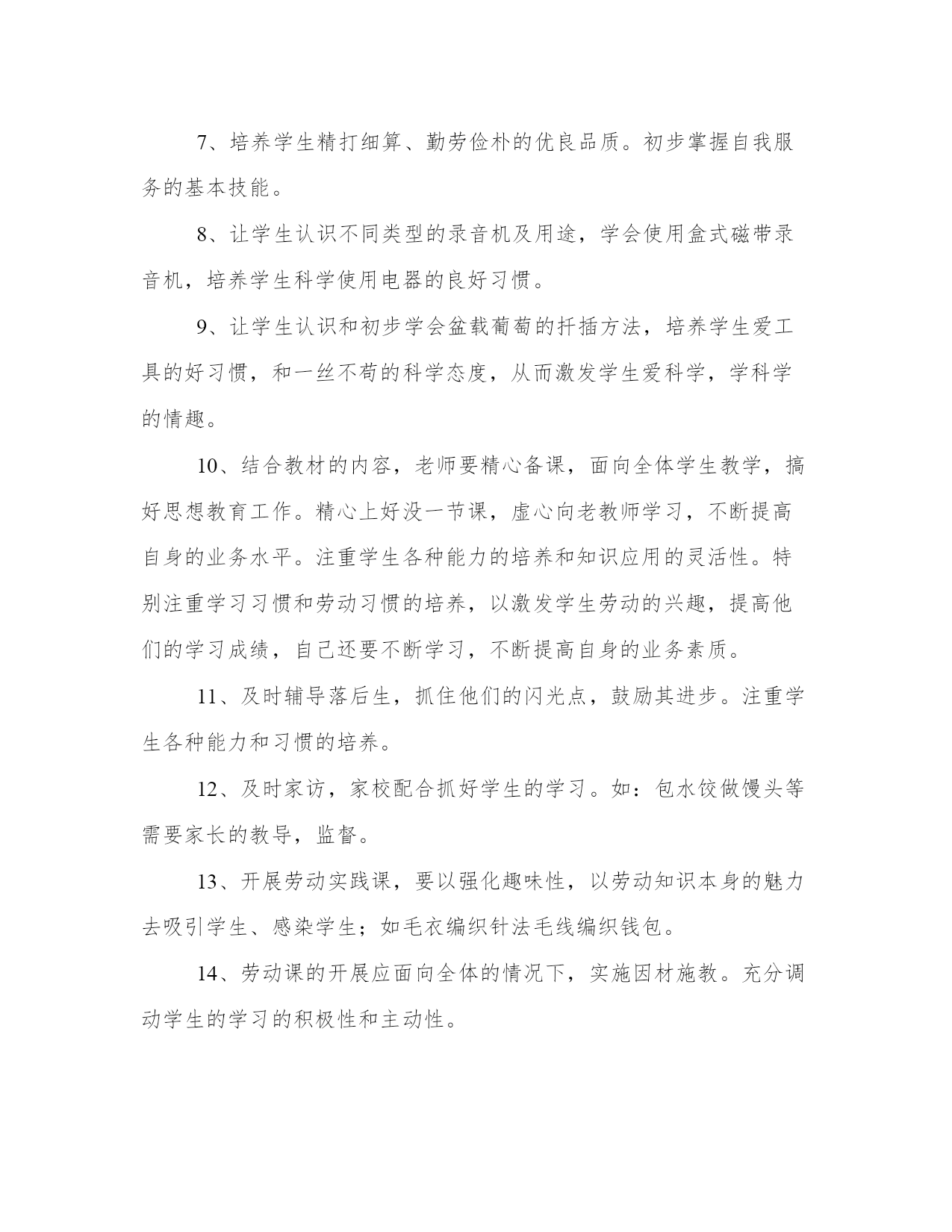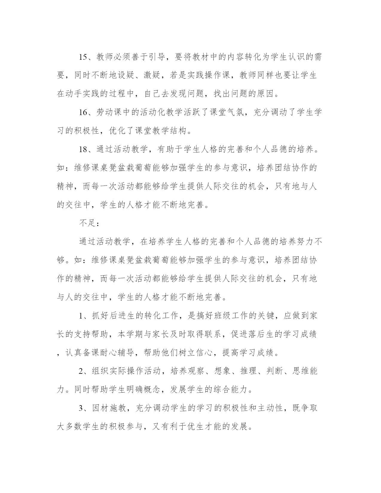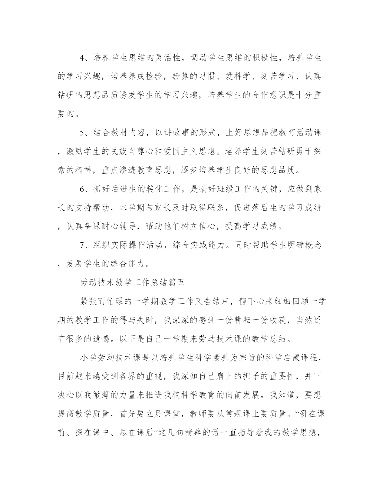 劳动技术教学工作总结(模板12篇)当工作或学习进行到一定阶段或告一段落时,需要回过头来对所做的工作认真地分析分析一下,肯定成绩,找出问题,归纳出经验教训,提高认识,明确方向,以便进一步做好工作,并把这些用文字表述出来,就叫做总结。大家想知道怎么样才能写一篇比较优质的总结吗?下面是小编整理的个人今后的总结范文,欢迎阅读分享,希望对大家有所帮助。劳动技术教学工作总结篇一引入图画,激发学习兴趣。六年级的学生对过去学的画图特别感兴趣,而计算机正具有能画画的特点。根据这一特点,可以把计算机新课的学习寓于画画之中,激发学生学习的兴趣。在学生浓厚的兴趣中学习新知识,掌握新技能。利用学习成绩,提高学生的求知欲在不断地学习中,采用边学边用的方法,学一点就让学生应用起来,不仅要满足学生的好奇心,还要在应用过程中,充分肯定学生自身的能力,增强学生的自信心,保持和促进学生学习的积极性,进一步激发学生学习计算机的兴趣,形成一个良性循环。及时做总结,写反思。做到期初有计划,有教学进度,使教学工作能有条不紊地顺利进行下去;学生通过学习活动,在不断获得新知识的过程中,能够不断地看到自己的成果时,就会爆发出强烈的继续学习的愿望,学习兴趣也就越来越浓厚。如在教学如何上网查找资料时,我先让学生了解了一下语文课文中需要的学习资料,这样学生既学习了语文,又学会了上网查资料,真是一举两得!学会了上网查资料的方法后,我让学生自已在网上查找资料,在教学过程中,采用边学边用的方法,学一点就让学生应用起来,不但可以满足学生的好奇心,而且在应用的过程中,可以充分肯定学生自身的能力,增强学生的自信心,使学生总感觉到有新的挑战,新的兴奋点,这样既保持和促进了学生的学习积极性,又可以进一步激发学生学习计算机的兴趣。这门课程在农村中小学开设的时间不长,应试教育的影响却根深蒂固,不论是教师、学生还是家长,对一门课的重视程度往往取决于它在中考、高考当中所占的比重,对于信息技术这门课程,谁都不愿投入太多的精力和时间,对于这门课具体怎样去上,大家都不会很重视。而多数人一致认为信息技术离农村遥不可及,师生学无所用,加之部分学生长时间沉湎于游戏,导致其学习成绩急剧下降,一些新闻媒体上传播的学生因某些网站上不良信息以及暴力游戏的影响,诱使青少年学生误入歧途甚至走上犯罪道路的事件屡见不鲜。于是来自家庭和社会的反对呼声较为强烈,很多家长认为这门课开还不如不开,亦使得它一定程度上遭到冷落。针对这种现象,本人以为,教师应该从教学内容、教学方法、课堂教学的艺术等方面入手,认真分析教材、分析学生,正确地引导学生,使其对电脑的兴趣发展为对信息技术的兴趣。谈谈激发学生学习兴趣的几种方法。1、以精彩的课堂“引入”,激发学生的学习兴趣文字编辑是中小学信息技术课的最主要内容这一,然而不少学生会认为,文字编辑不就是“打字”吗?只要会输入文字不就可以了,一些连简单的插入、删除还没有学会的学生也觉得它“没意思”。在上“文字编辑”这节课时,从科学家发明了一种“特殊的纸”,用作练习本入手,引入本节课的教学内容,这种“特殊的纸”具有容量大、易修改、无污染等特点,广泛应用于日常生活之中,如手机短信、商务通等,使学生在体会信息技术对人类日常生活深刻影响的同时,感受到文字输入的重要性,从而激发学生的学习兴趣。2、选择适当的教学内容,提高学生学习兴趣我根据学校的条件及学生的接受能力做出选择,没有必要照本宣科,使一些对画图程序已经“玩儿”得很溜的学生失去学习兴趣。又如,在讲word中“插入图片”这节课时,在介绍插入图片的几种方法的同时,给学生介绍一些图片来源的知识,如用数码相机、扫描仪等,不仅能够培养学生理论联系实际的意识和能力,还可以提高学生的学习兴趣。回顾这个学期所从事的电脑教学工作,基本上是比较顺利地完成了教学任务。当然,在工作中我享受到收获的喜悦,也在工作中发现一些存在的问题。我所享有的收获我会用于下个学期的工作中,我所碰到的问题我要认真思考想办法解决。作为教师,教学工作是主要的,但除了教学工作外,我也积极参加学校组织其它活动。根据上述总结,我深深感到,只要立足实际,认真分析和分析好教材、分析好学生,争取学校领导、师生的支持,就能创造性地搞好信息技术课的教学,就能使我们的工作有所开拓,有所进取。劳动技术教学工作总结篇二劳动技术课是九年义务教育重要的课程之一,搞好劳动技术课的教学工作可以使学生掌握简单的劳动方法。提高劳动技能,培养他们热爱劳动的高尚品质。因此为了搞好本学期的劳动教学工作,特制定科学合理的教学计划。本学期三年级一班共31人,学生整体素质不错。但思想较浮躁,大多数同学热爱劳动,几个别学生劳动态度不端正。1、学生的基础知识掌握较好,但不爱动手操作,劳动态度需要端正。2、劳动课受条件的限制,缺乏参加实