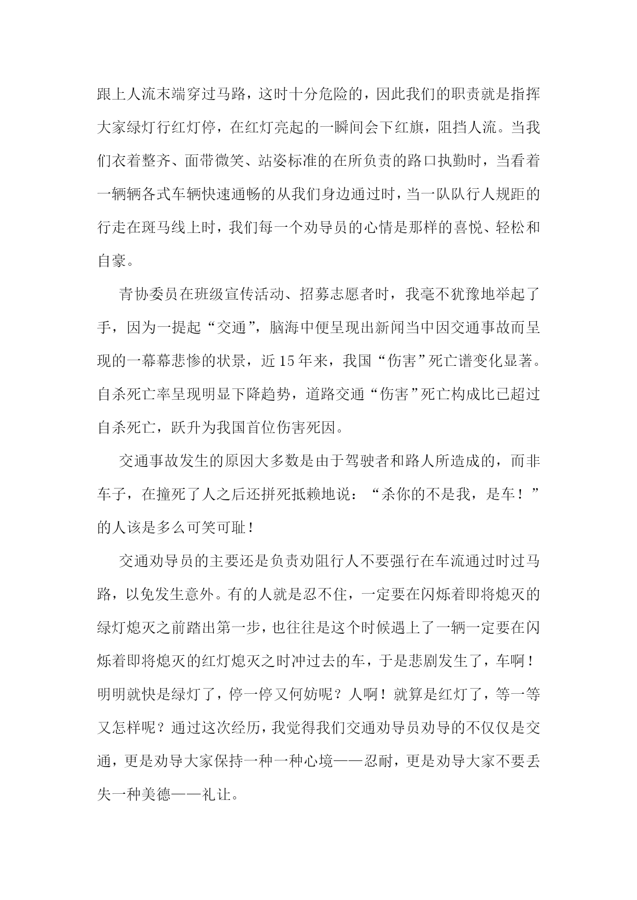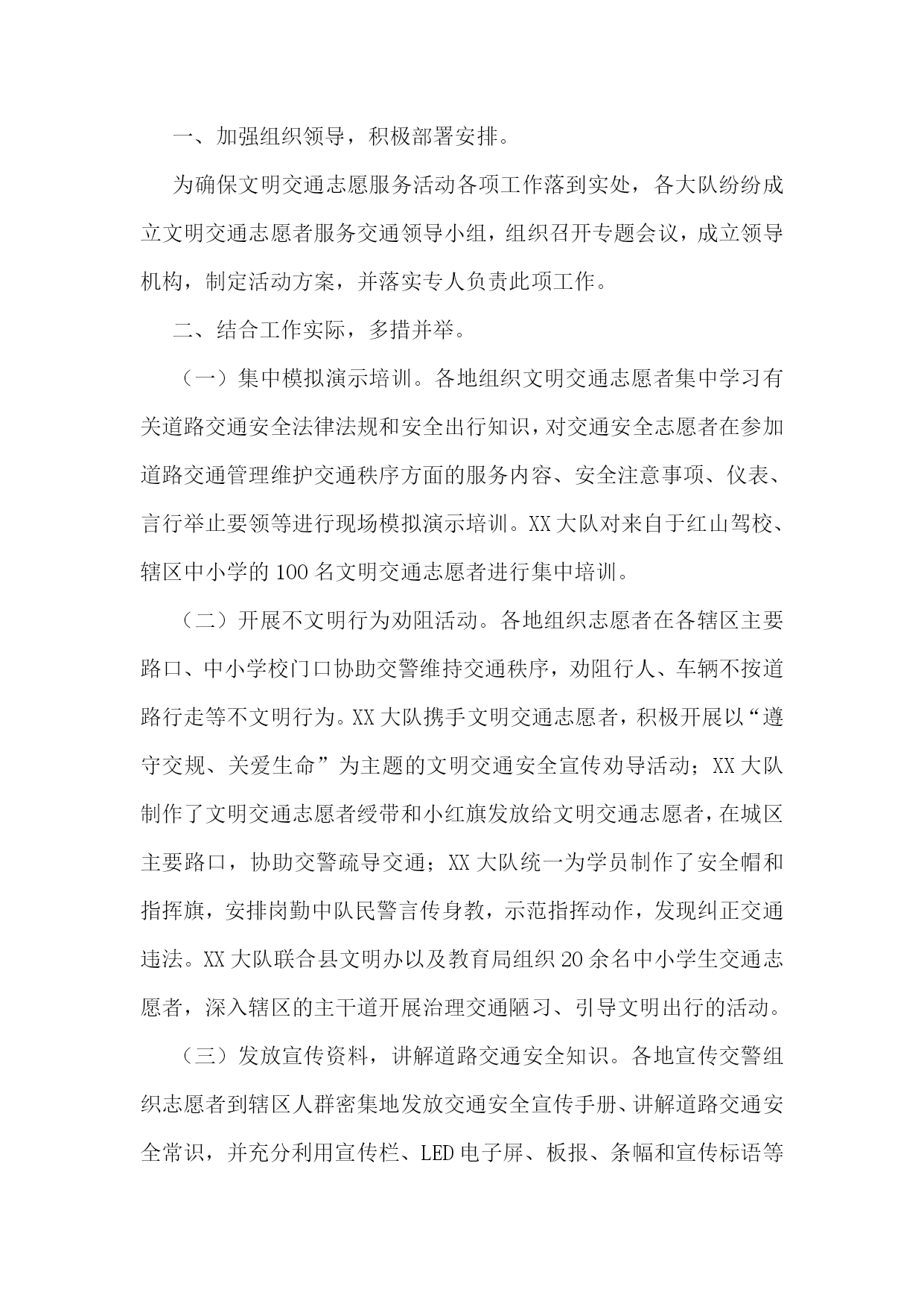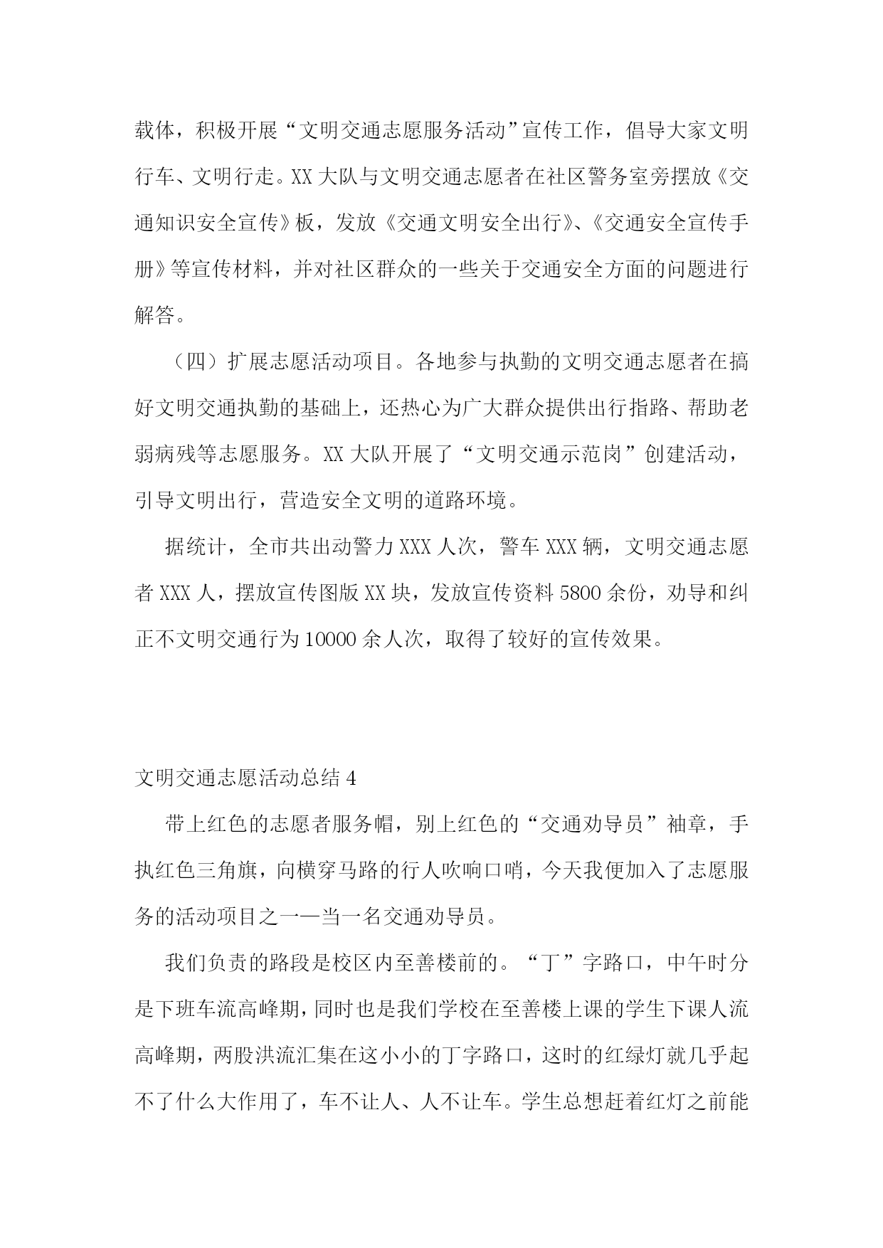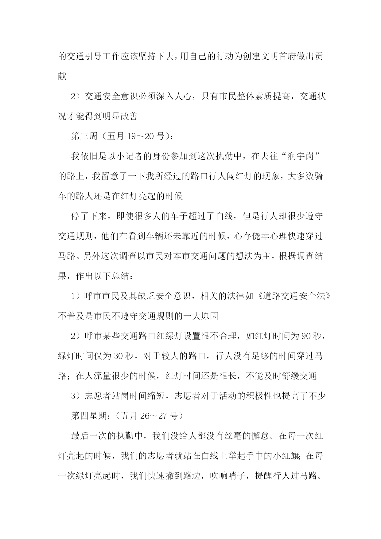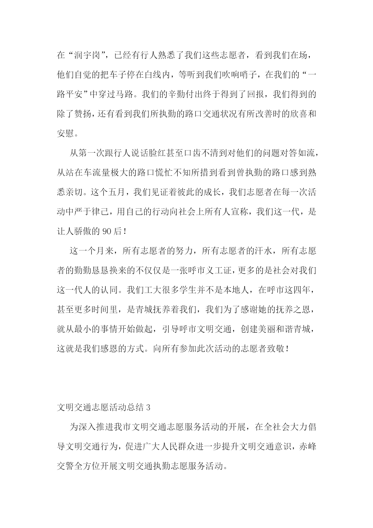 文明交通志愿活动总结文明交通志愿活动总结1xx月2日上午8时,作为交通运输局的一名交通志愿者,伴随着烈日阳光出现在鄂前旗敖镇中心转盘十字路口的人行横到处,开始了一天的文明交通劝导志愿者工作。随着路口交通指示灯的变化,挥动手中的小黄旗,对行人和非机动车辆宣传红灯停绿灯行、文明礼让的出行习惯,维护路口的秩序,在烈日的映衬下,自己却成为了街头的一抹亮色。经历了一天的路面执勤,我深深的体会到作为交通秩序的维护者和执法者的辛苦和责任,在路面站岗执勤,从早到晚经受风吹日晒,更重要的是时刻保持高度的注意力,随时注意车辆、行人遵守交通秩序通行。虽然大部分市民和机动车驾驶员都能遵守交通规则,过马路看红绿灯、走斑马线,但仍有小部分开电动车群体不走斑马线,随意横穿马路,当提醒他们的时候,有的甚至置之不理,有的电动车抱着侥幸的心里,见路况好,速度开的很快,还有的抢过红绿灯等等这些不文明的行车行为,都会为我们自己和他人的生命安全带来危害。俗话说,“正人先正己”,希望每一个市民都能做文明的先行者,以文明出行的实际行动去感染身边的人,争做文明交通出行的践行者和传播者。让正确的交通出行和文明交通行为,成为我们出行的习惯。文明交通志愿活动总结2为期一个月的“交通志愿者活动“在五月这个文明交通月里如火如荼的进行着,为深入开展“文明交通志愿者活动”,工业大学校青协在学校里充分利用贴吧、展板、飞信、QQ交流群等宣传阵地,积极宣传此次活动,为营造良好的活动氛围打下基础。现将四个星期四次志愿活动进行如下总结:第一周(5月4~5号):活动开展第一天恰逢青年节,第一次穿上青城志愿者专属的红马甲,带上红帽子,在接受了交警的简单培训后就正式上岗。第一次跟越线的阿姨说“为了您的安全请您退到白线以内”时内心除了胆怯不安更多的是小小的成就感,到第二次时就理直气壮地拿出小红旗将超出白线的行人劝退回白线以内。发现问题:志愿者站岗时间为整三个小时,没有替岗,炎热的天气使很多志愿者的耐心消失殆尽最深的感悟是:做志愿活动很简单;文明交通习惯的养成是一个长期渐近的过程,我们要想彻底改善呼市交通,我们必须坚持下去第二周(五月11~12号):很荣幸作为小记者对行人进行关于我们志愿者表现的调查,我并不害怕跟陌生人打交道,可是我害怕的是当我用带着笑脸迎上去问问题的时候,那些温暖明亮的阳光下某些人冷漠的表情和冷淡的言语,举手投足间还给我的甚至是鄙视和不屑,丝毫没有青城市民所独有的情谊。虽然如此,我的工作依然在好心人的配合下顺利完成,根据调查来看,得出如下总结:1)我们志愿者的工作得到了大多数市民的认可和好评我们志愿者的交通引导工作应该坚持下去,用自己的行动为创建文明首府做出贡献2)交通安全意识必须深入人心,只有市民整体素质提高,交通状况才能得到明显改善第三周(五月19~20号):我依旧是以小记者的身份参加到这次执勤中,在去往“润宇岗”的路上,我留意了一下我所经过的路口行人闯红灯的现象,大多数骑车的路人还是在红灯亮起的时候停了下来,即使很多人的车子超过了白线,但是行人却很少遵守交通规则,他们在看到车辆还未靠近的时候,心存侥幸心理快速穿过马路。另外这次调查以市民对本市交通问题的想法为主,根据调查结果,作出以下总结:1)呼市市民及其缺乏安全意识,相关的法律如《道路交通安全法》不普及是市民不遵守交通规则的一大原因2)呼市某些交通路口红绿灯设置很不合理,如红灯时间为90秒,绿灯时间仅为30秒,对于较大的路口,行人没有足够的时间穿过马路;在人流量很少的时候,红灯时间还是很长,不能及时舒缓交通3)志愿者站岗时间缩短,志愿者对于活动的积极性也提高了不少第四星期:(五月26~27号)最后一次的执勤中,我们没给人都没有丝毫的懈怠。在每一次红灯亮起的时候,我们的志愿者就站在白线上举起手中的小红旗;在每一次绿灯亮起时,我们快速撤到路边,吹响哨子,提醒行人过马路。在“润宇岗”,已经有行人熟悉了我们这些志愿者,看到我们在场,他们自觉的把车子停在白线内,等听到我们吹响哨子,在我们的“一路平安”中穿过马路。我们的辛勤付出终于得到了回报,我们得到的除了赞扬,还有看到我们所执勤的路口交通状况有所改善时的欣喜和安慰。从第一次跟行人说话脸红甚至口齿不清到对他们的问题对答如流,从站在车流量极大的路口慌忙不知所措到看到曾执勤的路口感到熟悉亲切。这个五月,我们见证着彼此的成长,我们志愿者在每一次活动中严于律己,用自己的行动向社会上所有人宣称,我们这一代,是让人骄傲的90后!这一个月来,所有志愿者的努力,所有志愿者的汗水,所有志愿者的勤勤恳恳换来的不仅仅是一张呼市义工证,更多的是社会对我们这一代人的认同。我们工大很多学生并不是本地人,在呼市这四年,甚至更多时间里,是青城抚养着我们,我们为了感谢她的抚养之恩