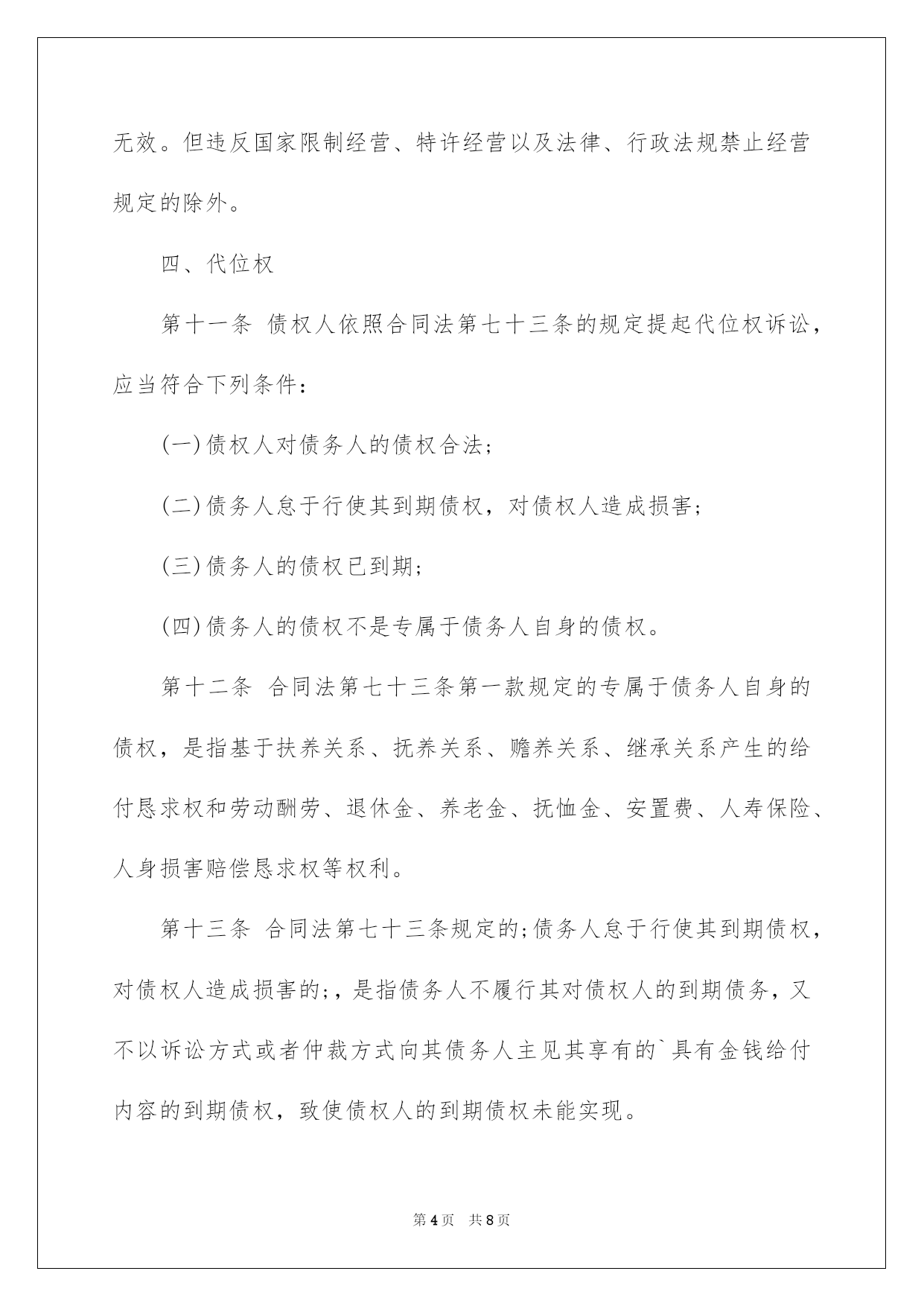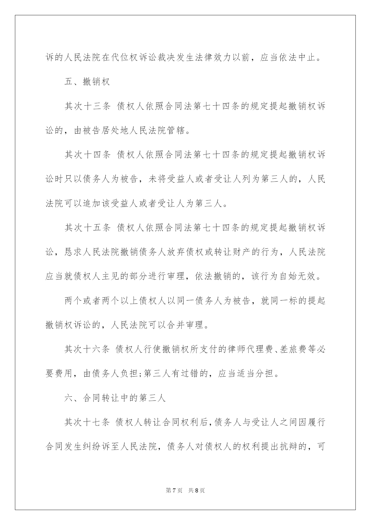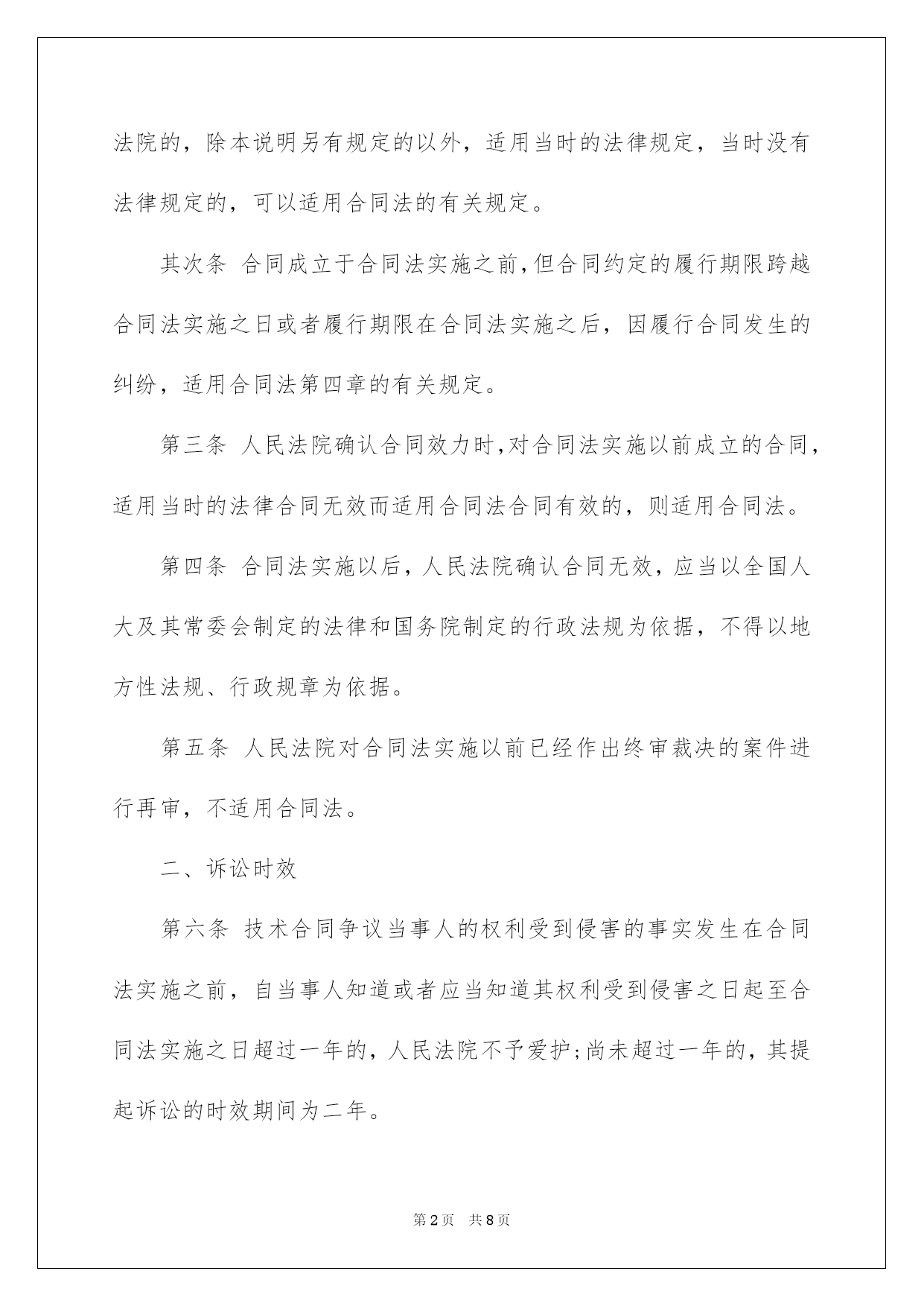 第PAGE\*Arabic\*MERGEFORMAT8页共NUMPAGES\*Arabic\*MERGEFORMAT8页第PAGE\*MERGEFORMAT8页共NUMPAGES\*MERGEFORMAT8页第PAGE\*MERGEFORMAT8页共NUMPAGES\*MERGEFORMAT8页第PAGE\*MERGEFORMAT8页共NUMPAGES\*MERGEFORMAT8页第PAGE\*MERGEFORMAT8页共NUMPAGES\*MERGEFORMAT8页第PAGE\*MERGEFORMAT8页共NUMPAGES\*MERGEFORMAT8页第PAGE\*MERGEFORMAT8页共NUMPAGES\*MERGEFORMAT8页第PAGE\*MERGEFORMAT8页共NUMPAGES\*MERGEFORMAT8页第PAGE\*MERGEFORMAT8页共NUMPAGES\*MERGEFORMAT8页第PAGE\*MERGEFORMAT8页共NUMPAGES\*MERGEFORMAT8页第PAGE\*MERGEFORMAT8页共NUMPAGES\*MERGEFORMAT8页2022合同法司法解释一合同法司法说明一最高人民法院关于适用《中华人民共和国合同法》若干问题的说明(一)已于1999年12月1日由最高人民法院审判委员会第1090次会议通过,现予公布,自1999年12月29日起施行。一九九九年十二月十九日最高人民法院关于适用《中华人民共和国合同法》若干问题的说明(一)(1999年12月1日最高人民法院审判委员会第1090次会议通过法释〔1999〕19号)为了正确审理合同纠纷案件,依据《中华人民共和国合同法》(以下简称合同法)的规定,对人民法院适用合同法的有关问题作出如下说明:一、法律适用范围第一条合同法实施以后成立的合同发生纠纷起诉到人民法院的,适用合同法的规定;合同法实施以前成立的合同发生纠纷起诉到人民法院的,除本说明另有规定的以外,适用当时的法律规定,当时没有法律规定的,可以适用合同法的有关规定。其次条合同成立于合同法实施之前,但合同约定的履行期限跨越合同法实施之日或者履行期限在合同法实施之后,因履行合同发生的纠纷,适用合同法第四章的有关规定。第三条人民法院确认合同效力时,对合同法实施以前成立的合同,适用当时的法律合同无效而适用合同法合同有效的,则适用合同法。第四条合同法实施以后,人民法院确认合同无效,应当以全国人大及其常委会制定的法律和国务院制定的行政法规为依据,不得以地方性法规、行政规章为依据。第五条人民法院对合同法实施以前已经作出终审裁决的案件进行再审,不适用合同法。二、诉讼时效第六条技术合同争议当事人的权利受到侵害的事实发生在合同法实施之前,自当事人知道或者应当知道其权利受到侵害之日起至合同法实施之日超过一年的,人民法院不予爱护;尚未超过一年的,其提起诉讼的时效期间为二年。第七条技术进出口合同争议当事人的权利受到侵害的事实发生在合同法实施之前,自当事人知道或者应当知道其权利受到侵害之日起至合同法施行之日超过二年的,人民法院不予爱护;尚未超过二年的,其提起诉讼的时效期间为四年。第八条合同法第五十五条规定的;一年;、第七十五条和第一百零四条其次款规定的;五年;为不变期间,不适用诉讼时效中止、中断或者延长的规定。三、合同效力第九条依照合同法第四十四条其次款的规定,法律、行政法规规定合同应当办理批准手续,或者办理批准、登记等手续才生效,在一审法庭辩论终结前当事人仍未办理批准手续的,或者仍未办理批准、登记等手续的,人民法院应当认定该合同未生效;法律、行政法规规定合同应当办理登记手续,但未规定登记后生效的,当事人未办理登记手续不影响合同的效力,合同标的物全部权及其他物权不能转移。合同法第七十七条其次款、第八十七条、第九十六条其次款所列合同变更、转让、解除等情形,依照前款规定处理。第十条当事人超越经营范围订立合同,人民法院不因此认定合同无效。但违反国家限制经营、特许经营以及法律、行政法规禁止经营规定的除外。四、代位权第十一条债权人依照合同法第七十三条的规定提起代位权诉讼,应当符合下列条件:(一)债权人对债务人的债权合法;(二)债务人怠于行使其到期债权,对债权人造成损害;(三)债务人的债权已到期;(四)债务人的债权不是专属于债务人自身的债权。第十二条合同法第七十三条第一款规定的专属于债务人自身的债权,是指基于扶养关系、抚养关系、赡养关系、继承关系产生的给付恳求权和劳动酬劳、退休金、养老金、抚恤金、安置费、人寿保险、人身损害赔偿恳求权等权利。第十三条合同法第七十三