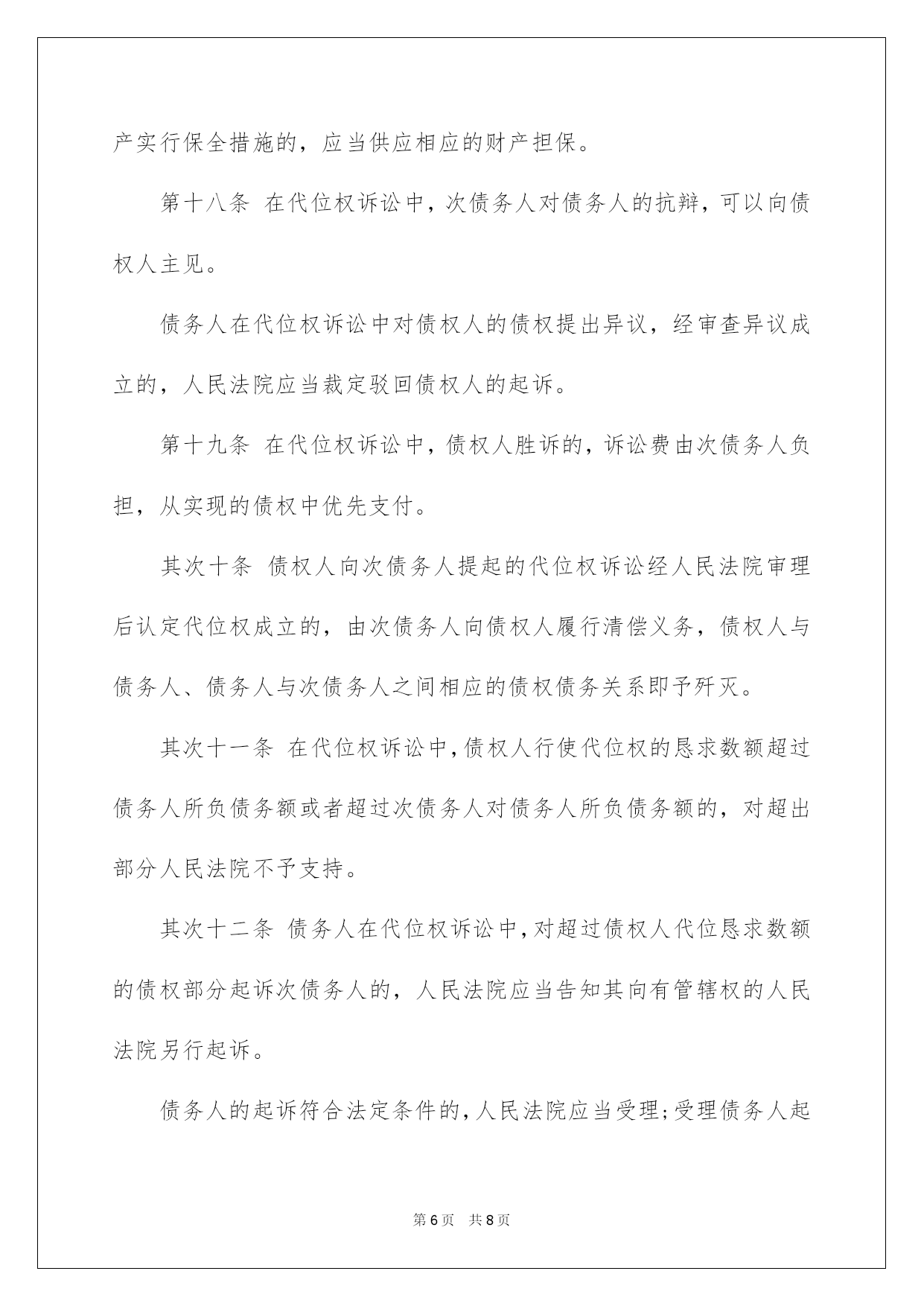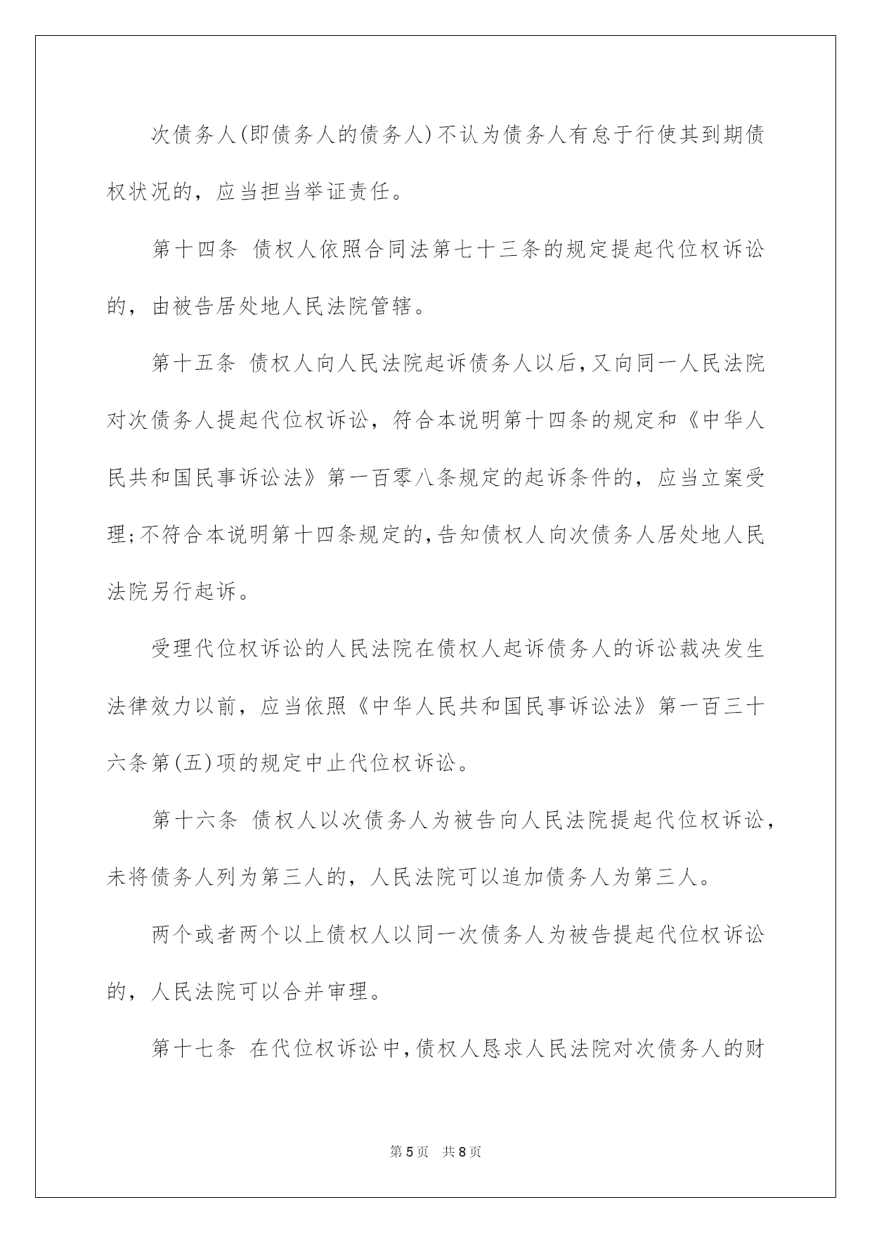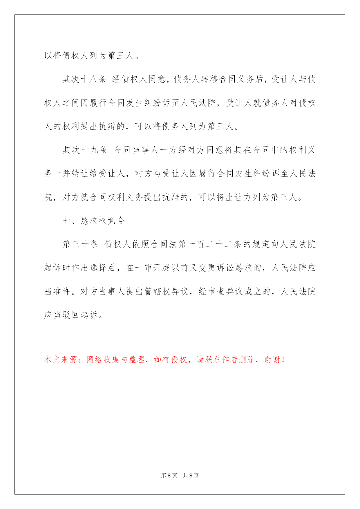 第PAGE\*Arabic\*MERGEFORMAT8页共NUMPAGES\*Arabic\*MERGEFORMAT8页第PAGE\*MERGEFORMAT8页共NUMPAGES\*MERGEFORMAT8页第PAGE\*MERGEFORMAT8页共NUMPAGES\*MERGEFORMAT8页第PAGE\*MERGEFORMAT8页共NUMPAGES\*MERGEFORMAT8页第PAGE\*MERGEFORMAT8页共NUMPAGES\*MERGEFORMAT8页第PAGE\*MERGEFORMAT8页共NUMPAGES\*MERGEFORMAT8页第PAGE\*MERGEFORMAT8页共NUMPAGES\*MERGEFORMAT8页第PAGE\*MERGEFORMAT8页共NUMPAGES\*MERGEFORMAT8页第PAGE\*MERGEFORMAT8页共NUMPAGES\*MERGEFORMAT8页第PAGE\*MERGEFORMAT8页共NUMPAGES\*MERGEFORMAT8页第PAGE\*MERGEFORMAT8页共NUMPAGES\*MERGEFORMAT8页2022合同法司法解释一合同法司法说明一最高人民法院关于适用《中华人民共和国合同法》若干问题的说明(一)已于1999年12月1日由最高人民法院审判委员会第1090次会议通过,现予公布,自1999年12月29日起施行。一九九九年十二月十九日最高人民法院关于适用《中华人民共和国合同法》若干问题的说明(一)(1999年12月1日最高人民法院审判委员会第1090次会议通过法释〔1999〕19号)为了正确审理合同纠纷案件,依据《中华人民共和国合同法》(以下简称合同法)的规定,对人民法院适用合同法的有关问题作出如下说明:一、法律适用范围第一条合同法实施以后成立的合同发生纠纷起诉到人民法院的,适用合同法的规定;合同法实施以前成立的合同发生纠纷起诉到人民法院的,除本说明另有规定的以外,适用当时的法律规定,当时没有法律规定的,可以适用合同法的有关规定。其次条合同成立于合同法实施之前,但合同约定的履行期限跨越合同法实施之日或者履行期限在合同法实施之后,因履行合同发生的纠纷,适用合同法第四章的有关规定。第三条人民法院确认合同效力时,对合同法实施以前成立的合同,适用当时的法律合同无效而适用合同法合同有效的,则适用合同法。第四条合同法实施以后,人民法院确认合同无效,应当以全国人大及其常委会制定的法律和国务院制定的行政法规为依据,不得以地方性法规、行政规章为依据。第五条人民法院对合同法实施以前已经作出终审裁决的案件进行再审,不适用合同法。二、诉讼时效第六条技术合同争议当事人的权利受到侵害的事实发生在合同法实施之前,自当事人知道或者应当知道其权利受到侵害之日起至合同法实施之日超过一年的,人民法院不予爱护;尚未超过一年的,其提起诉讼的时效期间为二年。第七条技术进出口合同争议当事人的权利受到侵害的事实发生在合同法实施之前,自当事人知道或者应当知道其权利受到侵害之日起至合同法施行之日超过二年的,人民法院不予爱护;尚未超过二年的,其提起诉讼的时效期间为四年。第八条合同法第五十五条规定的;一年;、第七十五条和第一百零四条其次款规定的;五年;为不变期间,不适用诉讼时效中止、中断或者延长的规定。三、合同效力第九条依照合同法第四十四条其次款的规定,法律、行政法规规定合同应当办理批准手续,或者办理批准、登记等手续才生效,在一审法庭辩论终结前当事人仍未办理批准手续的,或者仍未办理批准、登记等手续的,人民法院应当认定该合同未生效;法律、行政法规规定合同应当办理登记手续,但未规定登记后生效的,当事人未办理登记手续不影响合同的效力,合同标的物全部权及其他物权不能转移。合同法第七十七条其次款、第八十七条、第九十六条其次款所列合同变更、转让、解除等情形,依照前款规定处理。第十条当事人超越经营范围订立合同,人民法院不因此认定合同无效。但违反国家限制经营、特许经营以及法律、行政法规禁止经营规定的除外。四、代位权第十一条债权人依照合同法第七十三条的规定提起代位权诉讼,应当符合下列条件:(一)债权人对债务人的债权合法;(二)债务人怠于行使其到期债权,对债权人造成损害;(三)债务人的债权已到期;(四)债务人的债权不是专属于债务人自身的债权。第十二条合同法第七十三条第一款规定的专属于债务人自身的债权,是指基于扶养关系、抚养关系、赡养关系、继承关系产生的给付恳求权和劳动酬劳、退休金、养老金、抚恤金、安置费、人寿保险、人身损害赔偿恳求权等权利。第十三条合同法第七十三