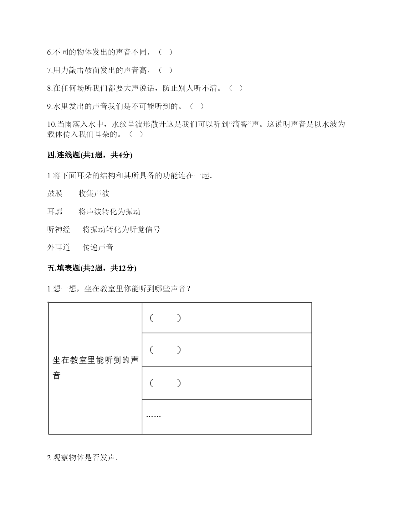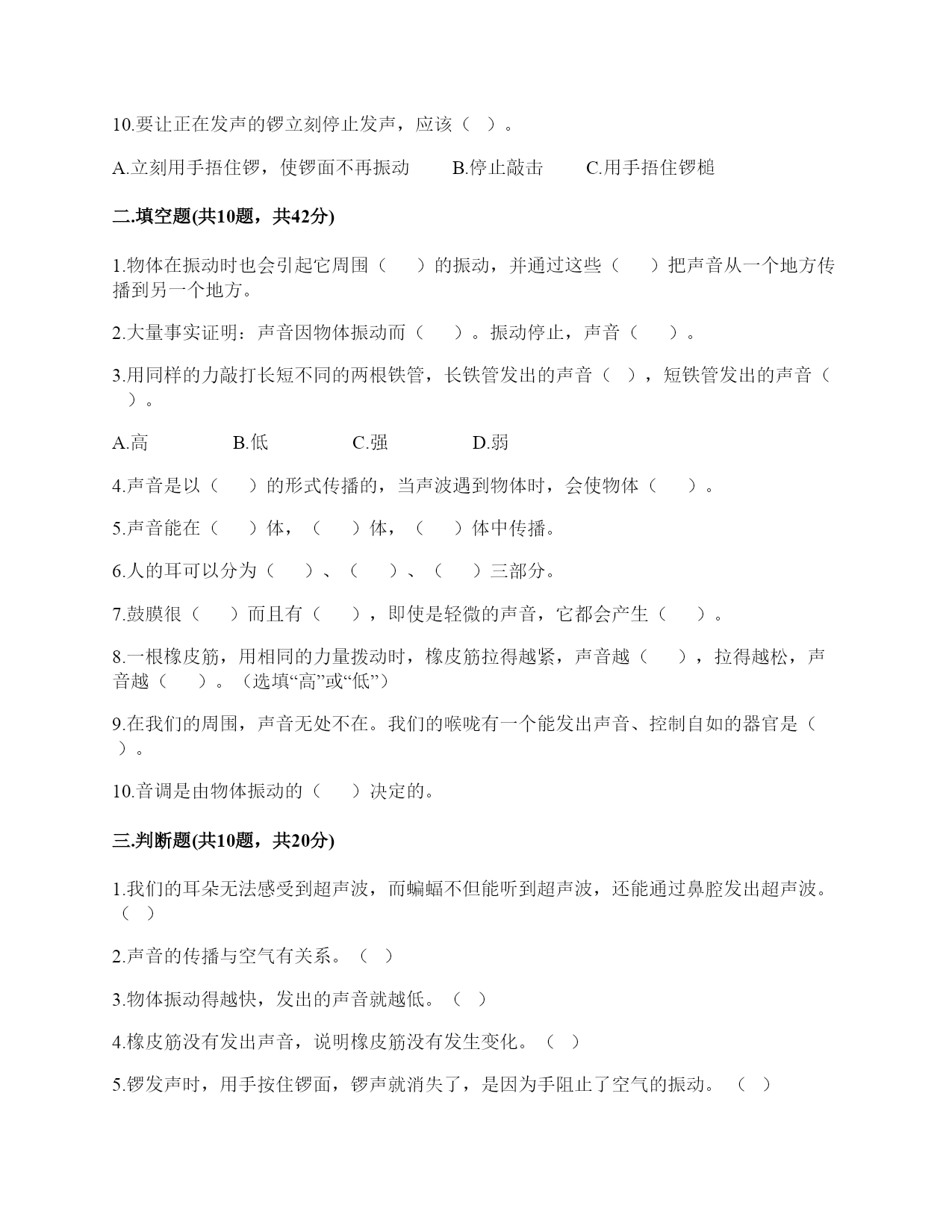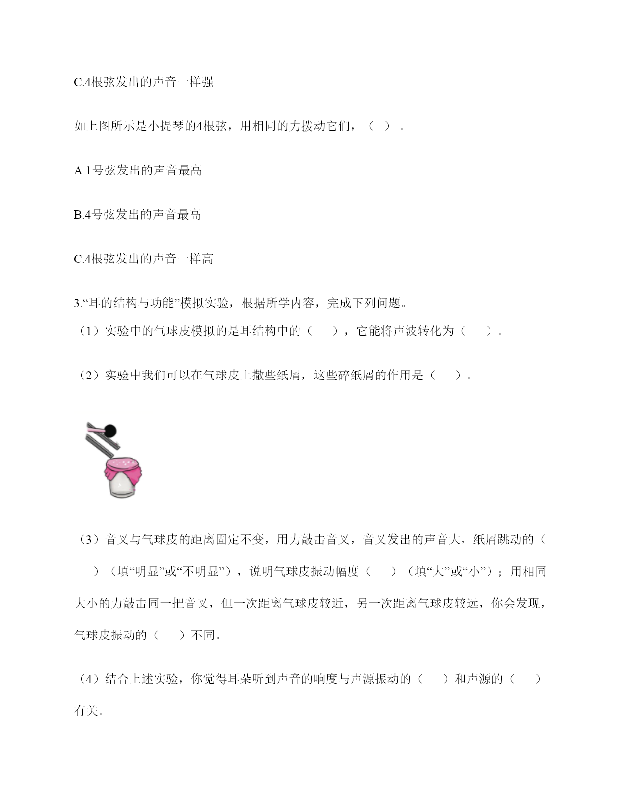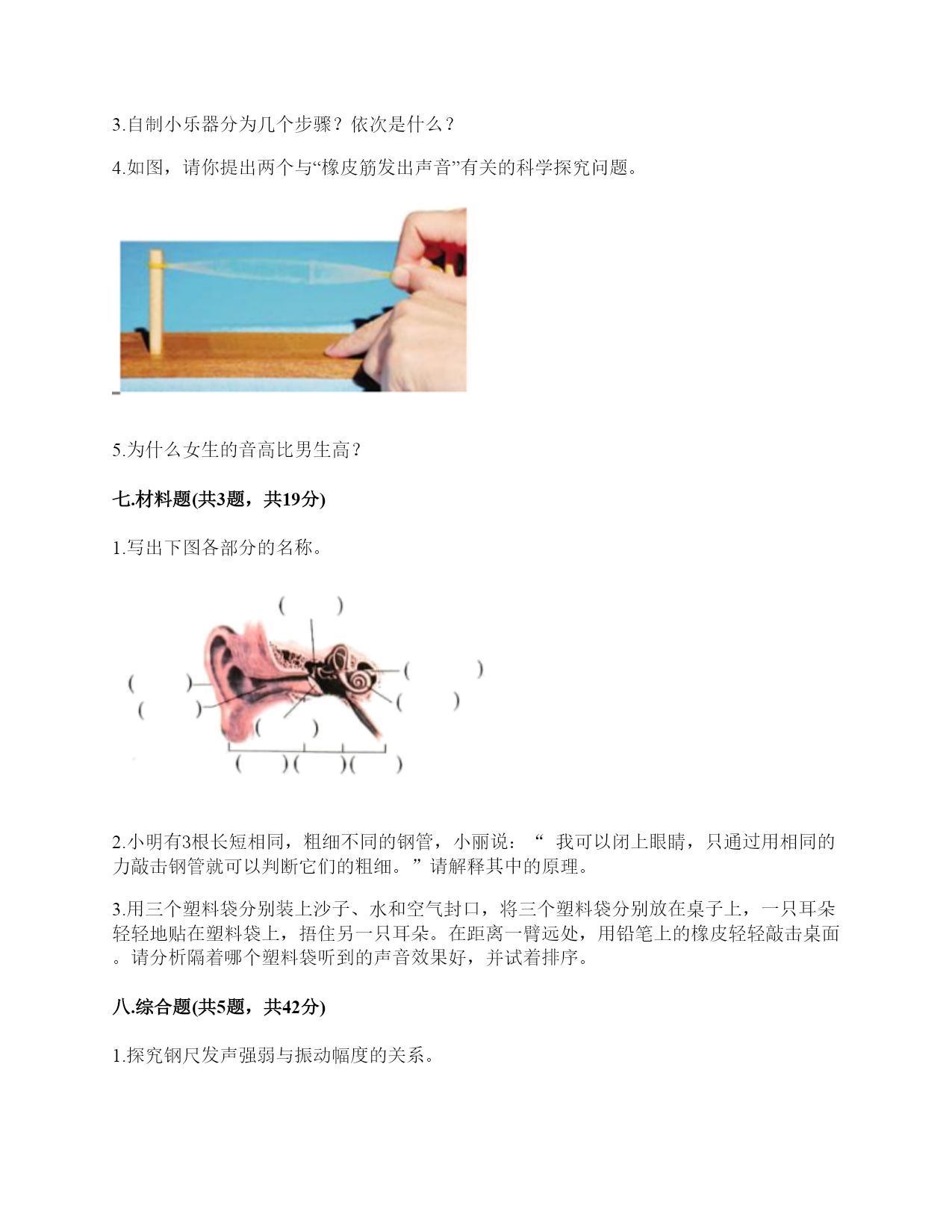 小学科学《声音》练习题一.选择题(共10题,共20分)1.下列对音高描述错误的是()。A.振动越快,声音越高B.振动幅度越小声音越弱C.长、松、粗的物体发出的声音低2.古琴是我国历史悠久的乐器,由7根长短相同、粗细不同的弦组成。小雅弹古琴时,要使它发出的声音更响一些,可以()。A.弹更粗的琴弦B.弹得更用力一些C.轻轻地弹3.用耳朵紧贴钢轨,可以听到很远的火车在铁路上行驶的声音,这个声音是通过()传到耳朵里的。A.空气B.地面C.钢轨4.我们耳朵里的()时时刻刻都在接受着各种声音并产生振动。A.鼓膜B.听小骨C.耳蜗D.听觉神经5.耳廓的作用是()。A.将声波转化为振动B.将听觉信号传递到大脑C.收集声音6.用击打过的音叉轻轻接触水面,水面会产生波纹,这说明音叉()了。A.变小B.变热C.振动7.要使小提琴发出的声音变高,应采取的办法是()。A.调松琴弦B.调紧琴弦C.增加部分弦线的长度8.往保温瓶里倒水的过程中,听声音就能判断壶里水位的高低,因为()。A.随着水位升高,音高逐渐升高B.随着水位升高,音高逐渐降低C.灌水过程中音高保持不变,声音越来越大9.用拨动的方法使钢尺发声的实验,下列做法中正确的是()。A.边做实验,边大声讨论B.不用分工合作,看着同学完成就可以了C.钢尺的一端要用力压住10.要让正在发声的锣立刻停止发声,应该()。A.立刻用手捂住锣,使锣面不再振动B.停止敲击C.用手捂住锣槌二.填空题(共10题,共42分)1.物体在振动时也会引起它周围()的振动,并通过这些()把声音从一个地方传播到另一个地方。2.大量事实证明:声音因物体振动而()。振动停止,声音()。3.用同样的力敲打长短不同的两根铁管,长铁管发出的声音(),短铁管发出的声音()。A.高B.低C.强D.弱4.声音是以()的形式传播的,当声波遇到物体时,会使物体()。5.声音能在()体,()体,()体中传播。6.人的耳可以分为()、()、()三部分。7.鼓膜很()而且有(),即使是轻微的声音,它都会产生()。8.一根橡皮筋,用相同的力量拨动时,橡皮筋拉得越紧,声音越(),拉得越松,声音越()。(选填“高”或“低”)9.在我们的周围,声音无处不在。我们的喉咙有一个能发出声音、控制自如的器官是()。10.音调是由物体振动的()决定的。三.判断题(共10题,共20分)1.我们的耳朵无法感受到超声波,而蝙蝠不但能听到超声波,还能通过鼻腔发出超声波。()2.声音的传播与空气有关系。()3.物体振动得越快,发出的声音就越低。()4.橡皮筋没有发出声音,说明橡皮筋没有发生变化。()5.锣发声时,用手按住锣面,锣声就消失了,是因为手阻止了空气的振动。()6.不同的物体发出的声音不同。()7.用力敲击鼓面发出的声音高。()8.在任何场所我们都要大声说话,防止别人听不清。()9.水里发出的声音我们是不可能听到的。()10.当雨落入水中,水纹呈波形散开这是我们可以听到“滴答”声。这说明声音是以水波为载体传入我们耳朵的。()四.连线题(共1题,共4分)1.将下面耳朵的结构和其所具备的功能连在一起。鼓膜收集声波耳廓将声波转化为振动听神经将振动转化为听觉信号外耳道传递声音五.填表题(共2题,共12分)1.想一想,坐在教室里你能听到哪些声音?2.观察物体是否发声。六.简答题(共5题,共25分)1.同根弦发出的声音高低变化的规律是什么?2.图中是一种常见的听诊器。人体内微弱声音为什么能清晰地传递到医生的耳朵中?3.自制小乐器分为几个步骤?依次是什么?4.如图,请你提出两个与“橡皮筋发出声音”有关的科学探究问题。5.为什么女生的音高比男生高?七.材料题(共3题,共19分)1.写出下图各部分的名称。2.小明有3根长短相同,粗细不同的钢管,小丽说:“我可以闭上眼睛,只通过用相同的力敲击钢管就可以判断它们的粗细。”请解释其中的原理。3.用三个塑料袋分别装上沙子、水和空气封口,将三个塑料袋分别放在桌子上,一只耳朵轻轻地贴在塑料袋上,捂住另一只耳朵。在距离一臂远处,用铅笔上的橡皮轻轻敲击桌面。请分析隔着哪个塑料袋听到的声音效果好,并试着排序。八.综合题(共5题,共42分)1.探究钢尺发声强弱与振动幅度的关系。如图所示,用钢尺做探究实验,把钢尺紧按在桌面上,一端伸出桌边约20厘米。保持钢尺伸出桌边的长度不变,用不同的力拨动,听声音的不同和观察钢尺振动的幅度的大小。实验发现:用力拨钢尺,钢尺振动的幅度(),发出的声音();轻轻拨动钢尺,钢尺振动的幅度(),发出的声音(),说明声音的强弱与()有关。2.看图回答问题。如图所示是小提琴的4根弦,用相同