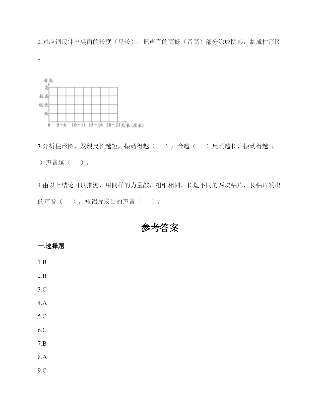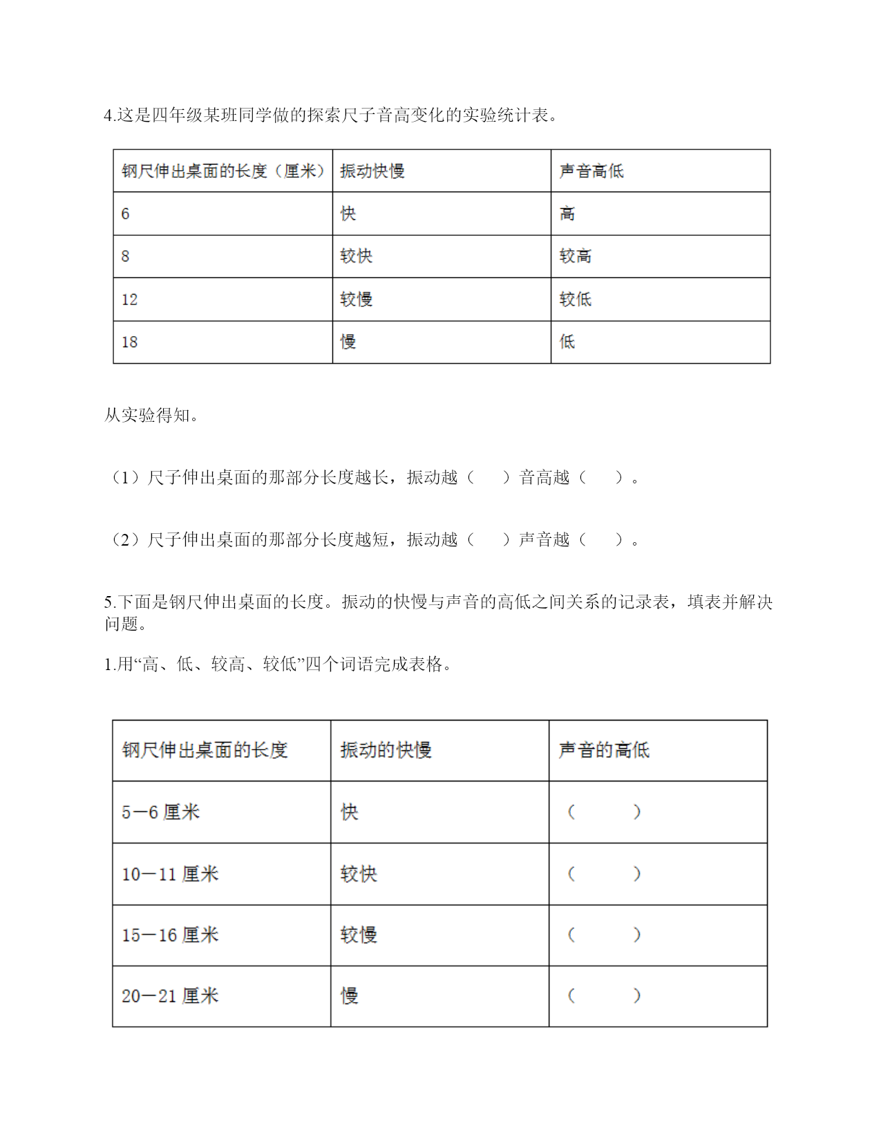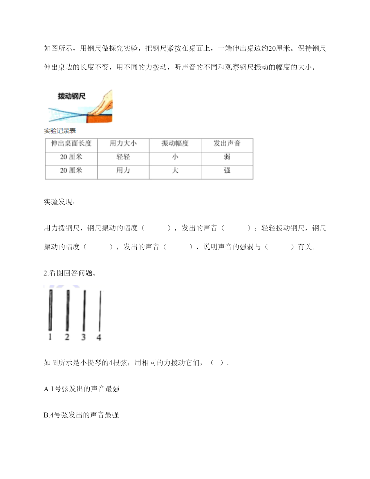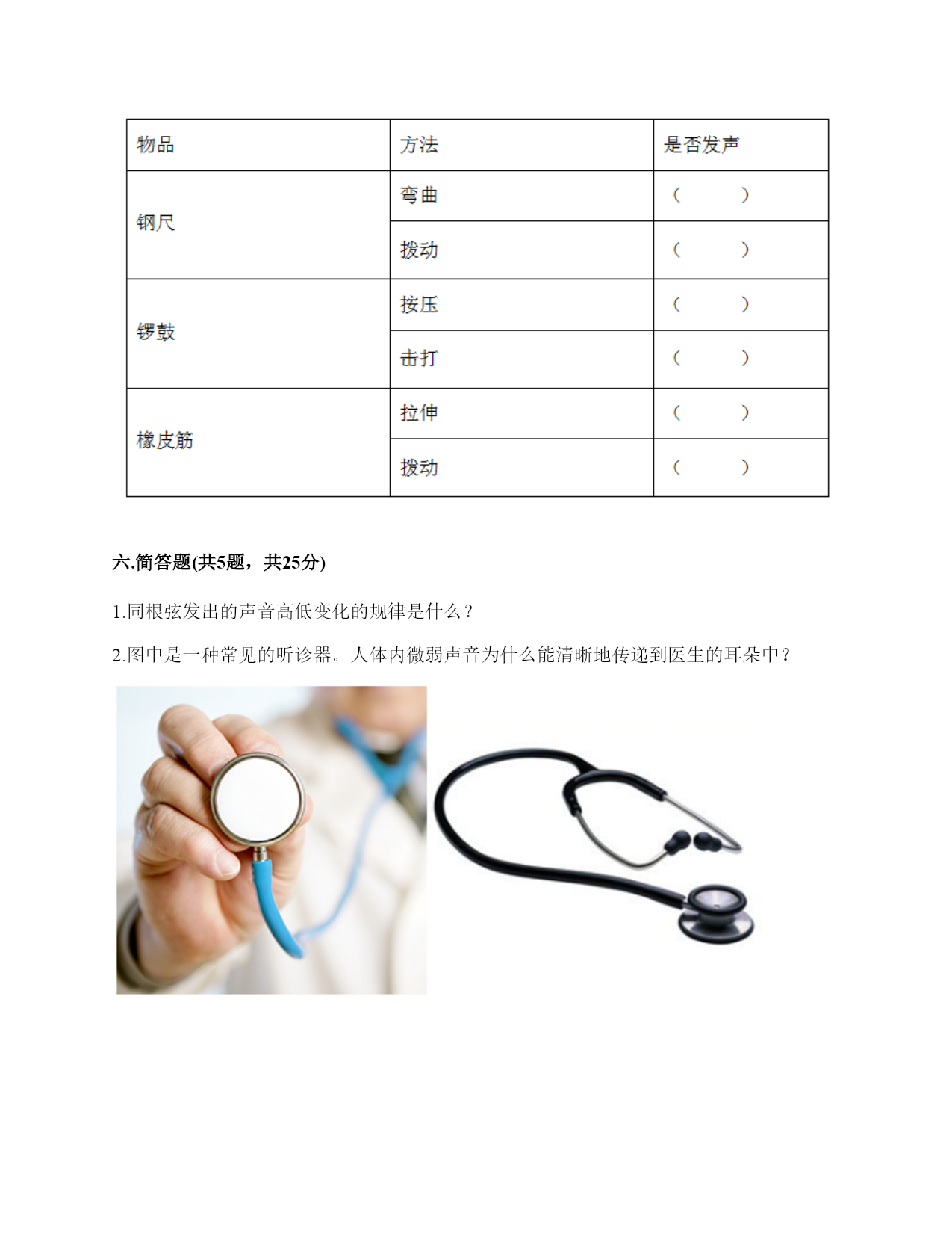 小学科学《声音》练习题一.选择题(共10题,共20分)1.下列对音高描述错误的是()。A.振动越快,声音越高B.振动幅度越小声音越弱C.长、松、粗的物体发出的声音低2.古琴是我国历史悠久的乐器,由7根长短相同、粗细不同的弦组成。小雅弹古琴时,要使它发出的声音更响一些,可以()。A.弹更粗的琴弦B.弹得更用力一些C.轻轻地弹3.用耳朵紧贴钢轨,可以听到很远的火车在铁路上行驶的声音,这个声音是通过()传到耳朵里的。A.空气B.地面C.钢轨4.我们耳朵里的()时时刻刻都在接受着各种声音并产生振动。A.鼓膜B.听小骨C.耳蜗D.听觉神经5.耳廓的作用是()。A.将声波转化为振动B.将听觉信号传递到大脑C.收集声音6.用击打过的音叉轻轻接触水面,水面会产生波纹,这说明音叉()了。A.变小B.变热C.振动7.要使小提琴发出的声音变高,应采取的办法是()。A.调松琴弦B.调紧琴弦C.增加部分弦线的长度8.往保温瓶里倒水的过程中,听声音就能判断壶里水位的高低,因为()。A.随着水位升高,音高逐渐升高B.随着水位升高,音高逐渐降低C.灌水过程中音高保持不变,声音越来越大9.用拨动的方法使钢尺发声的实验,下列做法中正确的是()。A.边做实验,边大声讨论B.不用分工合作,看着同学完成就可以了C.钢尺的一端要用力压住10.要让正在发声的锣立刻停止发声,应该()。A.立刻用手捂住锣,使锣面不再振动B.停止敲击C.用手捂住锣槌二.填空题(共10题,共42分)1.物体在振动时也会引起它周围()的振动,并通过这些()把声音从一个地方传播到另一个地方。2.大量事实证明:声音因物体振动而()。振动停止,声音()。3.用同样的力敲打长短不同的两根铁管,长铁管发出的声音(),短铁管发出的声音()。A.高B.低C.强D.弱4.声音是以()的形式传播的,当声波遇到物体时,会使物体()。5.声音能在()体,()体,()体中传播。6.人的耳可以分为()、()、()三部分。7.鼓膜很()而且有(),即使是轻微的声音,它都会产生()。8.一根橡皮筋,用相同的力量拨动时,橡皮筋拉得越紧,声音越(),拉得越松,声音越()。(选填“高”或“低”)9.在我们的周围,声音无处不在。我们的喉咙有一个能发出声音、控制自如的器官是()。10.音调是由物体振动的()决定的。三.判断题(共10题,共20分)1.我们的耳朵无法感受到超声波,而蝙蝠不但能听到超声波,还能通过鼻腔发出超声波。()2.声音的传播与空气有关系。()3.物体振动得越快,发出的声音就越低。()4.橡皮筋没有发出声音,说明橡皮筋没有发生变化。()5.锣发声时,用手按住锣面,锣声就消失了,是因为手阻止了空气的振动。()6.不同的物体发出的声音不同。()7.用力敲击鼓面发出的声音高。()8.在任何场所我们都要大声说话,防止别人听不清。()9.水里发出的声音我们是不可能听到的。()10.当雨落入水中,水纹呈波形散开这是我们可以听到“滴答”声。这说明声音是以水波为载体传入我们耳朵的。()四.连线题(共1题,共4分)1.将下面耳朵的结构和其所具备的功能连在一起。鼓膜收集声波耳廓将声波转化为振动听神经将振动转化为听觉信号外耳道传递声音五.填表题(共2题,共12分)1.想一想,坐在教室里你能听到哪些声音?2.观察物体是否发声。六.简答题(共5题,共25分)1.同根弦发出的声音高低变化的规律是什么?2.图中是一种常见的听诊器。人体内微弱声音为什么能清晰地传递到医生的耳朵中?3.自制小乐器分为几个步骤?依次是什么?4.如图,请你提出两个与“橡皮筋发出声音”有关的科学探究问题。5.为什么女生的音高比男生高?七.材料题(共3题,共19分)1.写出下图各部分的名称。2.小明有3根长短相同,粗细不同的钢管,小丽说:“我可以闭上眼睛,只通过用相同的力敲击钢管就可以判断它们的粗细。”请解释其中的原理。3.用三个塑料袋分别装上沙子、水和空气封口,将三个塑料袋分别放在桌子上,一只耳朵轻轻地贴在塑料袋上,捂住另一只耳朵。在距离一臂远处,用铅笔上的橡皮轻轻敲击桌面。请分析隔着哪个塑料袋听到的声音效果好,并试着排序。八.综合题(共5题,共42分)1.探究钢尺发声强弱与振动幅度的关系。如图所示,用钢尺做探究实验,把钢尺紧按在桌面上,一端伸出桌边约20厘米。保持钢尺伸出桌边的长度不变,用不同的力拨动,听声音的不同和观察钢尺振动的幅度的大小。实验发现:用力拨钢尺,钢尺振动的幅度(),发出的声音();轻轻拨动钢尺,钢尺振动的幅度(),发出的声音(),说明声音的强弱与()有关。2.看图回答问题。如图所示是小提琴的4根弦,用相同