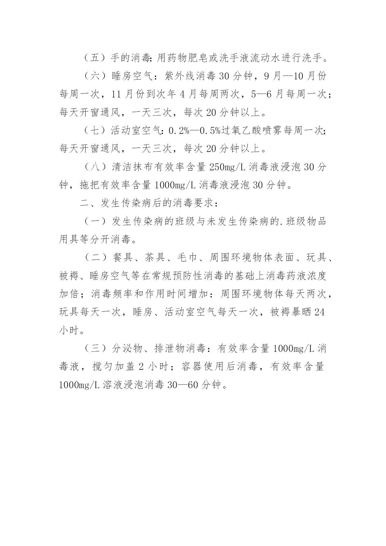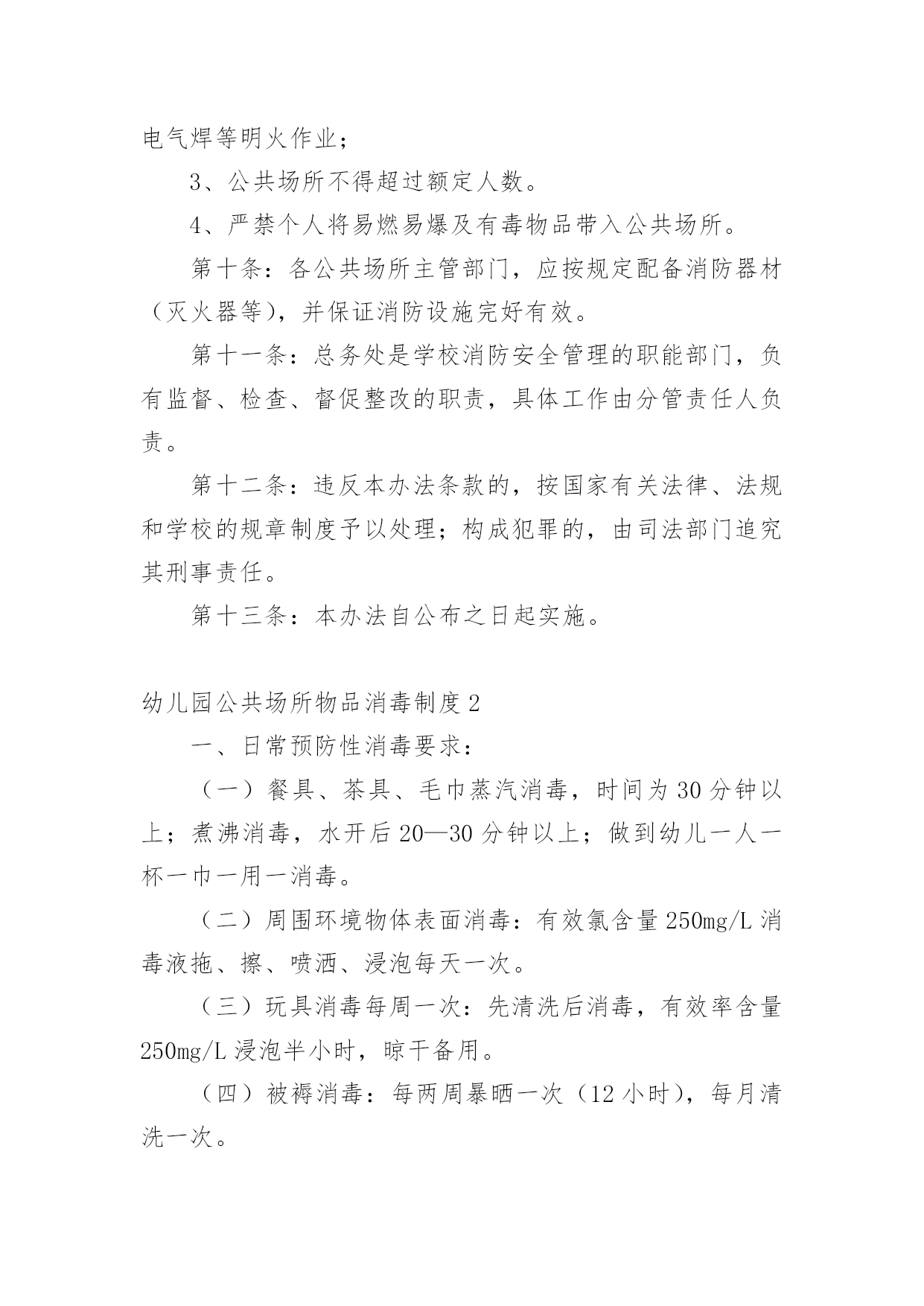 幼儿园公共场所物品消毒制度在当下社会,各种制度频频出现,制度是维护公平、公正的有效手段,是我们做事的底线要求。那么什么样的制度才是有效的呢?下面是小编为大家收集的幼儿园公共场所物品消毒制度,希望对大家有所帮助。幼儿园公共场所物品消毒制度1第一条:为了加强我校消防工作,保障公共安全,根据《中华人民共和国消防法》、《公安部61号令》及《消防安全管理规定》,结合我校具体情况,制定本办法。第二条:本办法所称的公共场所,系指供广大教职工、学生、家属集中学习、生活、娱乐的下列场所:1、室内体育馆、会议室等;2、教学大楼、图书馆、学生实验室以及30人以上的计算机房、多媒体教室、等;3、校内教职工、学生食堂、公共餐厅等;4、其它可供教工、学生、进行集中活动的场所。第三条:公共场所的主管部门的主要行政负责人是消防安全责任人,对所管辖的公共场所消防安全工作负责;要设立专职或兼职消防安全管理员;消防安全管理员的工作直接对本部门消防安全责任人负责。第四条:公共场所主管部门与其他单位、部门发生借用关系时,必须明确公共场所的消防安全职责,由使用者负主要责任,主管部门负连带责任。第五条:负责对公共场所进行建设及装修的单位应当将防火设计、装修图纸报学校及市公安消防监督机构进行审核,经审核同意后方可施工。工程竣工后,必须经学校及市公安消防监督机构验收合格方可使用。第六条:公共场所内部装修不得改变原有消防设施的位置,不得影响消防设施的使用。第七条:公共场所的安全疏散通道的宽度和距离,必须符合国家有关规定;1、消防安全通道出口处不得设置门槛,疏散门应向外开,不得采用卷帘门、转门,吊门和侧拉门,门口不得设置门帘,屏风等影响疏散的`遮挡物;2、公共场所在使用过程中,必须确保消防安全通道出口畅通无阻,严禁上锁、堵塞;3、消防安全出口,疏散通道和楼梯口必须设置符合国家标准的疏散指示标志灯;4、公共场所必须设置应急照明灯,照明供电时间不得少于20分钟。第八条:公共场所的电器设备必须由具有电工资格证的人员负责安装和定期检查维修,用电量不得超负荷、不得擅自改装。第九条:在公共场所范围内禁止下列行为:1、严禁存放易燃易爆、有毒及其它危险物品;2、使用期间严禁同时进行内部设备检修、施工和进行电气焊等明火作业;3、公共场所不得超过额定人数。4、严禁个人将易燃易爆及有毒物品带入公共场所。第十条:各公共场所主管部门,应按规定配备消防器材(灭火器等),并保证消防设施完好有效。第十一条:总务处是学校消防安全管理的职能部门,负有监督、检查、督促整改的职责,具体工作由分管责任人负责。第十二条:违反本办法条款的,按国家有关法律、法规和学校的规章制度予以处理;构成犯罪的,由司法部门追究其刑事责任。第十三条:本办法自公布之日起实施。幼儿园公共场所物品消毒制度2一、日常预防性消毒要求:(一)餐具、茶具、毛巾蒸汽消毒,时间为30分钟以上;煮沸消毒,水开后20—30分钟以上;做到幼儿一人一杯一巾一用一消毒。(二)周围环境物体表面消毒:有效氯含量250mg/L消毒液拖、擦、喷洒、浸泡每天一次。(三)玩具消毒每周一次:先清洗后消毒,有效率含量250mg/L浸泡半小时,晾干备用。(四)被褥消毒:每两周暴晒一次(12小时),每月清洗一次。(五)手的消毒:用药物肥皂或洗手液流动水进行洗手。(六)睡房空气:紫外线消毒30分钟,9月—10月份每周一次,11月份到次年4月每周两次,5—6月每周一次;每天开窗通风,一天三次,每次20分钟以上。(七)活动室空气:0.2%—0.5%过氧乙酸喷雾每周一次;每天开窗通风,一天三次,每次20分钟以上。(八)清洁抹布有效率含量250mg/L消毒液浸泡30分钟,拖把有效率含量1000mg/L消毒液浸泡30分钟。二、发生传染病后的消毒要求:(一)发生传染病的班级与未发生传染病的.班级物品用具等分开消毒。(二)餐具、茶具、毛巾、周围环境物体表面、玩具、被褥、睡房空气等在常规预防性消毒的基础上消毒药液浓度加倍;消毒频率和作用时间增加:周围环境物体每天两次,玩具每天一次,睡房、活动室空气每天一次,被褥暴晒24小时。(三)分泌物、排泄物消毒:有效率含量1000mg/L消毒液,搅匀加盖2小时;容器使用后消毒,有效率含量1000mg/L溶液浸泡消毒30—60分钟。