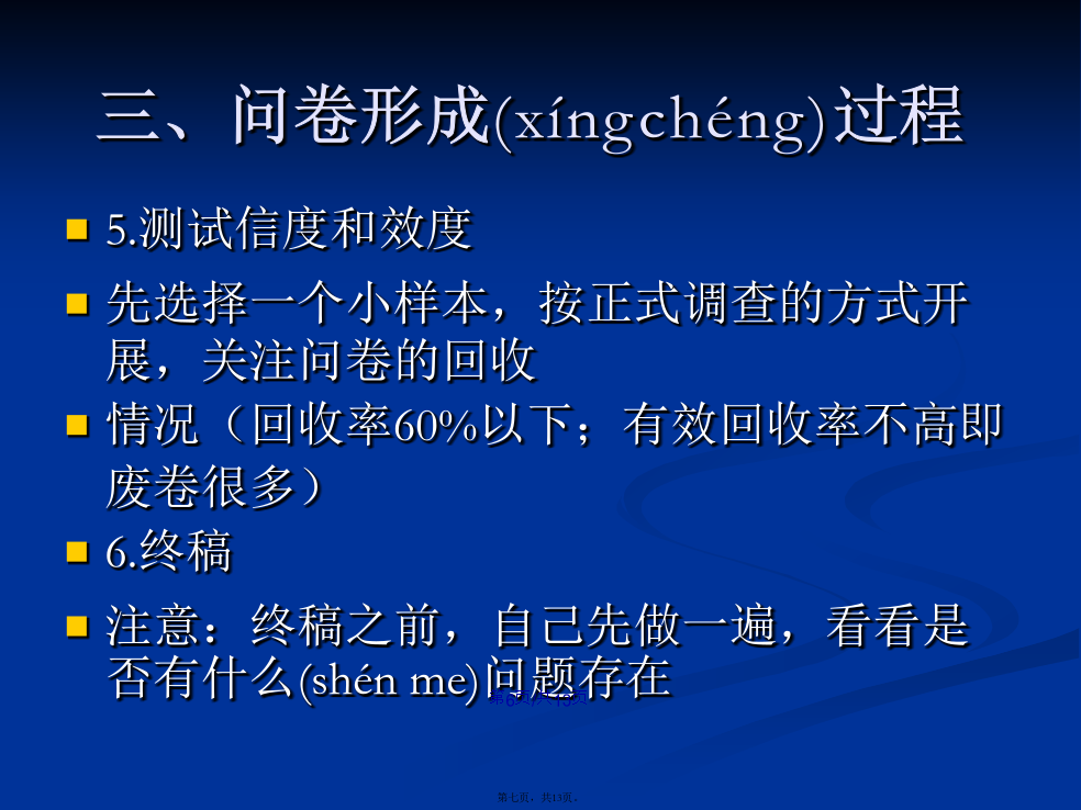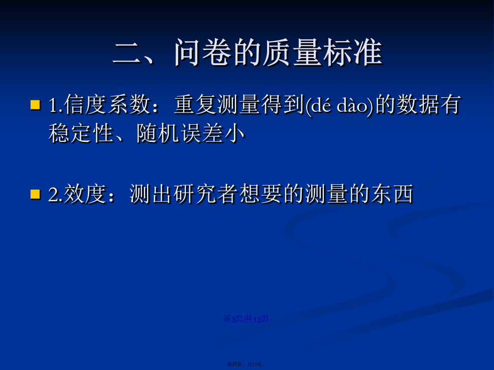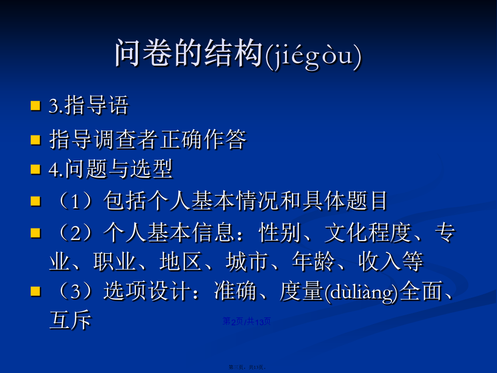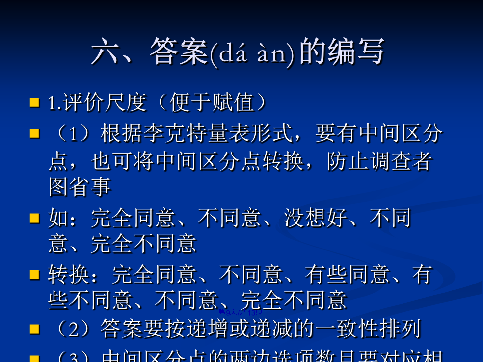 会计学一、问卷的结构(jiégòu)问卷的结构(jiégòu)二、问卷的质量标准三、问卷形成(xíngchéng)过程三、问卷形成(xíngchéng)过程三、问卷形成(xíngchéng)过程四、问卷的版面设计五、问题(wèntí)的编写六、答案(dáàn)的编写七、抽样七、抽样八、调查(diàochá)数据预处理