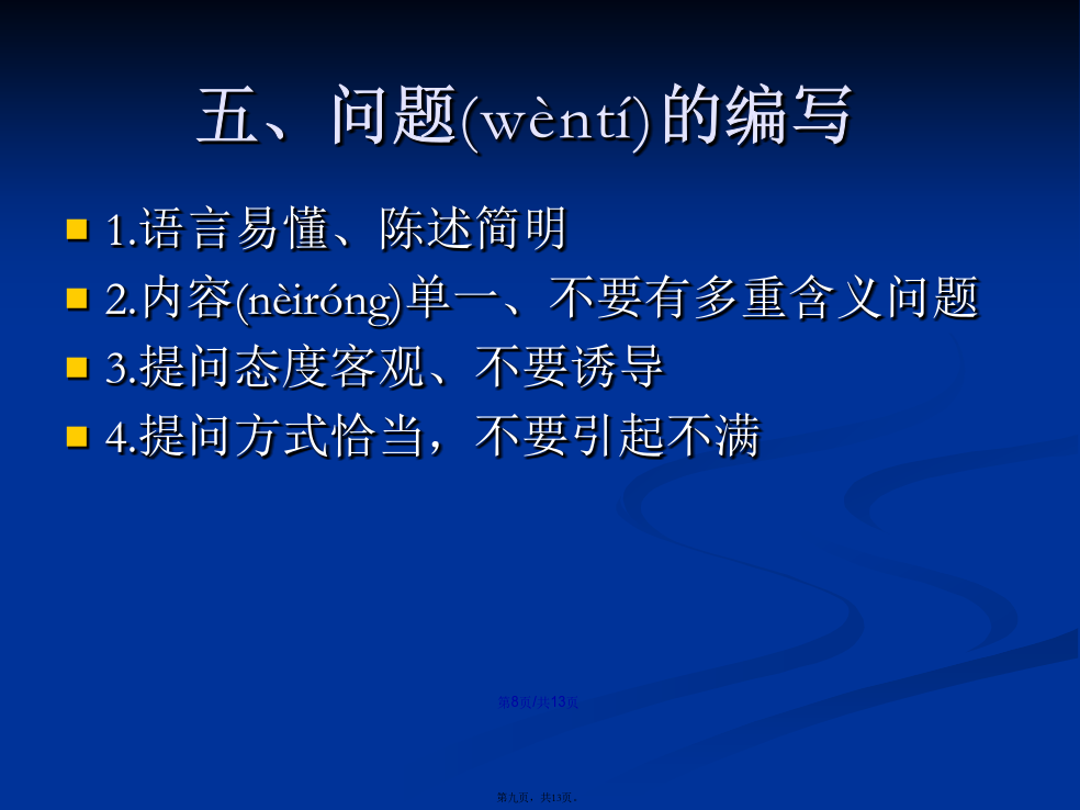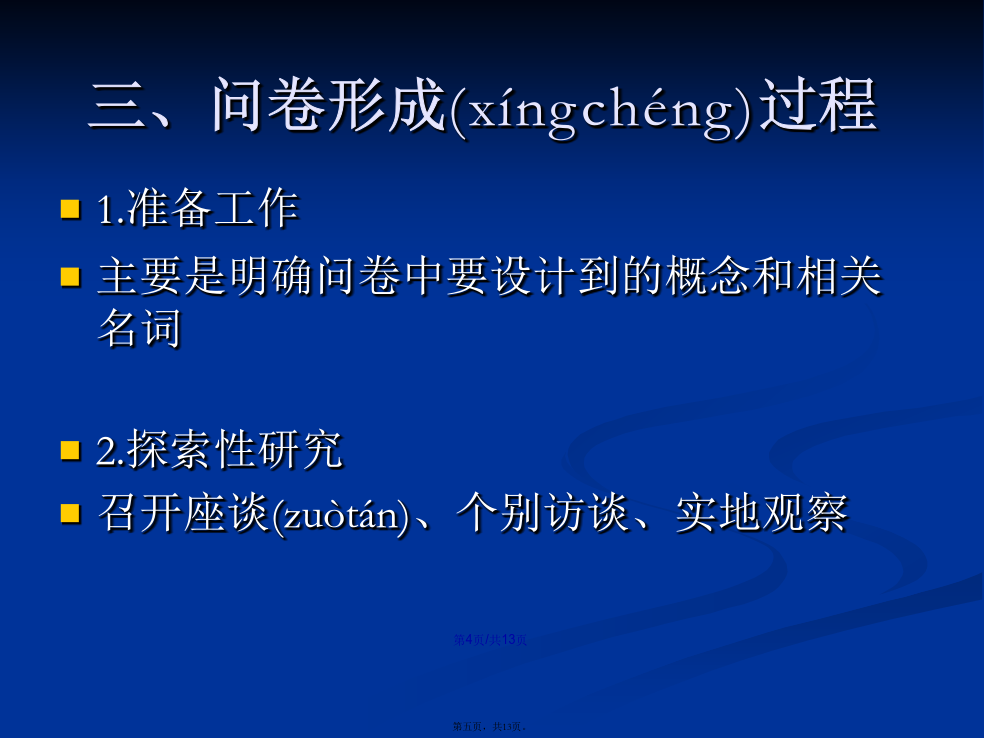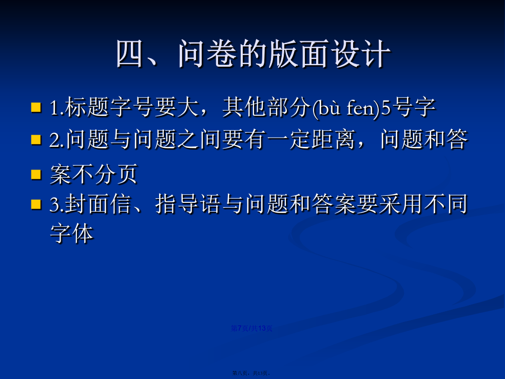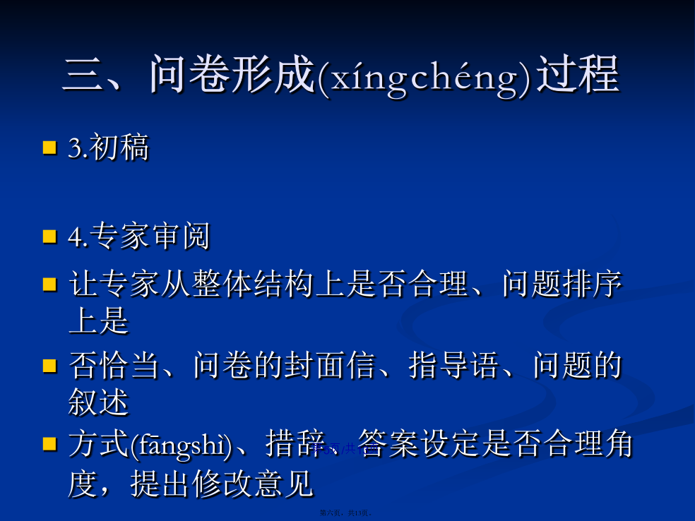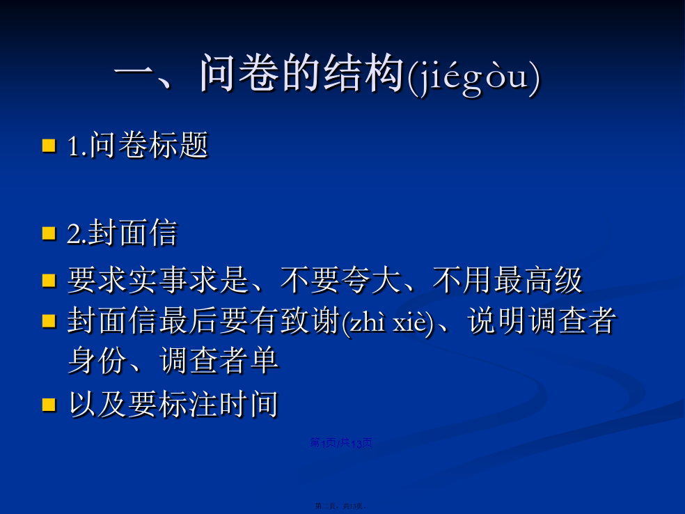 会计学一、问卷的结构(jiégòu)问卷的结构(jiégòu)二、问卷的质量标准三、问卷形成(xíngchéng)过程三、问卷形成(xíngchéng)过程三、问卷形成(xíngchéng)过程四、问卷的版面设计五、问题(wèntí)的编写六、答案(dáàn)的编写七、抽样七、抽样八、调查(diàochá)数据预处理