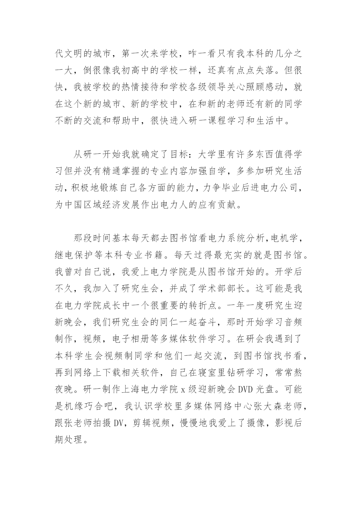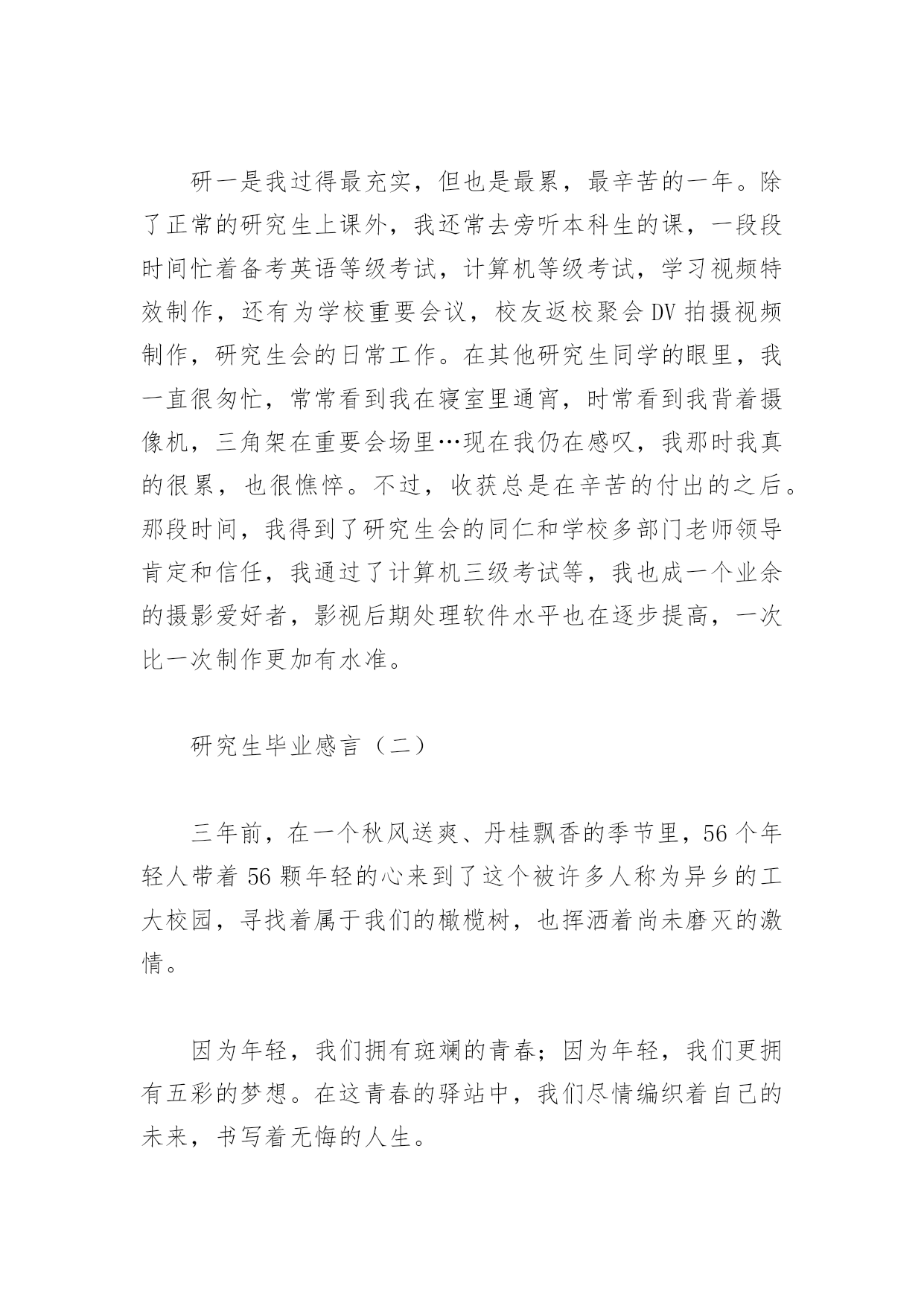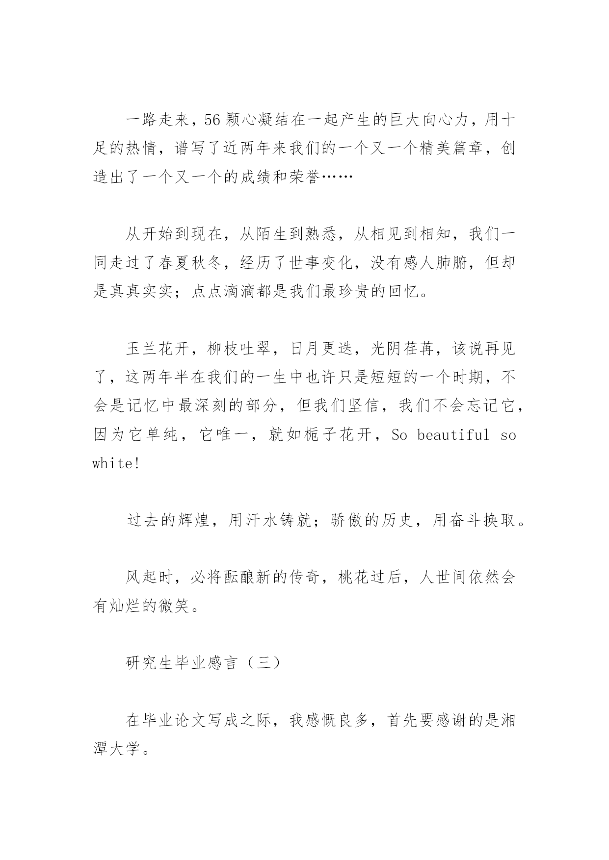 研究生毕业感言研究生毕业感言研究生毕业感言(一)研究生近三年时光转瞬即逝,在这近三年的道路上有成功也有失败,有欢笑也有泪水。曾经年少轻狂,曾经满面风霜。三年的研究生生活眼看就要结束了,心里隐隐有一种伤感,也一有种激动和憧憬的心情。从起点走到终点,又从终点回到起点,如果简单的“结束”二字可以概括一切,我只能细细地去体会这其中的深意与内涵。上海电力学院的研究生学习生活对我来说只有一次,它的绚丽和多彩是我们用一生的时间所不能更改和忘却的。回忆是每一件痛并快乐的事,驻足回眸三年来的求学之路,心中已是百感交集,感慨万千,几许苦涩,几许甘甜。四年前,我在考研复习大军中不懈的追求努力,终于在xx年9月使我顺利地进入了上海电力学院电力系统及其自动化专业。当我怀着继续进深造学习心态,也怀着对有悠久历史行业背景上海电力学院的敬意,第一次踏入了上海这座现代文明的城市,第一次来学校,咋一看只有我本科的几分之一大,倒很像我初高中的学校一样,还真有点点失落。但很快,我被学校的热情接待和学校各级领导关心照顾感动,就在这个新的城市、新的学校中,在和新的老师还有新的同学不断的交流和帮助中,很快进入研一课程学习和生活中。从研一开始我就确定了目标:大学里有许多东西值得学习但并没有精通掌握的专业内容加强自学,多参加研究生活动,积极地锻炼自己各方面的能力,力争毕业后进电力公司,为中国区域经济发展作出电力人的应有贡献。那段时间基本每天都去图书馆看电力系统分析,电机学,继电保护等本科专业书籍。每天过得最充实的就是图书馆。我曾对自己说,我爱上电力学院是从图书馆开始的。开学后不久,我加入了研究生会,并成了学术部部长。这可能是我在电力学院成长中一个很重要的转折点。一年一度研究生迎新晚会,我们研究生会的同仁一起奋斗,那时开始学习音频制作,视频,电子相册等多媒体软件学习。在研会我遇到了本科学生会视频制同学和他们一起交流,到图书馆找书看,再到网络上下载相关软件,自己在寝室里钻研学习,常常熬夜晚。研一制作上海电力学院x级迎新晚会DVD光盘。可能是机缘巧合吧,我认识学校里多媒体网络中心张大森老师,跟张老师拍摄DV,剪辑视频,慢慢地我爱上了摄像,影视后期处理。研一是我过得最充实,但也是最累,最辛苦的一年。除了正常的研究生上课外,我还常去旁听本科生的课,一段段时间忙着备考英语等级考试,计算机等级考试,学习视频特效制作,还有为学校重要会议,校友返校聚会DV拍摄视频制作,研究生会的日常工作。在其他研究生同学的眼里,我一直很匆忙,常常看到我在寝室里通宵,时常看到我背着摄像机,三角架在重要会场里…现在我仍在感叹,我那时我真的很累,也很憔悴。不过,收获总是在辛苦的付出的之后。那段时间,我得到了研究生会的同仁和学校多部门老师领导肯定和信任,我通过了计算机三级考试等,我也成一个业余的摄影爱好者,影视后期处理软件水平也在逐步提高,一次比一次制作更加有水准。研究生毕业感言(二)三年前,在一个秋风送爽、丹桂飘香的季节里,56个年轻人带着56颗年轻的心来到了这个被许多人称为异乡的工大校园,寻找着属于我们的橄榄树,也挥洒着尚未磨灭的激情。因为年轻,我们拥有斑斓的青春;因为年轻,我们更拥有五彩的梦想。在这青春的驿站中,我们尽情编织着自己的未来,书写着无悔的人生。一路走来,56颗心凝结在一起产生的巨大向心力,用十足的热情,谱写了近两年来我们的一个又一个精美篇章,创造出了一个又一个的成绩和荣誉……从开始到现在,从陌生到熟悉,从相见到相知,我们一同走过了春夏秋冬,经历了世事变化,没有感人肺腑,但却是真真实实;点点滴滴都是我们最珍贵的回忆。玉兰花开,柳枝吐翠,日月更迭,光阴荏苒,该说再见了,这两年半在我们的一生中也许只是短短的一个时期,不会是记忆中最深刻的部分,但我们坚信,我们不会忘记它,因为它单纯,它唯一,就如栀子花开,Sobeautifulsowhite!过去的辉煌,用汗水铸就;骄傲的历史,用奋斗换取。风起时,必将酝酿新的传奇,桃花过后,人世间依然会有灿烂的微笑。研究生毕业感言(三)在毕业论文写成之际,我感慨良多,首先要感谢的是湘潭大学。在攻读硕士研究生之前,我本是一名普通山村的穷“教书匠”。“教书匠”这个称号,并不代表着我对教师职业的.不敬,因为,它是人家送给我的,不是自封的。不过,以我亲身的经历,我觉得这个称呼是有部分道理的。我在初中任政史科主任,年年负责全校的中考工作,最多的时候,带了九个班级,五个课头,七、八、九年级的历史和七、八年级的政治。学校的“重点班”、“毕业班”大都由我来带。情况经常是这样,同样的一堂课,一个星期要重复讲四次,然后年年重复,课本不用说全都背得出,连页码都记得清楚。匠人做事就是简单的重复,我也如此。一晃教了六年,嗓子坏了,脾气坏了,毫无新鲜感的上课让我身心俱疲,几个要好的朋友也“怂恿”我