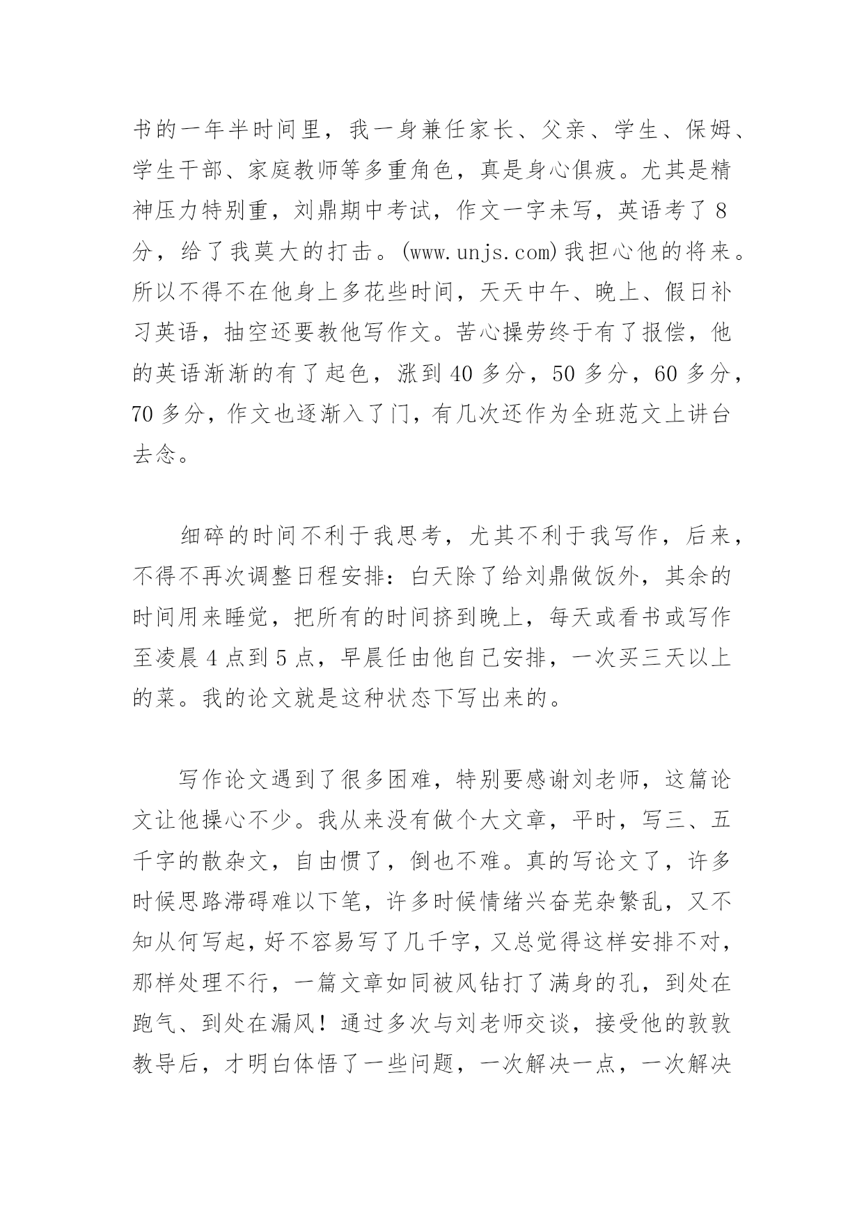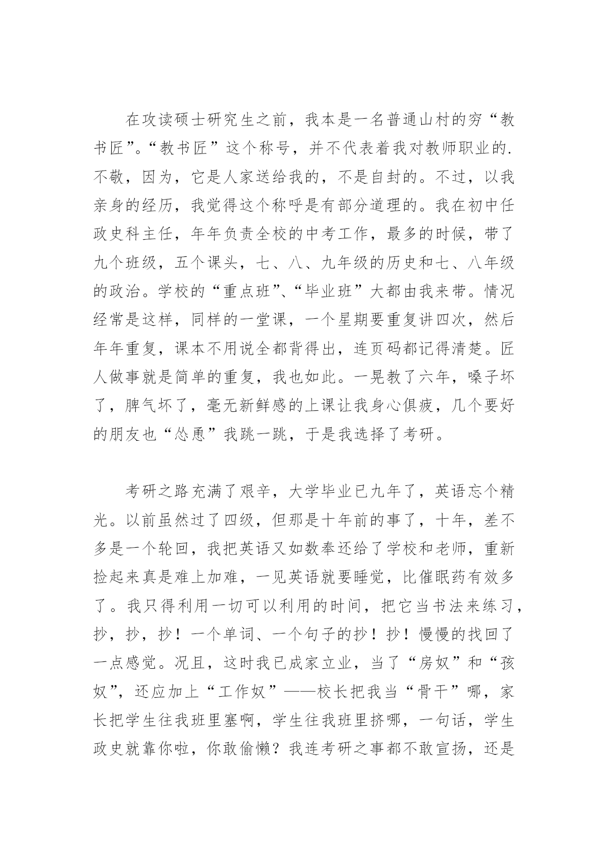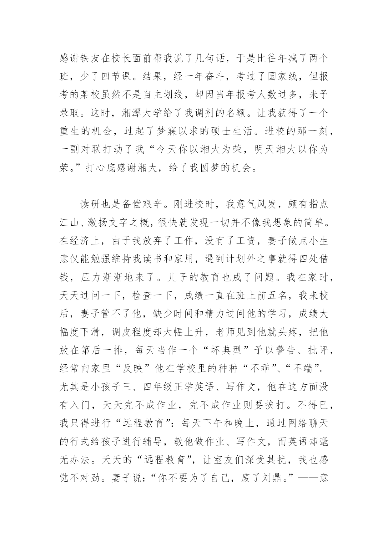 研究生毕业感言研究生毕业感言研究生毕业感言(一)研究生近三年时光转瞬即逝,在这近三年的道路上有成功也有失败,有欢笑也有泪水。曾经年少轻狂,曾经满面风霜。三年的研究生生活眼看就要结束了,心里隐隐有一种伤感,也一有种激动和憧憬的心情。从起点走到终点,又从终点回到起点,如果简单的“结束”二字可以概括一切,我只能细细地去体会这其中的深意与内涵。上海电力学院的研究生学习生活对我来说只有一次,它的绚丽和多彩是我们用一生的时间所不能更改和忘却的。回忆是每一件痛并快乐的事,驻足回眸三年来的求学之路,心中已是百感交集,感慨万千,几许苦涩,几许甘甜。四年前,我在考研复习大军中不懈的追求努力,终于在xx年9月使我顺利地进入了上海电力学院电力系统及其自动化专业。当我怀着继续进深造学习心态,也怀着对有悠久历史行业背景上海电力学院的敬意,第一次踏入了上海这座现代文明的城市,第一次来学校,咋一看只有我本科的几分之一大,倒很像我初高中的学校一样,还真有点点失落。但很快,我被学校的热情接待和学校各级领导关心照顾感动,就在这个新的城市、新的学校中,在和新的老师还有新的同学不断的交流和帮助中,很快进入研一课程学习和生活中。从研一开始我就确定了目标:大学里有许多东西值得学习但并没有精通掌握的专业内容加强自学,多参加研究生活动,积极地锻炼自己各方面的能力,力争毕业后进电力公司,为中国区域经济发展作出电力人的应有贡献。那段时间基本每天都去图书馆看电力系统分析,电机学,继电保护等本科专业书籍。每天过得最充实的就是图书馆。我曾对自己说,我爱上电力学院是从图书馆开始的。开学后不久,我加入了研究生会,并成了学术部部长。这可能是我在电力学院成长中一个很重要的转折点。一年一度研究生迎新晚会,我们研究生会的同仁一起奋斗,那时开始学习音频制作,视频,电子相册等多媒体软件学习。在研会我遇到了本科学生会视频制同学和他们一起交流,到图书馆找书看,再到网络上下载相关软件,自己在寝室里钻研学习,常常熬夜晚。研一制作上海电力学院x级迎新晚会DVD光盘。可能是机缘巧合吧,我认识学校里多媒体网络中心张大森老师,跟张老师拍摄DV,剪辑视频,慢慢地我爱上了摄像,影视后期处理。研一是我过得最充实,但也是最累,最辛苦的一年。除了正常的研究生上课外,我还常去旁听本科生的课,一段段时间忙着备考英语等级考试,计算机等级考试,学习视频特效制作,还有为学校重要会议,校友返校聚会DV拍摄视频制作,研究生会的日常工作。在其他研究生同学的眼里,我一直很匆忙,常常看到我在寝室里通宵,时常看到我背着摄像机,三角架在重要会场里…现在我仍在感叹,我那时我真的很累,也很憔悴。不过,收获总是在辛苦的付出的之后。那段时间,我得到了研究生会的同仁和学校多部门老师领导肯定和信任,我通过了计算机三级考试等,我也成一个业余的摄影爱好者,影视后期处理软件水平也在逐步提高,一次比一次制作更加有水准。研究生毕业感言(二)三年前,在一个秋风送爽、丹桂飘香的季节里,56个年轻人带着56颗年轻的心来到了这个被许多人称为异乡的工大校园,寻找着属于我们的橄榄树,也挥洒着尚未磨灭的激情。因为年轻,我们拥有斑斓的青春;因为年轻,我们更拥有五彩的梦想。在这青春的驿站中,我们尽情编织着自己的未来,书写着无悔的人生。一路走来,56颗心凝结在一起产生的巨大向心力,用十足的热情,谱写了近两年来我们的一个又一个精美篇章,创造出了一个又一个的成绩和荣誉……从开始到现在,从陌生到熟悉,从相见到相知,我们一同走过了春夏秋冬,经历了世事变化,没有感人肺腑,但却是真真实实;点点滴滴都是我们最珍贵的回忆。玉兰花开,柳枝吐翠,日月更迭,光阴荏苒,该说再见了,这两年半在我们的一生中也许只是短短的一个时期,不会是记忆中最深刻的部分,但我们坚信,我们不会忘记它,因为它单纯,它唯一,就如栀子花开,Sobeautifulsowhite!过去的辉煌,用汗水铸就;骄傲的历史,用奋斗换取。风起时,必将酝酿新的传奇,桃花过后,人世间依然会有灿烂的微笑。研究生毕业感言(三)在毕业论文写成之际,我感慨良多,首先要感谢的是湘潭大学。在攻读硕士研究生之前,我本是一名普通山村的穷“教书匠”。“教书匠”这个称号,并不代表着我对教师职业的.不敬,因为,它是人家送给我的,不是自封的。不过,以我亲身的经历,我觉得这个称呼是有部分道理的。我在初中任政史科主任,年年负责全校的中考工作,最多的时候,带了九个班级,五个课头,七、八、九年级的历史和七、八年级的政治。学校的“重点班”、“毕业班”大都由我来带。情况经常是这样,同样的一堂课,一个星期要重复讲四次,然后年年重复,课本不用说全都背得出,连页码都记得清楚。匠人做事就是简单的重复,我也如此。一晃教了六年,嗓子坏了,脾气坏了,毫无新鲜感的上课让我身心俱疲,几个要好的朋友也“怂恿”我