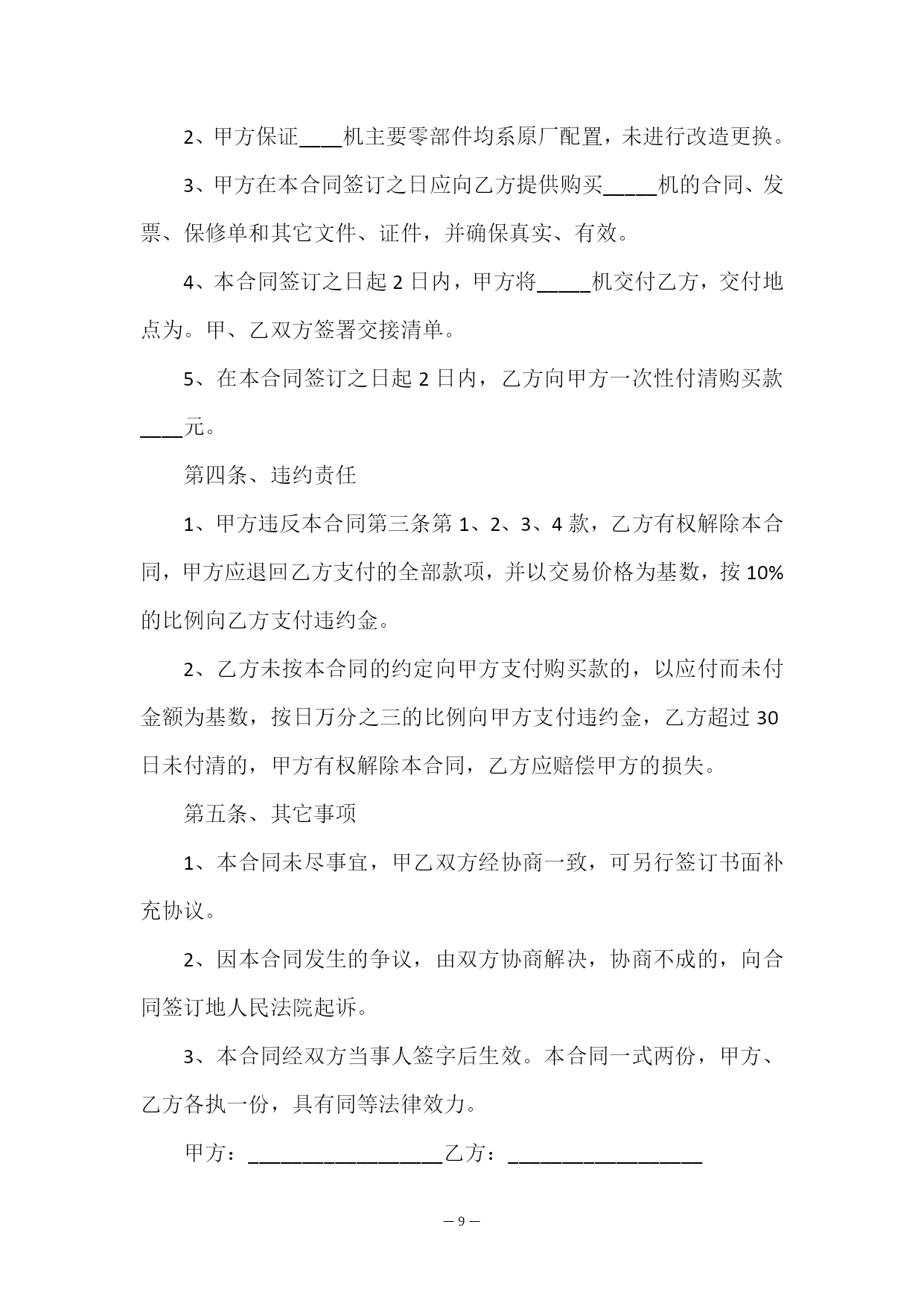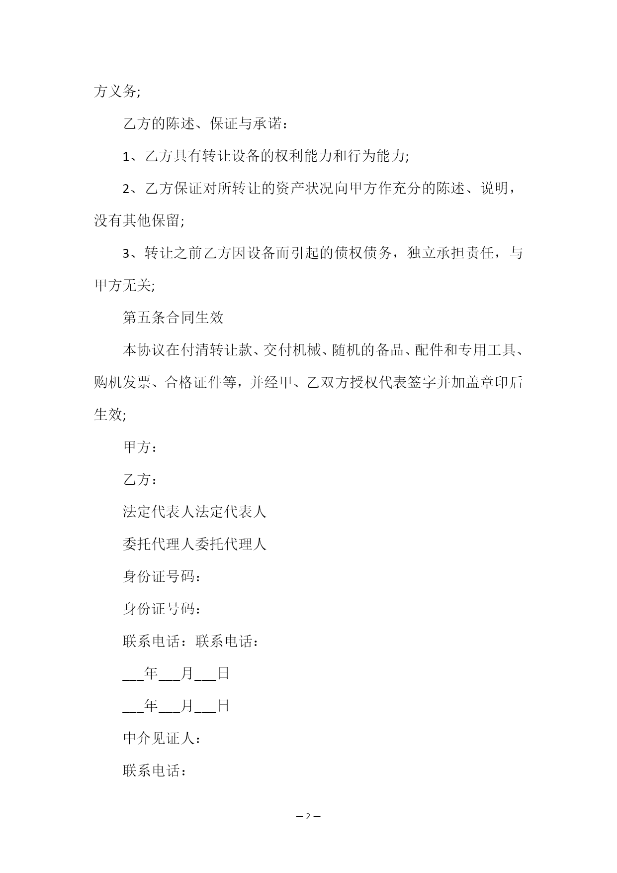 —PAGE\*MERGEFORMAT10—机械买卖转让合同机械买卖转让合同1受让方:转让方:为实现生产经营需要,甲方拟定收购乙方拥有机械设备,经甲乙双方协商一致,特签订本协议:第一条设备名称、规格、数量、价格乙方转让给甲方的设备装载机,该设备型号,经双方约定价格为元;第二条付款方式:一次性付清第三条设备交付时间在收到甲方支付款后1个工作日内,乙方将机器等设备交付给甲方。第四条陈述保证承诺:甲方的陈述、保证与承诺:1、甲方具有受让设备转让的权利能力和行为能力;3、甲方受让乙方的设备,已按公司章程规定召开股东会并作出同意受让决议;4、甲方对乙方转让的设备作了充分了解,并同意在该状况下受让;5、甲方保证有能力支付全部转让价款,并执行本协议规定的甲方义务;乙方的陈述、保证与承诺:1、乙方具有转让设备的权利能力和行为能力;2、乙方保证对所转让的资产状况向甲方作充分的陈述、说明,没有其他保留;3、转让之前乙方因设备而引起的债权债务,独立承担责任,与甲方无关;第五条合同生效本协议在付清转让款、交付机械、随机的备品、配件和专用工具、购机发票、合格证件等,并经甲、乙双方授权代表签字并加盖章印后生效;甲方:乙方:法定代表人法定代表人委托代理人委托代理人身份证号码:身份证号码:联系电话:联系电话:___年___月___日___年___月___日中介见证人:联系电话:法定代表人身份证号码:日期:___年___月___日机械买卖转让合同2出卖方:______________________法定代表人:________________________地址:______________________________联系电话:__________________________买受方:______________________法定代表人:________________________地址:______________________________联系电话:__________________________经平等友好协商,甲乙双方就甲方所有的________机械让给乙方一事达成一致协议如下:一、________机械/工程机械概况品牌:________________型号:________________车辆识别代号:________________二、转让价格:________________元三、付款方式:________________________________。四、甲方承诺对上述________享有合法的完全的所有权,乙方基于该承诺购买上述________机械。如因第三人向乙方主张________机械的所有权或他物权导致乙方经济损失的,乙方有权向甲方追偿。五、________机械现状已由双方确认。因该________机械系二手旧机,甲方对于________机械的运行状况及工作状况均向乙方作了充分的说明,乙方对于该________机械的现状以及日后运行可能出现的问题均已了解。六、________机械由甲方于_____年____月____日,在______________交付给乙方,乙方采取现场验收的方式进行验收,乙方对________机械的运行状况及设备数量、质量有任何不符合双方在本协议中的说明及约定的,应当场以书面形式交由甲方确认并由双方协商解决,交付后即视为验收合格。风险告知:因标的物质量不符合质量要求,致使不能实现协议目的的,买受人可以拒绝接受标的'物或者解除协议。买受人拒绝接受标的物或者解除协议的,标的物毁损、灭失的风险由出卖人承担。故在产品验收的时候要谨慎。七、________机械交付后,因该________机械的运输、运行所产生的任何责任均由乙方承担,包括________机械本身的故障、质量问题产生的损失以及对第三人的侵权所产生的损失,交付后所造成的一切事故和违法事故责任均全部由乙方承担,甲方不承担相应的法律责任。八、如甲方在________机械交付后承担了上述责任,甲方有权向乙方追偿。九、因履行________机械所产生的任何争议,由甲方住所地法院管辖。风险告知:关于争议解决方式的约定,可以选择到有管辖权法院诉讼或者选择仲裁,二者的本质区别是若约定仲裁解决仲裁一裁终局,约定向法院提起诉讼两审终审。十、本________机械转让协议自签订之日起,双方签字生效,一式两份,甲乙双方各持一份。买受方:___________________出卖方:___________________法定代表人:_____________法定代表人:____________________年_____月_____日