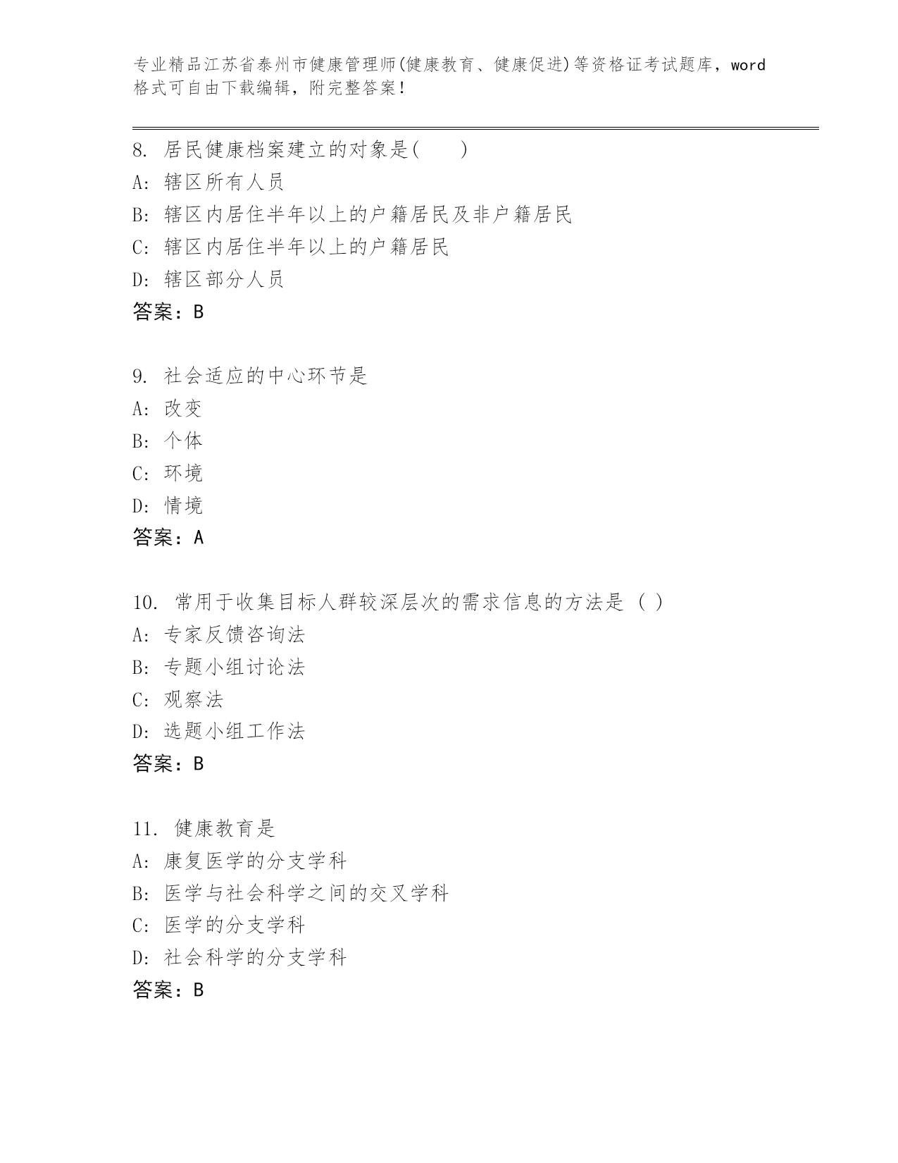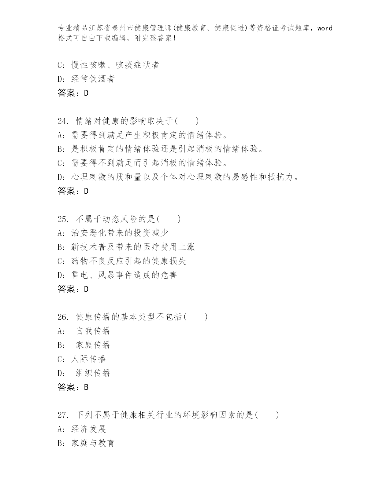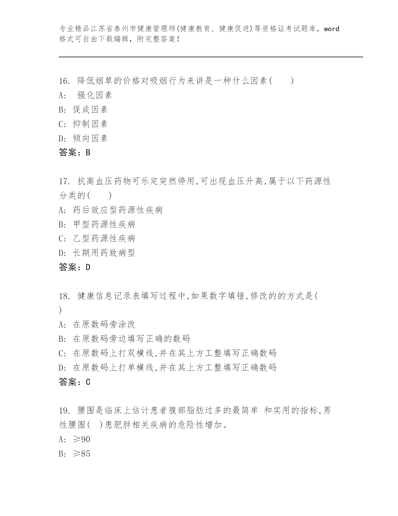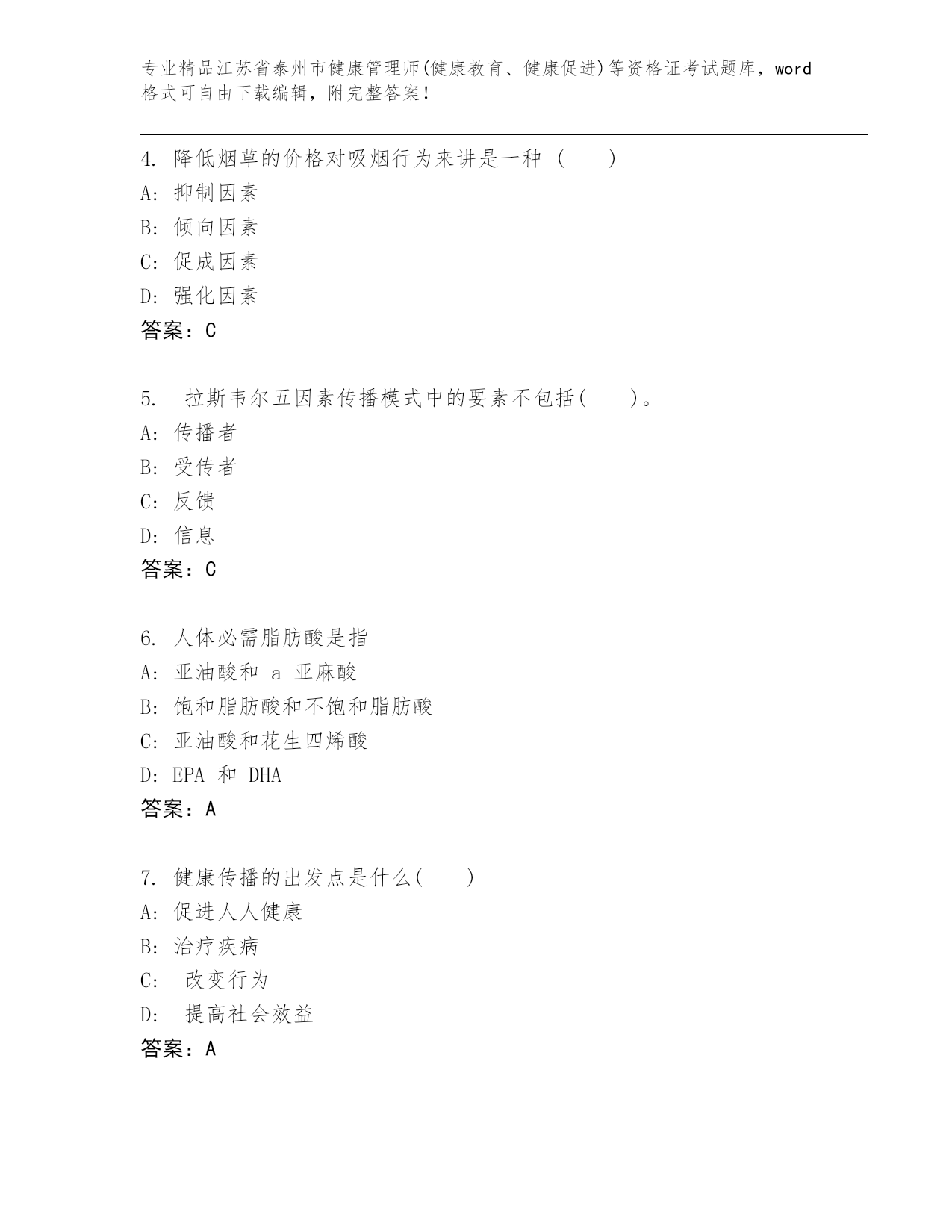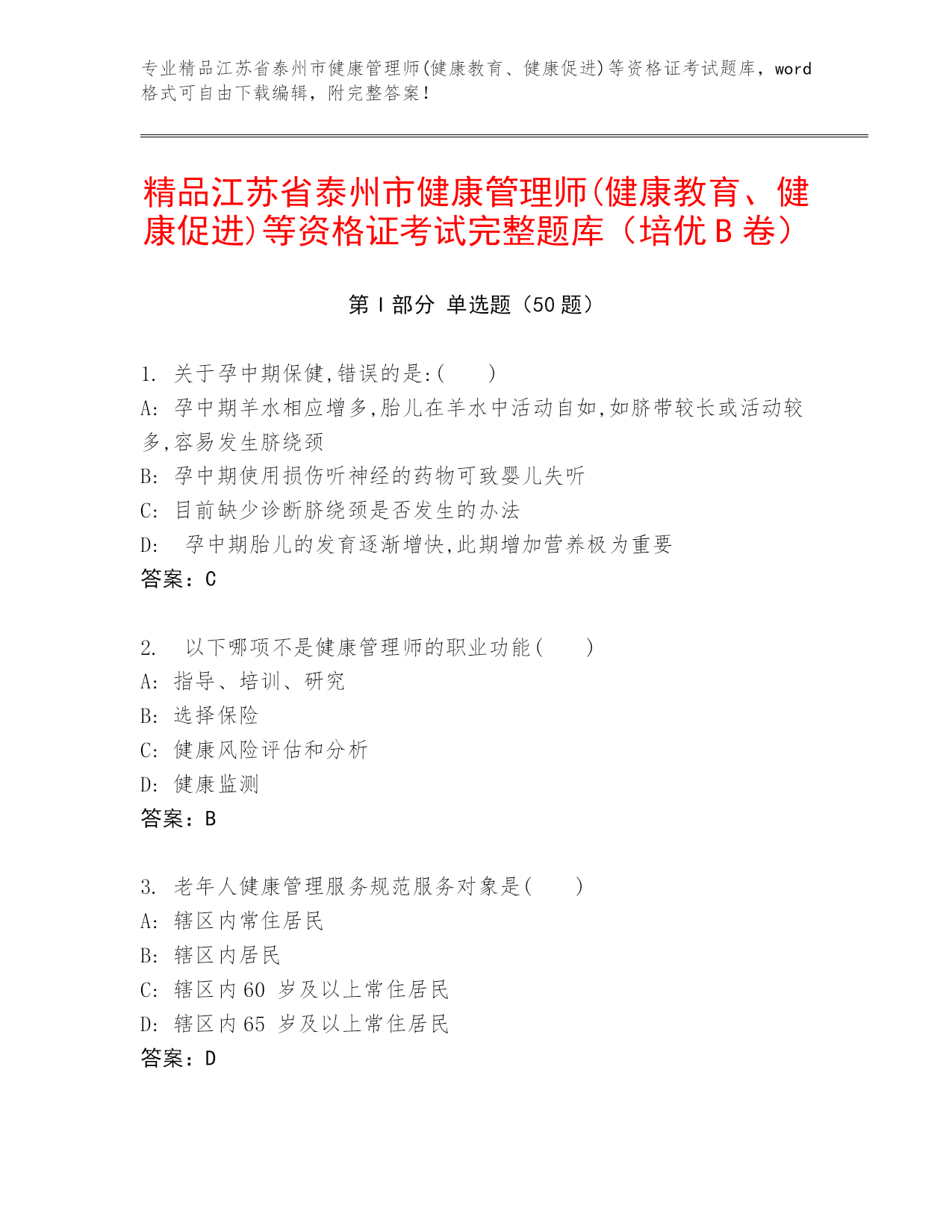 精品江苏省泰州市健康管理师(健康教育、健康促进)等资格证考试完整题库(培优B卷).docx
