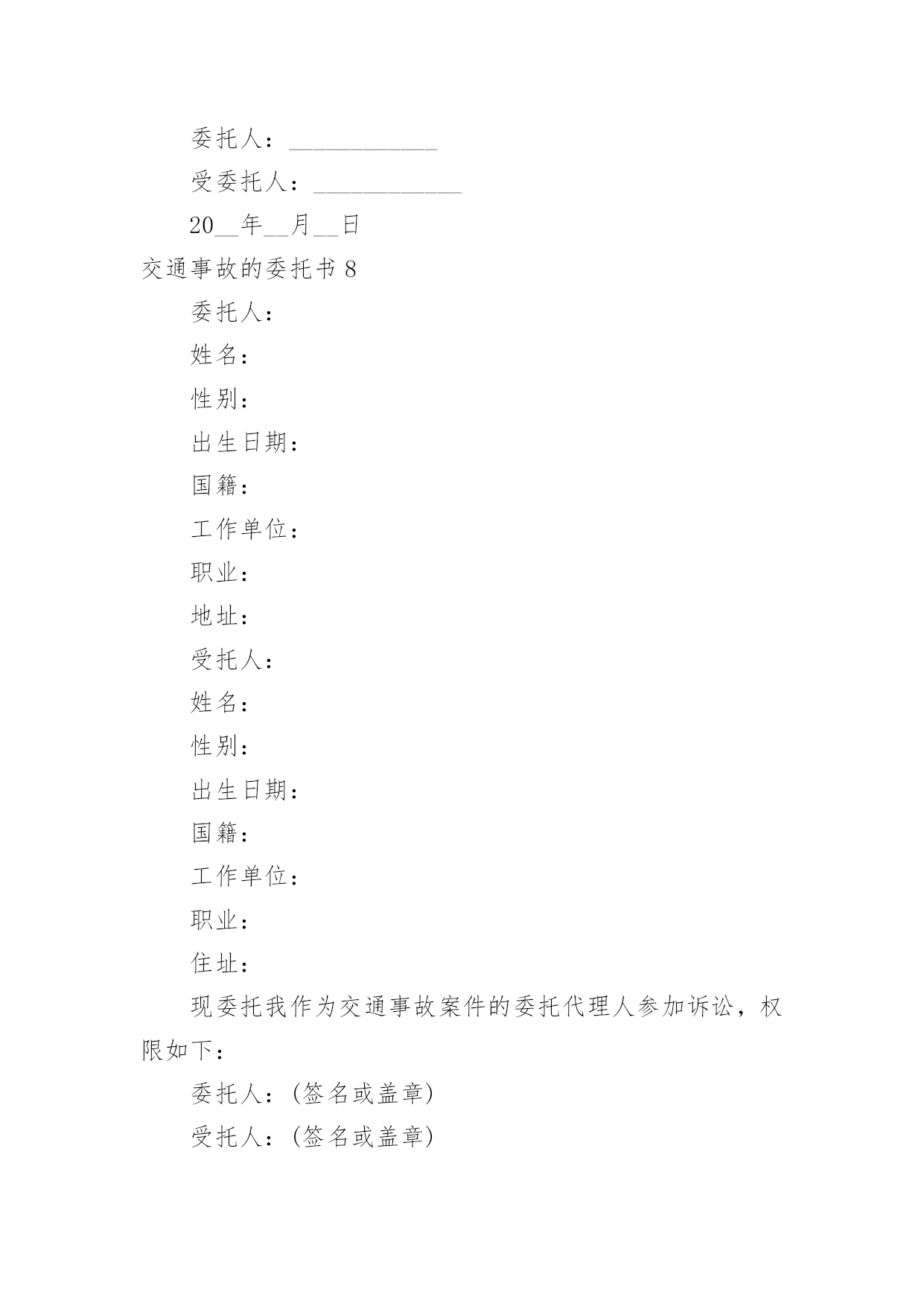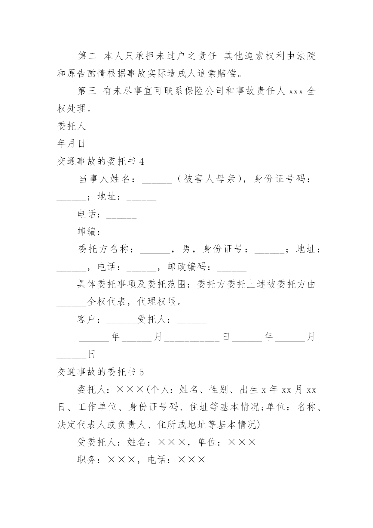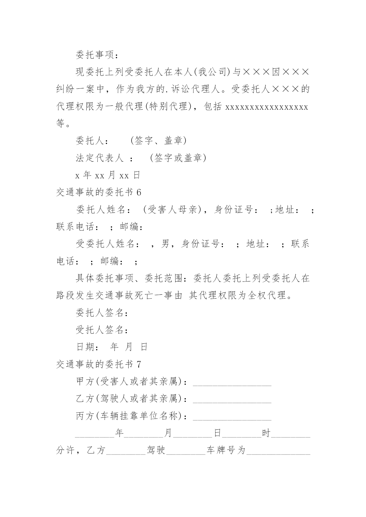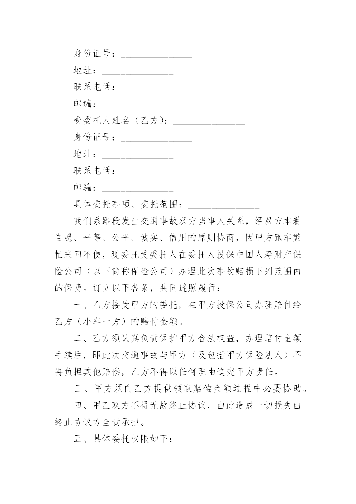 交通事故的委托书交通事故的委托书委托书是被委托人在行使权力时需出具委托人的法律文书。在日常生活和工作中,委托书在处理事务上的使用频率越来越高,那么你有了解过委托书吗?下面是小编收集整理的交通事故的委托书,仅供参考,希望能够帮助到大家。交通事故的委托书1委托单位名称:住所地:法定代表人或主要负责人姓名:职务:受委托人姓名:性别:年龄:工作单位:职务:住址:电话:现委托在我单位与交通事故一案中,作为我方参诉讼的委托代理人,委托权限如下:一、一般授权二、特别授权:授权范围:代为起诉,陈述事实,参加辩论和调解,代为提出、承认、放弃、变更诉讼请求,提出反诉、进行和解、撤诉、上诉、签收法律文书。委托单位:(公章)法定代表人:年月日注:1、法人或其他组织授权委托书,是当事人依法委托他人作为诉讼代理人,向人民法院提交的写明委托事项和权限的文书。2、委托代理人须写明代理权限,特别授权的,应写明授权的具体范围:代为起诉,陈述事实,参加辩论和调解,代为提出、承认、放弃、变更诉讼请求,提出反诉、进行和解、撤诉、上诉、签收法律文书。3、上述两种授权方式不能同时适用,只能择一使用。交通事故处理委托书委托人:姓名、性别、出生年月、民族、工作单位、职业、住址。被委托人:姓名、性别、出生年月、民族、工作单位、职业、住址。现委托在我与交通事故一案中,作为我参加诉讼的委托代理人,委托权限如下:1、xxxx2、xxxx委托人:(签名或盖章)被委托人:(签名或盖章)_______年_______月________日注:委托代理人须写明代理权限,特别授权的.,应写明授权的具体范围:代为起诉,陈述事实,参加辩论和调解,代为提出、承认、放弃、变更诉讼请求,提出反诉、进行和解、撤诉、上诉、签收法律文书。交通事故的委托书2委托人姓名:年龄:身份证号码:住址及联系方式:受托人姓名:工作单位:身份证号码:住址及联系方式:现委托上述受托人作为我方委托代理人参与道路交通事故一案处理工作。代理人:的代理事项及权限为:全权委托委托人(签名):受托人(签名):交通事故的委托书3本人xxx事故车xx牌厢式货车牌照号xxxxxx一直没过户折价委托xxx使用于20xx年4月x日出事故,现本人委托被告人xxx出具相关证明委托书。特此声明如下:第一事故车一直由xxx驾驶使用本人未曾在事故当日驾驶,出险。第二本人只承担未过户之责任其他追索权利由法院和原告酌情根据事故实际造成人追索赔偿。第三有未尽事宜可联系保险公司和事故责任人xxx全权处理。委托人年月日交通事故的委托书4当事人姓名:______(被害人母亲),身份证号码:______;地址:______电话:______邮编:______委托方名称:______,男,身份证号:______;地址:______,电话:______,邮政编码:______具体委托事项及委托范围:委托方委托上述被委托方由______全权代表,代理权限。客户:______受托人:____________年______月___________日______年______月______日交通事故的委托书5委托人:×××(个人:姓名、性别、出生x年xx月xx日、工作单位、身份证号码、住址等基本情况;单位:名称、法定代表人或负责人、住所或地址等基本情况)受委托人:姓名:×××,单位:×××职务:×××,电话:×××委托事项:现委托上列受委托人在本人(我公司)与×××因×××纠纷一案中,作为我方的.诉讼代理人。受委托人×××的代理权限为一般代理(特别代理),包括xxxxxxxxxxxxxxxxx等。委托人:(签字、盖章)法定代表人:(签字或盖章)x年xx月xx日交通事故的委托书6委托人姓名:(受害人母亲),身份证号:;地址:;联系电话:;邮编:受委托人姓名:,男,身份证号:;地址:;联系电话:;邮编:;具体委托事项、委托范围:委托人委托上列受委托人在路段发生交通事故死亡一事由其代理权限为全权代理。委托人签名:受托人签名:日期:年月日交通事故的委托书7甲方(受害人或者其亲属):________________乙方(驾驶人或者其亲属):________________丙方(车辆挂靠单位名称):________________________年________月________日________时________分许,乙方________驾驶________车牌号为_____________的________车________行驶至________县________路居民区附近时,不慎与甲方的发生交通事故,致当场出现人身损害,财产受到相应损失。甲、乙、丙三方就赔偿事宜,经协商自愿达成如下协议:一、乙方和丙方自愿一次性赔偿甲方各种法定人身损害赔偿项目以及财产损失项目共计___________