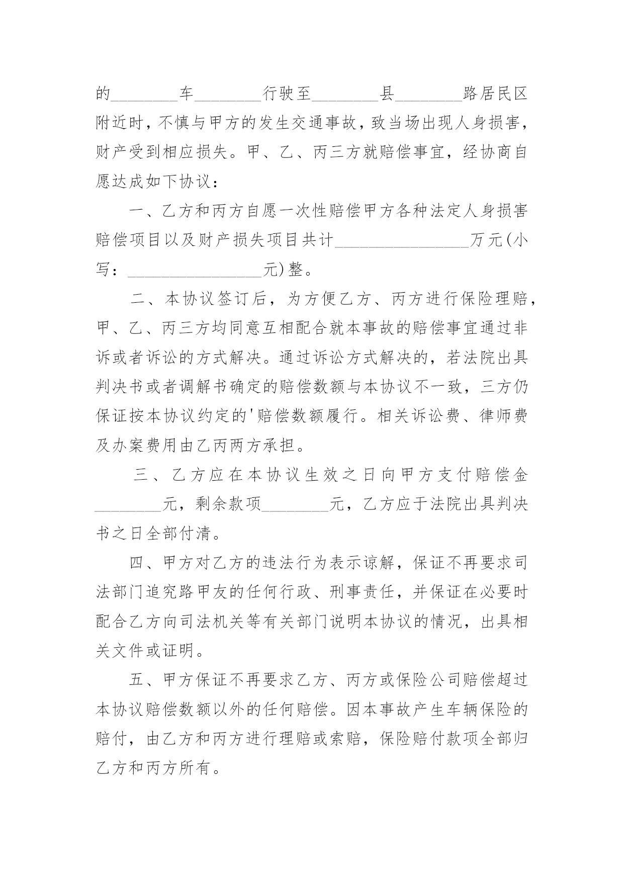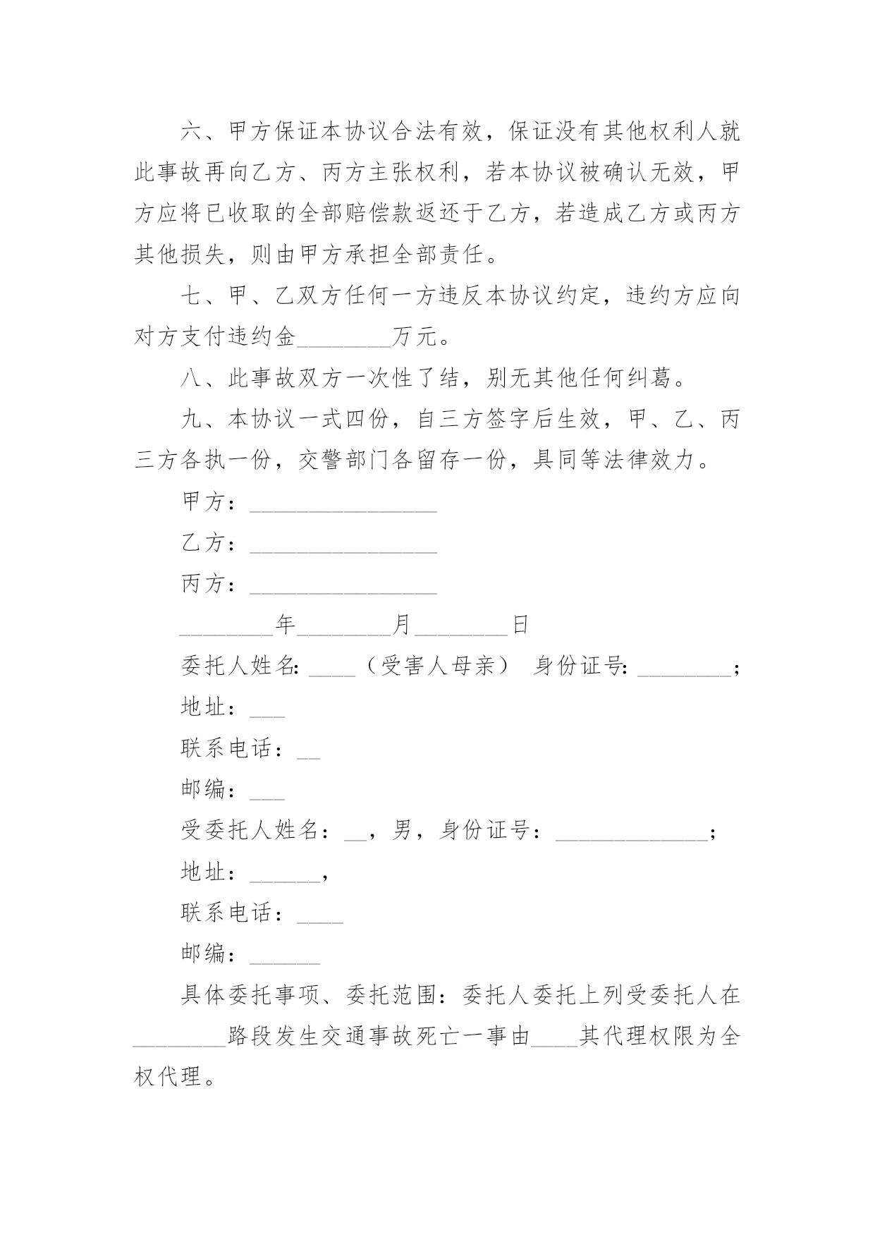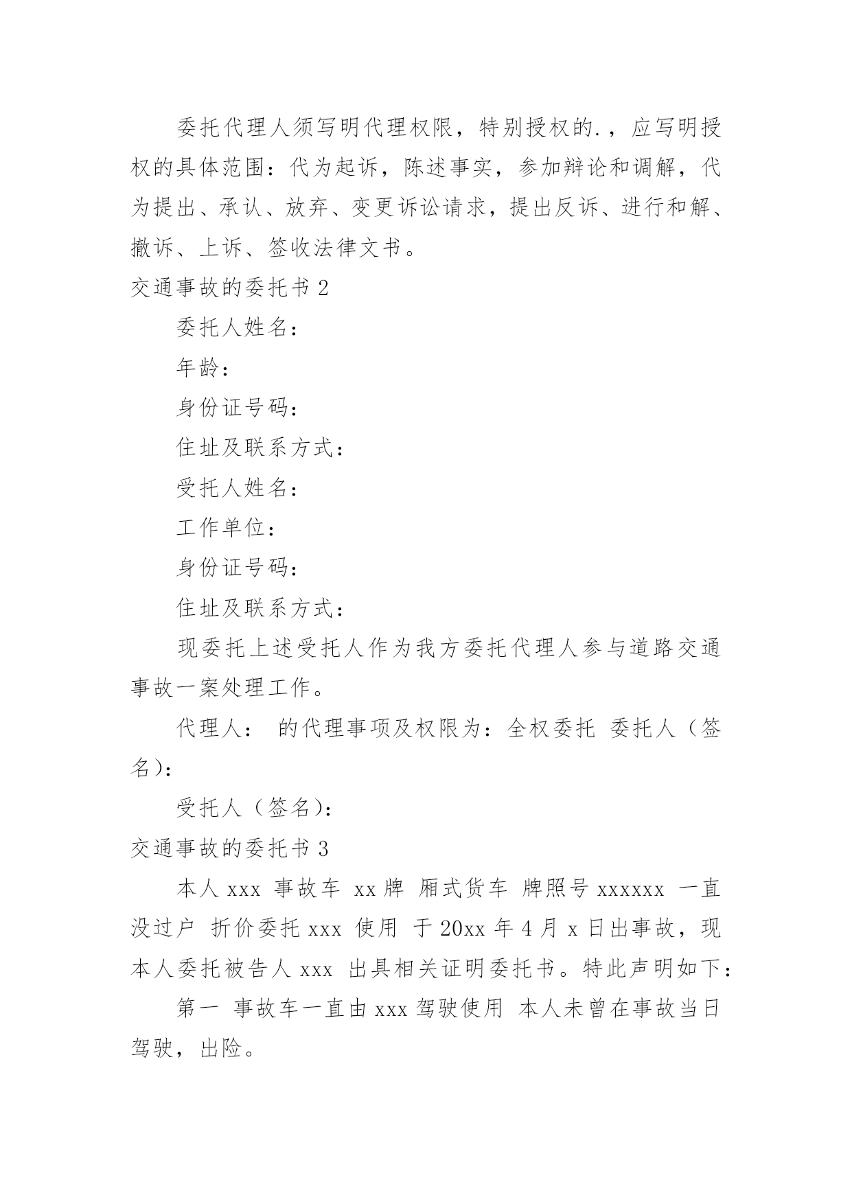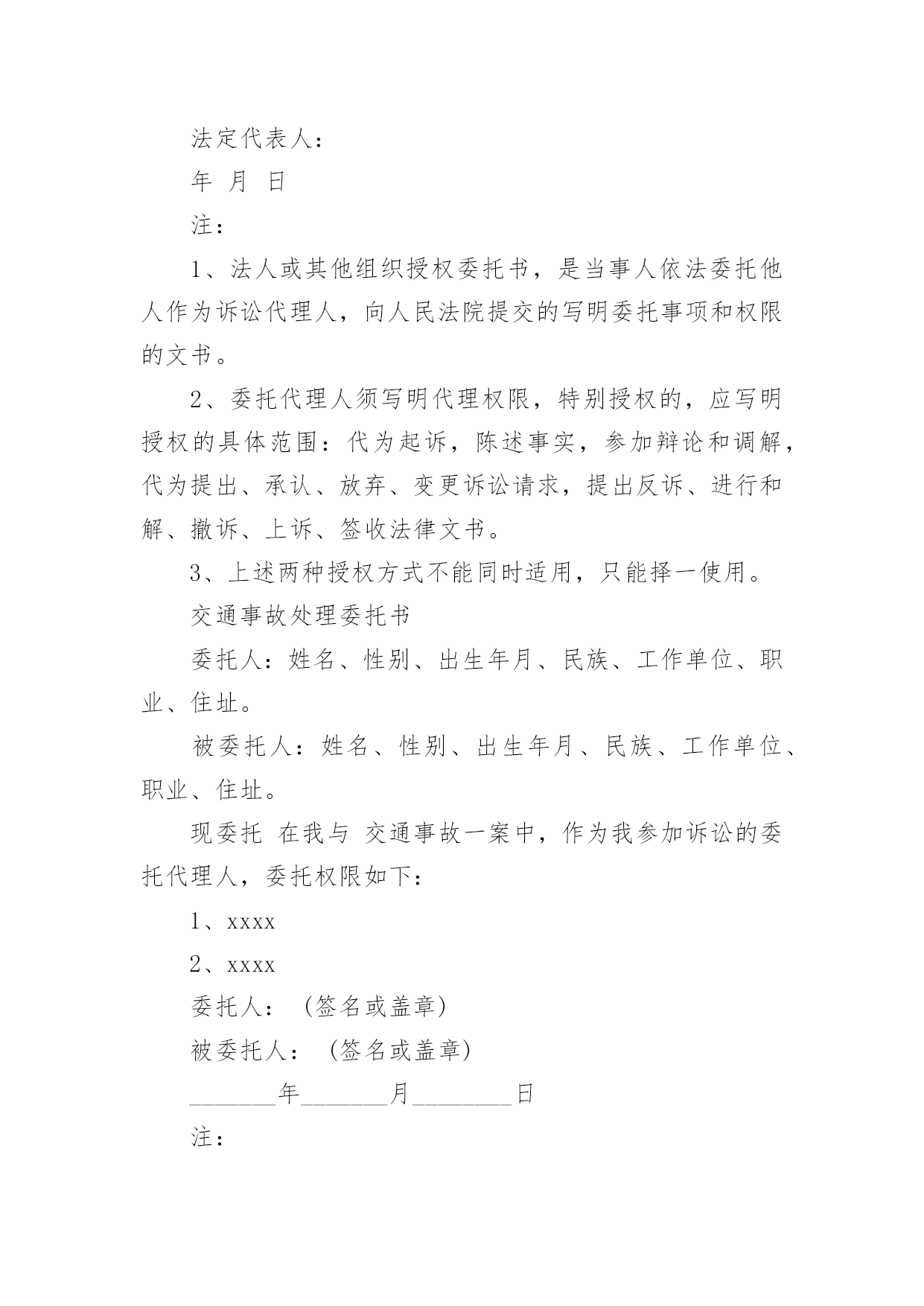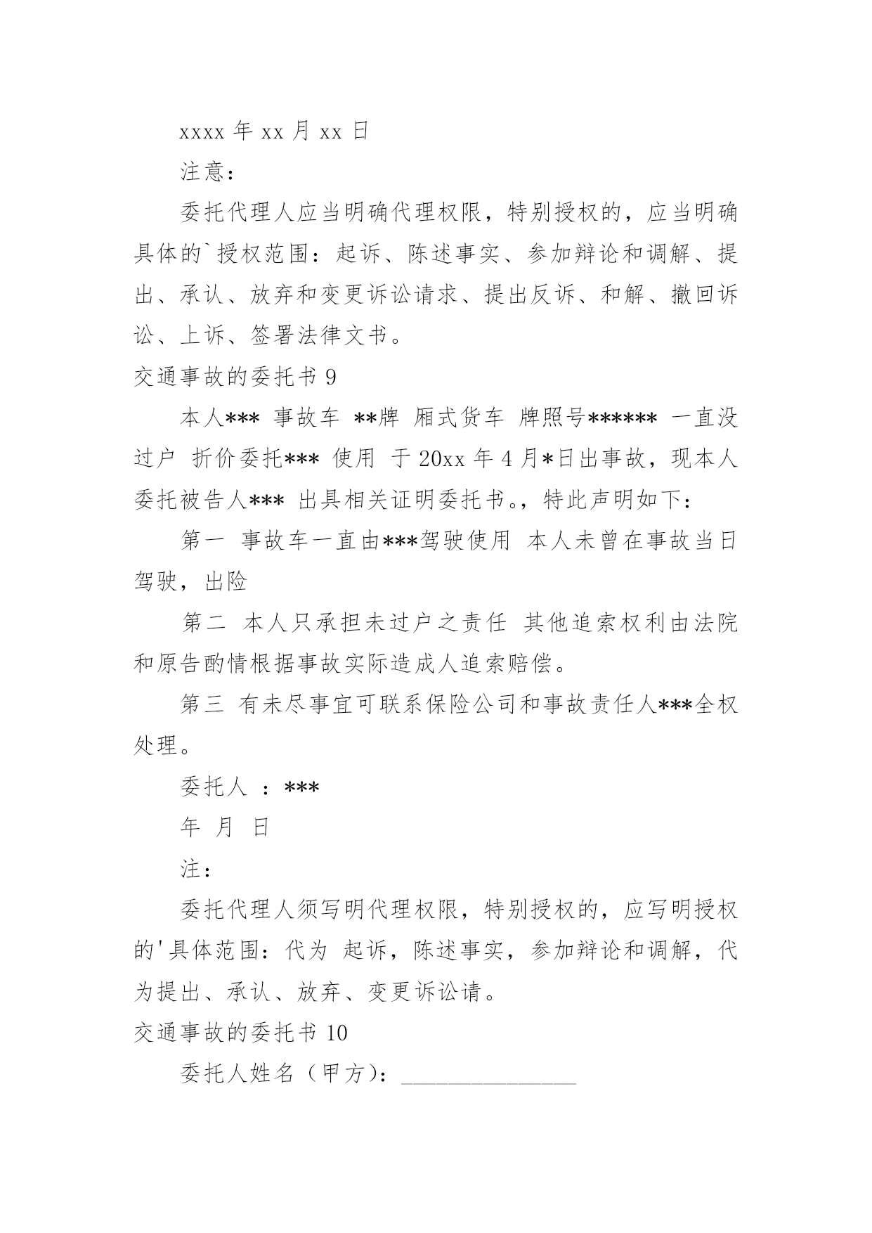 交通事故的委托书交通事故的委托书委托书是被委托人在行使权力时需出具委托人的法律文书。在日常生活和工作中,委托书在处理事务上的使用频率越来越高,那么你有了解过委托书吗?下面是小编收集整理的交通事故的委托书,仅供参考,希望能够帮助到大家。交通事故的委托书1委托单位名称:住所地:法定代表人或主要负责人姓名:职务:受委托人姓名:性别:年龄:工作单位:职务:住址:电话:现委托在我单位与交通事故一案中,作为我方参诉讼的委托代理人,委托权限如下:一、一般授权二、特别授权:授权范围:代为起诉,陈述事实,参加辩论和调解,代为提出、承认、放弃、变更诉讼请求,提出反诉、进行和解、撤诉、上诉、签收法律文书。委托单位:(公章)法定代表人:年月日注:1、法人或其他组织授权委托书,是当事人依法委托他人作为诉讼代理人,向人民法院提交的写明委托事项和权限的文书。2、委托代理人须写明代理权限,特别授权的,应写明授权的具体范围:代为起诉,陈述事实,参加辩论和调解,代为提出、承认、放弃、变更诉讼请求,提出反诉、进行和解、撤诉、上诉、签收法律文书。3、上述两种授权方式不能同时适用,只能择一使用。交通事故处理委托书委托人:姓名、性别、出生年月、民族、工作单位、职业、住址。被委托人:姓名、性别、出生年月、民族、工作单位、职业、住址。现委托在我与交通事故一案中,作为我参加诉讼的委托代理人,委托权限如下:1、xxxx2、xxxx委托人:(签名或盖章)被委托人:(签名或盖章)_______年_______月________日注:委托代理人须写明代理权限,特别授权的.,应写明授权的具体范围:代为起诉,陈述事实,参加辩论和调解,代为提出、承认、放弃、变更诉讼请求,提出反诉、进行和解、撤诉、上诉、签收法律文书。交通事故的委托书2委托人姓名:年龄:身份证号码:住址及联系方式:受托人姓名:工作单位:身份证号码:住址及联系方式:现委托上述受托人作为我方委托代理人参与道路交通事故一案处理工作。代理人:的代理事项及权限为:全权委托委托人(签名):受托人(签名):交通事故的委托书3本人xxx事故车xx牌厢式货车牌照号xxxxxx一直没过户折价委托xxx使用于20xx年4月x日出事故,现本人委托被告人xxx出具相关证明委托书。特此声明如下:第一事故车一直由xxx驾驶使用本人未曾在事故当日驾驶,出险。第二本人只承担未过户之责任其他追索权利由法院和原告酌情根据事故实际造成人追索赔偿。第三有未尽事宜可联系保险公司和事故责任人xxx全权处理。委托人年月日交通事故的委托书4当事人姓名:______(被害人母亲),身份证号码:______;地址:______电话:______邮编:______委托方名称:______,男,身份证号:______;地址:______,电话:______,邮政编码:______具体委托事项及委托范围:委托方委托上述被委托方由______全权代表,代理权限。客户:______受托人:____________年______月___________日______年______月______日交通事故的委托书5委托人:×××(个人:姓名、性别、出生x年xx月xx日、工作单位、身份证号码、住址等基本情况;单位:名称、法定代表人或负责人、住所或地址等基本情况)受委托人:姓名:×××,单位:×××职务:×××,电话:×××委托事项:现委托上列受委托人在本人(我公司)与×××因×××纠纷一案中,作为我方的.诉讼代理人。受委托人×××的代理权限为一般代理(特别代理),包括xxxxxxxxxxxxxxxxx等。委托人:(签字、盖章)法定代表人:(签字或盖章)x年xx月xx日交通事故的委托书6委托人姓名:(受害人母亲),身份证号:;地址:;联系电话:;邮编:受委托人姓名:,男,身份证号:;地址:;联系电话:;邮编:;具体委托事项、委托范围:委托人委托上列受委托人在路段发生交通事故死亡一事由其代理权限为全权代理。委托人签名:受托人签名:日期:年月日交通事故的委托书7甲方(受害人或者其亲属):________________乙方(驾驶人或者其亲属):________________丙方(车辆挂靠单位名称):________________________年________月________日________时________分许,乙方________驾驶________车牌号为_____________的________车________行驶至________县________路居民区附近时,不慎与甲方的发生交通事故,致当场出现人身损害,财产受到相应损失。甲、乙、丙三方就赔偿事宜,经协商自愿达成如下协议:一、乙方和丙方自愿一次性赔偿甲方各种法定人身损害赔偿项目以及财产损失项目共计___________