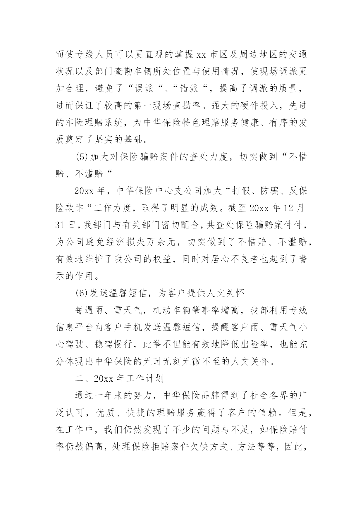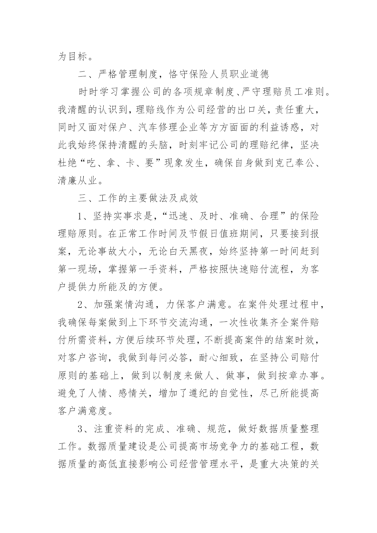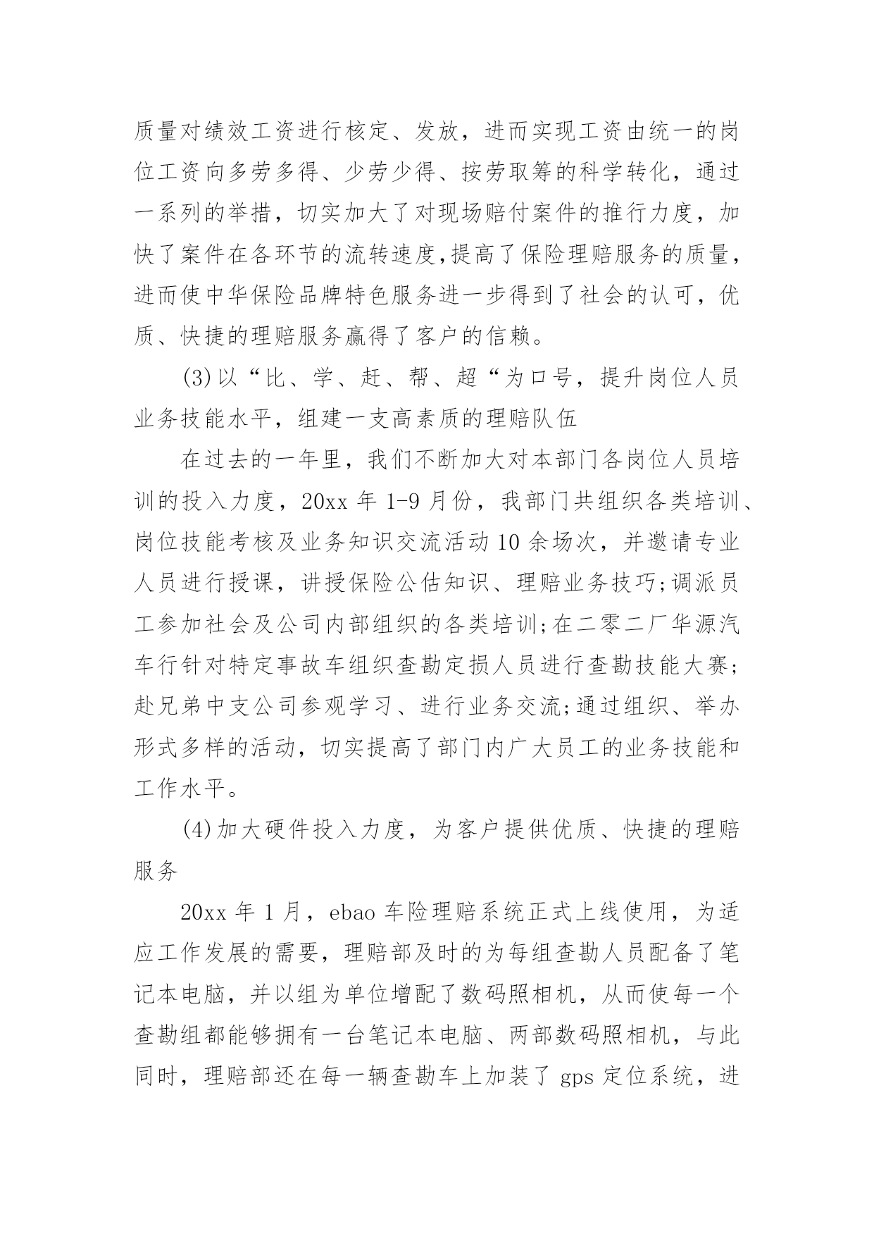 保险理赔工作总结保险理赔工作总结【推荐】总结是对过去一定时期的工作、学习或思想情况进行回顾、分析,并做出客观评价的书面材料,它能帮我们理顺知识结构,突出重点,突破难点,让我们好好写一份总结吧。那么你真的懂得怎么写总结吗?以下是小编整理的保险理赔工作总结,欢迎大家借鉴与参考,希望对大家有所帮助。保险理赔工作总结120xx年即将过去,在公司领导的悉心关怀下和同事们的帮助指导下,结合我自身的努力,在工作、学习等各方面都取得了长足的进步,尤其是在保险理赔专业知识和技能培养方面的成熟,使我成为一名合格的车险查勘定损员。随着工作岗位的调整,我已经成长为为一名能够独立工作、业务熟练的前台工作人员。现将一年来的工作情况向公司领导总结、汇报如下:一、加强理论学习,注重个人素质提高加强自身业务学习,争做理赔标兵。在日常的工作学习中,我坚持学习更多的保险知识和业务技能,在老同志的“传帮带”下,不断加强个人自学,弥补个人在保险专业知识和理赔技能上的不足,始终保持着学无止境的学习精神,力争以优质、快速、合规的专业素质做好理赔客户服务工作,报效公司培养,并抱以乐观、积极的态度,以争做理赔标兵为目标。二、严格管理制度,恪守保险人员职业道德时时学习掌握公司的各项规章制度、严守理赔员工准则。我清醒的认识到,理赔线作为公司经营的出口关,责任重大,同时又面对保户、汽车修理企业等方方面面的利益诱惑,对此我始终保持清醒的头脑,时刻牢记公司的理赔纪律,坚决杜绝“吃、拿、卡、要”现象发生,确保自身做到克己奉公、清廉从业。三、工作的主要做法及成效1、坚持实事求是,“迅速、及时、准确、合理”的保险理赔原则。在正常工作时间及节假日值班期间,只要接到报案,无论事故大小,无论白天黑夜,始终坚持第一时间赶到第一现场,掌握第一手资料,严格按照快速赔付流程,为客户提供力所能及的方便。2、加强案情沟通,力保客户满意。在案件处理过程中,我确保每案做到上下环节交流沟通,一次性收集齐全案件赔付所需资料,方便后续环节处理,不断提高案件的结案时效,对客户咨询,我做到每问必答,耐心细致,在坚持公司赔付原则的基础上,做到以制度来做人、做事,做到按章办事。避免了人情、感情关,增加了遵纪的自觉性,尽己所能提高客户满意度。3、注重资料的完成、准确、规范,做好数据质量整理工作。数据质量建设是公司提高市场竞争力的基础工程,数据质量的高低直接影响公司经营管理水平,是重大决策的关键依据。对业务数据规范性、完整性、准确性等进行了多次检查,使公司业务数据质量得到进一步的改善。4、注重仪容仪表,展现公司良好形象。严格按照制度要求,做好仪容、仪表、行为、语言、礼节,体现人保理赔员工的精神风貌。5、注重与各岗位之间积极配合,相互支持,督促形成合力,确保理赔流程的畅通有序。在自己工作职责范围内,充分发挥积极性、主动性和创造性,提高预见性、超前性和计划性。四、工作中存在不足回顾一年的工作和学习,在取得上述成绩的同时,还有一些在今后的`工作中亟待提升的方面:一是要继续加强车险理赔管控,有效降低赔付成本。二是要增强防范保险欺诈意识,要进一步与交警、经侦等部门做好打假防骗工作。五、下一阶段工作目标在今后的工作中,我会加倍的努力学习专业知识,掌握更多的业务技能,为将来的工作打好坚实的基础。1、在作风上,能遵章守纪、团结同事、务真求实、乐观上进,始终保持严谨认真的工作态度和一丝不苟的工作作风,勤勤恳恳,任劳任怨。2、在生活中,发扬艰苦朴素、勤俭耐劳、乐于助人的优良传统,始终做到老老实实做人,勤勤恳恳做事,勤劳简朴的生活,时刻牢记自己的责任和义务,严格要求自己,确保完成自己本职工作任务。3、在本职工作上,严以律己,遵守各项规章制度,严格要求自己,摆正工作位置,时刻保持“谦虚,谨慎,律己”的工作态度,在领导的关心培养和同事们的帮助下,始终勤奋学习,积极进取,努力提高自我,始终勤奋工作,认真完成任务,履行好岗位的职责。顾旧盼新,提升理赔服务质量仍然是我们的工作重心,理赔服务的好坏将直接关系到公司形象,影响到公司业务发展。车险理赔是需要管控的业务,如何缩短理赔周期,节约理赔成本,挤干理赔水分一直是我致力追求的奋斗目标。为此,在新的一年里我将更加勤奋的工作,刻苦的学习,努力提高自身的综合素质和工作技能,以崭新的精神状态投入到工作当中,为公司发展做出力所能及的应有贡献。保险理赔工作总结220xx年是保险中心支公司理赔部紧跟市公司战略部署、把握主动、明确目标、扎实措施、合力攻坚、强势奋进的一年。在这一年里,中华保险中心支公司理赔部全体员工紧紧围绕“立足改革、加快发展、真诚服务、提高效益“这一中心,与时俱进,勤奋工作,务实求效,文明服务,较好地完成了上级公司和公司总经理室交付的各项工作。截至20xx年12月底,我部共处理各类赔案件,支付赔款近x万元,有