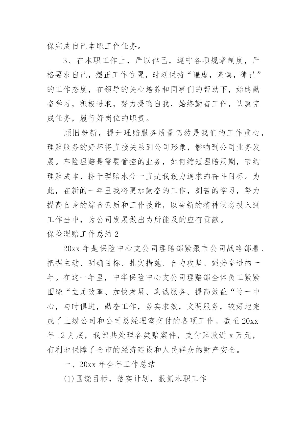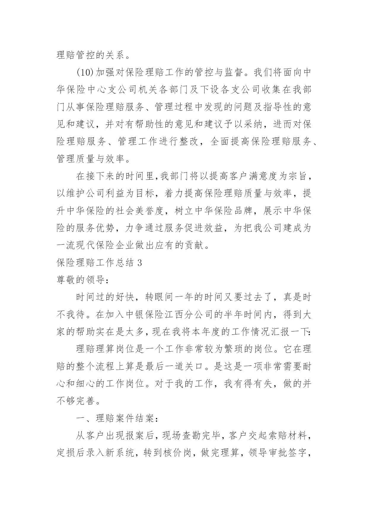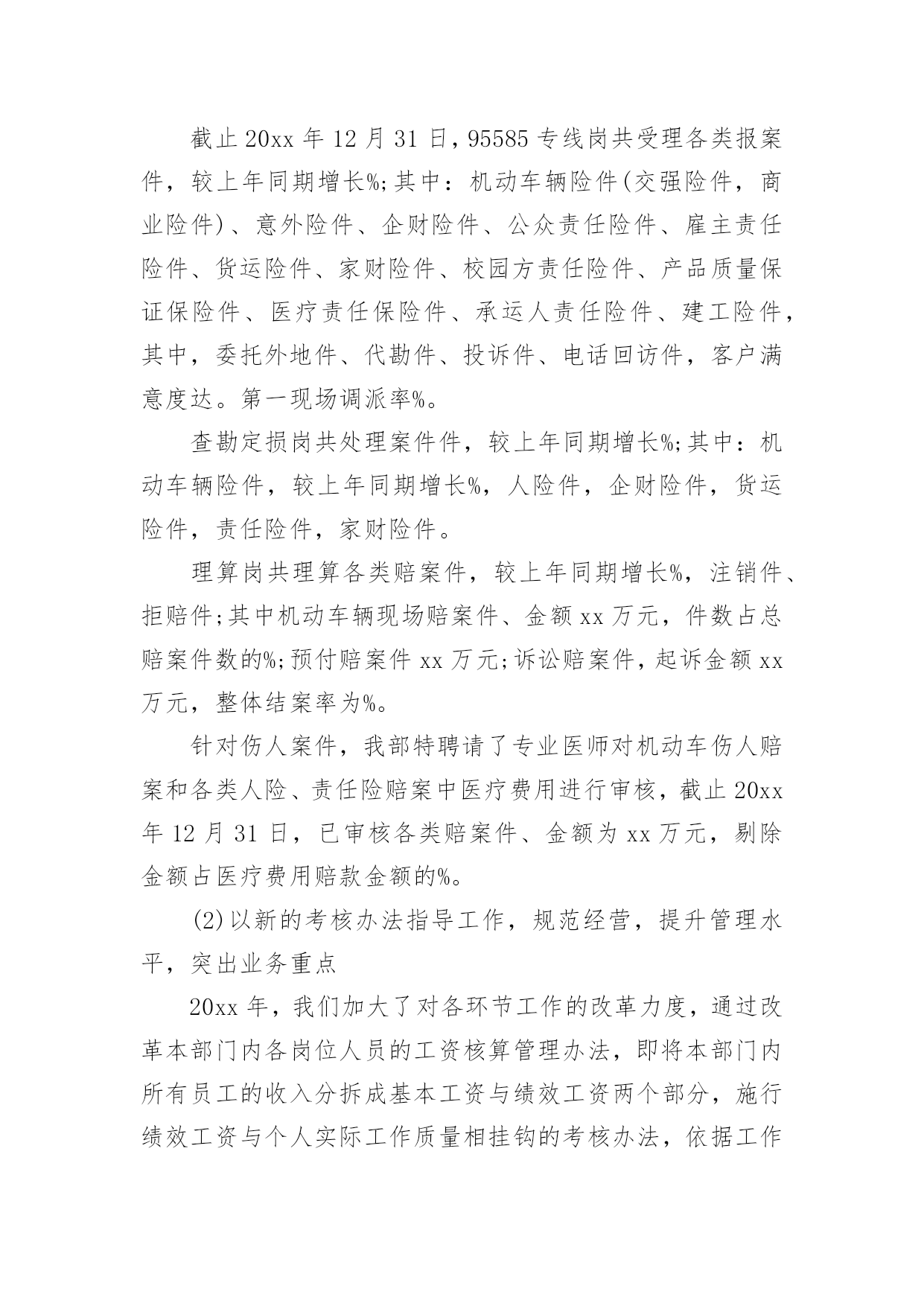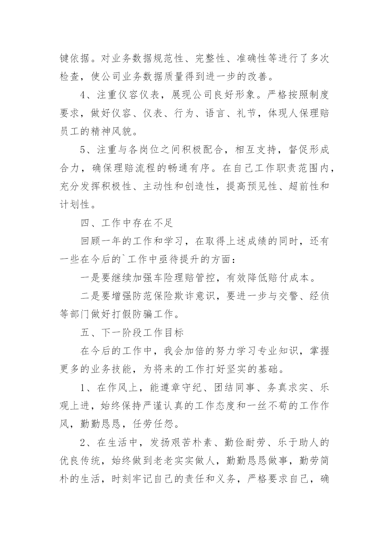 保险理赔工作总结保险理赔工作总结【推荐】总结是对过去一定时期的工作、学习或思想情况进行回顾、分析,并做出客观评价的书面材料,它能帮我们理顺知识结构,突出重点,突破难点,让我们好好写一份总结吧。那么你真的懂得怎么写总结吗?以下是小编整理的保险理赔工作总结,欢迎大家借鉴与参考,希望对大家有所帮助。保险理赔工作总结120xx年即将过去,在公司领导的悉心关怀下和同事们的帮助指导下,结合我自身的努力,在工作、学习等各方面都取得了长足的进步,尤其是在保险理赔专业知识和技能培养方面的成熟,使我成为一名合格的车险查勘定损员。随着工作岗位的调整,我已经成长为为一名能够独立工作、业务熟练的前台工作人员。现将一年来的工作情况向公司领导总结、汇报如下:一、加强理论学习,注重个人素质提高加强自身业务学习,争做理赔标兵。在日常的工作学习中,我坚持学习更多的保险知识和业务技能,在老同志的“传帮带”下,不断加强个人自学,弥补个人在保险专业知识和理赔技能上的不足,始终保持着学无止境的学习精神,力争以优质、快速、合规的专业素质做好理赔客户服务工作,报效公司培养,并抱以乐观、积极的态度,以争做理赔标兵为目标。二、严格管理制度,恪守保险人员职业道德时时学习掌握公司的各项规章制度、严守理赔员工准则。我清醒的认识到,理赔线作为公司经营的出口关,责任重大,同时又面对保户、汽车修理企业等方方面面的利益诱惑,对此我始终保持清醒的头脑,时刻牢记公司的理赔纪律,坚决杜绝“吃、拿、卡、要”现象发生,确保自身做到克己奉公、清廉从业。三、工作的主要做法及成效1、坚持实事求是,“迅速、及时、准确、合理”的保险理赔原则。在正常工作时间及节假日值班期间,只要接到报案,无论事故大小,无论白天黑夜,始终坚持第一时间赶到第一现场,掌握第一手资料,严格按照快速赔付流程,为客户提供力所能及的方便。2、加强案情沟通,力保客户满意。在案件处理过程中,我确保每案做到上下环节交流沟通,一次性收集齐全案件赔付所需资料,方便后续环节处理,不断提高案件的结案时效,对客户咨询,我做到每问必答,耐心细致,在坚持公司赔付原则的基础上,做到以制度来做人、做事,做到按章办事。避免了人情、感情关,增加了遵纪的自觉性,尽己所能提高客户满意度。3、注重资料的完成、准确、规范,做好数据质量整理工作。数据质量建设是公司提高市场竞争力的基础工程,数据质量的高低直接影响公司经营管理水平,是重大决策的关键依据。对业务数据规范性、完整性、准确性等进行了多次检查,使公司业务数据质量得到进一步的改善。4、注重仪容仪表,展现公司良好形象。严格按照制度要求,做好仪容、仪表、行为、语言、礼节,体现人保理赔员工的精神风貌。5、注重与各岗位之间积极配合,相互支持,督促形成合力,确保理赔流程的畅通有序。在自己工作职责范围内,充分发挥积极性、主动性和创造性,提高预见性、超前性和计划性。四、工作中存在不足回顾一年的工作和学习,在取得上述成绩的同时,还有一些在今后的`工作中亟待提升的方面:一是要继续加强车险理赔管控,有效降低赔付成本。二是要增强防范保险欺诈意识,要进一步与交警、经侦等部门做好打假防骗工作。五、下一阶段工作目标在今后的工作中,我会加倍的努力学习专业知识,掌握更多的业务技能,为将来的工作打好坚实的基础。1、在作风上,能遵章守纪、团结同事、务真求实、乐观上进,始终保持严谨认真的工作态度和一丝不苟的工作作风,勤勤恳恳,任劳任怨。2、在生活中,发扬艰苦朴素、勤俭耐劳、乐于助人的优良传统,始终做到老老实实做人,勤勤恳恳做事,勤劳简朴的生活,时刻牢记自己的责任和义务,严格要求自己,确保完成自己本职工作任务。3、在本职工作上,严以律己,遵守各项规章制度,严格要求自己,摆正工作位置,时刻保持“谦虚,谨慎,律己”的工作态度,在领导的关心培养和同事们的帮助下,始终勤奋学习,积极进取,努力提高自我,始终勤奋工作,认真完成任务,履行好岗位的职责。顾旧盼新,提升理赔服务质量仍然是我们的工作重心,理赔服务的好坏将直接关系到公司形象,影响到公司业务发展。车险理赔是需要管控的业务,如何缩短理赔周期,节约理赔成本,挤干理赔水分一直是我致力追求的奋斗目标。为此,在新的一年里我将更加勤奋的工作,刻苦的学习,努力提高自身的综合素质和工作技能,以崭新的精神状态投入到工作当中,为公司发展做出力所能及的应有贡献。保险理赔工作总结220xx年是保险中心支公司理赔部紧跟市公司战略部署、把握主动、明确目标、扎实措施、合力攻坚、强势奋进的一年。在这一年里,中华保险中心支公司理赔部全体员工紧紧围绕“立足改革、加快发展、真诚服务、提高效益“这一中心,与时俱进,勤奋工作,务实求效,文明服务,较好地完成了上级公司和公司总经理室交付的各项工作。截至20xx年12月底,我部共处理各类赔案件,支付赔款近x万元,有