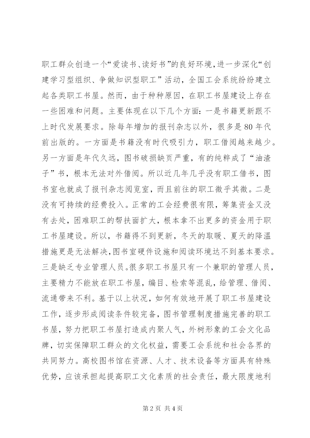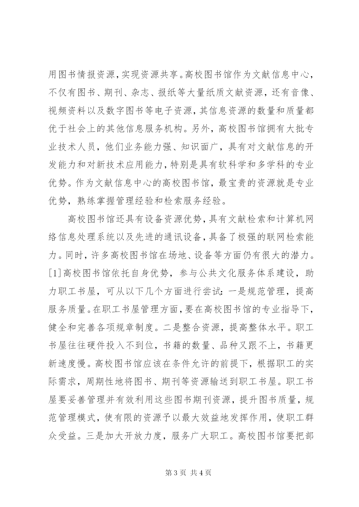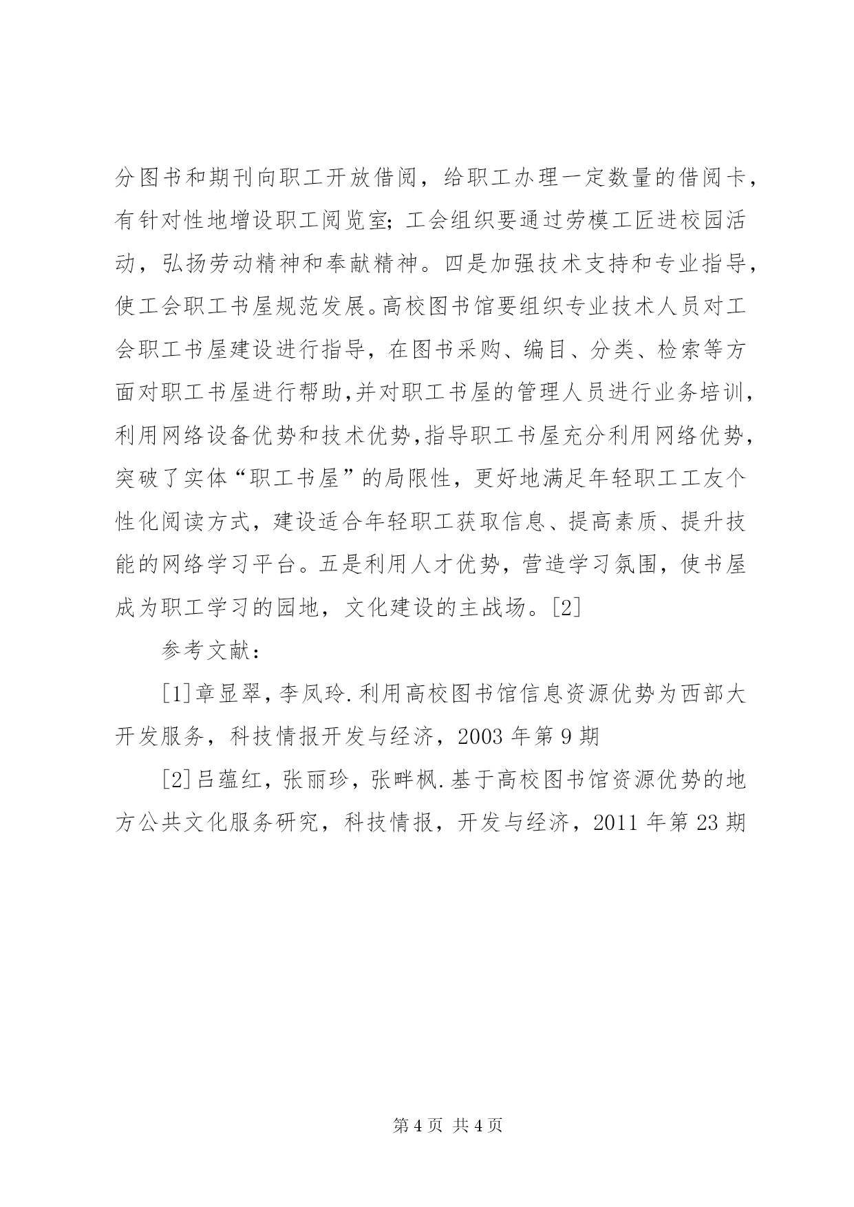 第PAGE\*Arabic\*MERGEFORMAT4页共NUMPAGES\*MERGEFORMAT4页图书馆公共文化服务体系初探【摘要】高校图书馆在资源、人才、技术设备等方面具有优势。职工书屋在加强和改进工人队伍思想政治建设,推动提升产业工人技术技能水平等方面发挥着巨大的作用,但建设上存在一些困难和问题。本文在高校图书馆助力职工书屋建设方面进行初步探讨。【关键词】高校图书馆;公共文化服务;职工书屋高校图书馆作为文化机构,社会的需求决定了它的服务内容,同时也决定了它的社会职能。在社会化资源共享的今天,高校图书馆应该顺应社会发展的需要,不断强化和充分发挥自身应有的社会职能,在为高校教学、科研服务的前提下,还要为社会服务,为公共文化体系建设服务,以促进经济和社会的发展。职工书屋是中华全国总工会和各级工会组织为切实保障职工群众的文化权益,为广大基层职工提供和创造方便实用的读书场所和学习条件,在全国工会开展的一项重要文化工程。中华全国总工会副主席李玉赋指出,要切实加强思想引领,推动职工书屋建设不断创新发展,积极引导职工多读书、读好书,充分发挥职工书屋在加强和改进工人队伍思想政治建设,推动提升产业工人技术技能水平方面的作用,让越来越多的普通职工成为劳模精神、劳动精神和工匠精神的诠释者和传承者。为不断满足广大职工群众日益增长的精神文化生活需要,给职工群众创造一个“爱读书、读好书”的良好环境,进一步深化“创建学习型组织、争做知识型职工”活动,全国工会系统纷纷建立起各类职工书屋。然而,由于种种原因,在职工书屋建设上存在一些困难和问题。主要体现在以下几个方面:一是书籍更新跟不上时代发展要求。除每年增加的报刊杂志以外,很多是80年代前出版的。一方面是书籍没有时代吸引力,职工借阅越来越少。另一方面是年代久远,图书破损缺页严重,有的纯粹成了“油渣子”书,根本无法对外借阅。所以近几年几乎没有职工借书,图书室也就成了报刊杂志阅览室,而且前往的职工微乎其微。二是没有可持续的经费投入。正常的工会经费很有限,筹集资金又没有去处,困难职工的帮扶面扩大,根本拿不出更多的资金用于职工书屋建设。所以,书籍得不到更新,冬天的取暖、夏天的降温措施更是无法解决,图书室硬件设施和阅读环境达不到基本要求。三是缺乏专业管理人员。很多职工书屋只有一个兼职的管理人员,主要精力不能放在职工书屋,编目、检索等混乱,给管理、借阅、流通带来不利。基于以上状况,如何有效地开展了职工书屋建设工作,逐步形成阅读条件较完备,图书管理制度措施完善的职工书屋,努力把职工书屋打造成内聚人气,外树形象的工会文化品牌,切实保障职工群众的文化权益,需要工会系统和社会各界的共同努力。高校图书馆在资源、人才、技术设备等方面具有特殊优势,应该承担起提高职工文化素质的社会责任,最大限度地利用图书情报资源,实现资源共享。高校图书馆作为文献信息中心,不仅有图书、期刊、杂志、报纸等大量纸质文献资源,还有音像、视频资料以及数字图书等电子资源,其信息资源的数量和质量都优于社会上的其他信息服务机构。另外,高校图书馆拥有大批专业技术人员,他们业务能力强、知识面广,具有对文献信息的开发能力和对新技术应用能力,特别是具有软科学和多学科的专业优势。作为文献信息中心的高校图书馆,最宝贵的资源就是专业优势,熟练掌握管理经验和检索服务经验。高校图书馆还具有设备资源优势,具有文献检索和计算机网络信息处理系统以及先进的通讯设备,具备了极强的联网检索能力。同时,许多高校图书馆在场地、设备等方面仍有很大的潜力。[1]高校图书馆依托自身优势,参与公共文化服务体系建设,助力职工书屋,可从以下几个方面进行尝试:一是规范管理,提高服务质量。在职工书屋管理方面,要在高校图书馆的专业指导下,健全和完善各项规章制度。二是整合资源,提高整体水平。职工书屋往往硬件投入不到位,书籍的数量、品种又跟不上,书籍更新速度慢。高校图书馆应该在条件允许的前提下,根据职工的实际需求,周期性地将图书、期刊等资源输送到职工书屋。职工书屋要妥善管理并有效利用这些图书期刊资源,提升图书质量,规范管理模式,使有限的资源予以最大效益地发挥作用,使职工群众受益。三是加大开放力度,服务广大职工。高校图书馆要把部分图书和期刊向职工开放借阅,给职工办理一定数量的借阅卡,有针对性地增设职工阅览室;工会组织要通过劳模工匠进校园活动,弘扬劳动精神和奉献精神。四是加强技术支持和专业指导,使工会职工书屋规范发展。高校图书馆要组织专业技术人员对工会职工书屋建设进行指导,在图书采购、编目、分类、检索等方面对职工书屋进行帮助,并对职工书屋的管理人员进行业务培训,利用网络设备优势和技术优势,指导职工书屋充分利用网络优势,突破了实体“职工书屋”的局限性,更好地满足年轻职工工友个性化阅读方式,建设适