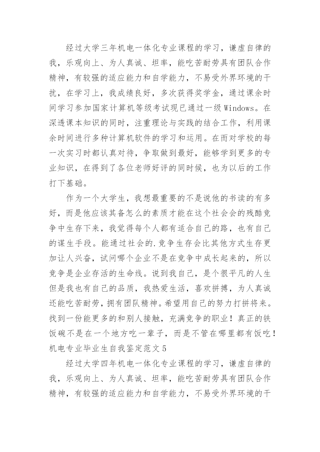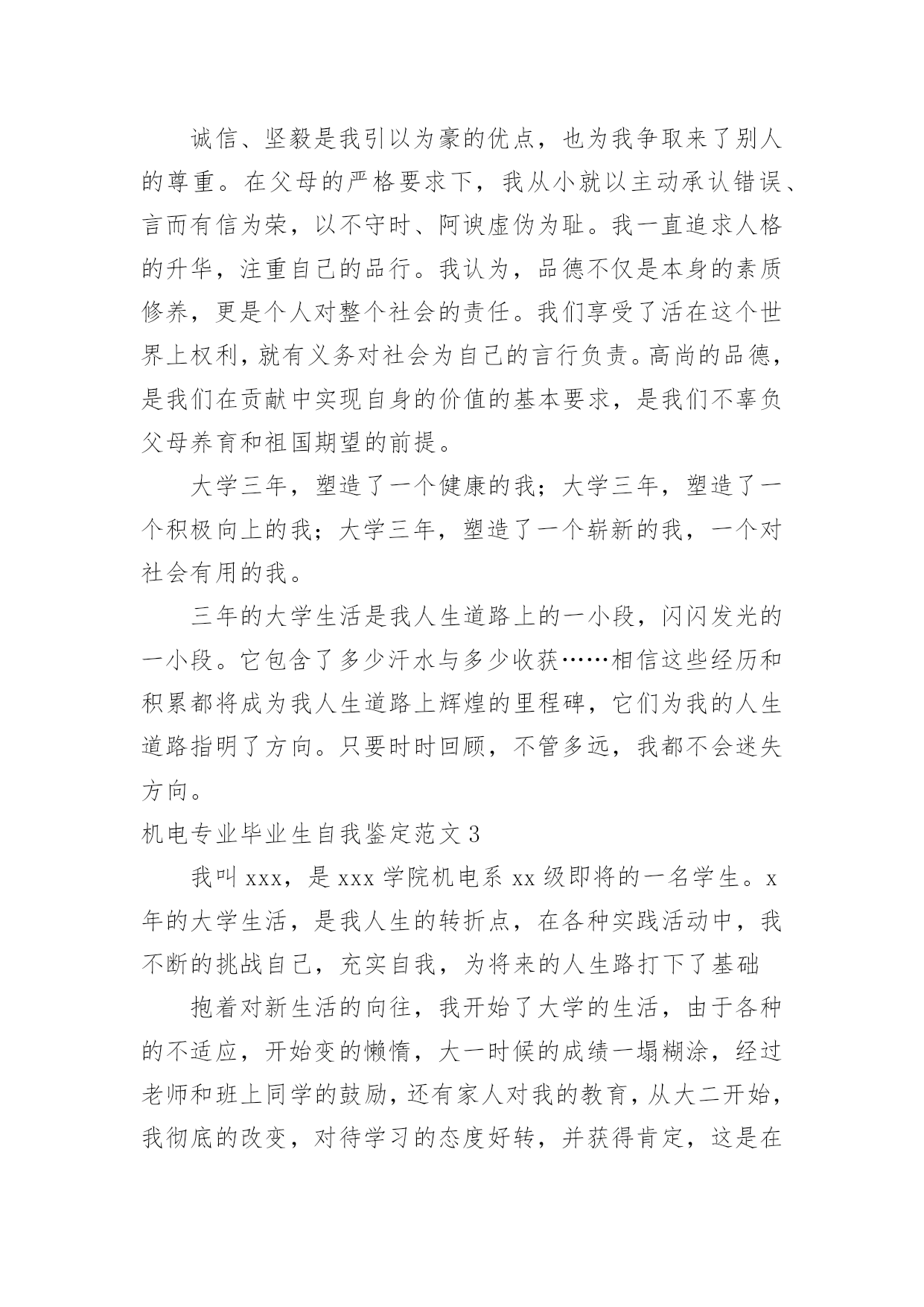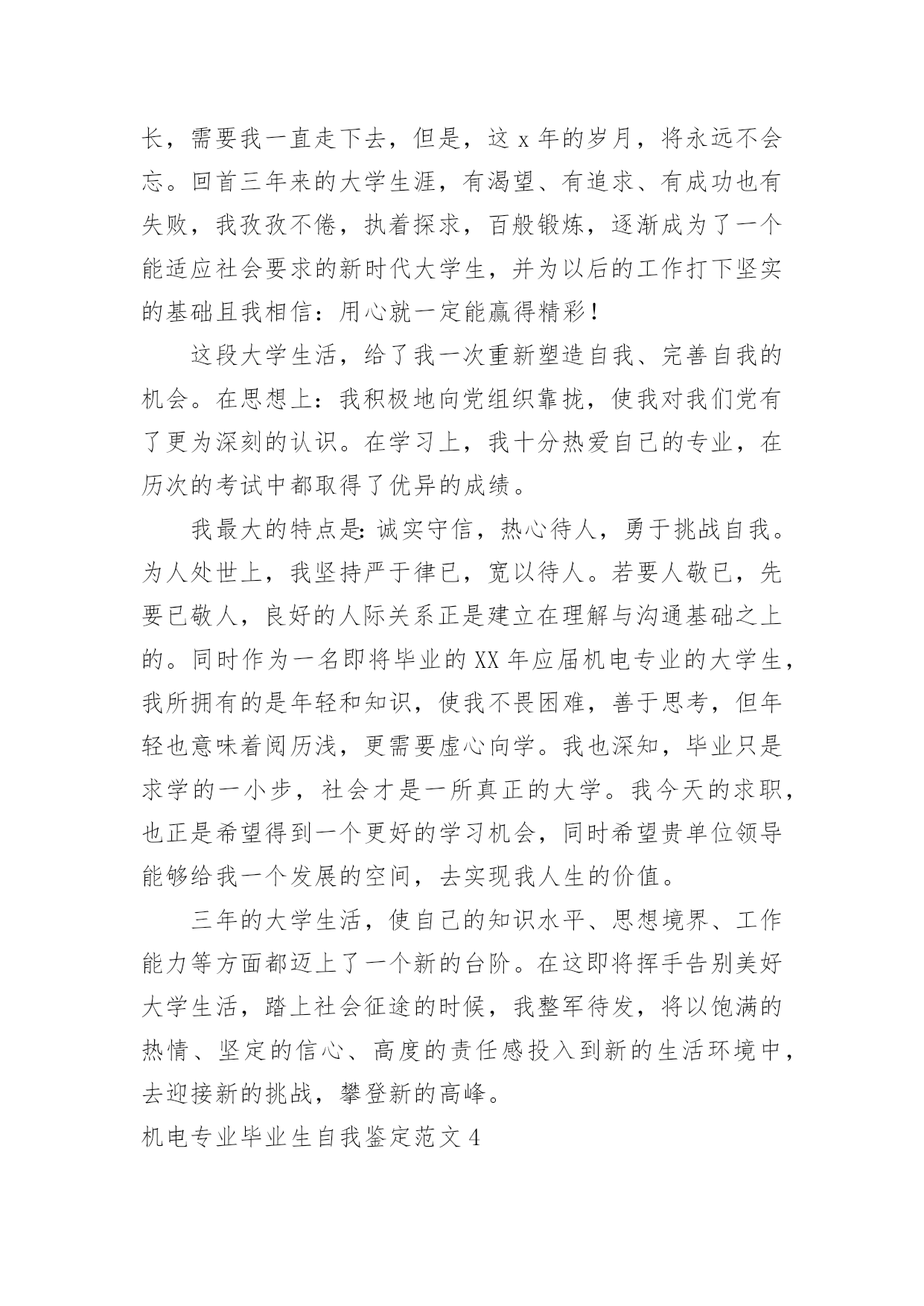 机电专业毕业生自我鉴定机电专业毕业生自我鉴定范文自我鉴定是一个人在某个阶段的学习和工作生活等表现的一个自我总结,自我鉴定可以使我们更有效率,因此我们要做好总结,写好自我鉴定。那么如何把自我鉴定写出新花样呢?以下是小编为大家收集的机电专业毕业生自我鉴定范文,仅供参考,欢迎大家阅读。机电专业毕业生自我鉴定范文1我叫xx,是xx机电学院的学生,经过半年的学习与实践,我正式开始了在机电中心弱电部的工作。逐渐熟悉之后,工作中可能缺失了一些新鲜感,但仍有大量的技术知识、为人处世以及生活的态度、哲理需要不断学习。以下是我对这一年的工作所做的一个自我鉴定。业务技术方面,这一年里收获最多的莫过于对机场的网络结构以及管理和恢复有了相当的了解和学习。基本上一些常见的问题、故障能够及时的发现并熟练处理。诸如对arp病毒的防范、发现、处理,对新增网络端口的开设等等。其间,协助xxx对机场现有生产网络进行了改造,将原本混杂于生产网中的部分上网用端口重新单独划分。以此有效的防范了病毒的入侵与传播,很好的保证了生产网的正常运行。此外,在离港、航显、中央系统等方面也已经能够较好的处理相应的故障。其实工作的内容可能每年都大同小异,但今年的不平凡缺注定给我的人生观、价值观有着很大的影响,也是我今年工作的最大收获。5月12日,当我照常巡视于候机楼内c指廊,未曾经历过的地震发生了。初时的'慌乱之后我意识到了自己的职责,开始协助疏散楼内的旅客。现在想来,虽然那时有些可笑的感到自己可能命不久矣,但全身心的希望自己能够死前多做一点有用的事、多尽一份职责,还是感到相当骄傲的。待出港指廊内已再无旅客,我也退到了一楼进港大厅外。无意间我看到了迎接旅客的人们不断涌向两块led航班显示大屏,对自己的亲朋好友是否安全到达焦急万分。此刻我知道前来的所有航班肯定已经备降或返航,但留在这里的人们无疑是不安全的,所以需要立即关掉led大屏以利于疏散人群、避免误导。但惭愧的是当时对led大屏的操作不熟练也不清楚其电源位于主机房内,致使无效操作,最终只有帮忙劝阻人群。可以说这一天的工作将铭记一生,因为它教会了我什么是责任,给了我一次面对死亡、挑战恐惧的机会,是我这一年,这一辈子最大的收获之一。在过去,有些事情处置欠妥,也有遇到一些不顺心不如意之事,但嘴上笑着抱怨的工作却不断历练着我成长。在今后,我将以更成熟的心态去面对,从技术熟练程度到管理理念,完成一个质的飞跃,为xx创造一个辉煌的明天。机电专业毕业生自我鉴定范文2我已完成在电视大学机电专业的学习了。在大学三年中,我所获颇丰。从学业到个人素质,都得到了充分的培养和锻炼,这是充实且有难忘的三年。我始终以提高自身的综合素质为目标,以自我的全面发展为努力方向,树立正确的人生观、价值观和世界观。毕业之际,回顾三年来的学习、工作以及生活,做自我鉴定如下:我在思想觉悟上始终对自己有较高的要求,能用科学发展观来认识世界认识社会,能清醒的意识到自己所担负的社会责任,对个人的人生理想和发展目标,有了相对成熟的认识和定位。在专业课程的学习上,我极大程度的提高了自学能力。根据专业方向的要求,我有针对性的自学了有关课程,掌握了很多有关知识,为专业课程的`学习打下扎实基础;此外,我也涉猎了一部分其他课程,开阔视野,对专业知识的应用背景以及整个学科的结构有了宏观的认识。在平时生活中,我和善热情,和同学关系融洽。回顾三年,我很高兴在同学有困难的时候曾帮助过他们,我也会永远感激着在我有困难时无私的伸出了援助之手兄弟姊妹们。我个人认为,自己最大的缺点就是过于执着,有时甚至可以说有些固执。这可能与我在学习中爱动脑筋、常钻牛角尖有关。这在某些方面确实有些裨益,但是很多时侯,这也会影响到对事物的全面认识,甚至不经意地会在某些程度上伤害到他人。我应该学会变通,不能古板得像不谙世事的书呆子。诚信、坚毅是我引以为豪的优点,也为我争取来了别人的尊重。在父母的严格要求下,我从小就以主动承认错误、言而有信为荣,以不守时、阿谀虚伪为耻。我一直追求人格的升华,注重自己的品行。我认为,品德不仅是本身的素质修养,更是个人对整个社会的责任。我们享受了活在这个世界上权利,就有义务对社会为自己的言行负责。高尚的品德,是我们在贡献中实现自身的价值的基本要求,是我们不辜负父母养育和祖国期望的前提。大学三年,塑造了一个健康的我;大学三年,塑造了一个积极向上的我;大学三年,塑造了一个崭新的我,一个对社会有用的我。三年的大学生活是我人生道路上的一小段,闪闪发光的一小段。它包含了多少汗水与多少收获……相信这些经历和积累都将成为我人生道路上辉煌的里程碑,它们为我的人生道路指明了方向。只要时时回顾,不管多远,我都不会迷失方向。机电专业毕业生自我鉴定范文3我叫xxx,是xxx学院机电系xx级即将的一名学生。x年的大学生活,是