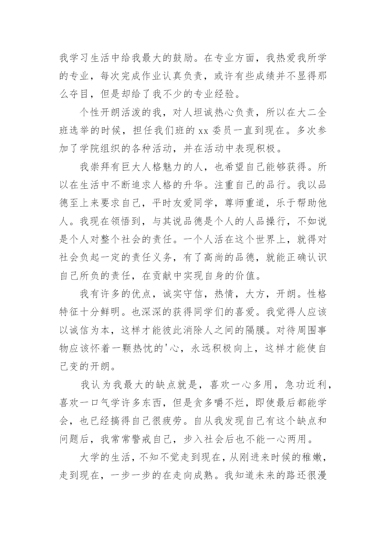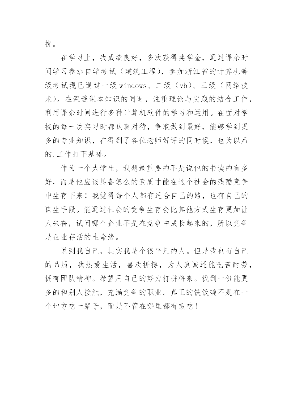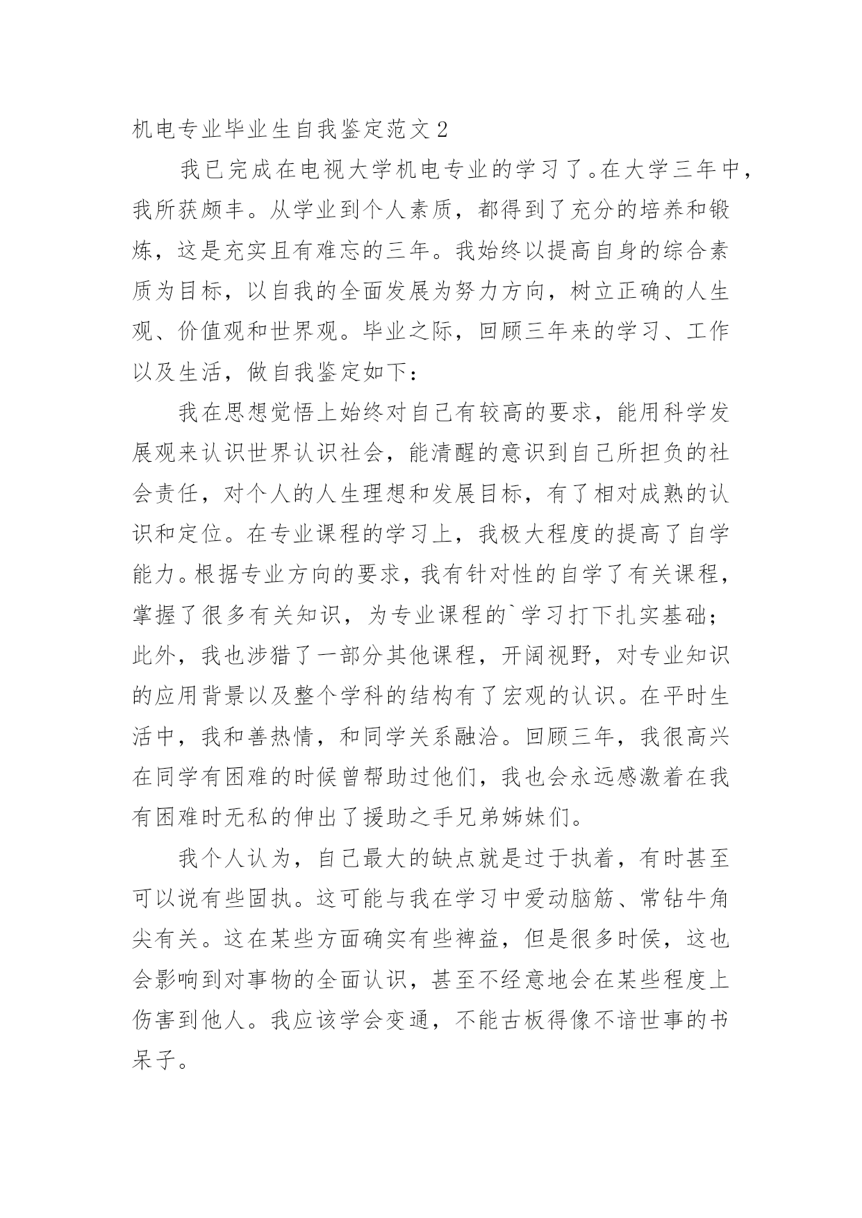 机电专业毕业生自我鉴定机电专业毕业生自我鉴定范文自我鉴定是一个人在某个阶段的学习和工作生活等表现的一个自我总结,自我鉴定可以使我们更有效率,因此我们要做好总结,写好自我鉴定。那么如何把自我鉴定写出新花样呢?以下是小编为大家收集的机电专业毕业生自我鉴定范文,仅供参考,欢迎大家阅读。机电专业毕业生自我鉴定范文1我叫xx,是xx机电学院的学生,经过半年的学习与实践,我正式开始了在机电中心弱电部的工作。逐渐熟悉之后,工作中可能缺失了一些新鲜感,但仍有大量的技术知识、为人处世以及生活的态度、哲理需要不断学习。以下是我对这一年的工作所做的一个自我鉴定。业务技术方面,这一年里收获最多的莫过于对机场的网络结构以及管理和恢复有了相当的了解和学习。基本上一些常见的问题、故障能够及时的发现并熟练处理。诸如对arp病毒的防范、发现、处理,对新增网络端口的开设等等。其间,协助xxx对机场现有生产网络进行了改造,将原本混杂于生产网中的部分上网用端口重新单独划分。以此有效的防范了病毒的入侵与传播,很好的保证了生产网的正常运行。此外,在离港、航显、中央系统等方面也已经能够较好的处理相应的故障。其实工作的内容可能每年都大同小异,但今年的不平凡缺注定给我的人生观、价值观有着很大的影响,也是我今年工作的最大收获。5月12日,当我照常巡视于候机楼内c指廊,未曾经历过的地震发生了。初时的'慌乱之后我意识到了自己的职责,开始协助疏散楼内的旅客。现在想来,虽然那时有些可笑的感到自己可能命不久矣,但全身心的希望自己能够死前多做一点有用的事、多尽一份职责,还是感到相当骄傲的。待出港指廊内已再无旅客,我也退到了一楼进港大厅外。无意间我看到了迎接旅客的人们不断涌向两块led航班显示大屏,对自己的亲朋好友是否安全到达焦急万分。此刻我知道前来的所有航班肯定已经备降或返航,但留在这里的人们无疑是不安全的,所以需要立即关掉led大屏以利于疏散人群、避免误导。但惭愧的是当时对led大屏的操作不熟练也不清楚其电源位于主机房内,致使无效操作,最终只有帮忙劝阻人群。可以说这一天的工作将铭记一生,因为它教会了我什么是责任,给了我一次面对死亡、挑战恐惧的机会,是我这一年,这一辈子最大的收获之一。在过去,有些事情处置欠妥,也有遇到一些不顺心不如意之事,但嘴上笑着抱怨的工作却不断历练着我成长。在今后,我将以更成熟的心态去面对,从技术熟练程度到管理理念,完成一个质的飞跃,为xx创造一个辉煌的明天。机电专业毕业生自我鉴定范文2我已完成在电视大学机电专业的学习了。在大学三年中,我所获颇丰。从学业到个人素质,都得到了充分的培养和锻炼,这是充实且有难忘的三年。我始终以提高自身的综合素质为目标,以自我的全面发展为努力方向,树立正确的人生观、价值观和世界观。毕业之际,回顾三年来的学习、工作以及生活,做自我鉴定如下:我在思想觉悟上始终对自己有较高的要求,能用科学发展观来认识世界认识社会,能清醒的意识到自己所担负的社会责任,对个人的人生理想和发展目标,有了相对成熟的认识和定位。在专业课程的学习上,我极大程度的提高了自学能力。根据专业方向的要求,我有针对性的自学了有关课程,掌握了很多有关知识,为专业课程的`学习打下扎实基础;此外,我也涉猎了一部分其他课程,开阔视野,对专业知识的应用背景以及整个学科的结构有了宏观的认识。在平时生活中,我和善热情,和同学关系融洽。回顾三年,我很高兴在同学有困难的时候曾帮助过他们,我也会永远感激着在我有困难时无私的伸出了援助之手兄弟姊妹们。我个人认为,自己最大的缺点就是过于执着,有时甚至可以说有些固执。这可能与我在学习中爱动脑筋、常钻牛角尖有关。这在某些方面确实有些裨益,但是很多时侯,这也会影响到对事物的全面认识,甚至不经意地会在某些程度上伤害到他人。我应该学会变通,不能古板得像不谙世事的书呆子。诚信、坚毅是我引以为豪的优点,也为我争取来了别人的尊重。在父母的严格要求下,我从小就以主动承认错误、言而有信为荣,以不守时、阿谀虚伪为耻。我一直追求人格的升华,注重自己的品行。我认为,品德不仅是本身的素质修养,更是个人对整个社会的责任。我们享受了活在这个世界上权利,就有义务对社会为自己的言行负责。高尚的品德,是我们在贡献中实现自身的价值的基本要求,是我们不辜负父母养育和祖国期望的前提。大学三年,塑造了一个健康的我;大学三年,塑造了一个积极向上的我;大学三年,塑造了一个崭新的我,一个对社会有用的我。三年的大学生活是我人生道路上的一小段,闪闪发光的一小段。它包含了多少汗水与多少收获……相信这些经历和积累都将成为我人生道路上辉煌的里程碑,它们为我的人生道路指明了方向。只要时时回顾,不管多远,我都不会迷失方向。机电专业毕业生自我鉴定范文3我叫xxx,是xxx学院机电系xx级即将的一名学生。x年的大学生活,是