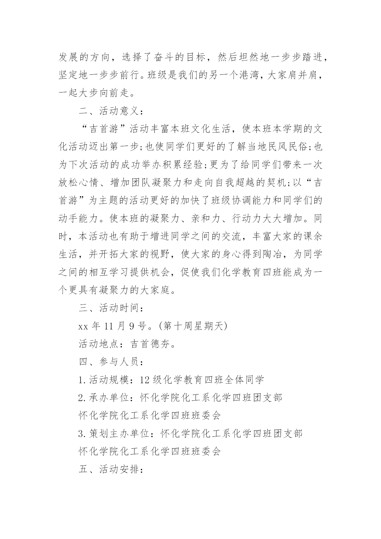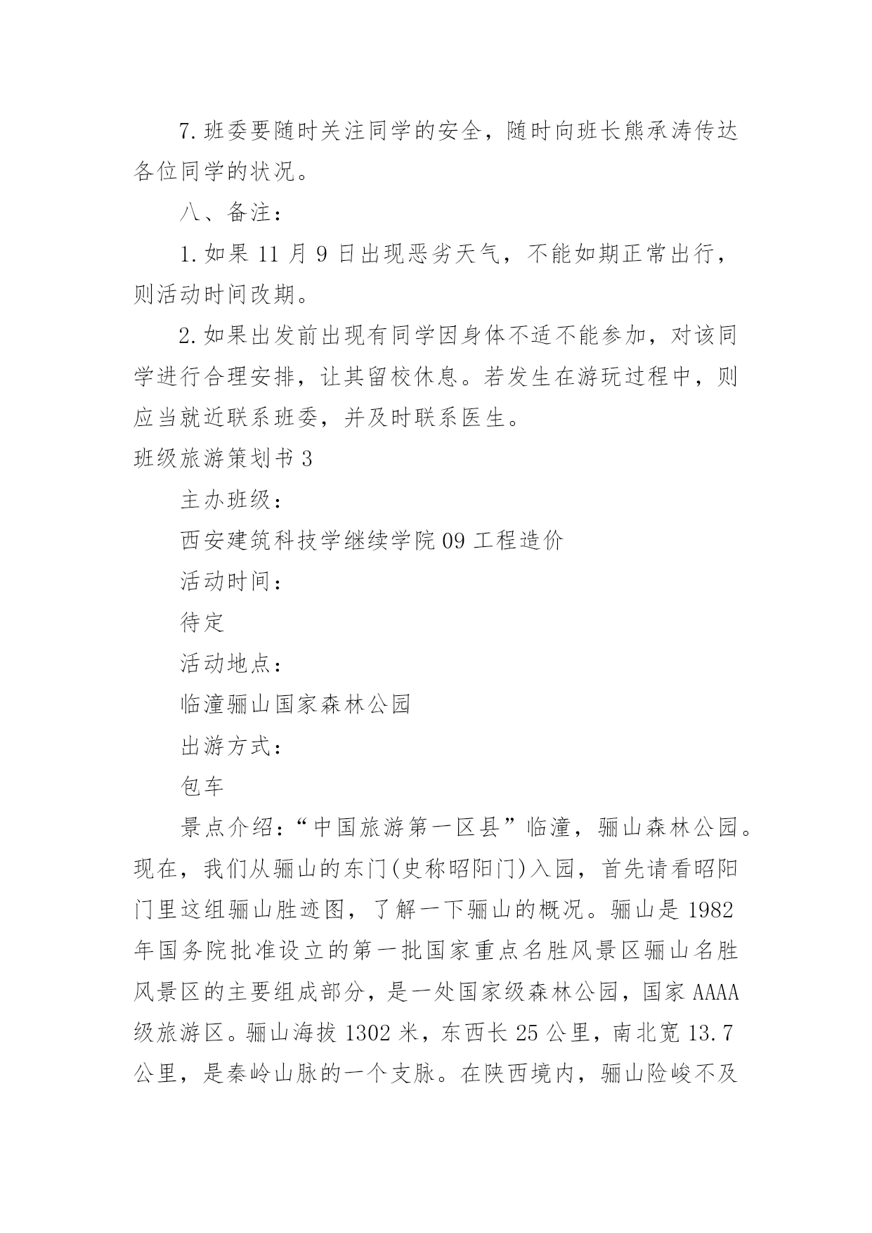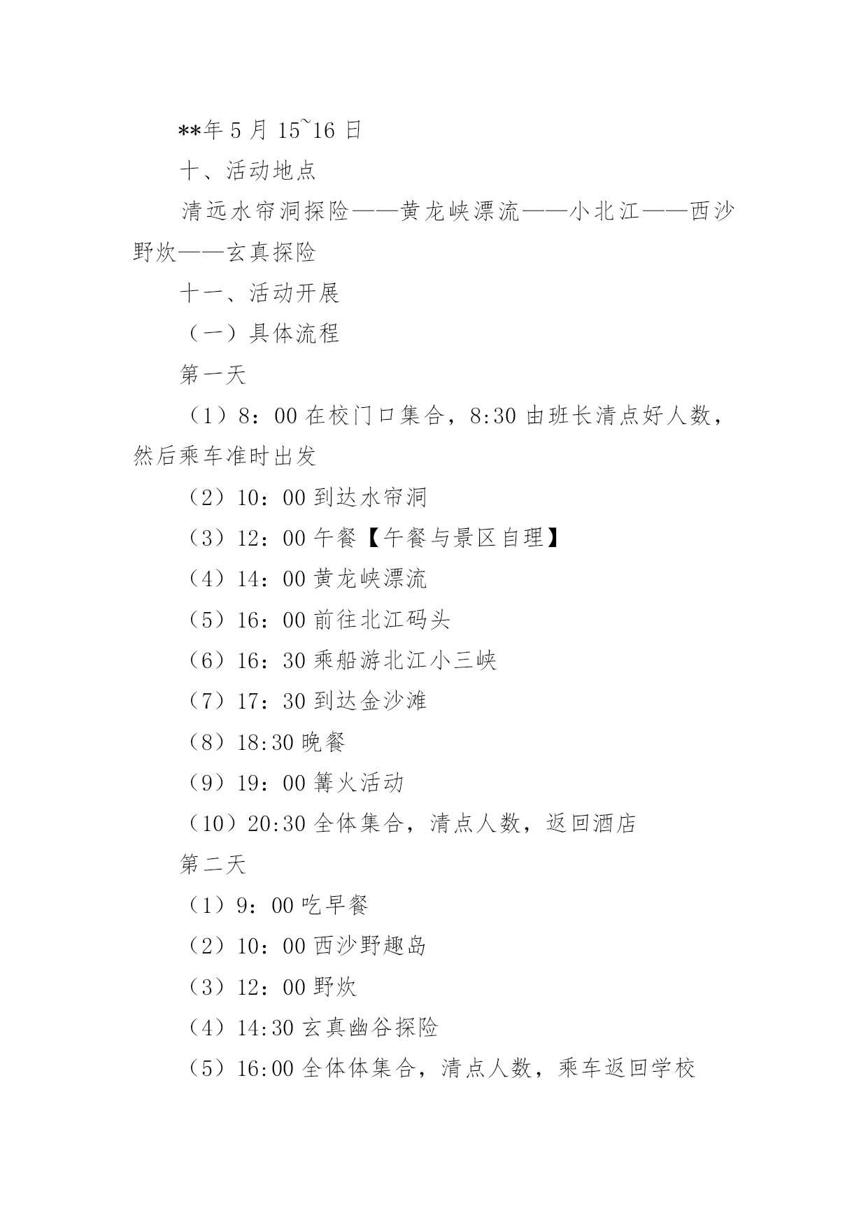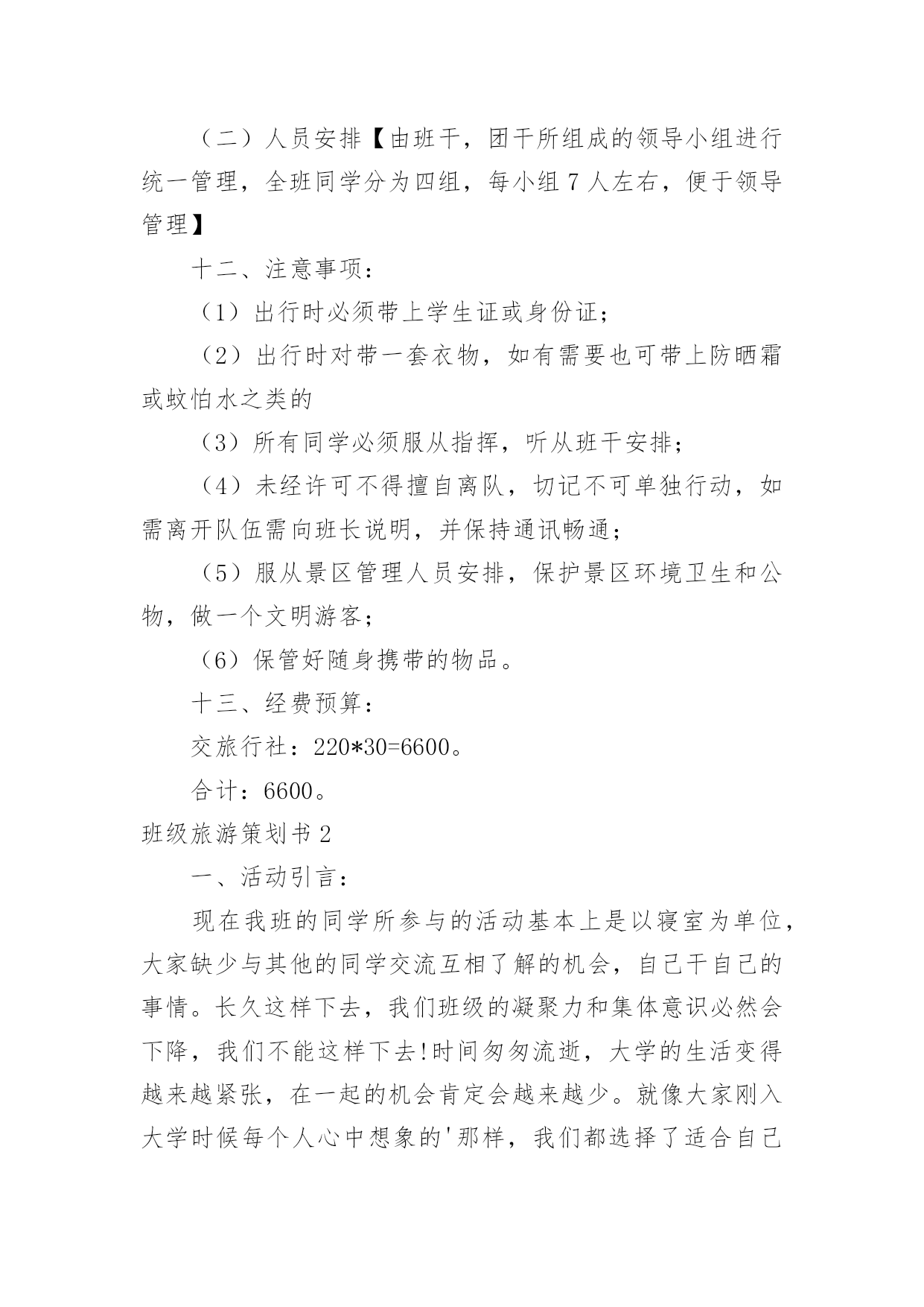 班级旅游策划书班级旅游策划书转眼间一段时间的工作告一段落了,我们的工作又将翻开新的一页,迎来新的任务和目标,让我们一起来学习写策划书吧。相信写策划书是一个让许多人都头痛的问题,以下是小编收集整理的班级旅游策划书,希望对大家有所帮助。班级旅游策划书1一、活动背景:自国际物流一班成立以来,还未组织过大型的集体外出旅游活动。此时正值五月的好时节,是一年中最佳出游的大好时机。为了加强集体凝聚力,利用周末假期开展一次集体旅游活动,让同学们更好的接触自然,感受生活,同时进一步增进同学们之间的友谊。二、活动目的:本次活动旨在为全班同学提供一次集体春游踏青的机会。让同学们亲密接触大自然,欣赏春天美景,修身养性,陶冶情操;同时了解不同地域的风土人情,扩展视野的同时也锻炼了动手能力和生活技巧。更主要的是通过这次旅游游增进同学们之间的友谊,加强交流与沟通,促进集体的团结协作,培养同学们的团队精神,同时增强班级凝聚力和集体荣誉感。三、活动主题:游清远山水,聚班级之魂四、活动可行性分析:(1)自班级成立以来,同学们迫切希望举行一次集体旅游活动,以加强男女生之间的交流,促进班级的凝聚力,使班级更好的'发展;(2)此次活动经班委精心策划,并得到大部分班级同学的支持,并得到辅导员和导师的认同;(3)活动前期已对天气与景区进行了解,也咨询过多个旅行社并决定包团旅游。五、活动前期准备:(1)留心观察最近几天天气情况;(2)联系旅行社,选择最实惠的旅行社,进行包团旅游;(3)全班同学学习旅游安全知识,了解时间安排,旅游路线,活动流程;(4)活动经费估价,经费筹备。六、活动方式:随团旅行七、活动对象:**国际物流一班同学全体同学八、组织人员**国际物流一班班委九、活动时间**年5月15~16日十、活动地点清远水帘洞探险——黄龙峡漂流——小北江——西沙野炊——玄真探险十一、活动开展(一)具体流程第一天(1)8:00在校门口集合,8:30由班长清点好人数,然后乘车准时出发(2)10:00到达水帘洞(3)12:00午餐【午餐与景区自理】(4)14:00黄龙峡漂流(5)16:00前往北江码头(6)16:30乘船游北江小三峡(7)17:30到达金沙滩(8)18:30晚餐(9)19:00篝火活动(10)20:30全体集合,清点人数,返回酒店第二天(1)9:00吃早餐(2)10:00西沙野趣岛(3)12:00野炊(4)14:30玄真幽谷探险(5)16:00全体体集合,清点人数,乘车返回学校(二)人员安排【由班干,团干所组成的领导小组进行统一管理,全班同学分为四组,每小组7人左右,便于领导管理】十二、注意事项:(1)出行时必须带上学生证或身份证;(2)出行时对带一套衣物,如有需要也可带上防晒霜或蚊怕水之类的(3)所有同学必须服从指挥,听从班干安排;(4)未经许可不得擅自离队,切记不可单独行动,如需离开队伍需向班长说明,并保持通讯畅通;(5)服从景区管理人员安排,保护景区环境卫生和公物,做一个文明游客;(6)保管好随身携带的物品。十三、经费预算:交旅行社:220*30=6600。合计:6600。班级旅游策划书2一、活动引言:现在我班的同学所参与的活动基本上是以寝室为单位,大家缺少与其他的同学交流互相了解的机会,自己干自己的事情。长久这样下去,我们班级的凝聚力和集体意识必然会下降,我们不能这样下去!时间匆匆流逝,大学的生活变得越来越紧张,在一起的机会肯定会越来越少。就像大家刚入大学时候每个人心中想象的'那样,我们都选择了适合自己发展的方向,选择了奋斗的目标,然后坦然地一步步踏进,坚定地一步步前行。班级是我们的另一个港湾,大家肩并肩,一起大步向前走。二、活动意义:“吉首游”活动丰富本班文化生活,使本班本学期的文化活动迈出第一步;也使同学们更好的了解当地民风民俗;也为下次活动的成功举办积累经验;更为了给同学们带来一次放松心情、增加团队凝聚力和走向自我超越的契机;以“吉首游”为主题的活动更好的加快了班级协调能力和同学们的动手能力。使本班的凝聚力、亲和力、行动力大大增加。同时,本活动也有助于增进同学之间的交流,丰富大家的课余生活,并开拓大家的视野,使大家的身心得到陶冶,为同学之间的相互学习提供机会,促使我们化学教育四班能成为一个更具有凝聚力的大家庭。三、活动时间:xx年11月9号。(第十周星期天)活动地点:吉首德夯。四、参与人员:1.活动规模:12级化学教育四班全体同学2.承办单位:怀化学院化工系化学四班团支部怀化学院化工系化学四班班委会3.策划主办单位:怀化学院化工系化学四班团支部怀化学院化工系化学四班班委会五、活动安排:1.早上全体集合清点人数重重声明安全第一从学校出发去火车站。2.大概9点多到吉首。转车由各组组长带队到达德夯游玩。3.组织全体同学进行住宿安排并且安排好晚餐。4.吃完晚