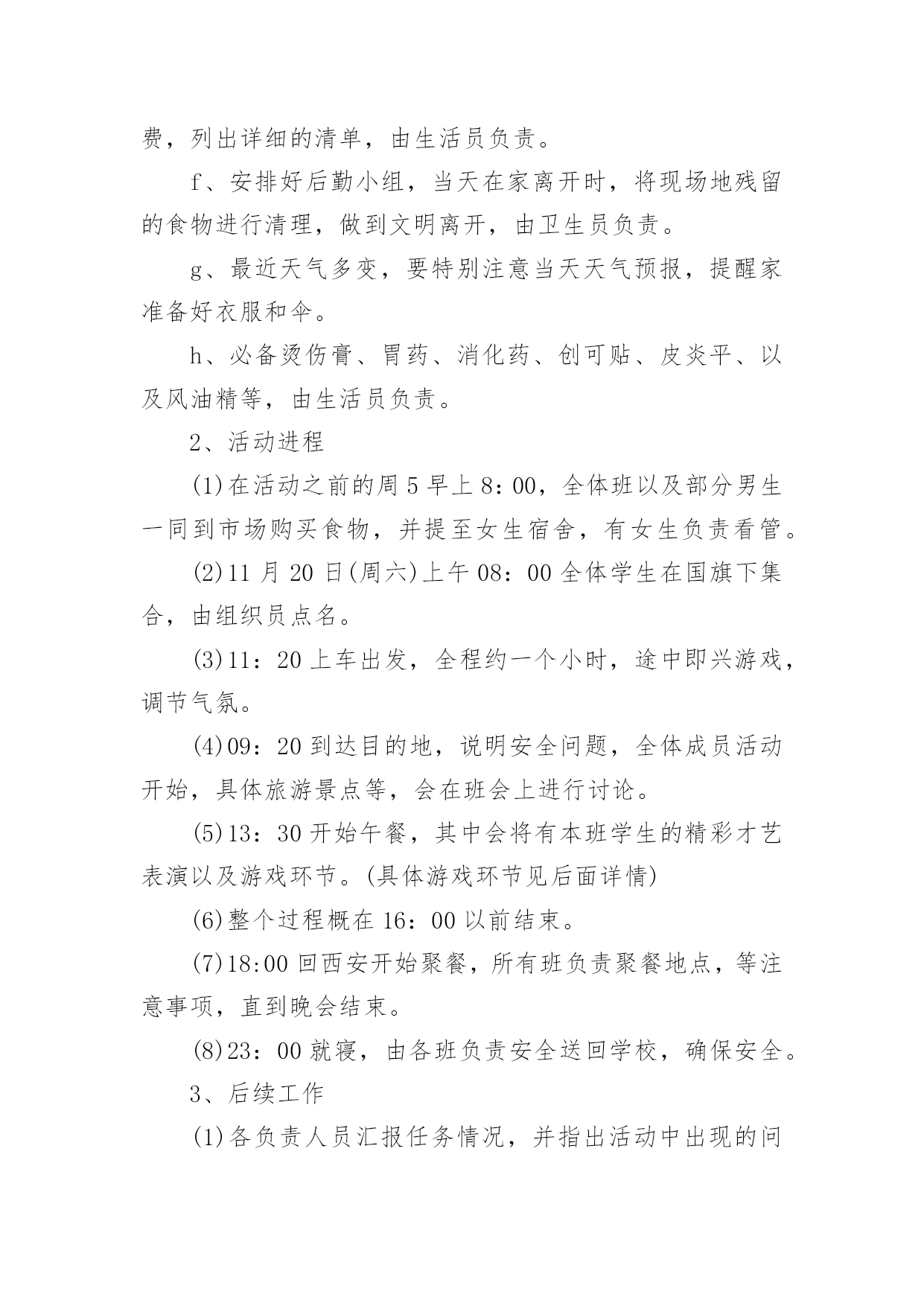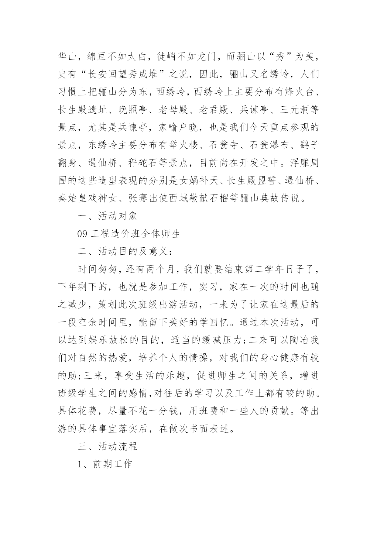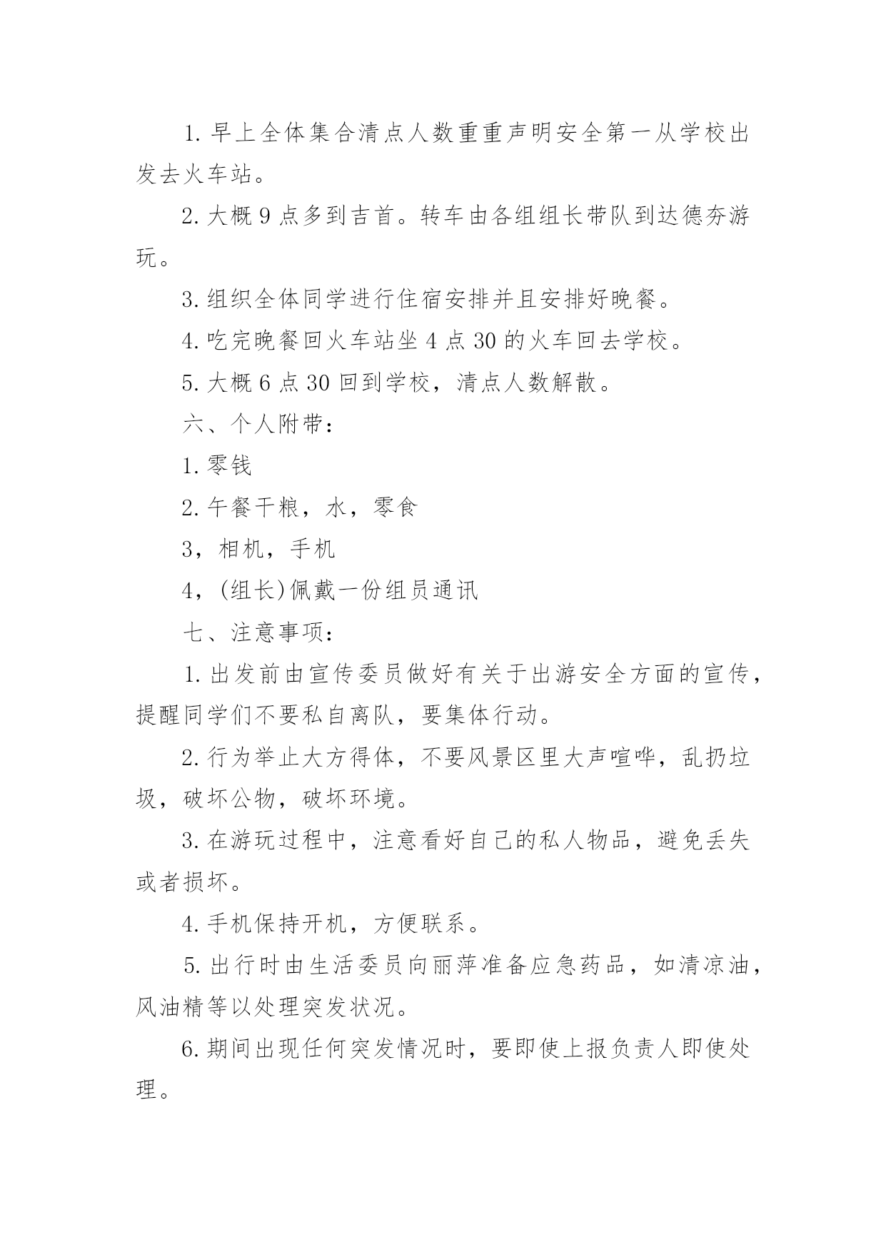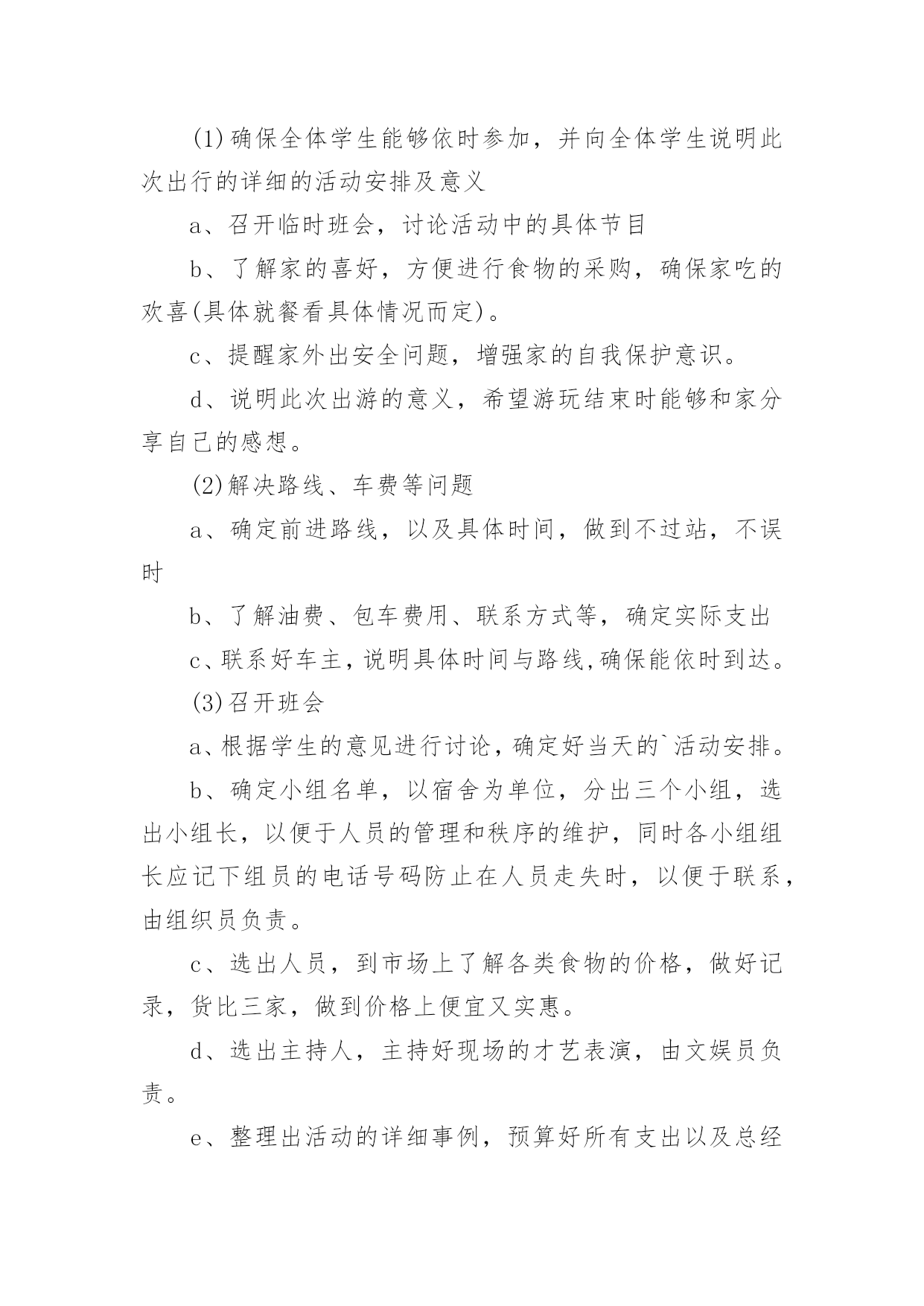 班级旅游策划书班级旅游策划书转眼间一段时间的工作告一段落了,我们的工作又将翻开新的一页,迎来新的任务和目标,让我们一起来学习写策划书吧。相信写策划书是一个让许多人都头痛的问题,以下是小编收集整理的班级旅游策划书,希望对大家有所帮助。班级旅游策划书1一、活动背景:自国际物流一班成立以来,还未组织过大型的集体外出旅游活动。此时正值五月的好时节,是一年中最佳出游的大好时机。为了加强集体凝聚力,利用周末假期开展一次集体旅游活动,让同学们更好的接触自然,感受生活,同时进一步增进同学们之间的友谊。二、活动目的:本次活动旨在为全班同学提供一次集体春游踏青的机会。让同学们亲密接触大自然,欣赏春天美景,修身养性,陶冶情操;同时了解不同地域的风土人情,扩展视野的同时也锻炼了动手能力和生活技巧。更主要的是通过这次旅游游增进同学们之间的友谊,加强交流与沟通,促进集体的团结协作,培养同学们的团队精神,同时增强班级凝聚力和集体荣誉感。三、活动主题:游清远山水,聚班级之魂四、活动可行性分析:(1)自班级成立以来,同学们迫切希望举行一次集体旅游活动,以加强男女生之间的交流,促进班级的凝聚力,使班级更好的'发展;(2)此次活动经班委精心策划,并得到大部分班级同学的支持,并得到辅导员和导师的认同;(3)活动前期已对天气与景区进行了解,也咨询过多个旅行社并决定包团旅游。五、活动前期准备:(1)留心观察最近几天天气情况;(2)联系旅行社,选择最实惠的旅行社,进行包团旅游;(3)全班同学学习旅游安全知识,了解时间安排,旅游路线,活动流程;(4)活动经费估价,经费筹备。六、活动方式:随团旅行七、活动对象:**国际物流一班同学全体同学八、组织人员**国际物流一班班委九、活动时间**年5月15~16日十、活动地点清远水帘洞探险——黄龙峡漂流——小北江——西沙野炊——玄真探险十一、活动开展(一)具体流程第一天(1)8:00在校门口集合,8:30由班长清点好人数,然后乘车准时出发(2)10:00到达水帘洞(3)12:00午餐【午餐与景区自理】(4)14:00黄龙峡漂流(5)16:00前往北江码头(6)16:30乘船游北江小三峡(7)17:30到达金沙滩(8)18:30晚餐(9)19:00篝火活动(10)20:30全体集合,清点人数,返回酒店第二天(1)9:00吃早餐(2)10:00西沙野趣岛(3)12:00野炊(4)14:30玄真幽谷探险(5)16:00全体体集合,清点人数,乘车返回学校(二)人员安排【由班干,团干所组成的领导小组进行统一管理,全班同学分为四组,每小组7人左右,便于领导管理】十二、注意事项:(1)出行时必须带上学生证或身份证;(2)出行时对带一套衣物,如有需要也可带上防晒霜或蚊怕水之类的(3)所有同学必须服从指挥,听从班干安排;(4)未经许可不得擅自离队,切记不可单独行动,如需离开队伍需向班长说明,并保持通讯畅通;(5)服从景区管理人员安排,保护景区环境卫生和公物,做一个文明游客;(6)保管好随身携带的物品。十三、经费预算:交旅行社:220*30=6600。合计:6600。班级旅游策划书2一、活动引言:现在我班的同学所参与的活动基本上是以寝室为单位,大家缺少与其他的同学交流互相了解的机会,自己干自己的事情。长久这样下去,我们班级的凝聚力和集体意识必然会下降,我们不能这样下去!时间匆匆流逝,大学的生活变得越来越紧张,在一起的机会肯定会越来越少。就像大家刚入大学时候每个人心中想象的'那样,我们都选择了适合自己发展的方向,选择了奋斗的目标,然后坦然地一步步踏进,坚定地一步步前行。班级是我们的另一个港湾,大家肩并肩,一起大步向前走。二、活动意义:“吉首游”活动丰富本班文化生活,使本班本学期的文化活动迈出第一步;也使同学们更好的了解当地民风民俗;也为下次活动的成功举办积累经验;更为了给同学们带来一次放松心情、增加团队凝聚力和走向自我超越的契机;以“吉首游”为主题的活动更好的加快了班级协调能力和同学们的动手能力。使本班的凝聚力、亲和力、行动力大大增加。同时,本活动也有助于增进同学之间的交流,丰富大家的课余生活,并开拓大家的视野,使大家的身心得到陶冶,为同学之间的相互学习提供机会,促使我们化学教育四班能成为一个更具有凝聚力的大家庭。三、活动时间:xx年11月9号。(第十周星期天)活动地点:吉首德夯。四、参与人员:1.活动规模:12级化学教育四班全体同学2.承办单位:怀化学院化工系化学四班团支部怀化学院化工系化学四班班委会3.策划主办单位:怀化学院化工系化学四班团支部怀化学院化工系化学四班班委会五、活动安排:1.早上全体集合清点人数重重声明安全第一从学校出发去火车站。2.大概9点多到吉首。转车由各组组长带队到达德夯游玩。3.组织全体同学进行住宿安排并且安排好晚餐。4.吃完晚