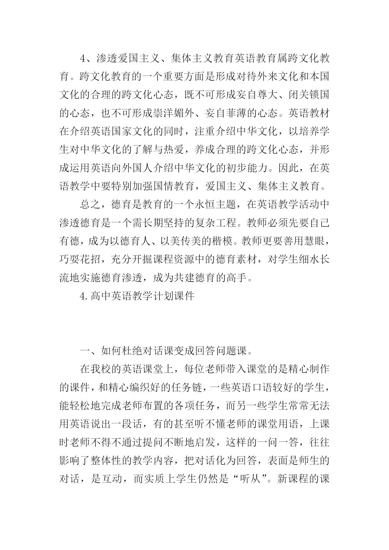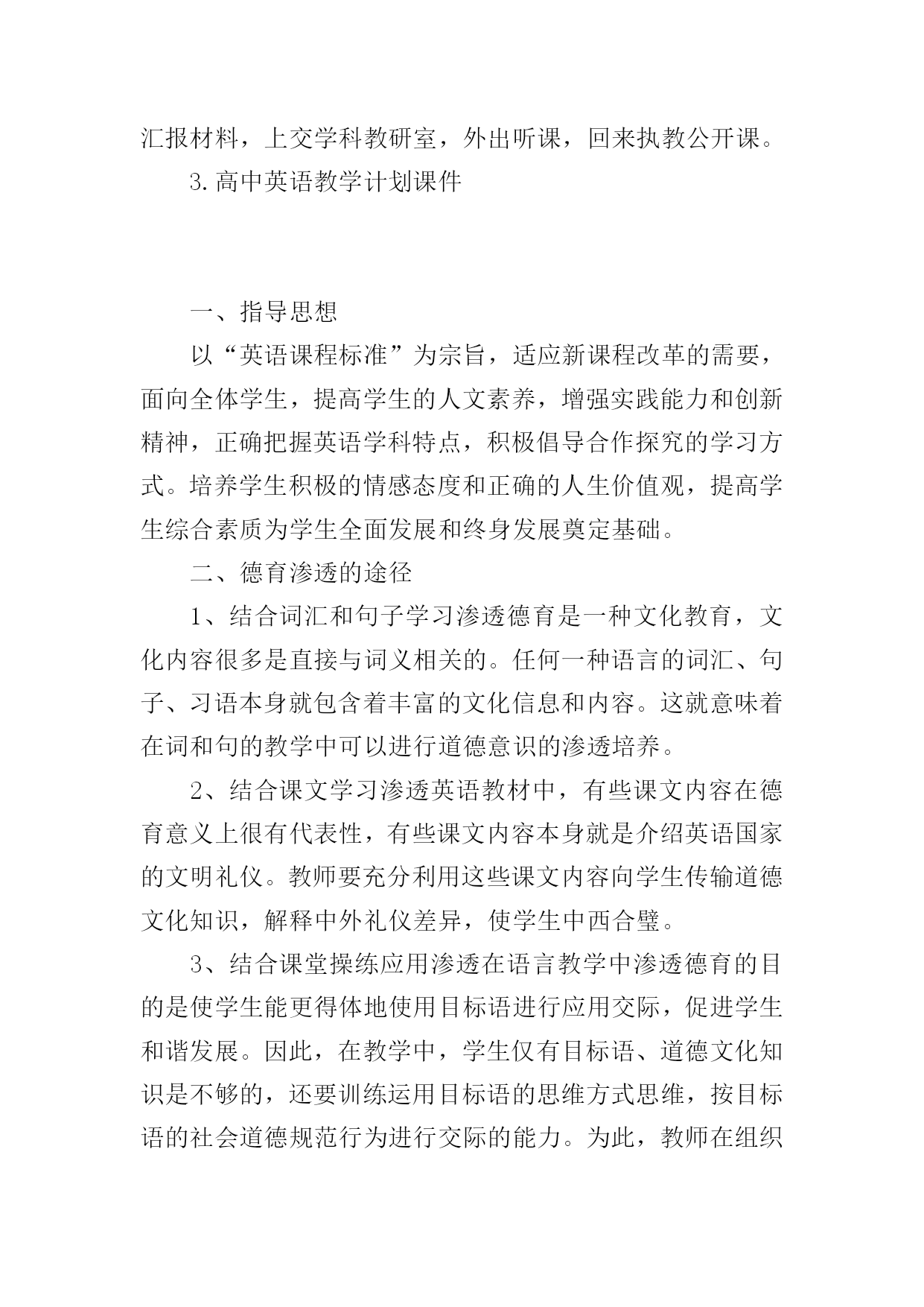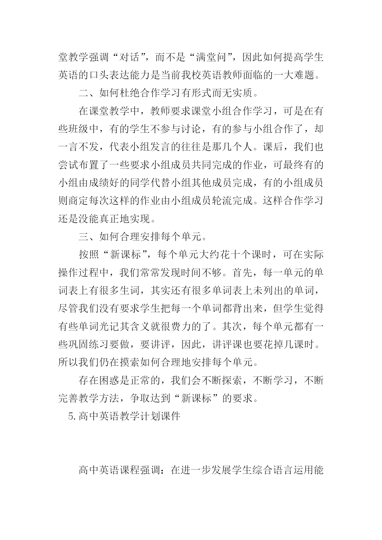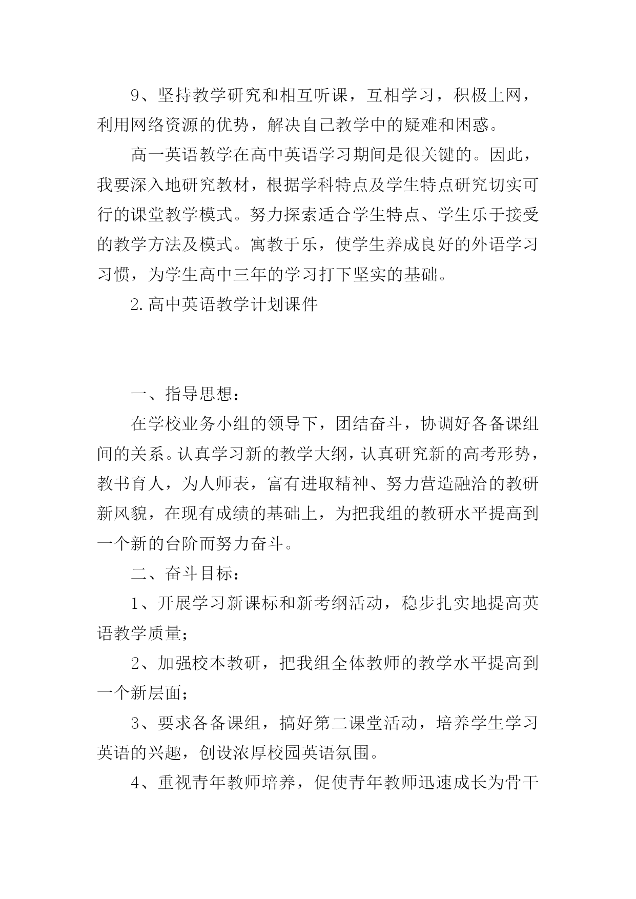 高中英语教学计划课件精选(5篇)1.高中英语教学计划课件高一是高中教育的起始阶段,而第一学期更是打好基础的关键,在这个学期培养学生浓厚的英语学习兴趣和良好的英语学习习惯就显得尤为重要,为了使学生圆满完成新课标要求的各项学习任务,尽快适应新的环境,在各方面能够健康发展,把英语教学搞的有声有色,必须有一个切实可行的教学计划。特制定英语教学计划如下:一、教材分析教材是“课标”的具体表现,是学生学习的“蓝本”。现在使用的外研版英语教材每一个模块都围绕一个主要话题开展听说读写活动,循序渐进,循环反复,符合学生的认知规律,有利于学生构建知识系统。教材打破了传统的体系,用新的理念、新的方式、新的体系呈现出来。我们应当以积极的态度去学习教材,研究教材,理解教材各个栏目的编写意图,限度地发挥各个栏目的作用。一方面我们要努力去理解教材、适应教材、用好教材,一方面我们又要努力站在教材之上使用教材,要根据教学目标和学生实际对其进行大胆的取舍和重组,是教材为我所用,而不是被教材牵着鼻子走。二、教学目标1、使学生明确学习英语的目的性,发展自主学习的能力和合作精神;2、做好初高中的教学衔接工作,让学生了解和适应高中的英语学习;3、在培养学生的语言知识、语言技能、情感态度、学习策略和文化意识等素养的基础上发展学生综合运用语言的能力,培养学生在获取信息,处理信息,分析问题解决问题的能力,以及运用英语进行思维和表达的能力。4、优化学生的英语学习方法,使他们能通过观察、体验、探究等主动学习的方法,充分发挥自己的学习潜能,形成有效的学习策略,提高自主学习的能力。三、学生现状分析针对我校学生构成复杂,普遍英语底子差,基础薄,英语水平参差不齐,发音不标准的实际情况,打算在高一起始阶段的英语教学中,本着低起点,爬坡走,抓习惯的原则,长期不懈地抓好学生的学习英语的的兴趣和习惯养成。指导思想是坚持“狠抓双基,改进学法,激发兴趣,提高学习英语的能力”四、工作措施1、继军训后结合学生初中英语实际状况,用一个星期左右复习五种简单句型和语音知识,为平稳向高中教材过度奠定基础,梳理初中知识,配发相应练习,通过习题讲练,激发学生对新知识的求知欲,顺利进入新教材的学习。在之后的教学中,将会穿插学习高考试题中每个题型的解题技巧。2、为了使学生打牢基础不至于出现知识断层,本学期要有计划的把学生初中学过的但掌握不好的时态、句式、定语从句、状语从句、动词不定式以及部分掌握不好的词汇、短语、句型分插于新课教学中。3、认真研究新课程标准,尤其与旧大纲不同的地方,清楚哪些内容是新增加的,哪些内容是已经删掉的,哪些内容初中已经学的。认真研究新教材,在集体备课的基础上认真备课、上课,认真进行自习辅导和批改作业。4、为了减轻高三听力训练的压力,提高学生的听力水平,从高一就开始就对学生进行听力训练。5、单词一直是学生的难点、薄弱点,直接影响学生综合能力的提高,在教学中要重视词汇教学,狠抓单词的记忆与巩固以及对词汇的意义与用法的掌握。使学生掌握科学的单词记忆方法和养成勤查词典的习惯。6、坚持每两周一次作文训练,训练题材、方法力求多样化,并能及时进行讲评。鼓励学生写英文日记,对个别英语特差的学生尽量多批改、多指导。7、阅读理解能力的培养是高中教学的重点,也是高考的重头戏。在单元教学中配发适当的阅读练习,在平时考测试卷中阅读篇幅占一定比例,突出重点。有计划的指导学生掌握科学的阅读方法。8、集体备课是提高教学质量和整体教学水平的有力保证,有利于经验丰富的教师与年轻教师互为补充、共同提高。坚持每周一次的集体备课,集中带课教师的智慧和经验,化解模块教学中的难点,减少教学中的授课弯路,突出重点。9、坚持教学研究和相互听课,互相学习,积极上网,利用网络资源的优势,解决自己教学中的疑难和困惑。高一英语教学在高中英语学习期间是很关键的。因此,我要深入地研究教材,根据学科特点及学生特点研究切实可行的课堂教学模式。努力探索适合学生特点、学生乐于接受的教学方法及模式。寓教于乐,使学生养成良好的外语学习习惯,为学生高中三年的学习打下坚实的基础。2.高中英语教学计划课件一、指导思想:在学校业务小组的领导下,团结奋斗,协调好各备课组间的关系。认真学习新的教学大纲,认真研究新的高考形势,教书育人,为人师表,富有进取精神、努力营造融洽的教研新风貌,在现有成绩的基础上,为把我组的教研水平提高到一个新的台阶而努力奋斗。二、奋斗目标:1、开展学习新课标和新考纲活动,稳步扎实地提高英语教学质量;2、加强校本教研,把我组全体教师的教学水平提高到一个新层面;3、要求各备课组,搞好第二课堂活动,培养学生学习英语的兴趣,创设浓厚校园英语氛围。4、重视青年教师培养,促使青年教师迅速成长为骨干力量