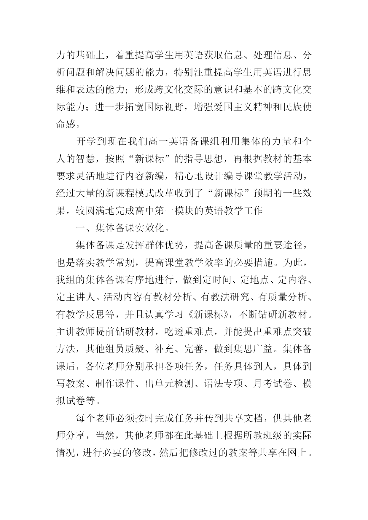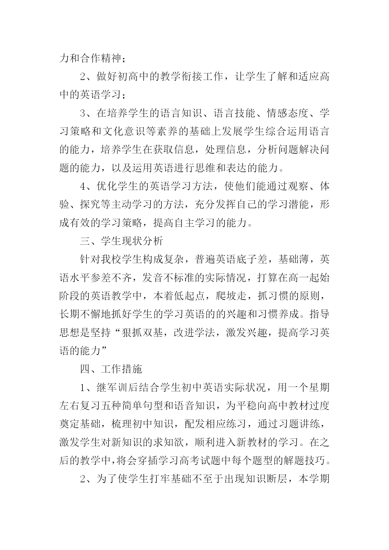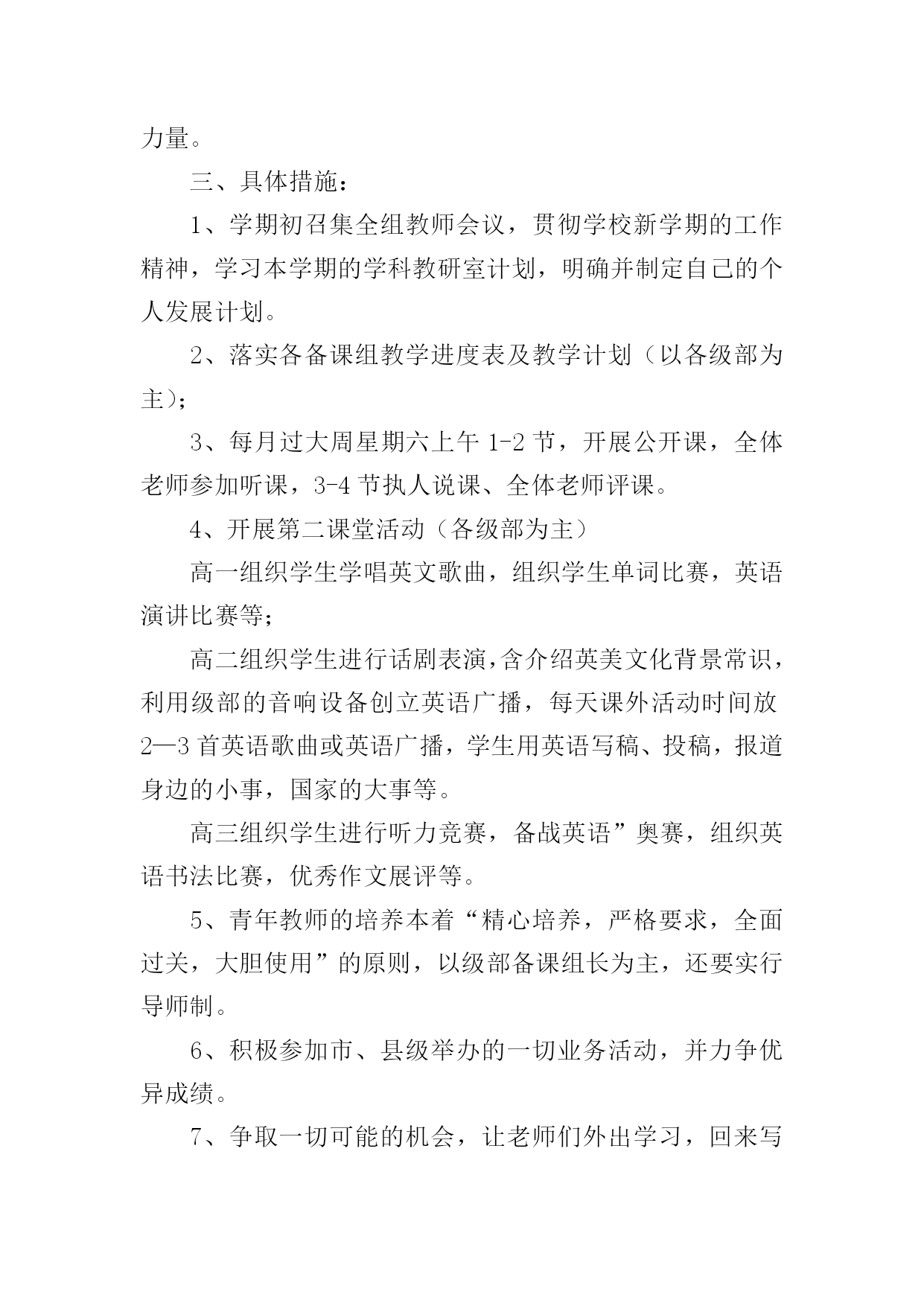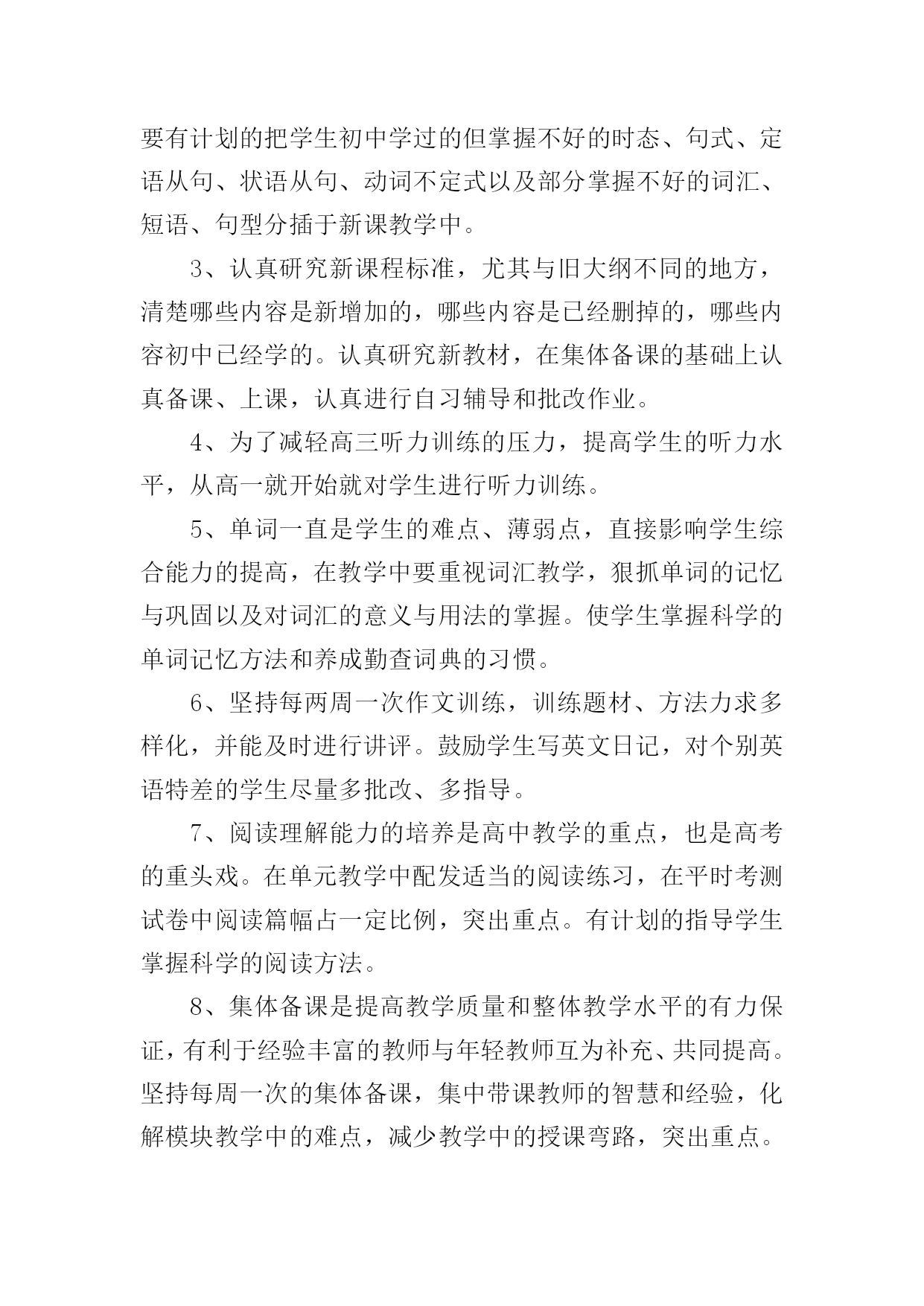高中英语教学计划课件精选(5篇)1.高中英语教学计划课件高一是高中教育的起始阶段,而第一学期更是打好基础的关键,在这个学期培养学生浓厚的英语学习兴趣和良好的英语学习习惯就显得尤为重要,为了使学生圆满完成新课标要求的各项学习任务,尽快适应新的环境,在各方面能够健康发展,把英语教学搞的有声有色,必须有一个切实可行的教学计划。特制定英语教学计划如下:一、教材分析教材是“课标”的具体表现,是学生学习的“蓝本”。现在使用的外研版英语教材每一个模块都围绕一个主要话题开展听说读写活动,循序渐进,循环反复,符合学生的认知规律,有利于学生构建知识系统。教材打破了传统的体系,用新的理念、新的方式、新的体系呈现出来。我们应当以积极的态度去学习教材,研究教材,理解教材各个栏目的编写意图,限度地发挥各个栏目的作用。一方面我们要努力去理解教材、适应教材、用好教材,一方面我们又要努力站在教材之上使用教材,要根据教学目标和学生实际对其进行大胆的取舍和重组,是教材为我所用,而不是被教材牵着鼻子走。二、教学目标1、使学生明确学习英语的目的性,发展自主学习的能力和合作精神;2、做好初高中的教学衔接工作,让学生了解和适应高中的英语学习;3、在培养学生的语言知识、语言技能、情感态度、学习策略和文化意识等素养的基础上发展学生综合运用语言的能力,培养学生在获取信息,处理信息,分析问题解决问题的能力,以及运用英语进行思维和表达的能力。4、优化学生的英语学习方法,使他们能通过观察、体验、探究等主动学习的方法,充分发挥自己的学习潜能,形成有效的学习策略,提高自主学习的能力。三、学生现状分析针对我校学生构成复杂,普遍英语底子差,基础薄,英语水平参差不齐,发音不标准的实际情况,打算在高一起始阶段的英语教学中,本着低起点,爬坡走,抓习惯的原则,长期不懈地抓好学生的学习英语的的兴趣和习惯养成。指导思想是坚持“狠抓双基,改进学法,激发兴趣,提高学习英语的能力”四、工作措施1、继军训后结合学生初中英语实际状况,用一个星期左右复习五种简单句型和语音知识,为平稳向高中教材过度奠定基础,梳理初中知识,配发相应练习,通过习题讲练,激发学生对新知识的求知欲,顺利进入新教材的学习。在之后的教学中,将会穿插学习高考试题中每个题型的解题技巧。2、为了使学生打牢基础不至于出现知识断层,本学期要有计划的把学生初中学过的但掌握不好的时态、句式、定语从句、状语从句、动词不定式以及部分掌握不好的词汇、短语、句型分插于新课教学中。3、认真研究新课程标准,尤其与旧大纲不同的地方,清楚哪些内容是新增加的,哪些内容是已经删掉的,哪些内容初中已经学的。认真研究新教材,在集体备课的基础上认真备课、上课,认真进行自习辅导和批改作业。4、为了减轻高三听力训练的压力,提高学生的听力水平,从高一就开始就对学生进行听力训练。5、单词一直是学生的难点、薄弱点,直接影响学生综合能力的提高,在教学中要重视词汇教学,狠抓单词的记忆与巩固以及对词汇的意义与用法的掌握。使学生掌握科学的单词记忆方法和养成勤查词典的习惯。6、坚持每两周一次作文训练,训练题材、方法力求多样化,并能及时进行讲评。鼓励学生写英文日记,对个别英语特差的学生尽量多批改、多指导。7、阅读理解能力的培养是高中教学的重点,也是高考的重头戏。在单元教学中配发适当的阅读练习,在平时考测试卷中阅读篇幅占一定比例,突出重点。有计划的指导学生掌握科学的阅读方法。8、集体备课是提高教学质量和整体教学水平的有力保证,有利于经验丰富的教师与年轻教师互为补充、共同提高。坚持每周一次的集体备课,集中带课教师的智慧和经验,化解模块教学中的难点,减少教学中的授课弯路,突出重点。9、坚持教学研究和相互听课,互相学习,积极上网,利用网络资源的优势,解决自己教学中的疑难和困惑。高一英语教学在高中英语学习期间是很关键的。因此,我要深入地研究教材,根据学科特点及学生特点研究切实可行的课堂教学模式。努力探索适合学生特点、学生乐于接受的教学方法及模式。寓教于乐,使学生养成良好的外语学习习惯,为学生高中三年的学习打下坚实的基础。2.高中英语教学计划课件一、指导思想:在学校业务小组的领导下,团结奋斗,协调好各备课组间的关系。认真学习新的教学大纲,认真研究新的高考形势,教书育人,为人师表,富有进取精神、努力营造融洽的教研新风貌,在现有成绩的基础上,为把我组的教研水平提高到一个新的台阶而努力奋斗。二、奋斗目标:1、开展学习新课标和新考纲活动,稳步扎实地提高英语教学质量;2、加强校本教研,把我组全体教师的教学水平提高到一个新层面;3、要求各备课组,搞好第二课堂活动,培养学生学习英语的兴趣,创设浓厚校园英语氛围。4、重视青年教师培养,促使青年教师迅速成长为骨干力量